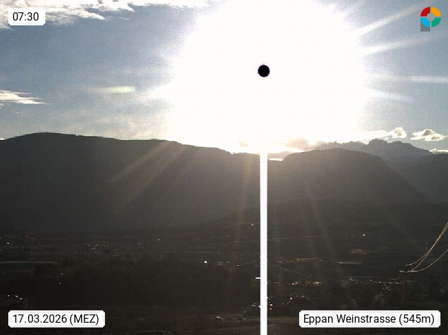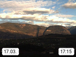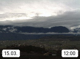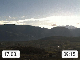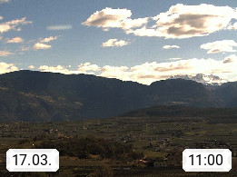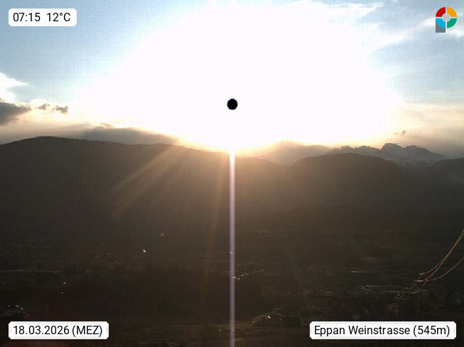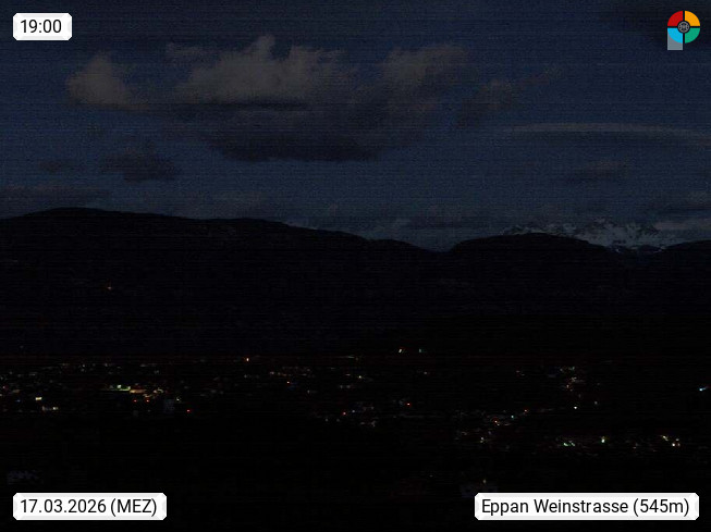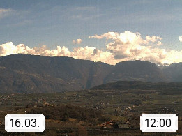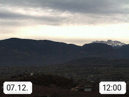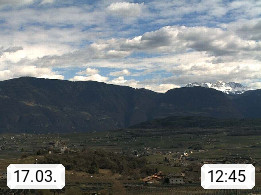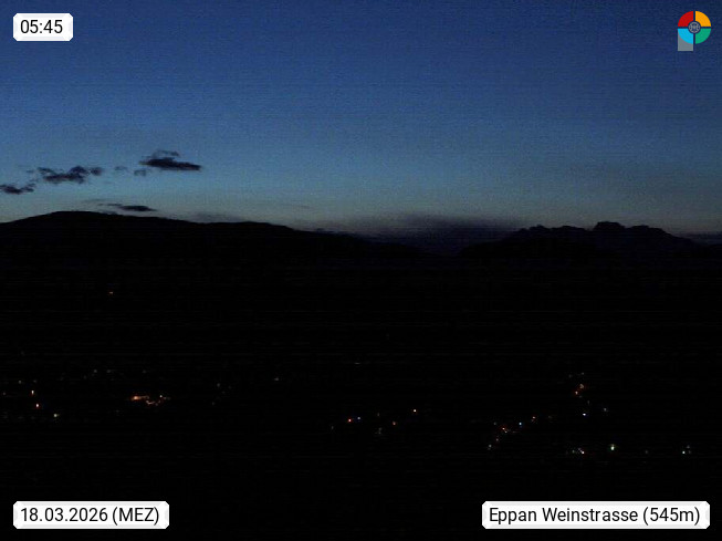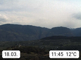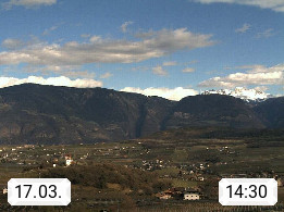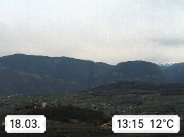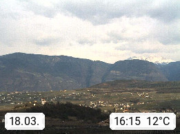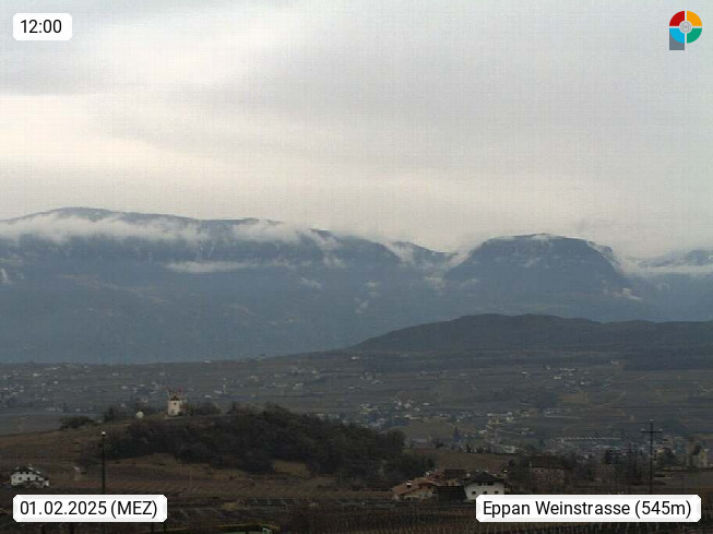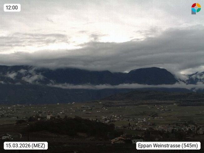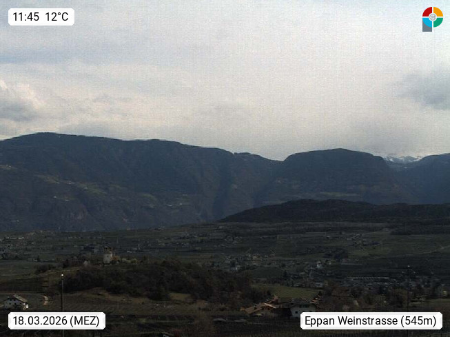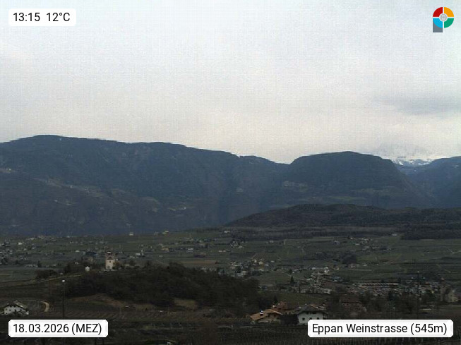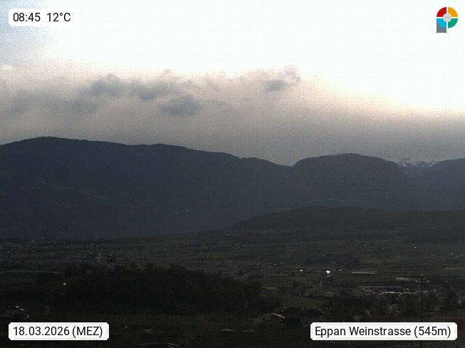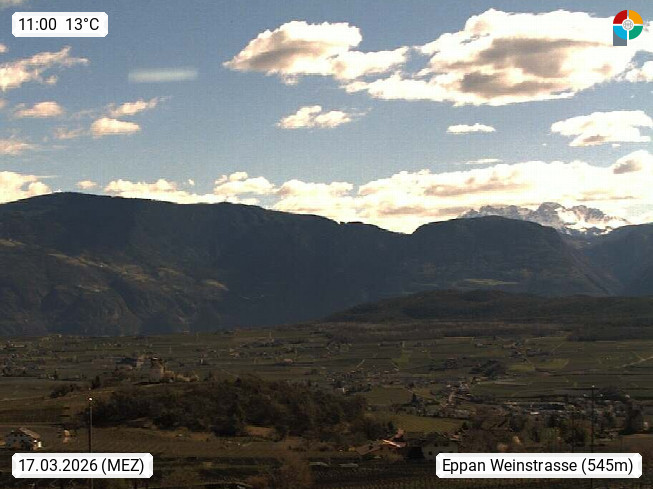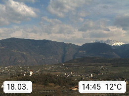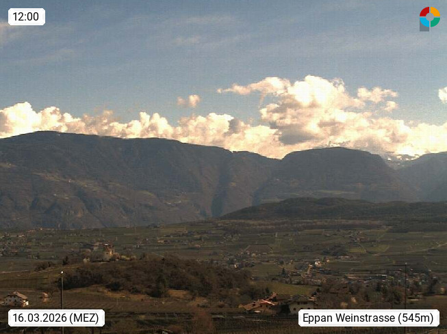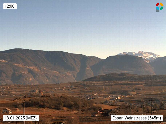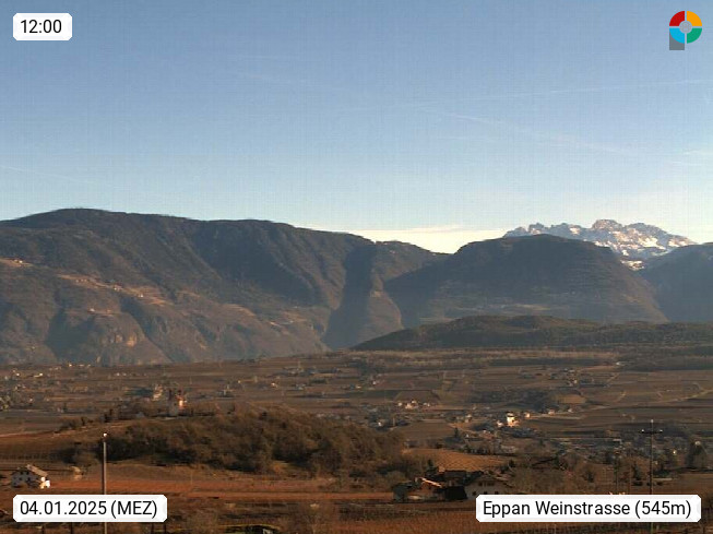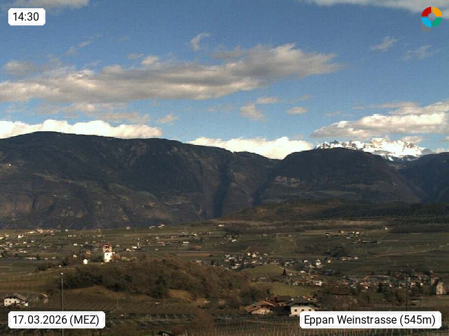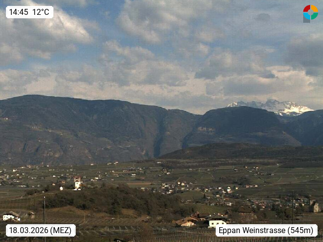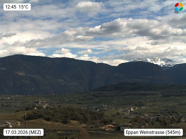 I 39057 Eppan on the Wineroad (Appiano sulla Strada del Vino) 430m, in Überetsch between Bozen (Bolzano) and Kaltern (Caldaro) on the slopes of the Mendola mountain ridge (Costiera della Mendola). Panoramic view towards the northeast to the Sarntaler Alps (Alpi Sarentine) Tschögglberg, Rittner Horn, Kohlerer Mountain, Schlern, Latemar and white horn. Presented by https://www.steinegger.it/.