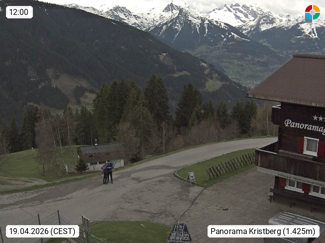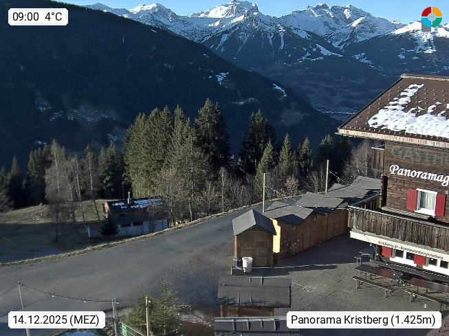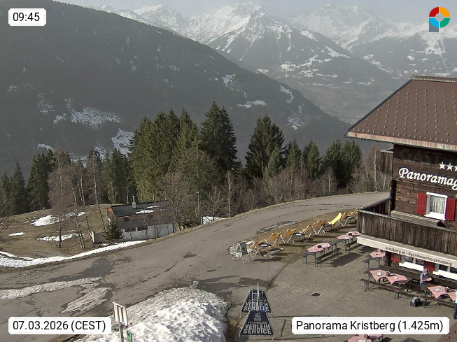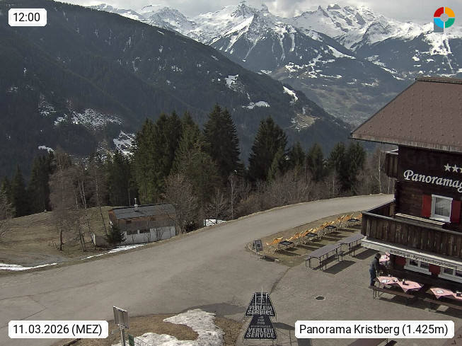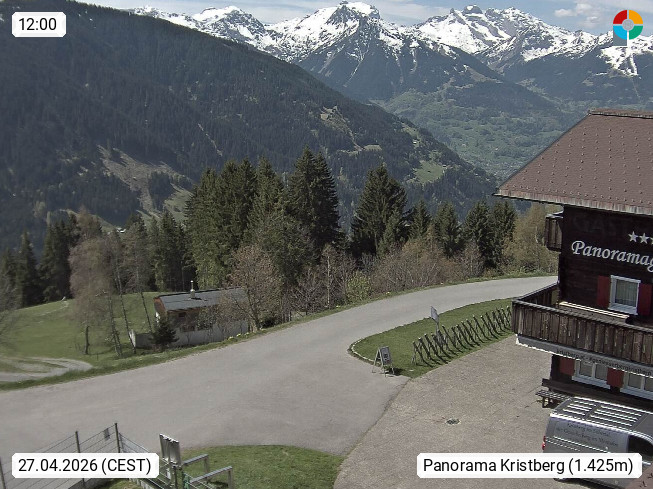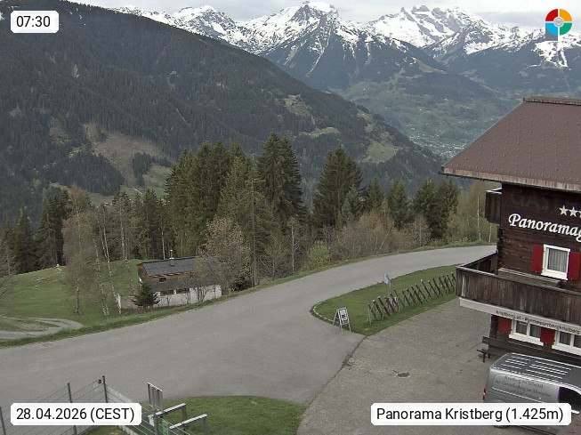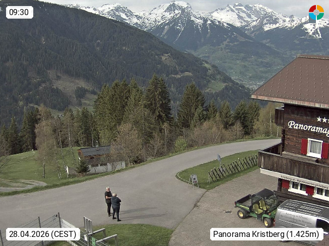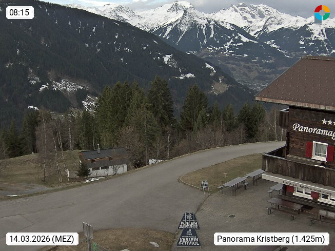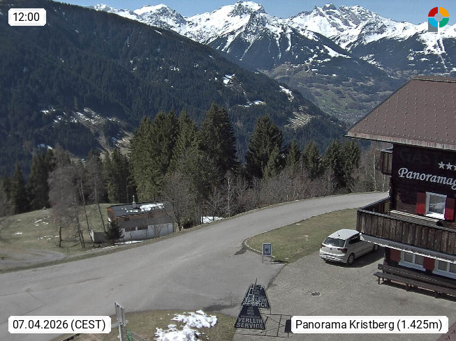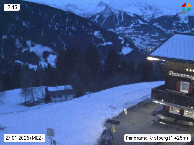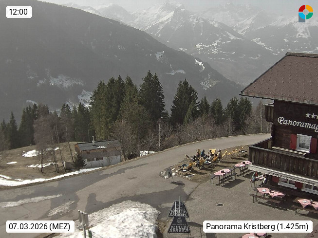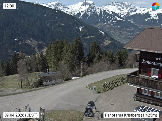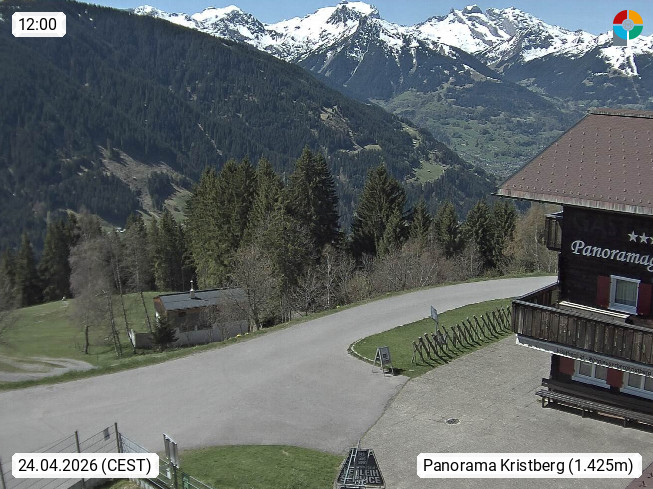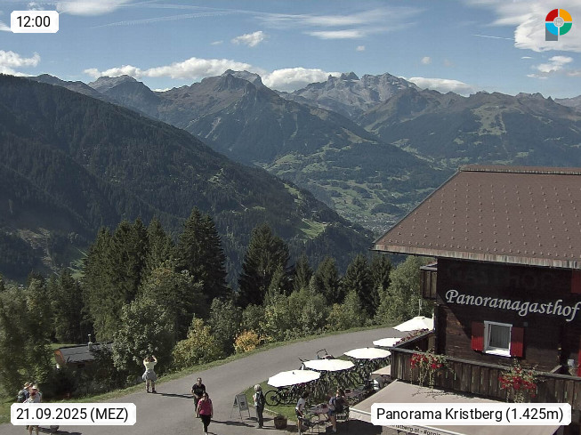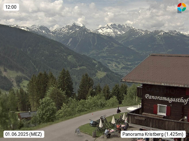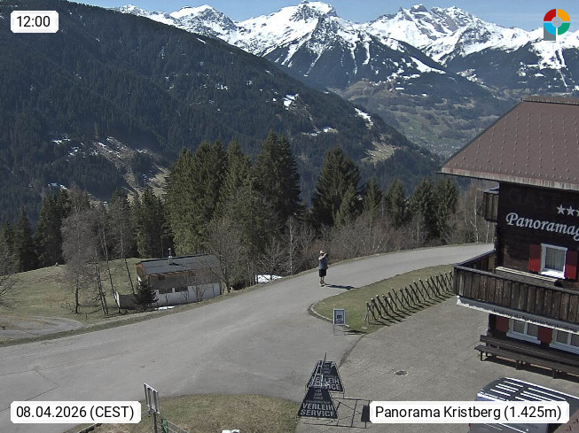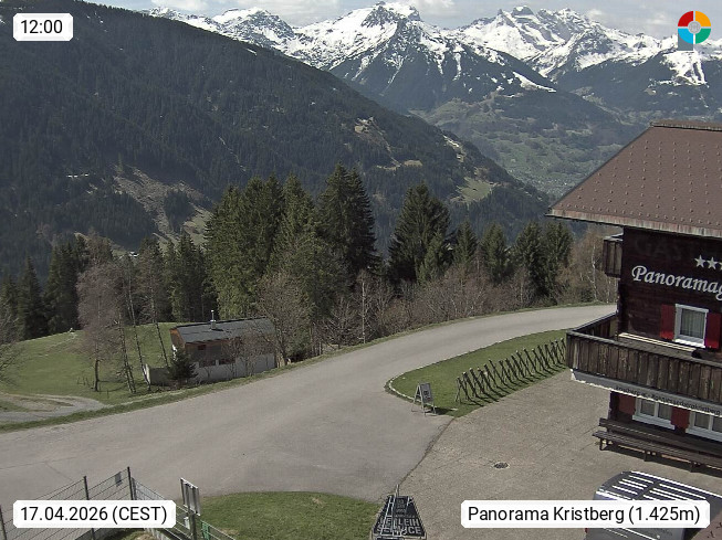 A 6780 Silbertal Kristberg 1.425m, located in a side valley of Montafon in the Verwall Alps in district Bludenz. View to the Panorama restaurant Kristberg, in the background the Rätikon mountaingroup, the villages Schruns Tschagguns and Golm. Deine Erholungsinfo gibt es auf www.kristberg.at