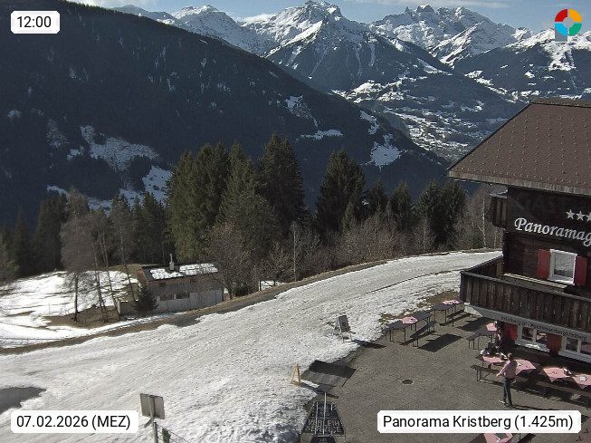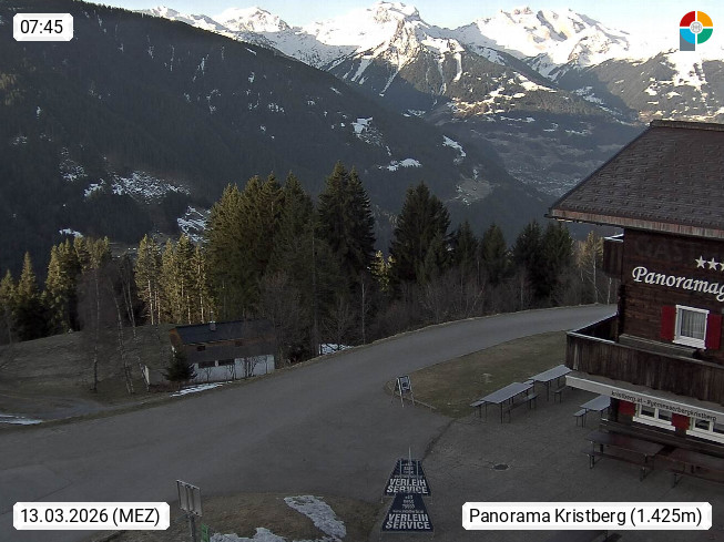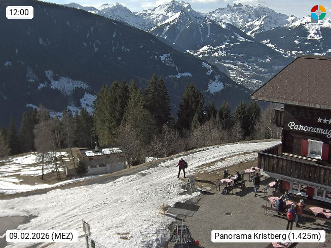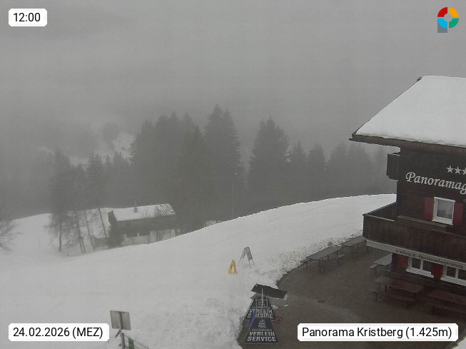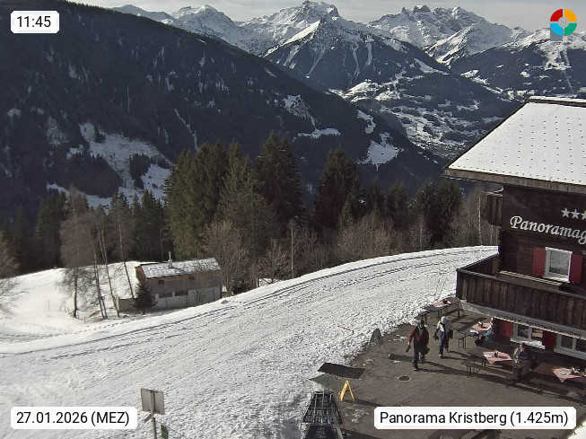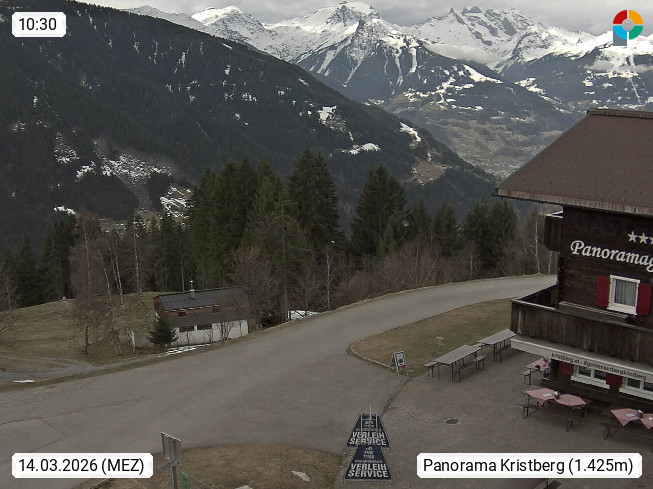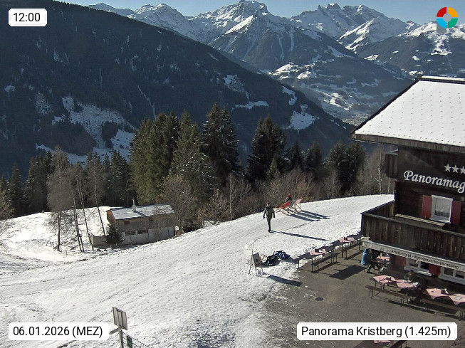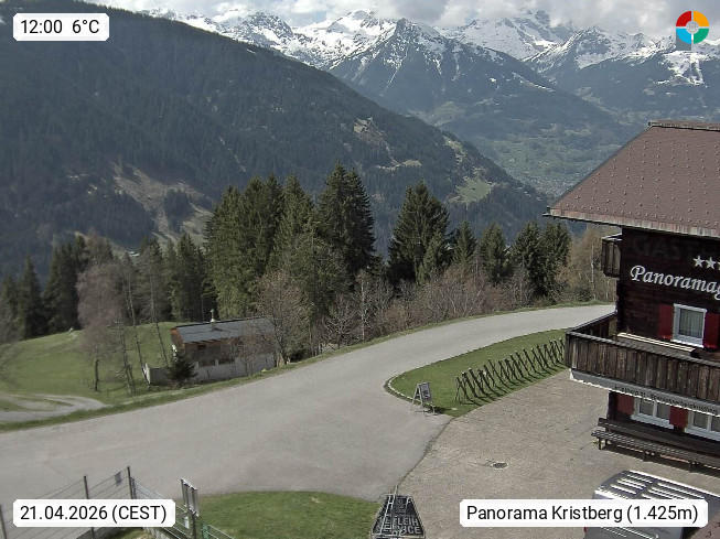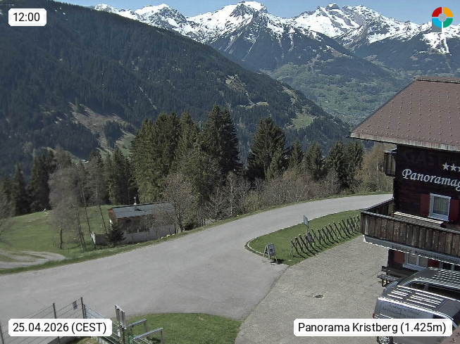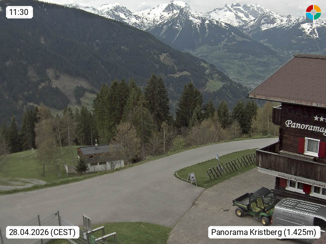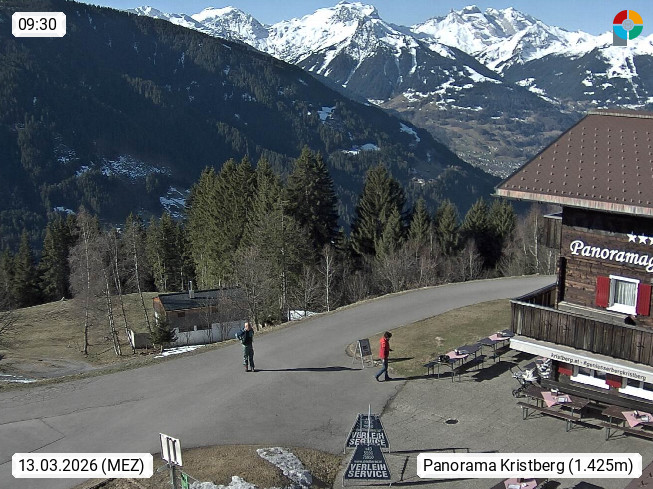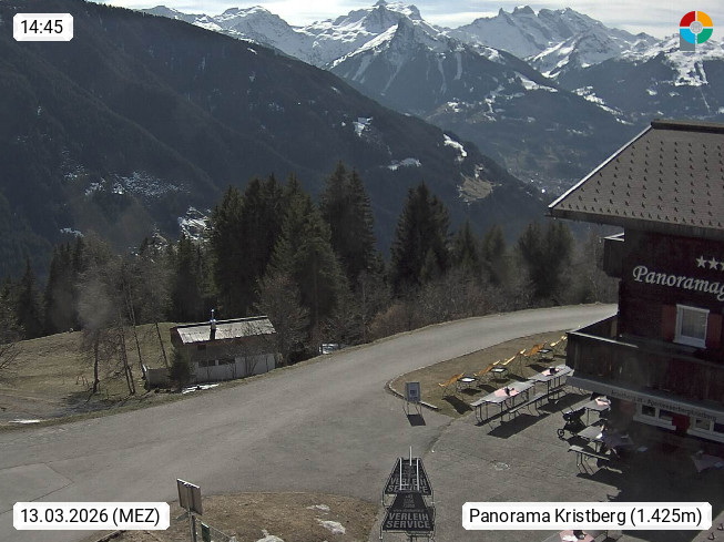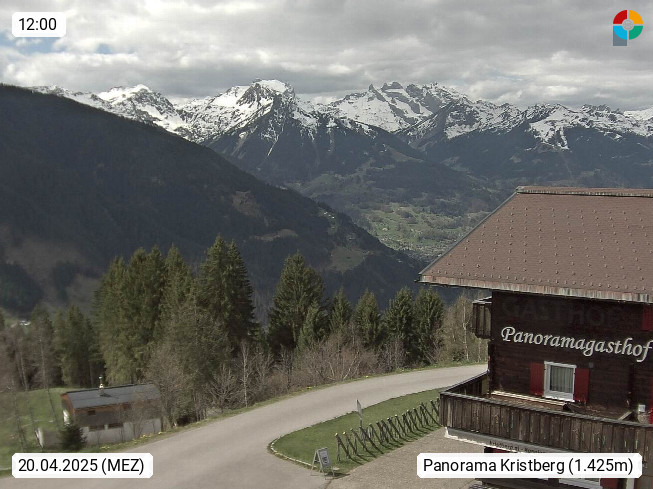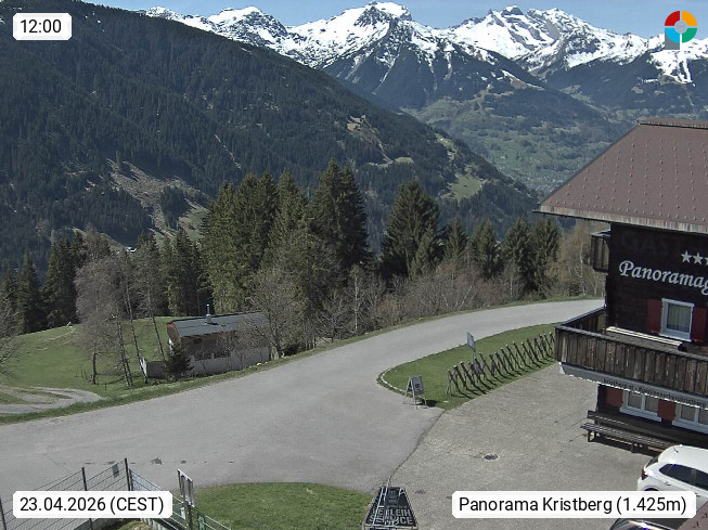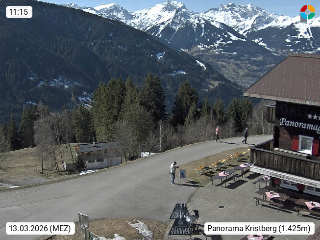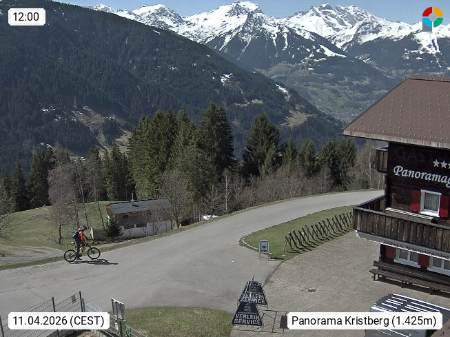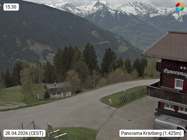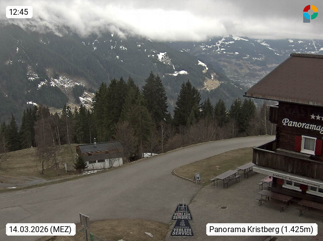 A 6780 Silbertal Kristberg 1.425m, located in a side valley of Montafon in the Verwall Alps in district Bludenz. View to the Panorama restaurant Kristberg, in the background the Rätikon mountaingroup, the villages Schruns Tschagguns and Golm. Deine Erholungsinfo gibt es auf www.kristberg.at
