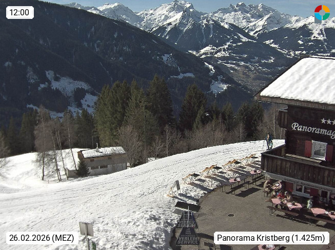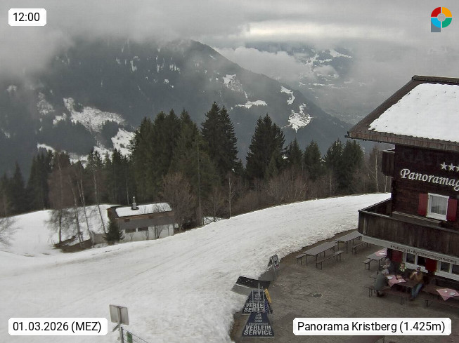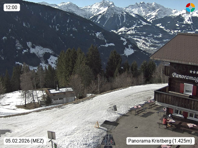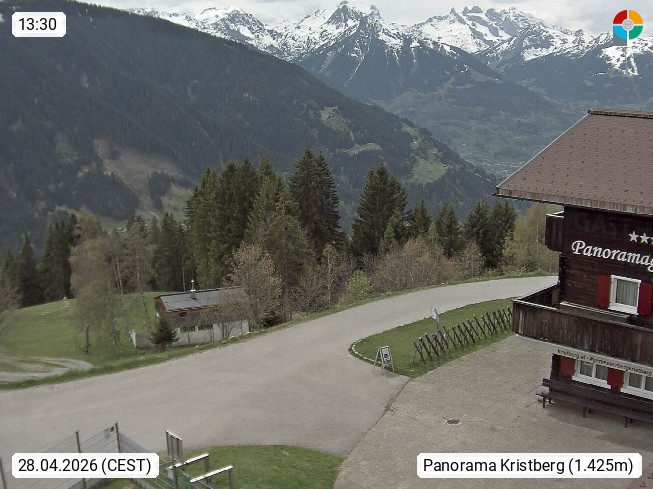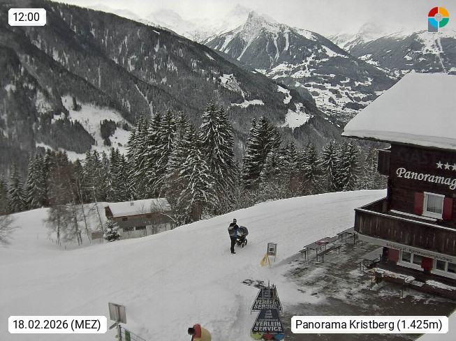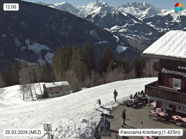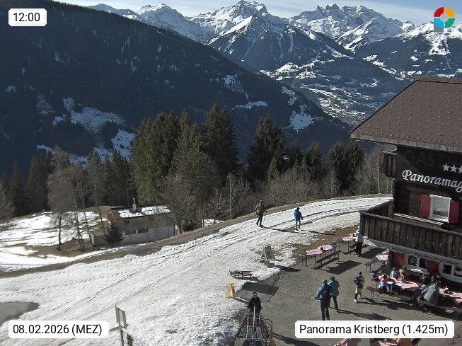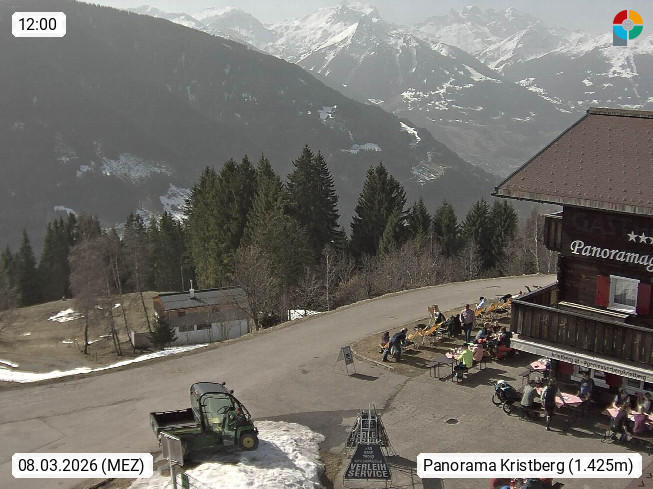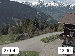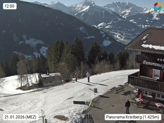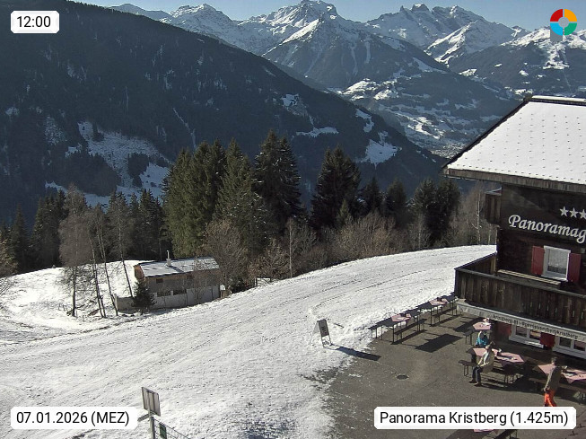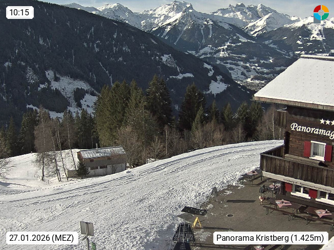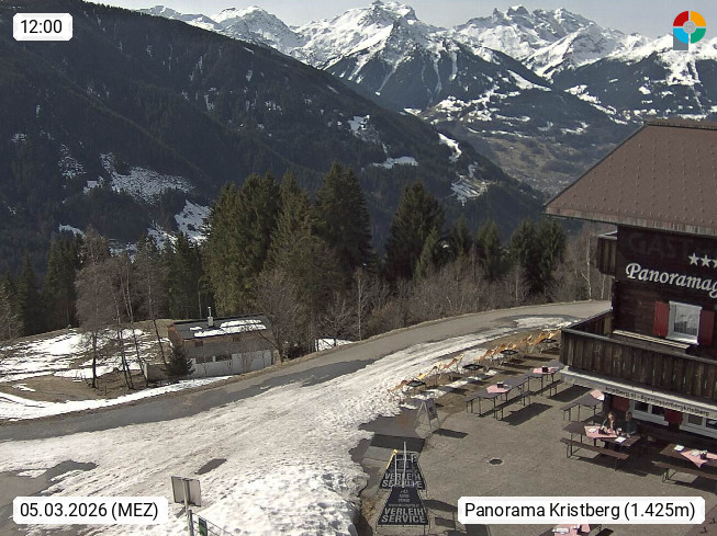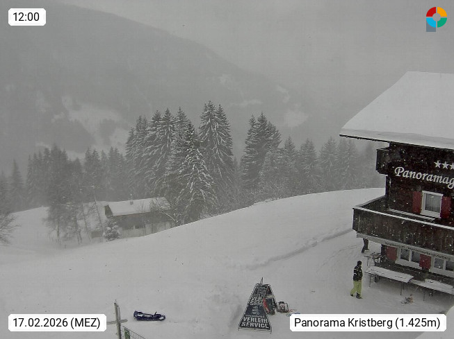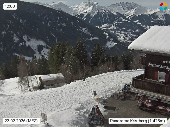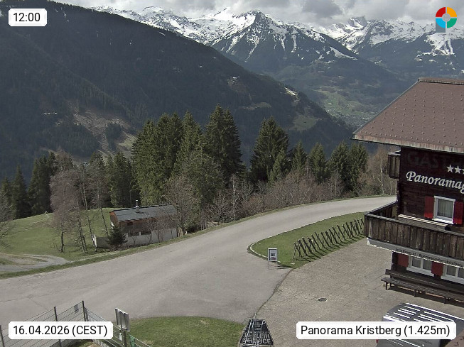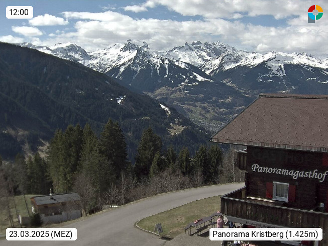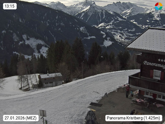 A 6780 Silbertal Kristberg 1.425m, located in a side valley of Montafon in the Verwall Alps in district Bludenz. View to the Panorama restaurant Kristberg, in the background the Rätikon mountaingroup, the villages Schruns Tschagguns and Golm. Deine Erholungsinfo gibt es auf www.kristberg.at