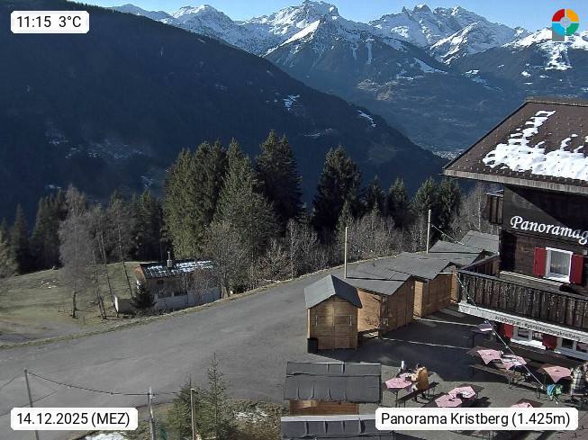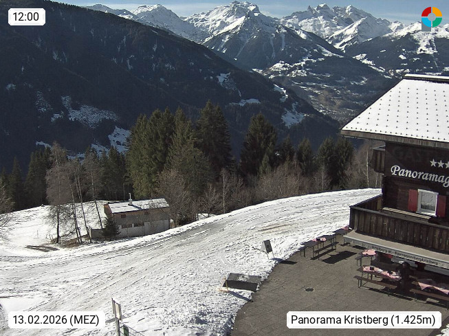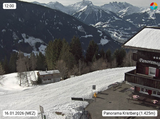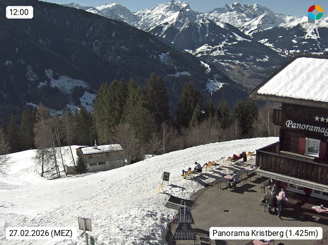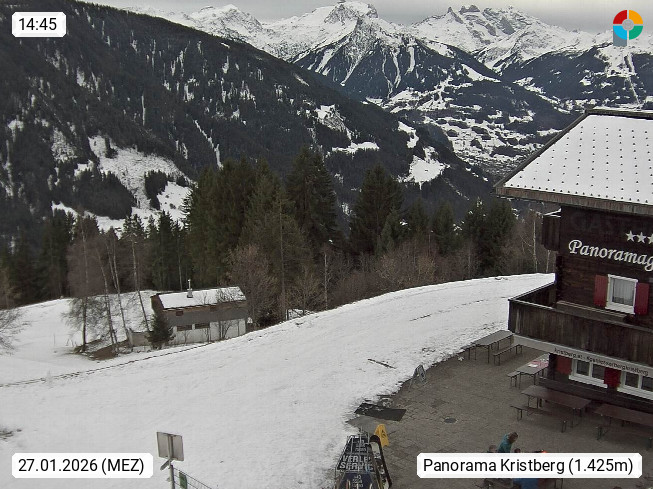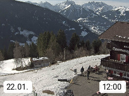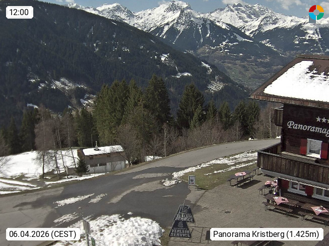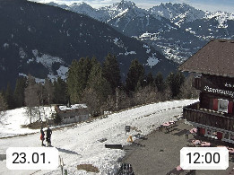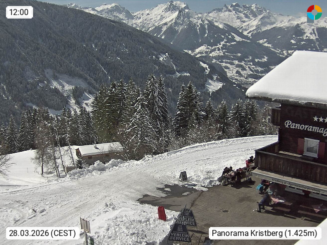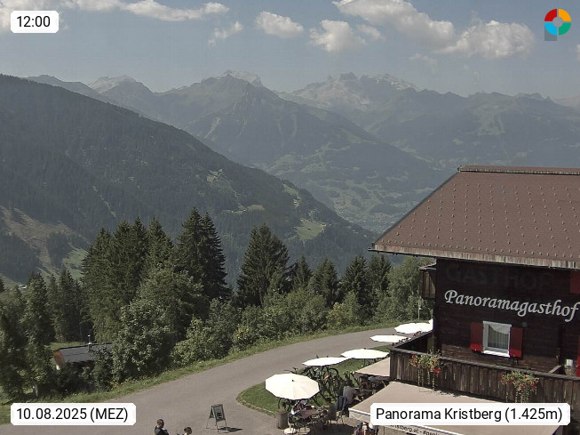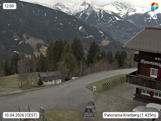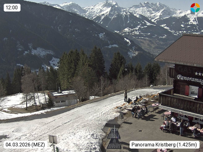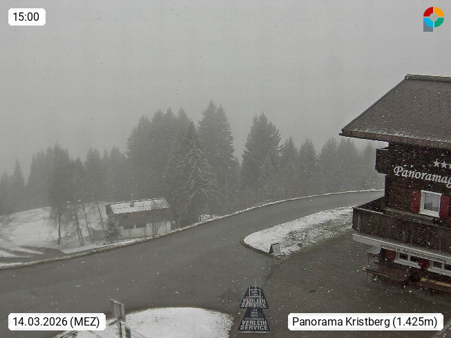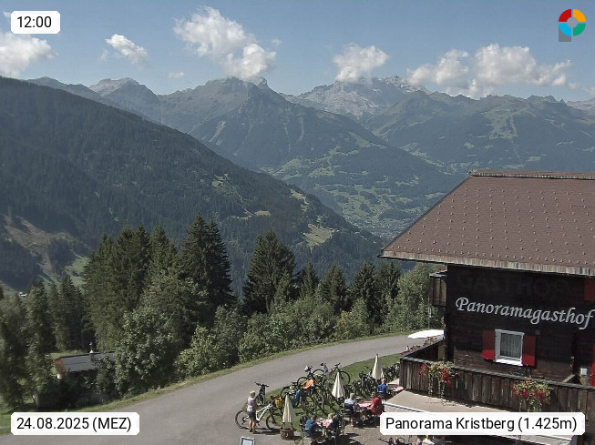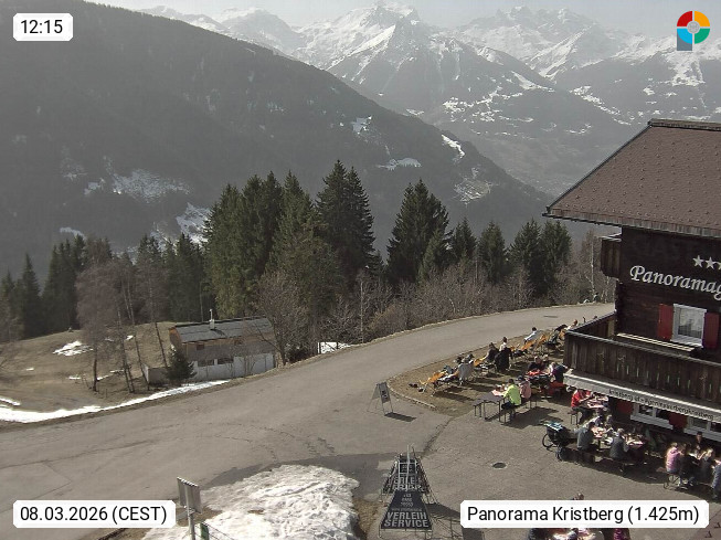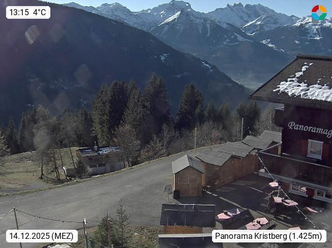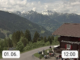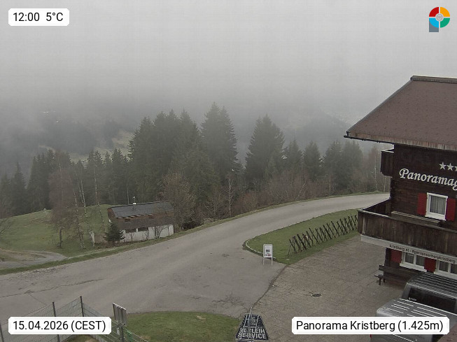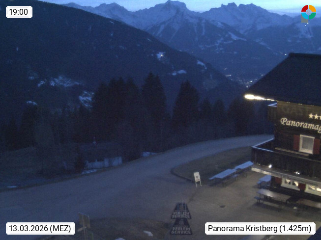 A 6780 Silbertal Kristberg 1.425m, located in a side valley of Montafon in the Verwall Alps in district Bludenz. View to the Panorama restaurant Kristberg, in the background the Rätikon mountaingroup, the villages Schruns Tschagguns and Golm. Deine Erholungsinfo gibt es auf www.kristberg.at