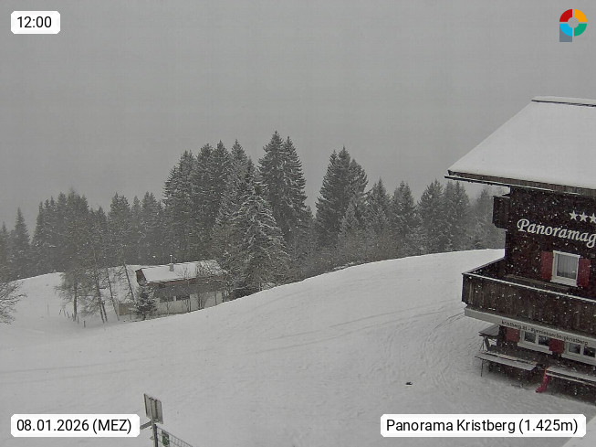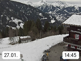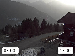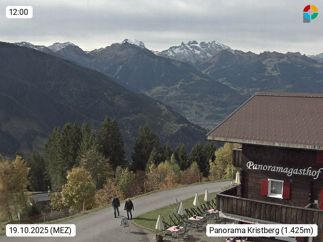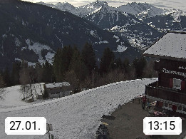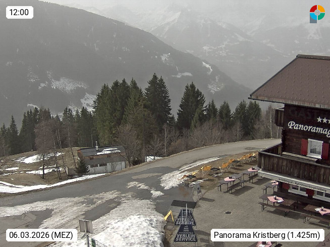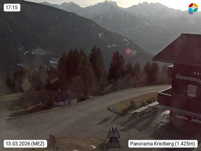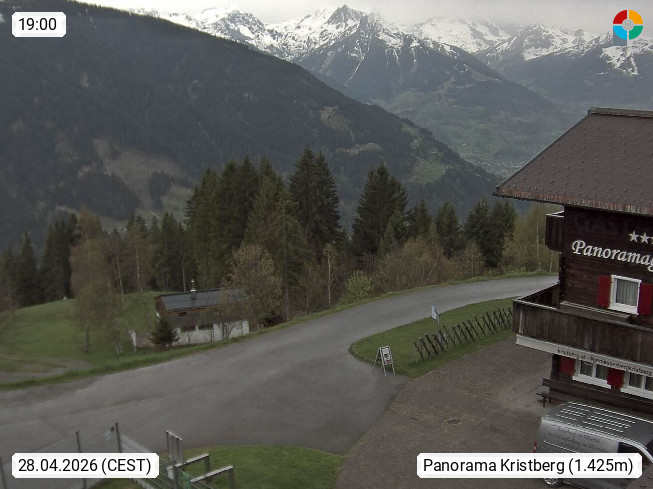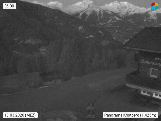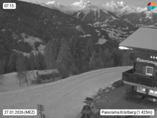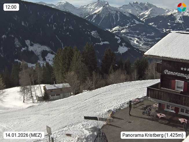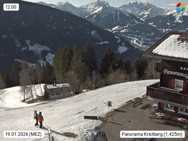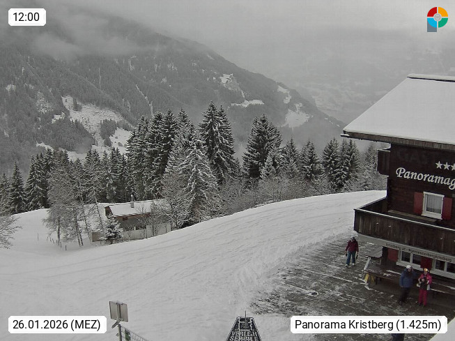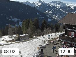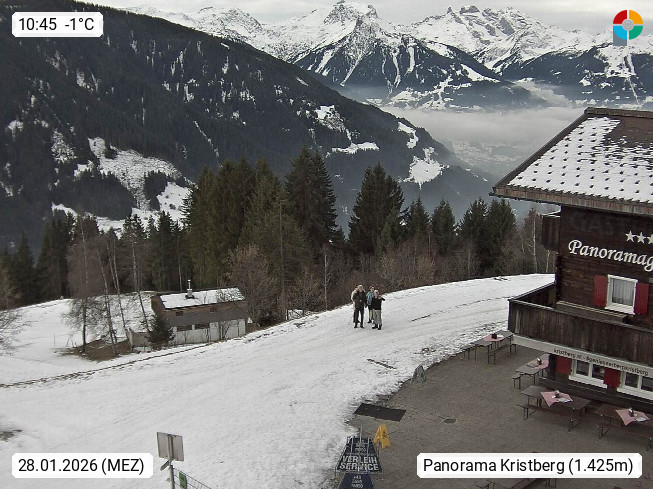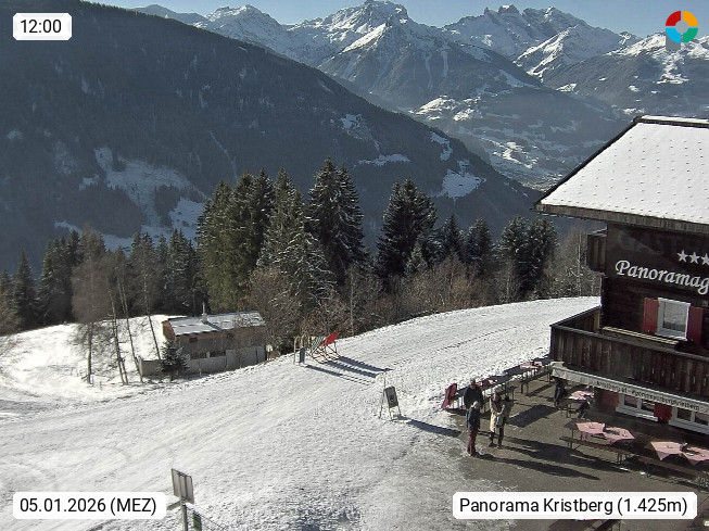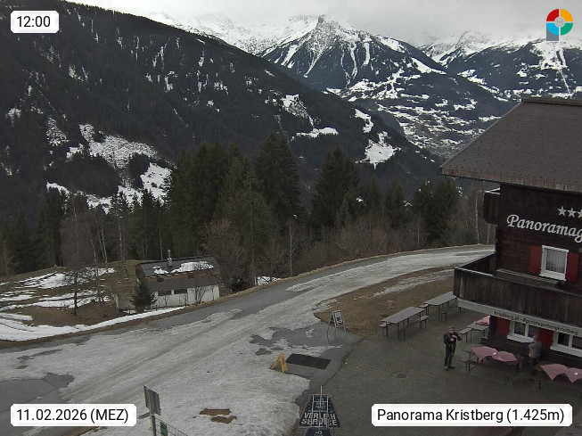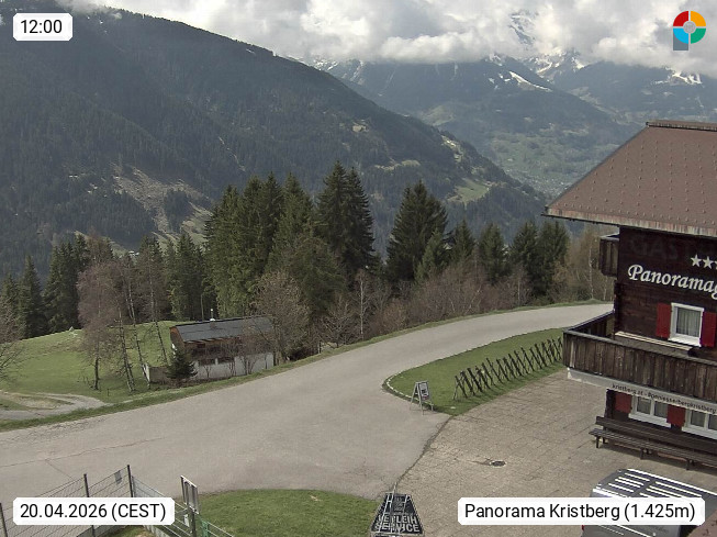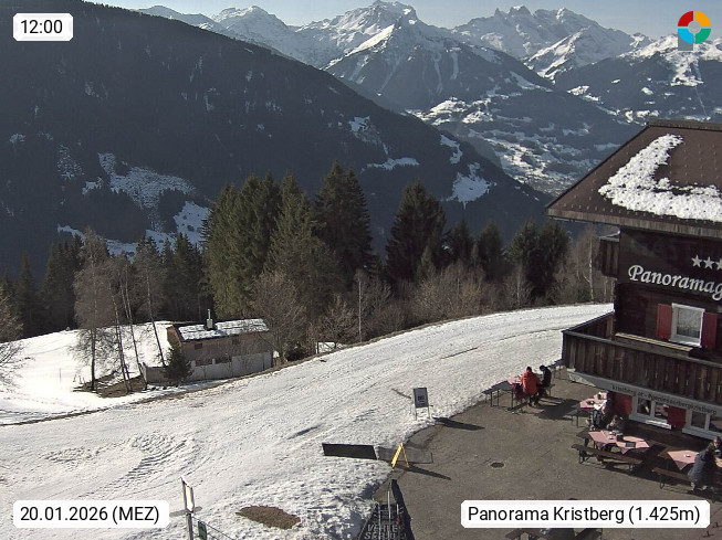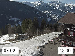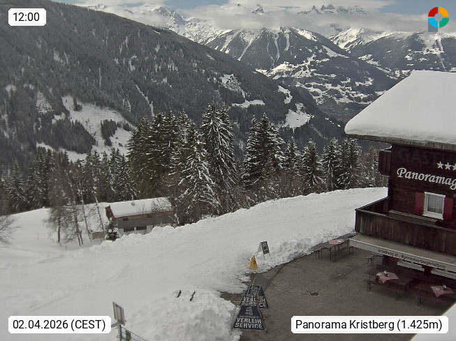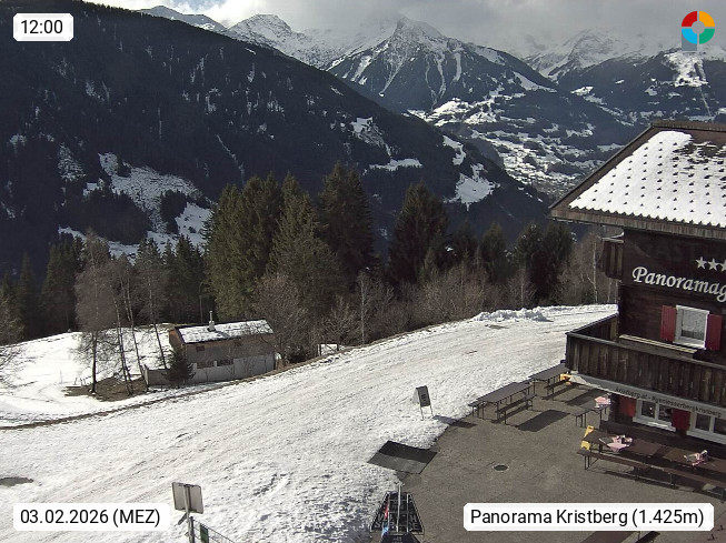 A 6780 Silbertal Kristberg 1.425m, located in a side valley of Montafon in the Verwall Alps in district Bludenz. View to the Panorama restaurant Kristberg, in the background the Rätikon mountaingroup, the villages Schruns Tschagguns and Golm. Deine Erholungsinfo gibt es auf www.kristberg.at