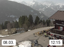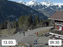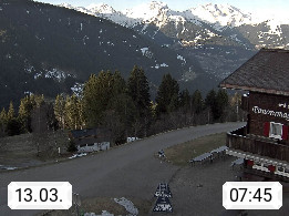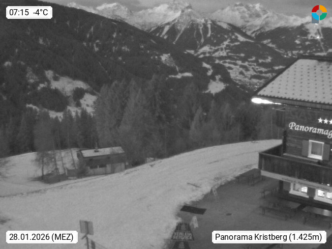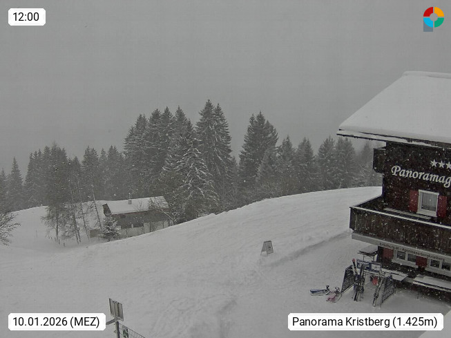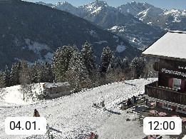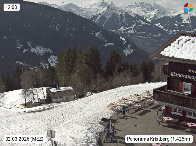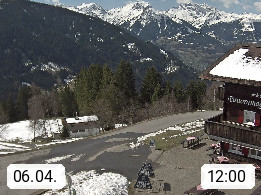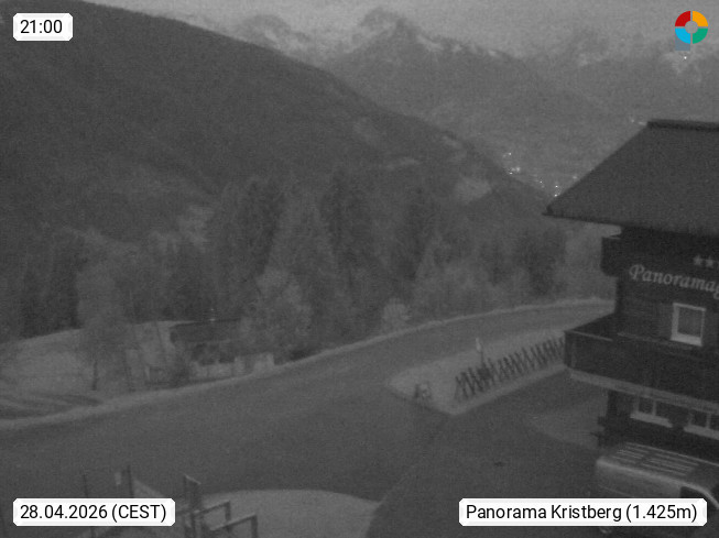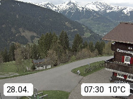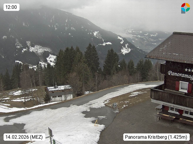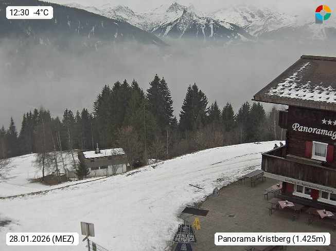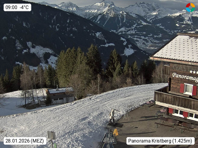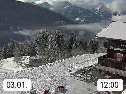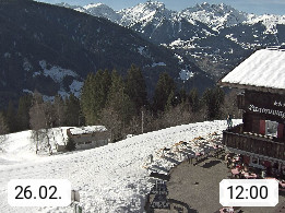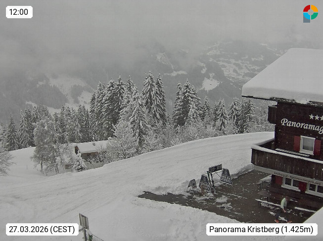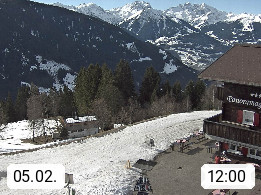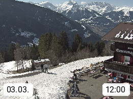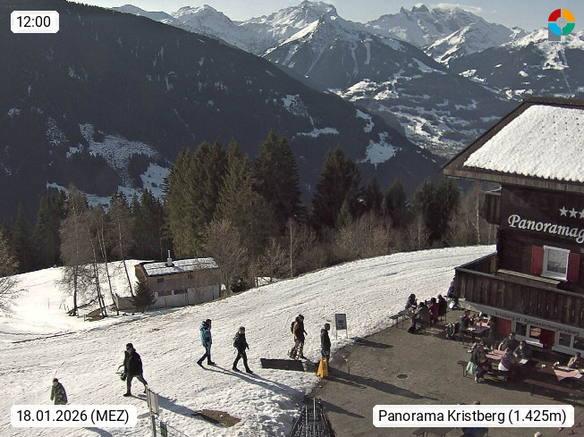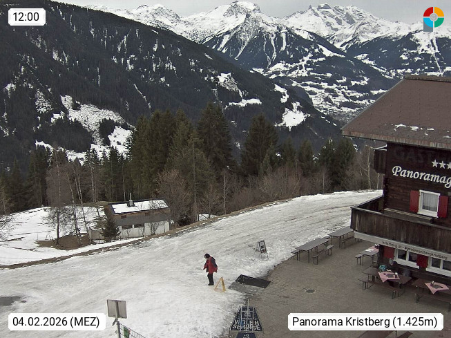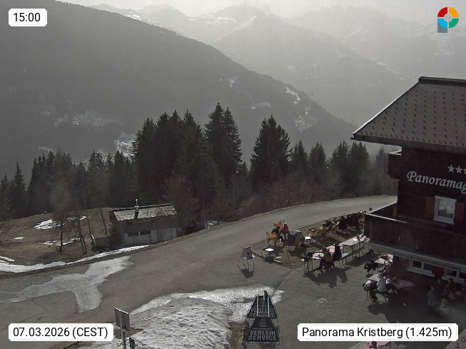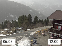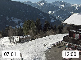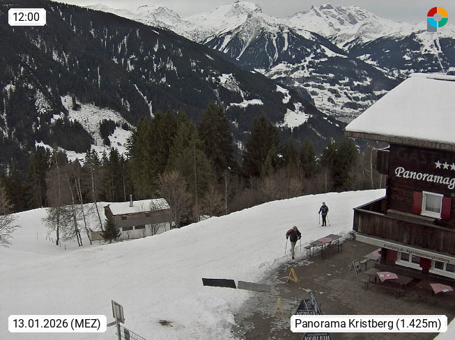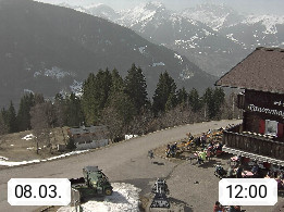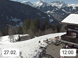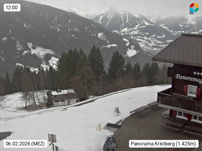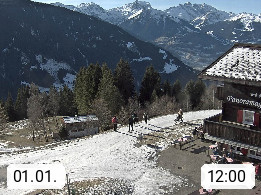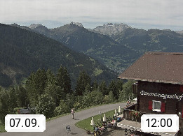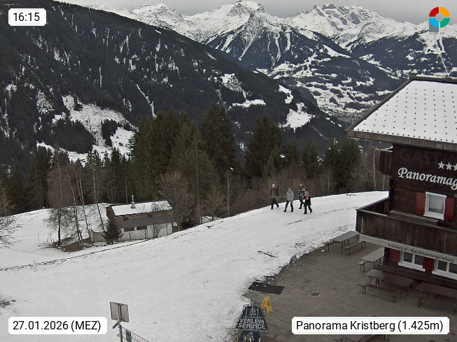 A 6780 Silbertal Kristberg 1.425m, located in a side valley of Montafon in the Verwall Alps in district Bludenz. View to the Panorama restaurant Kristberg, in the background the Rätikon mountaingroup, the villages Schruns Tschagguns and Golm. Deine Erholungsinfo gibt es auf www.kristberg.at