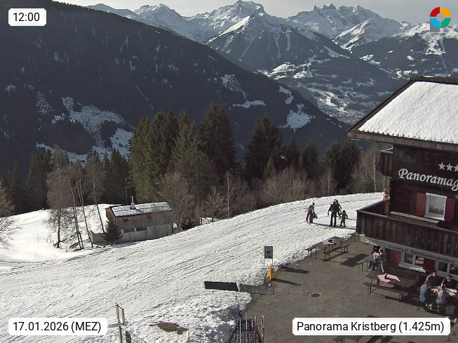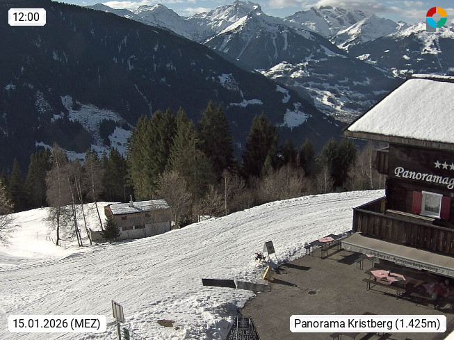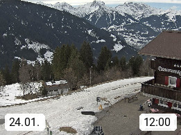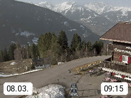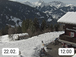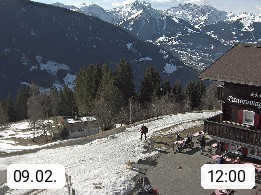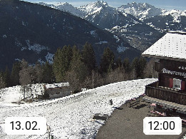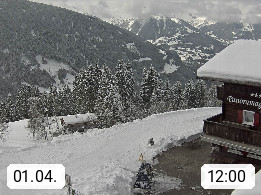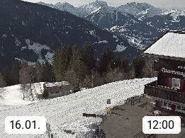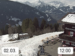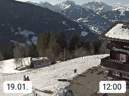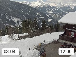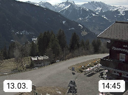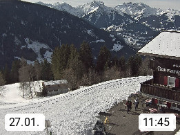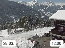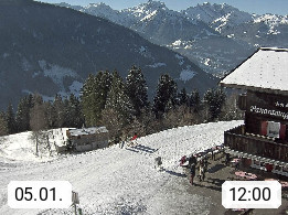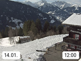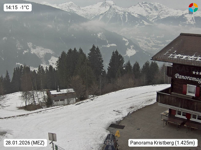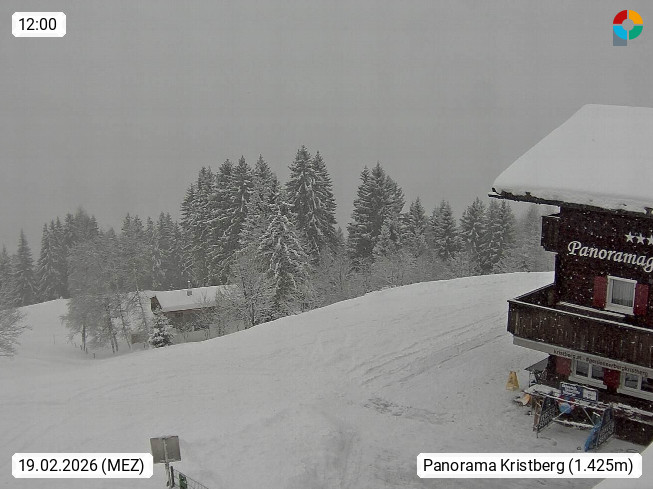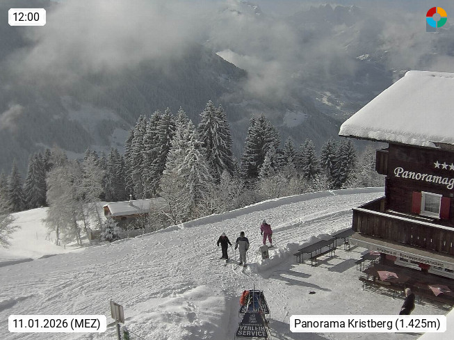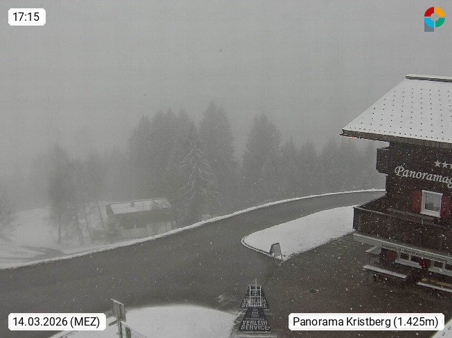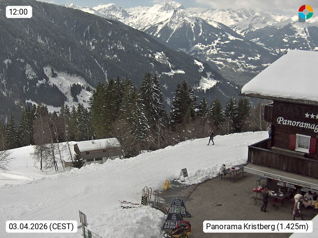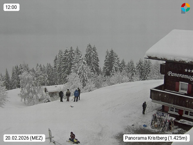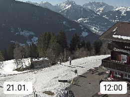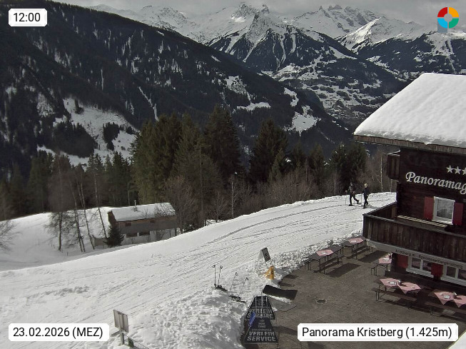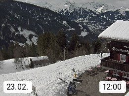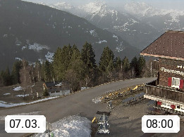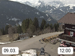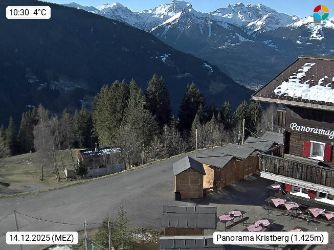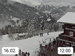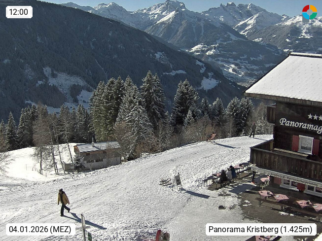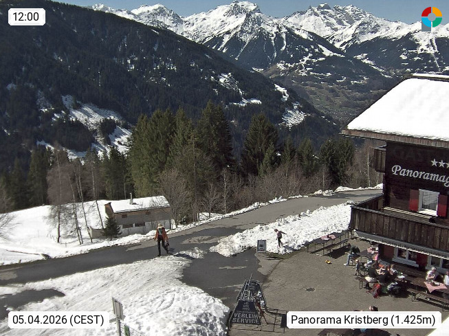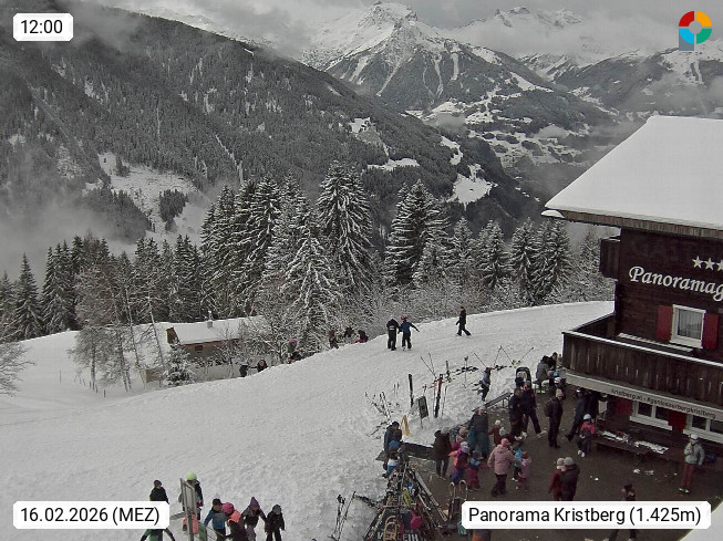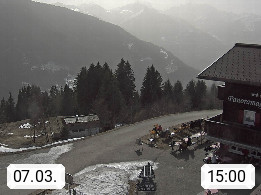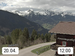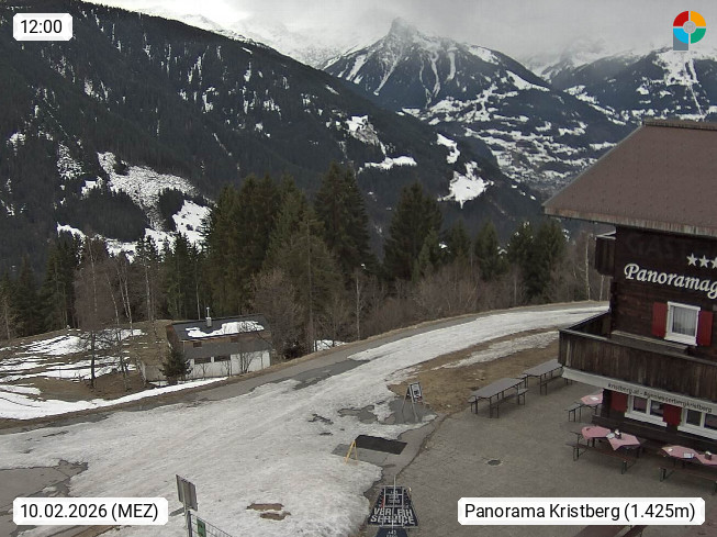 A 6780 Silbertal Kristberg 1.425m, located in a side valley of Montafon in the Verwall Alps in district Bludenz. View to the Panorama restaurant Kristberg, in the background the Rätikon mountaingroup, the villages Schruns Tschagguns and Golm. Deine Erholungsinfo gibt es auf www.kristberg.at