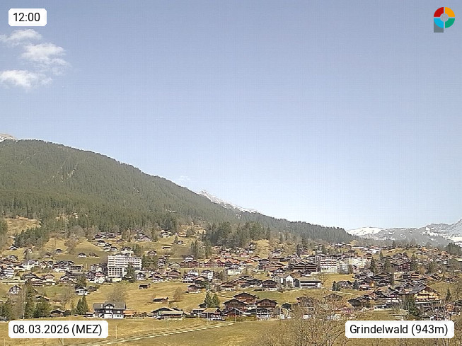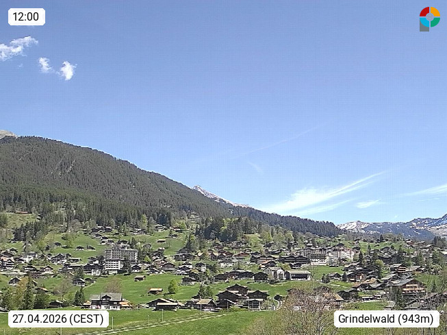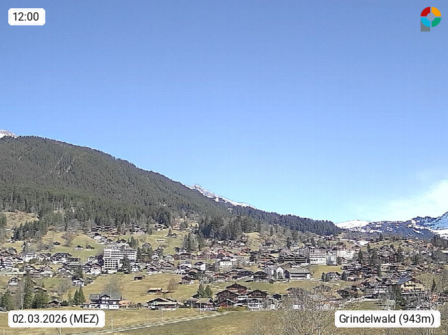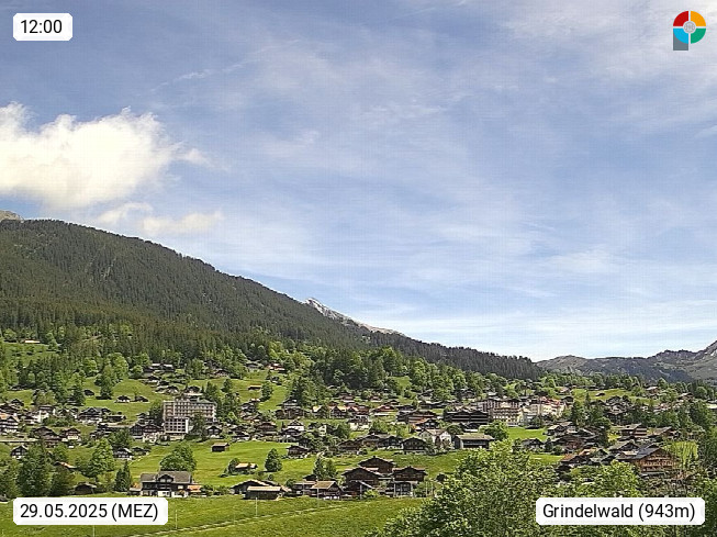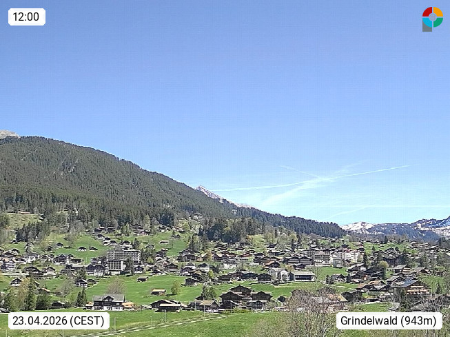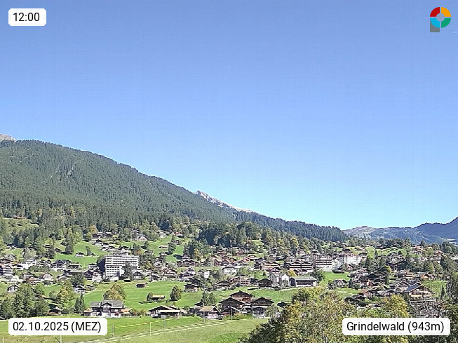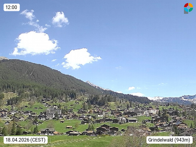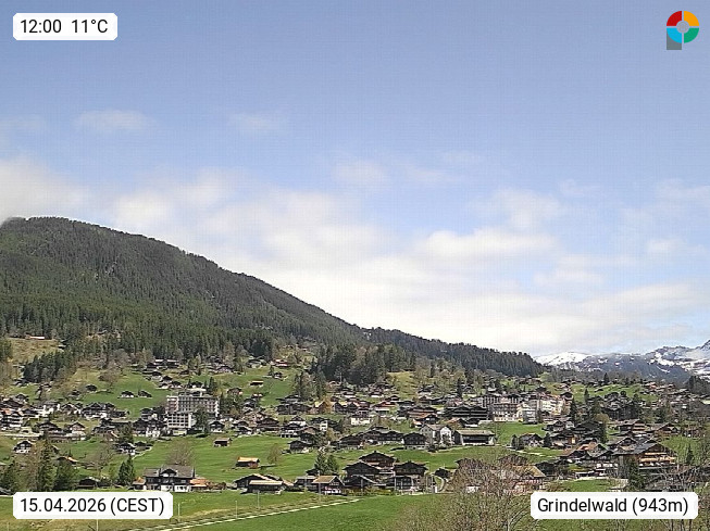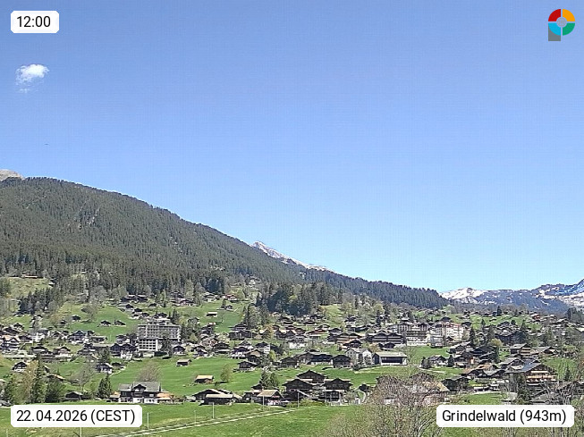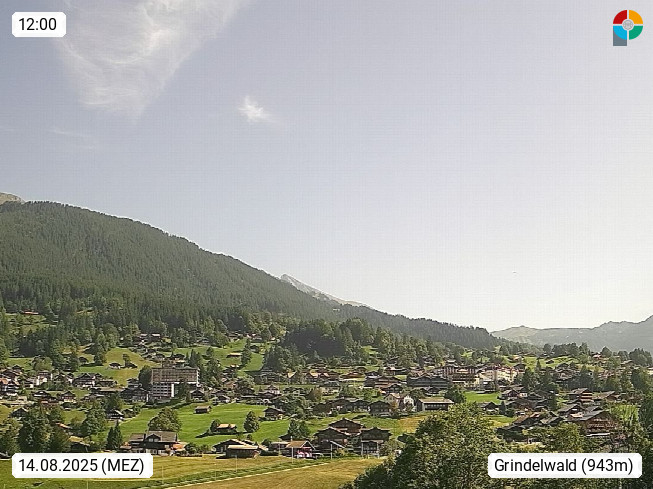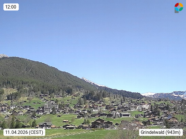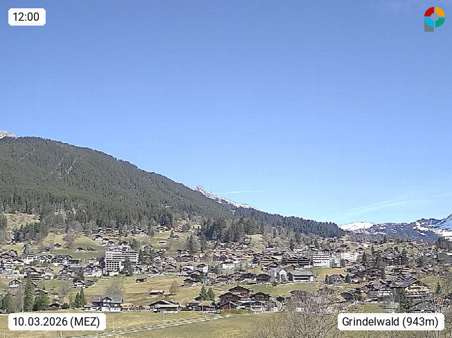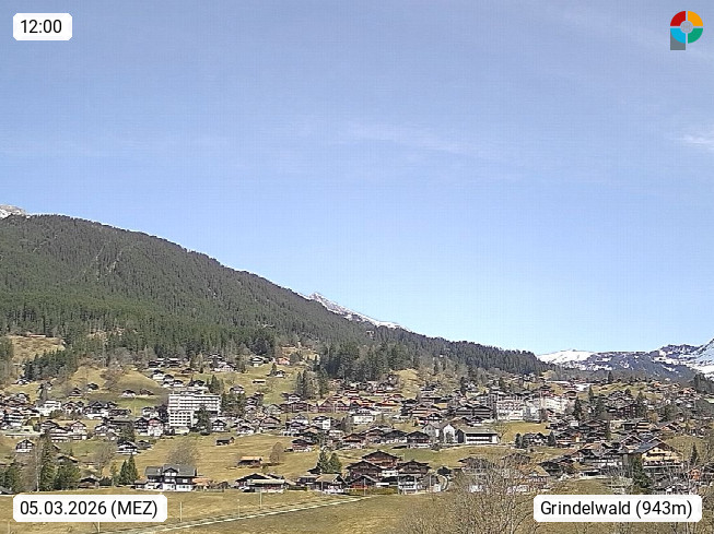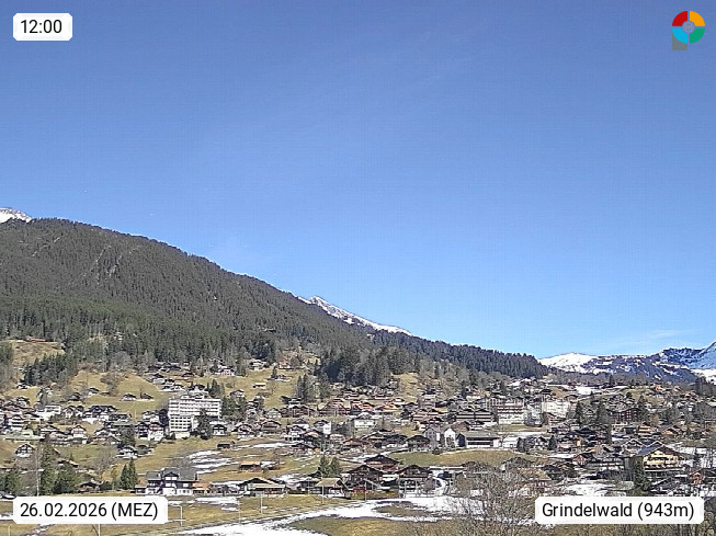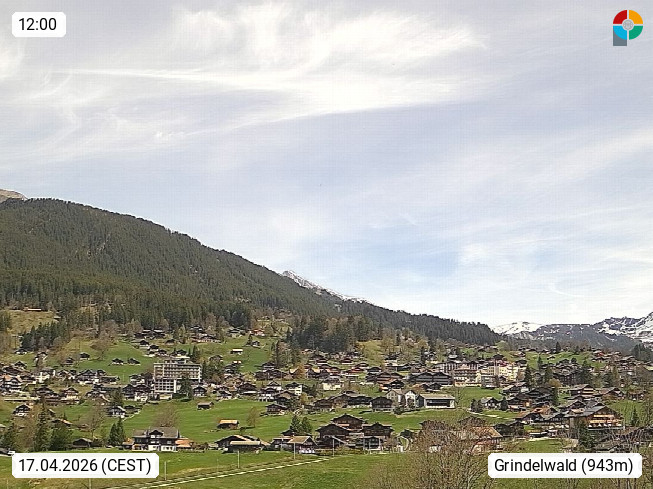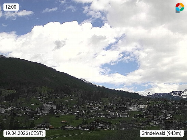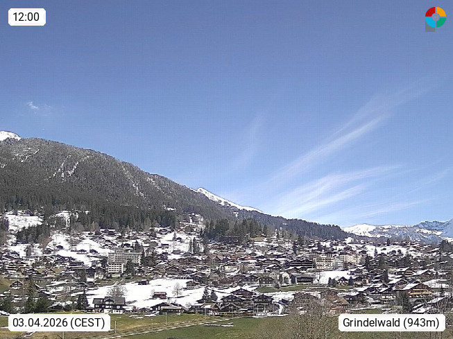 CH 3818 Grindelwald 1.034m, is a village in the district Interlaken in the canton Bern in region Bernese Oberland. The holiday resort presents with the mountains Wetterhorn 3.692m, Schreckhorn 4.078m, Eiger 3.970m, Moench 4.107m and Jungfrau 4.158m an impressing mountain landscape in the Alps of Bern. Panoramic view from the village centre in south direction to the mountain Wetterhorn 3.692m. Presented by https://www.grindelwald.net/.