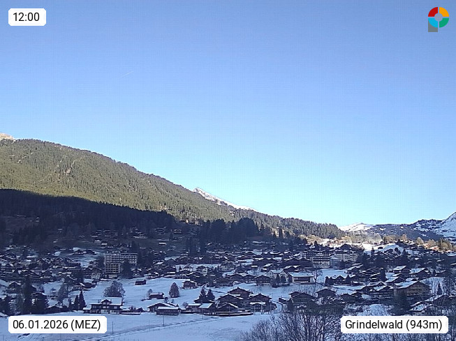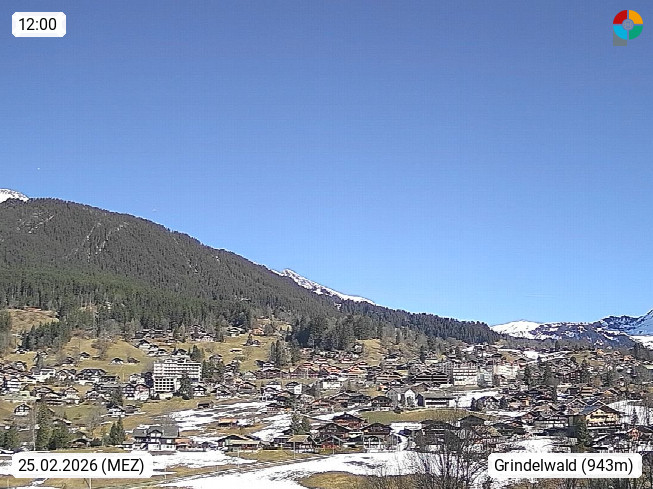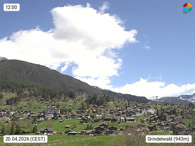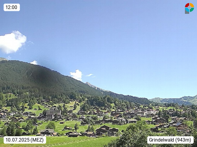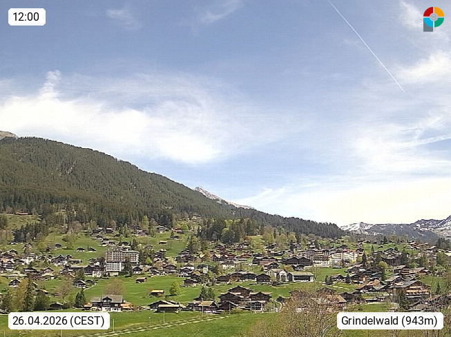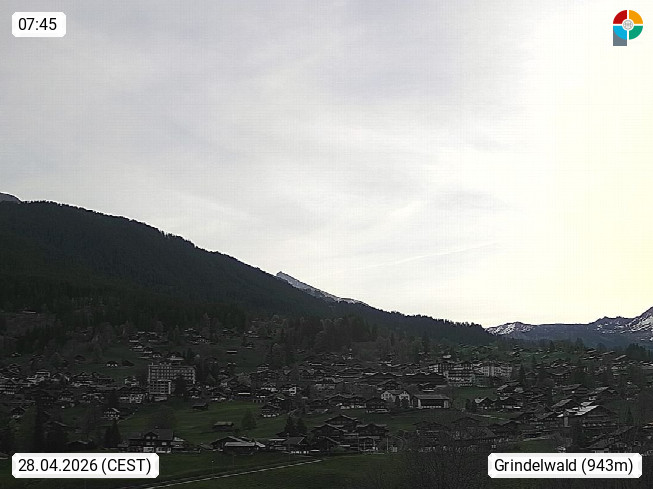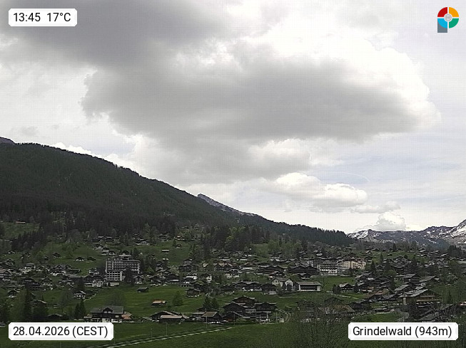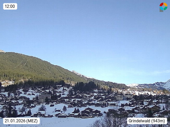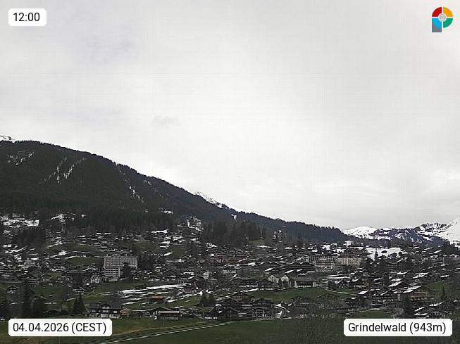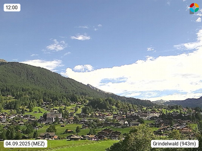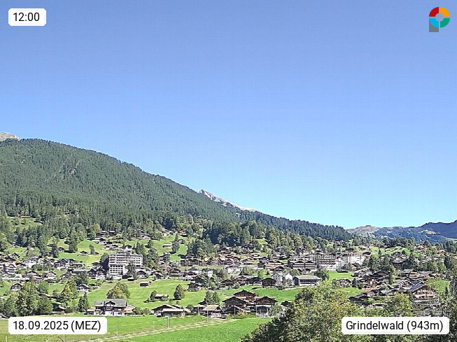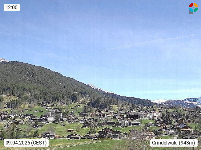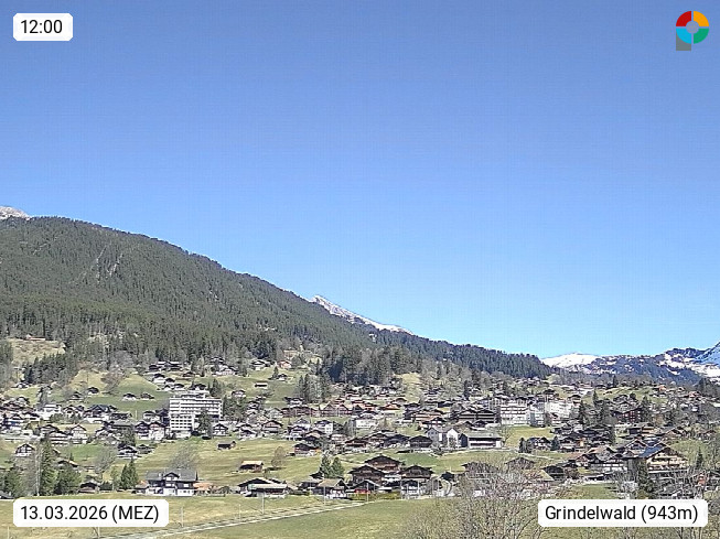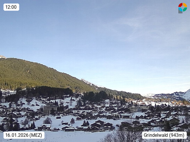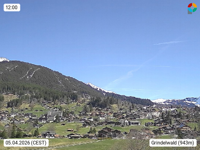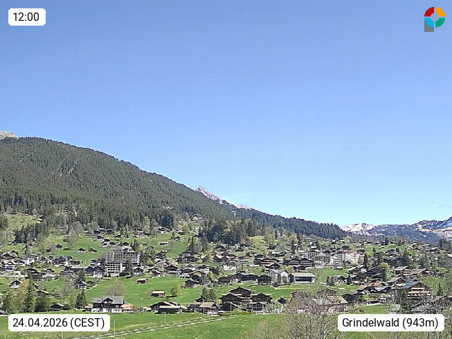 CH 3818 Grindelwald 1.034m, is a village in the district Interlaken in the canton Bern in region Bernese Oberland. The holiday resort presents with the mountains Wetterhorn 3.692m, Schreckhorn 4.078m, Eiger 3.970m, Moench 4.107m and Jungfrau 4.158m an impressing mountain landscape in the Alps of Bern. Panoramic view from the village centre in south direction to the mountain Wetterhorn 3.692m. Presented by https://www.grindelwald.net/.