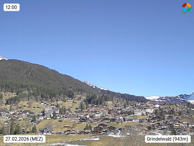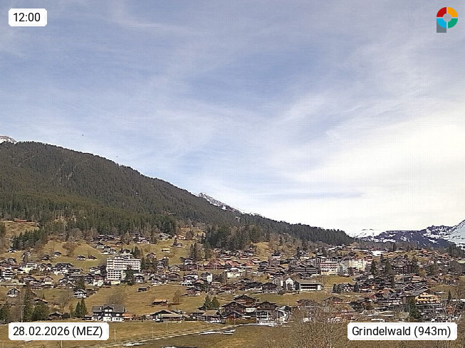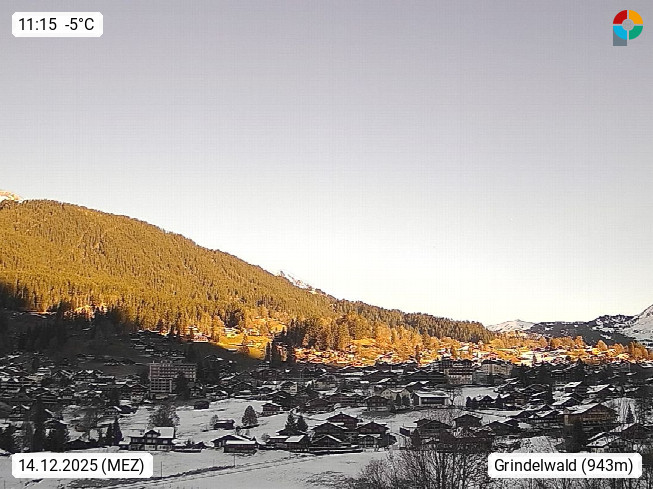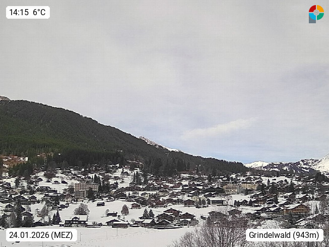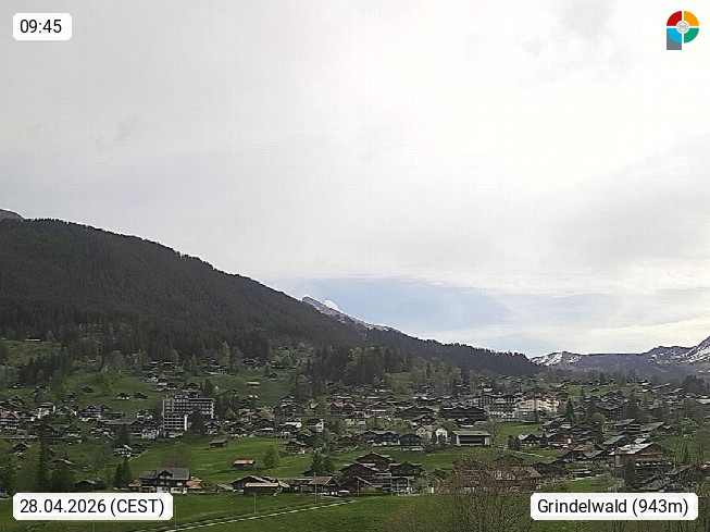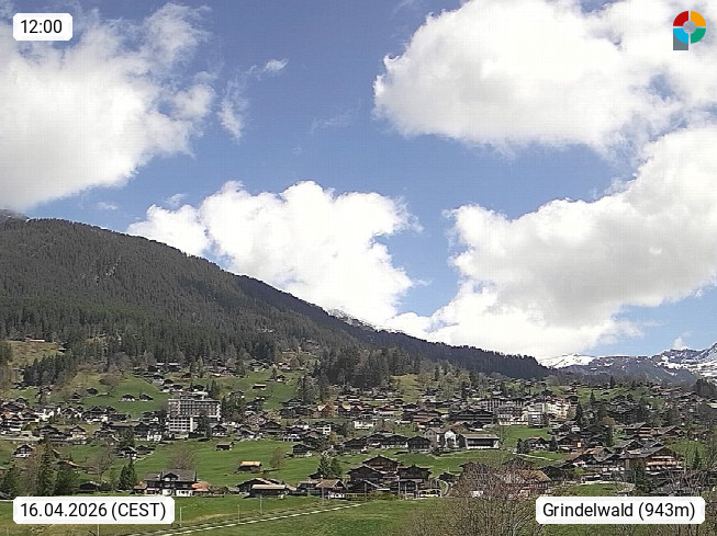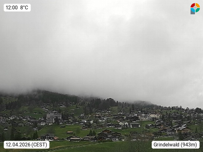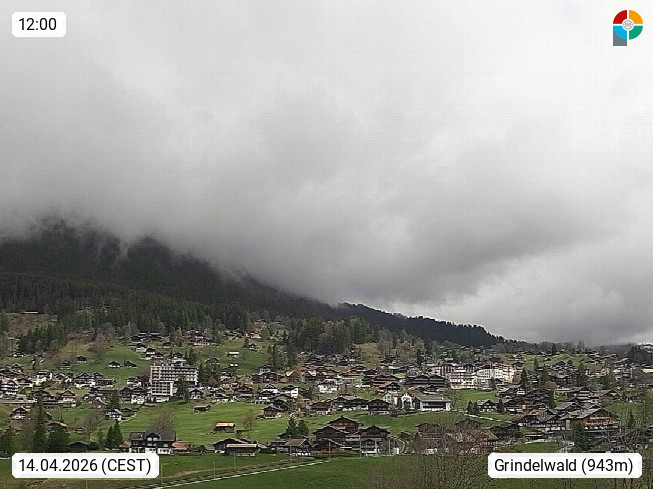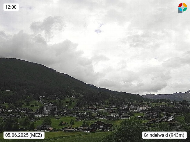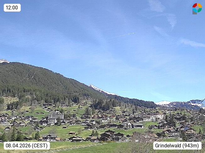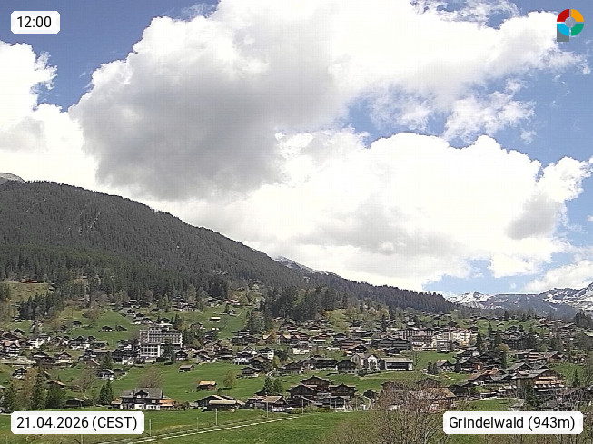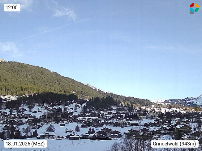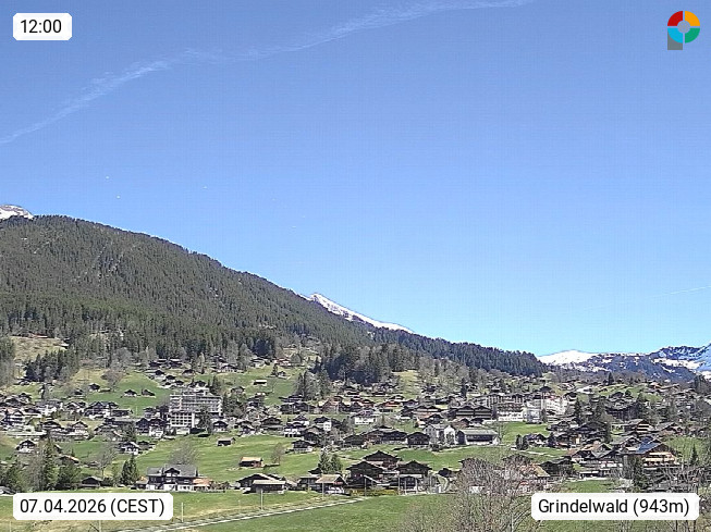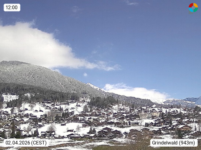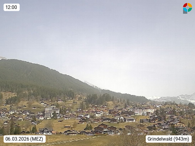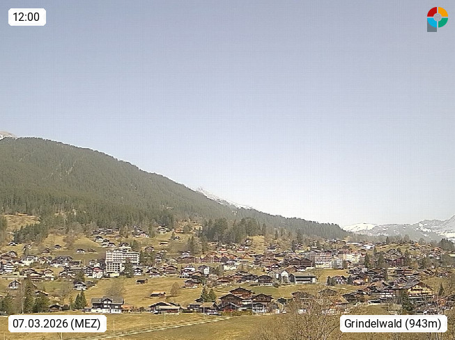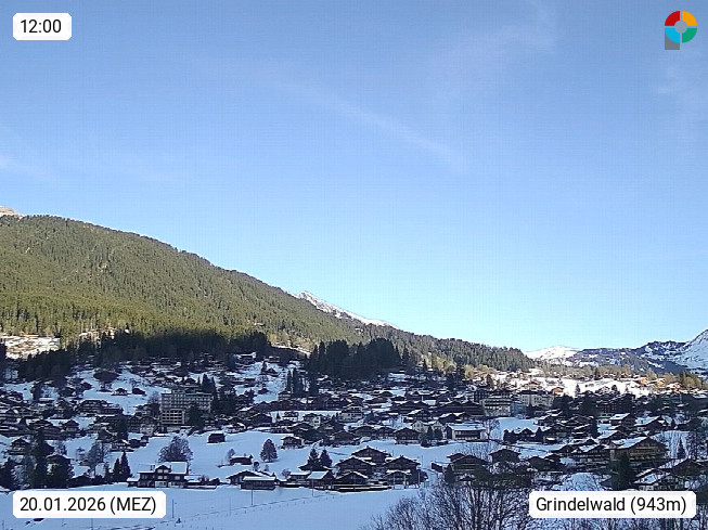 CH 3818 Grindelwald 1.034m, is a village in the district Interlaken in the canton Bern in region Bernese Oberland. The holiday resort presents with the mountains Wetterhorn 3.692m, Schreckhorn 4.078m, Eiger 3.970m, Moench 4.107m and Jungfrau 4.158m an impressing mountain landscape in the Alps of Bern. Panoramic view from the village centre in south direction to the mountain Wetterhorn 3.692m. Presented by https://www.grindelwald.net/.