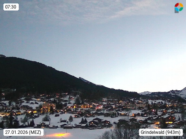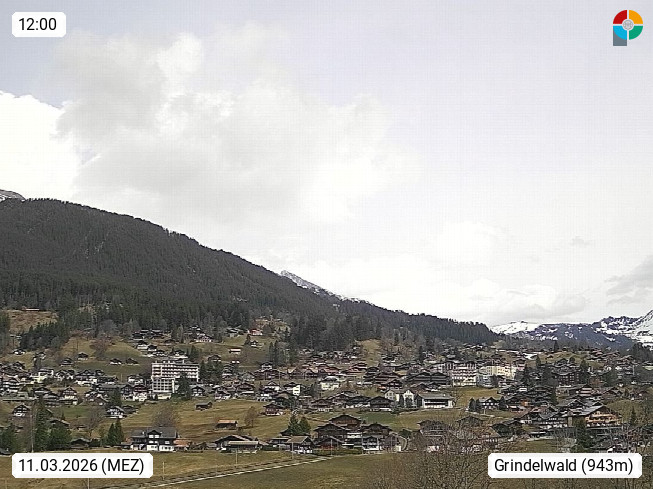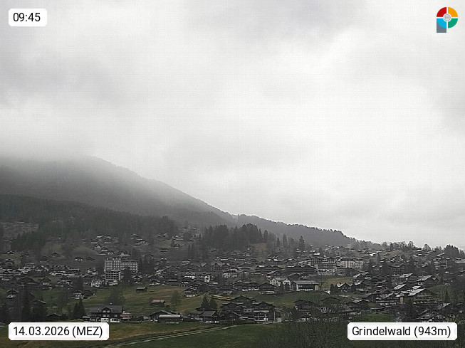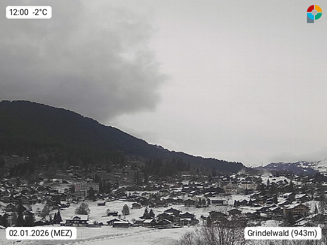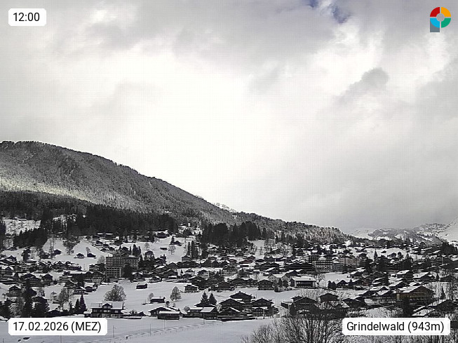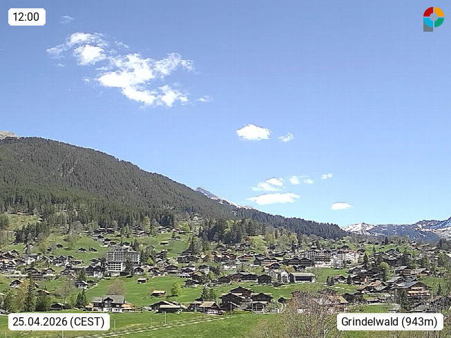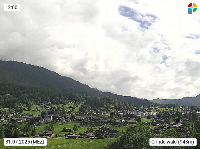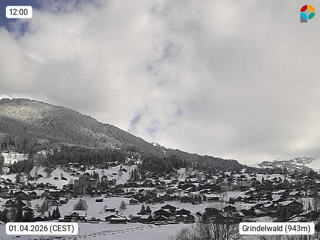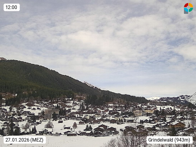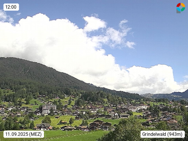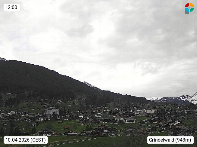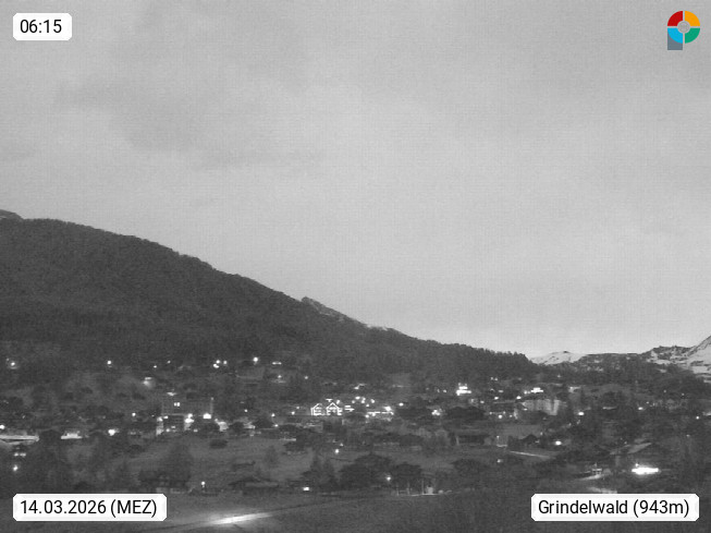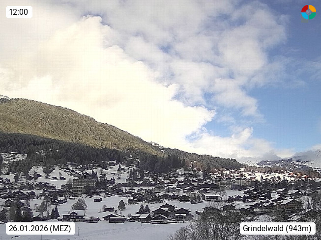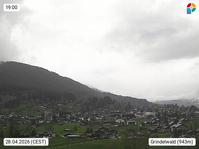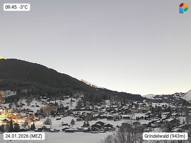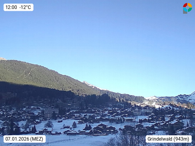 CH 3818 Grindelwald 1.034m, is a village in the district Interlaken in the canton Bern in region Bernese Oberland. The holiday resort presents with the mountains Wetterhorn 3.692m, Schreckhorn 4.078m, Eiger 3.970m, Moench 4.107m and Jungfrau 4.158m an impressing mountain landscape in the Alps of Bern. Panoramic view from the village centre in south direction to the mountain Wetterhorn 3.692m. Presented by https://www.grindelwald.net/.