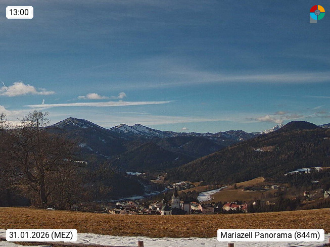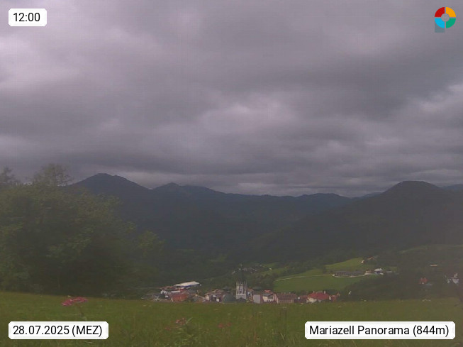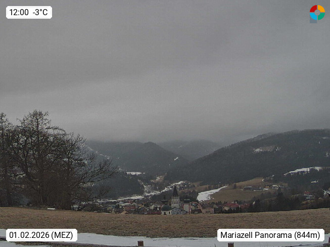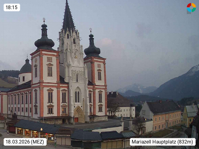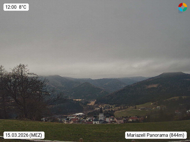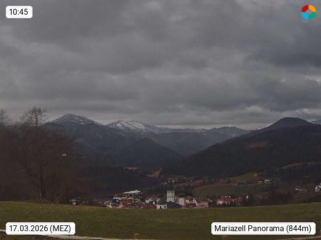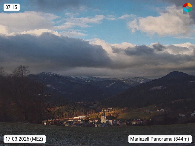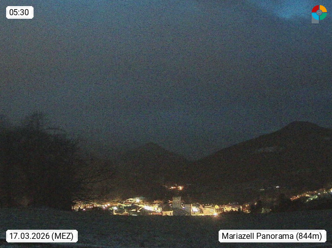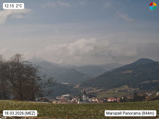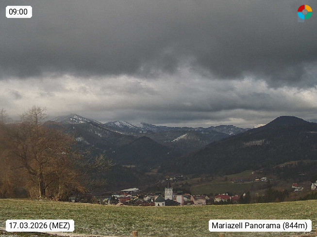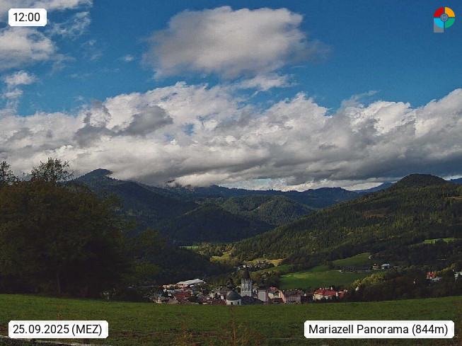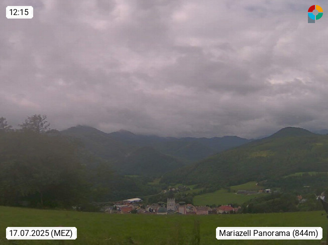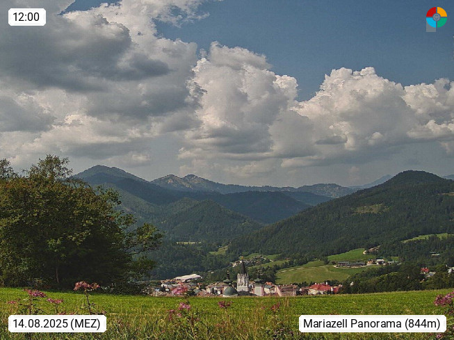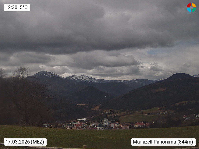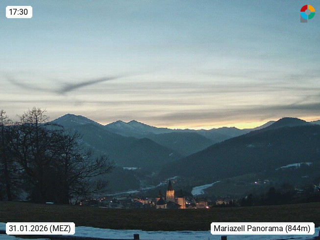A 8630 Mariazell 868m, Austrias most important place of pilgrimage, which is located in the northern Upper Styria region in district Bruck at Mur. Panoramic view from the public observatory1.008m, in west direction to the steeples of the Basilica over Salzatal valley to Mount Zellerhut 1.689m and Duernstein village. Presented by http://www.sbm-web.at.