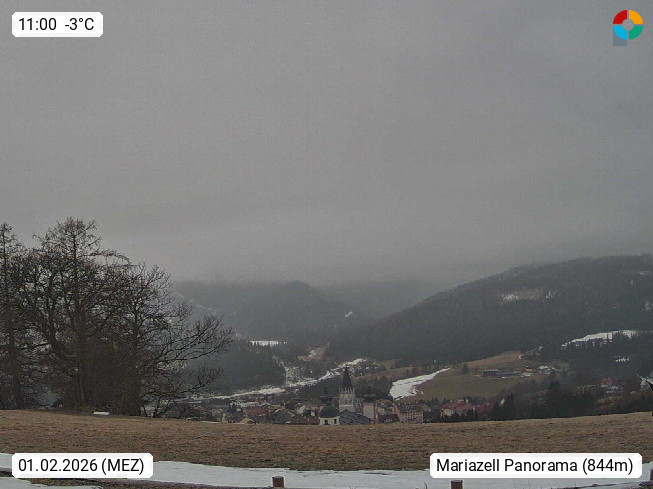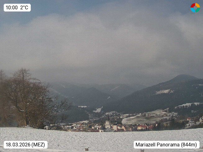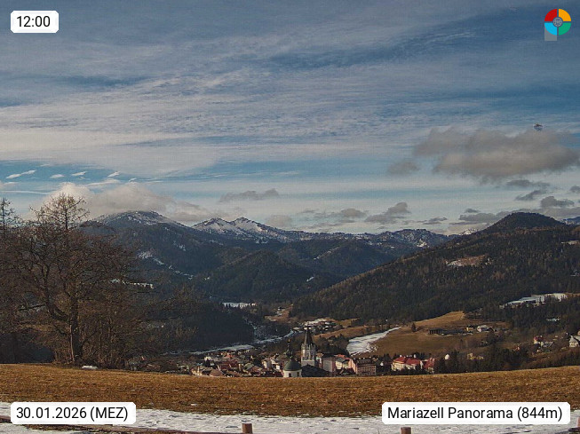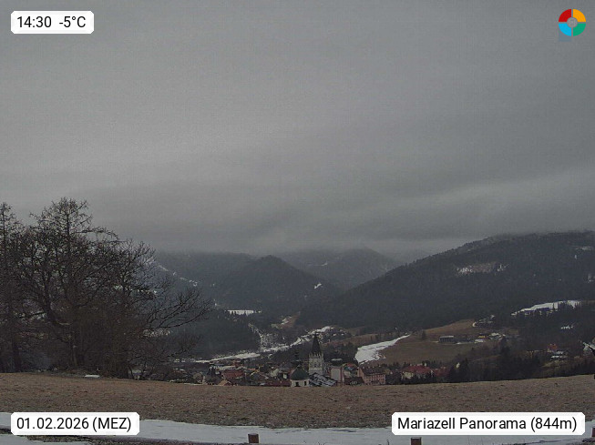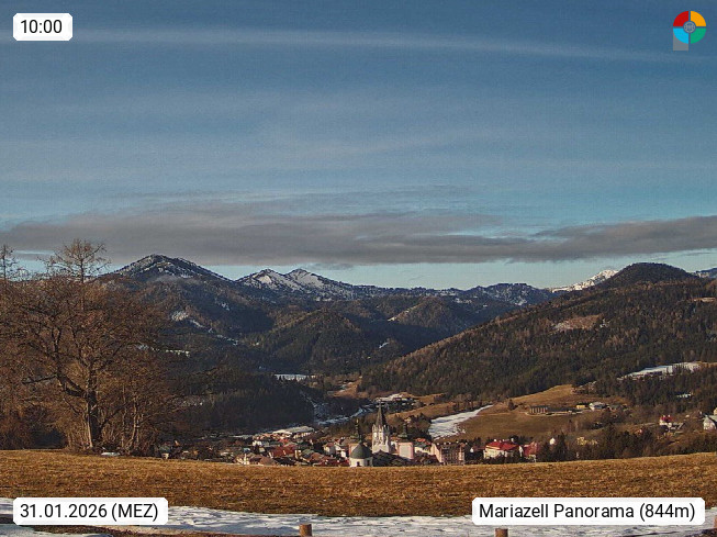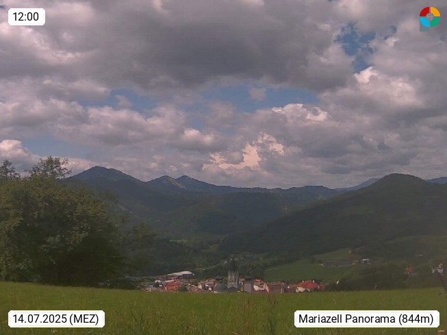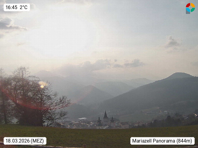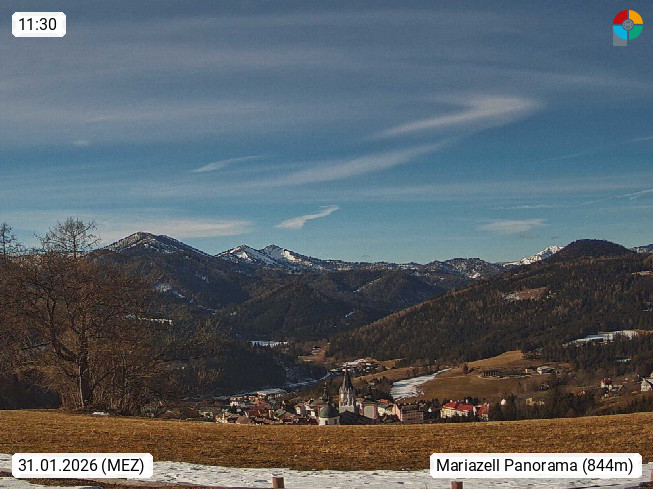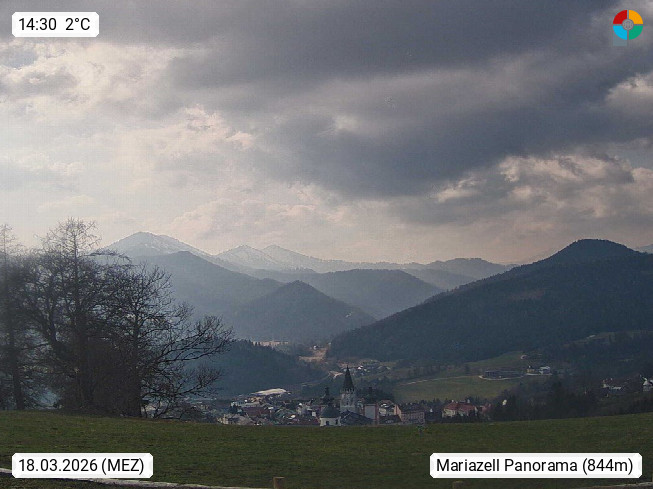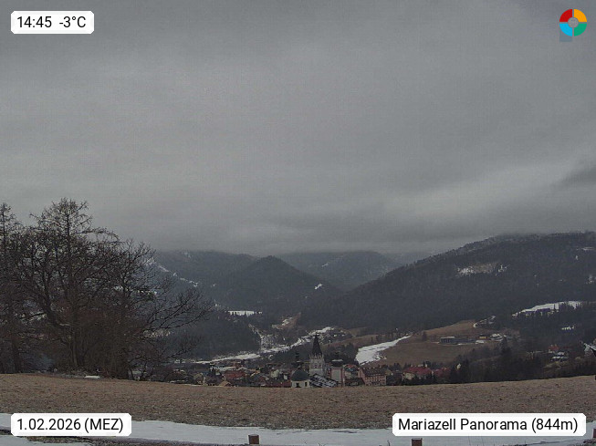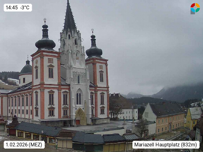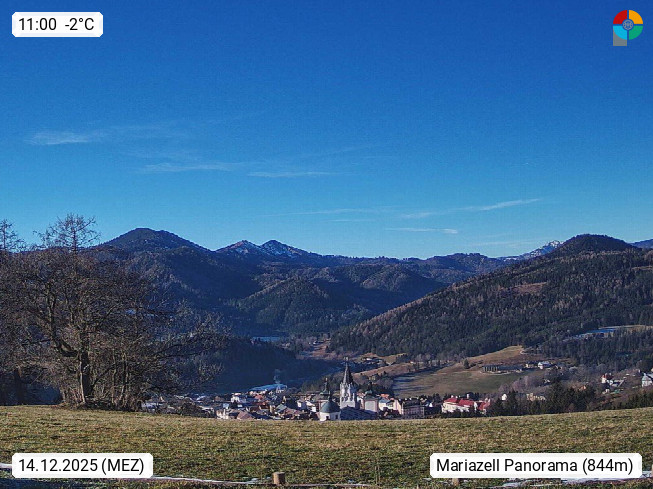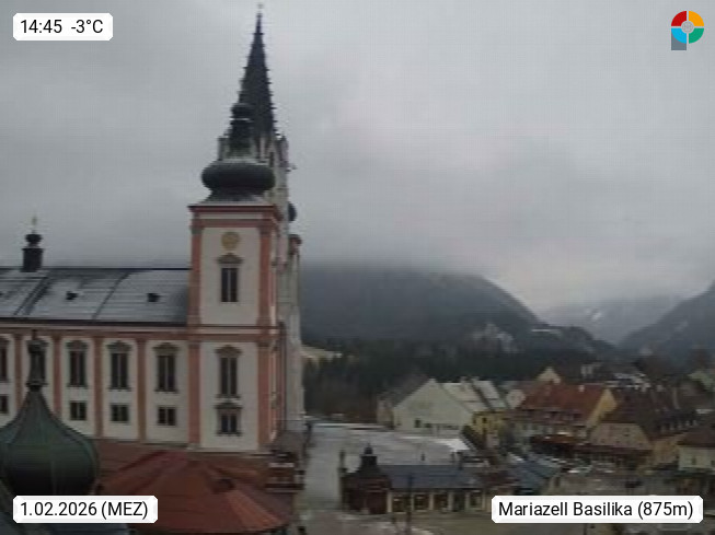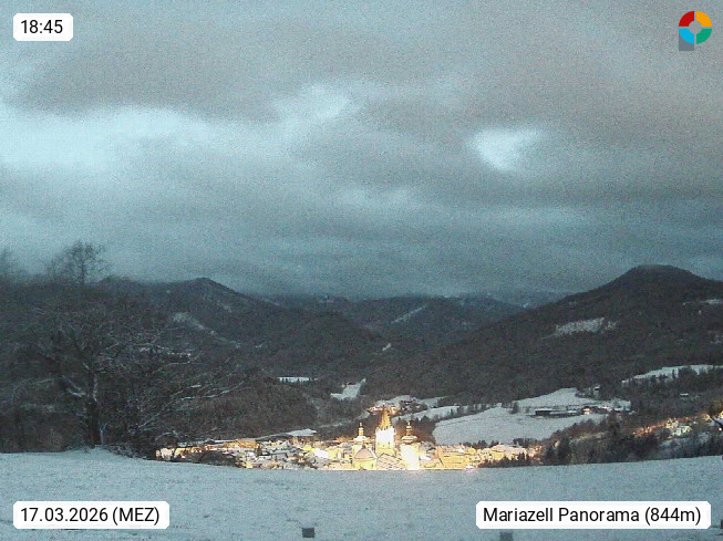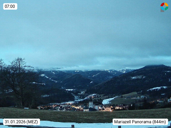 A 8630 Mariazell 868m, Austrias most important place of pilgrimage, which is located in the northern Upper Styria region in district Bruck at Mur. Panoramic view from the public observatory1.008m, in west direction to the steeples of the Basilica over Salzatal valley to Mount Zellerhut 1.689m and Duernstein village. Presented by http://www.sbm-web.at.