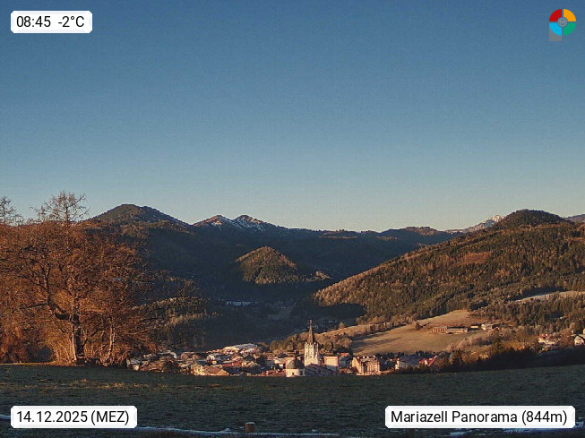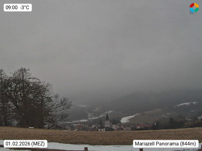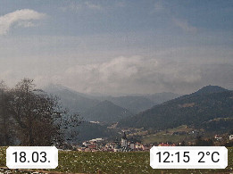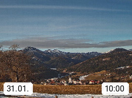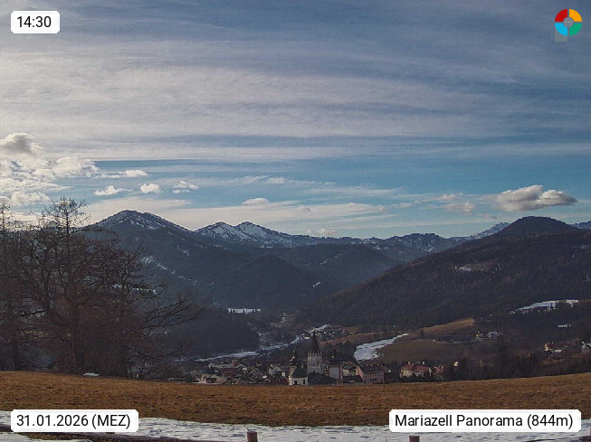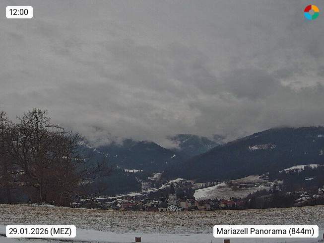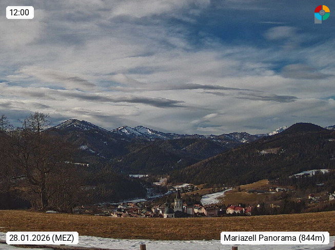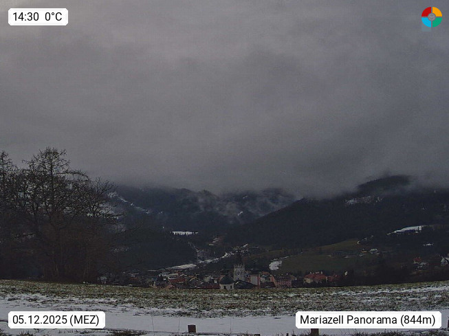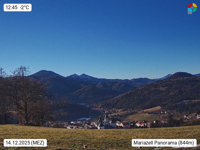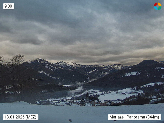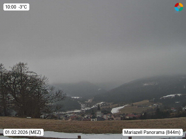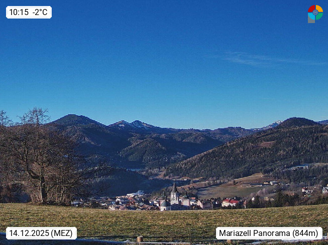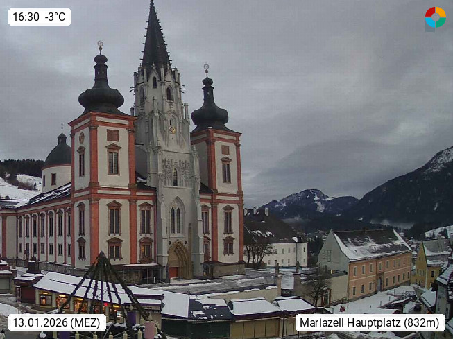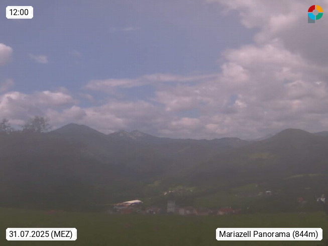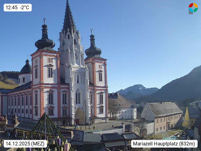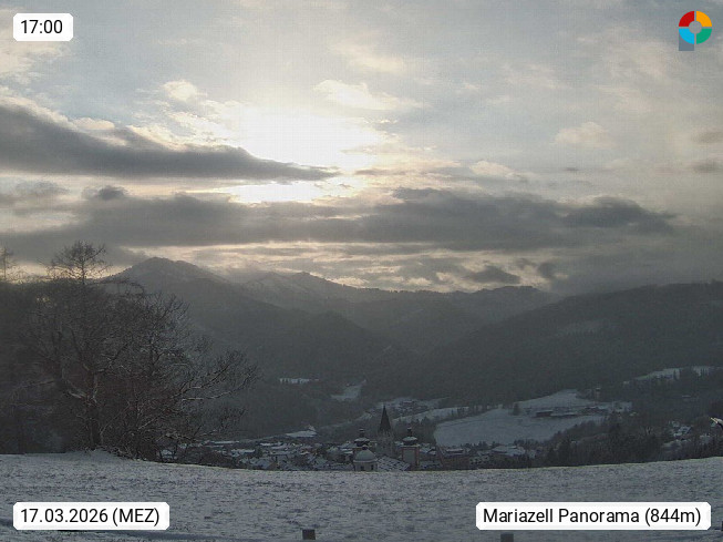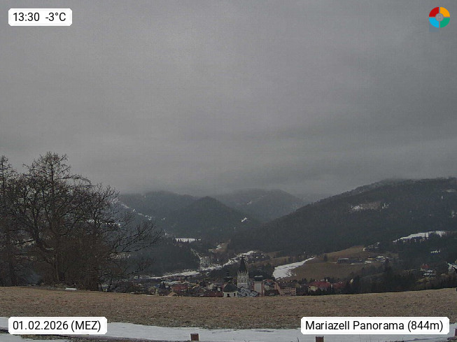 A 8630 Mariazell 868m, Austrias most important place of pilgrimage, which is located in the northern Upper Styria region in district Bruck at Mur. Panoramic view from the public observatory1.008m, in west direction to the steeples of the Basilica over Salzatal valley to Mount Zellerhut 1.689m and Duernstein village. Presented by http://www.sbm-web.at.