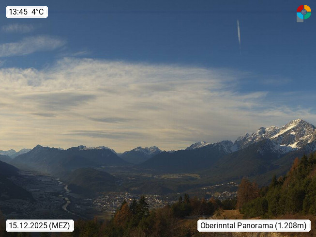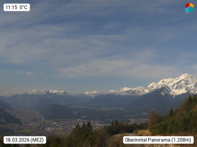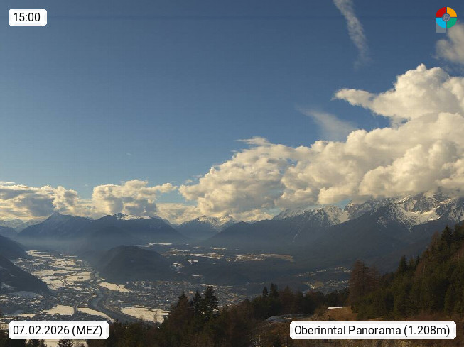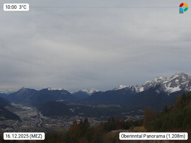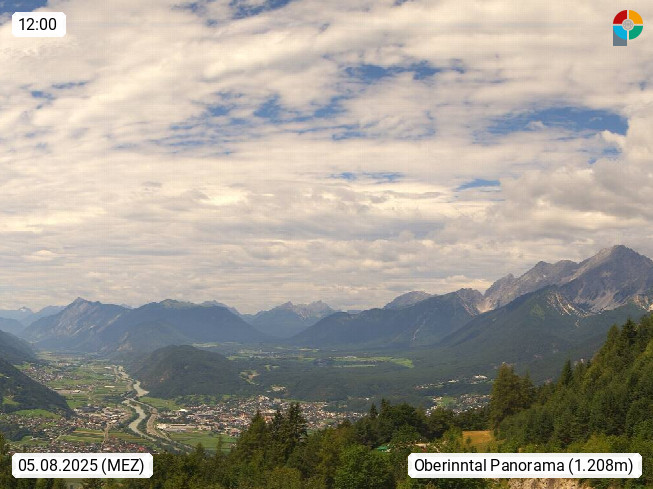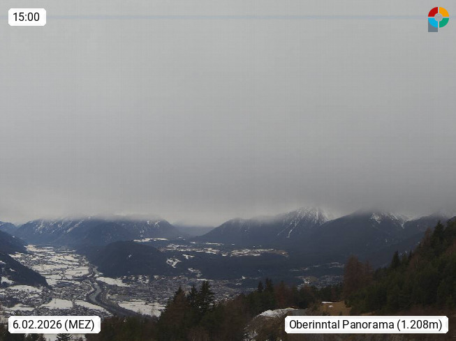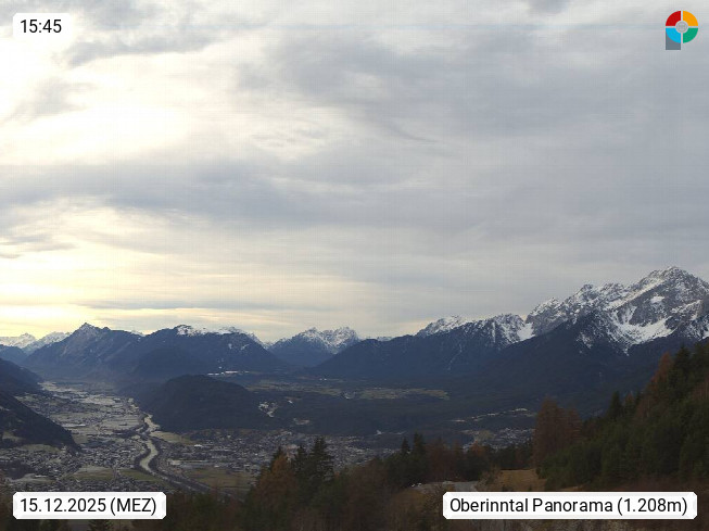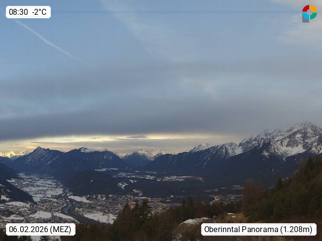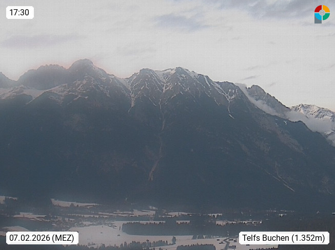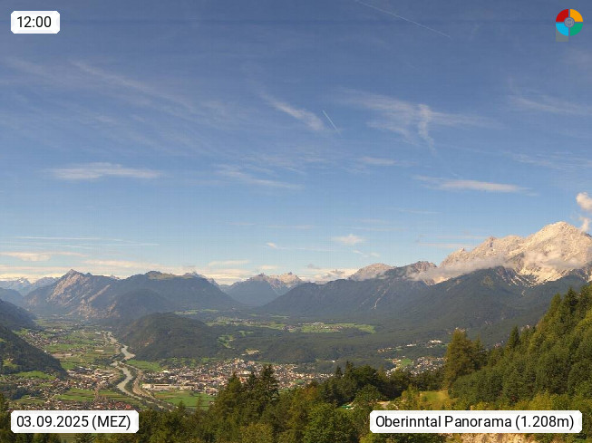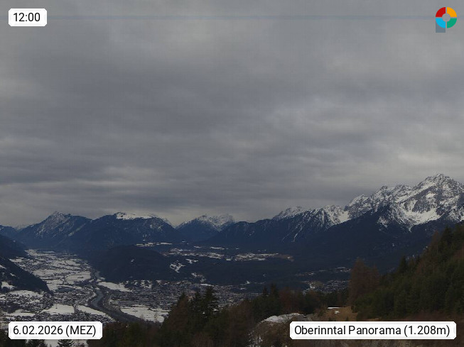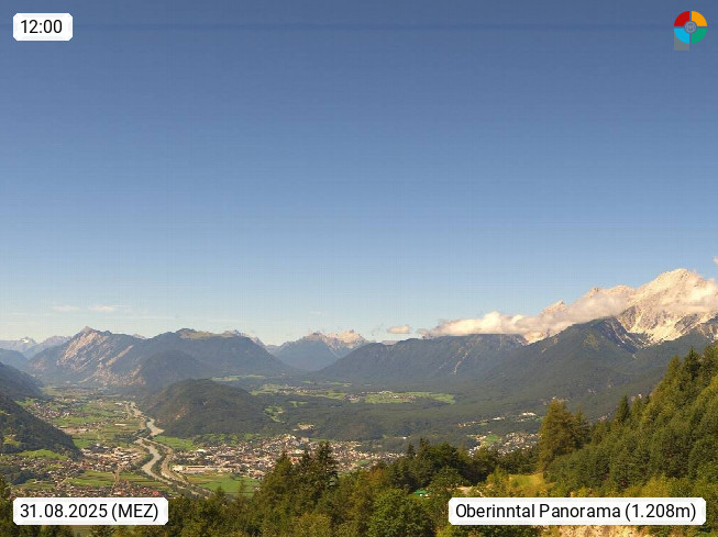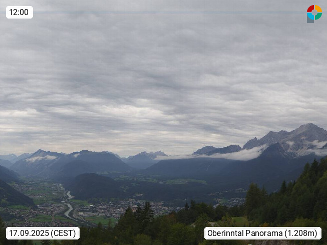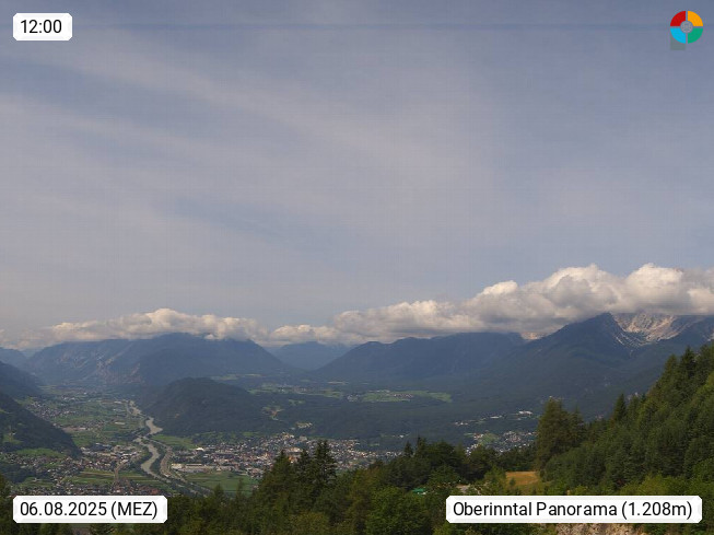 A 6100 Moesern near Seefeld 1.206m, Peace Village in the central Inn Valley, municipality Telfs, in the Olympic region of Seefeld. Panoramic view from Inntaler Hof toward the west, in fine weather to the Arlberg.To the left the Hocheder 2.796m and Rietzer Grießkogel 2.884m in the Stubai Alps. In the valley left of the Inn river you can see Oberpfaffenhofen and right the municipality Telfs. Presented by https://www.inntalerhof.at.