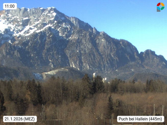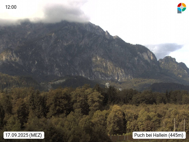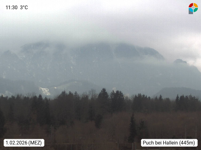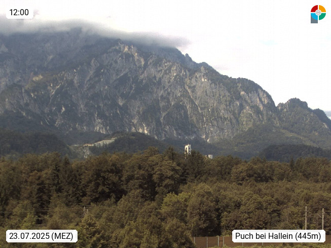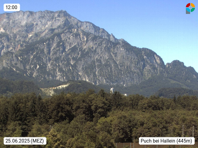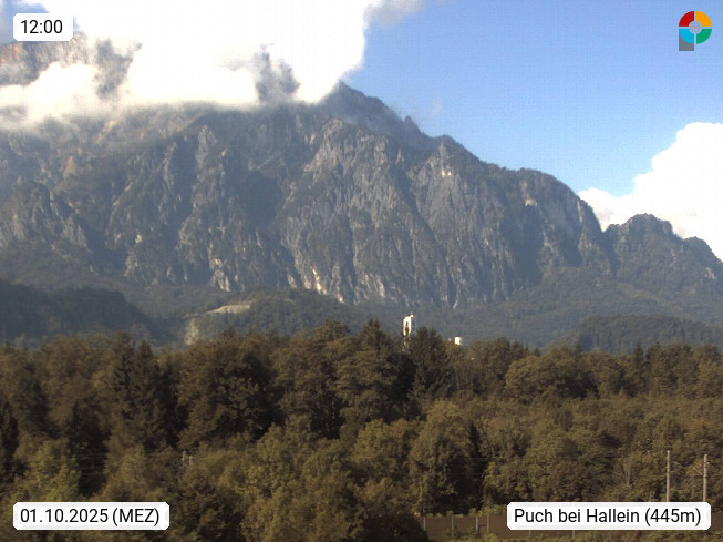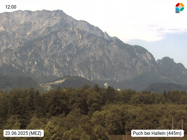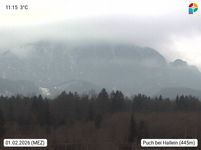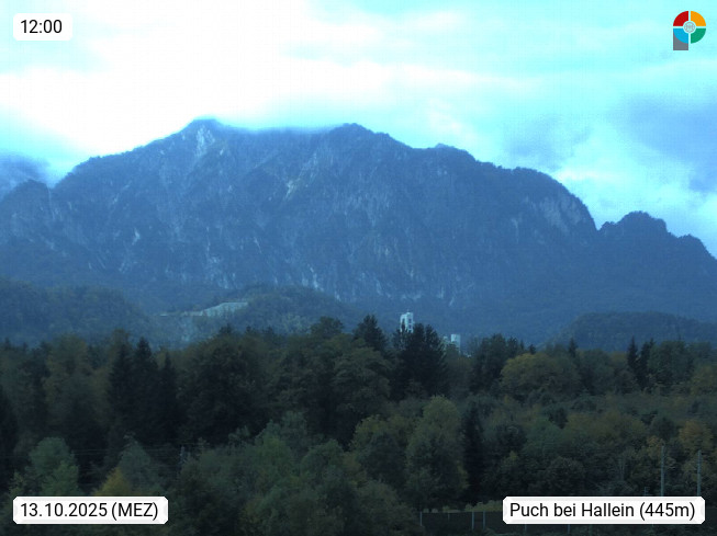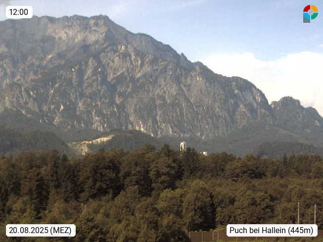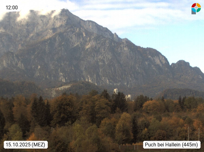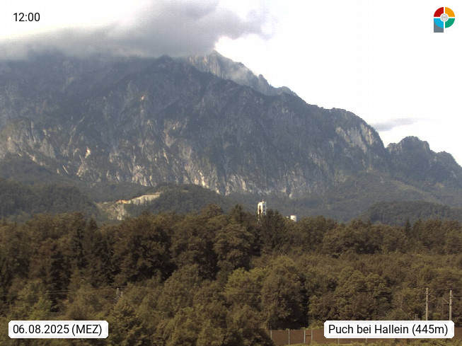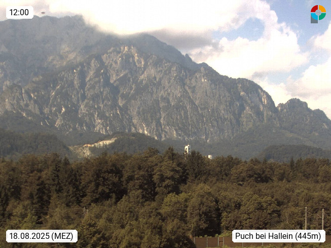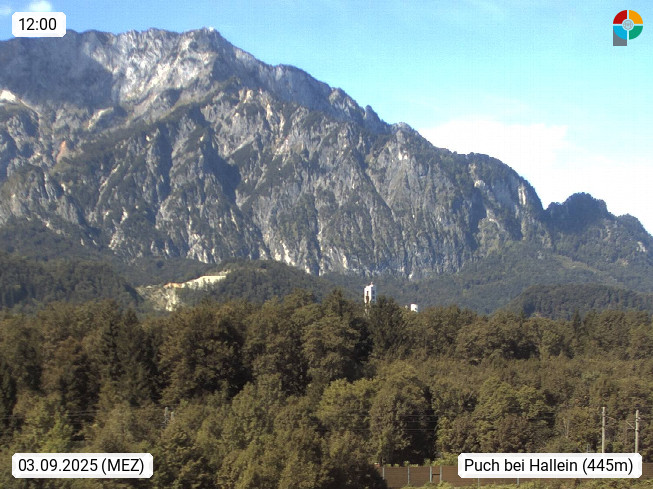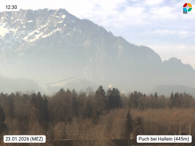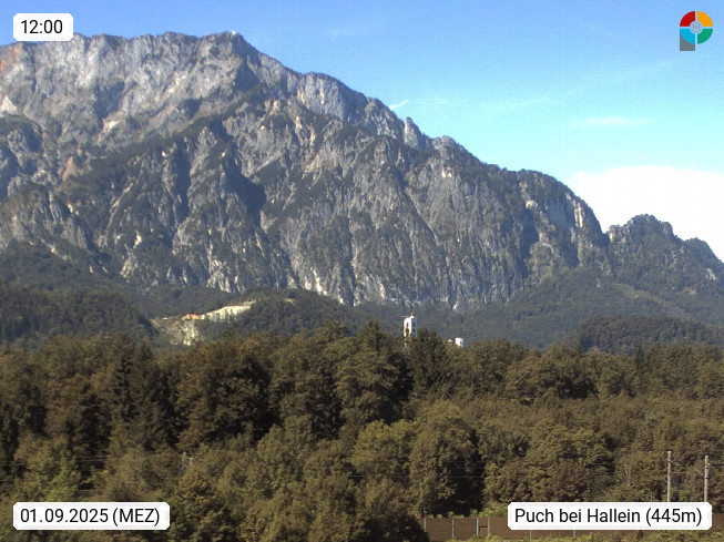 A 5412 Puch at Hallein 444m, is a municipality in the region Salzburger Land in the district Hallein, approximate 10 km south of Salzburg city. Panoramic view in northwest direction to Untersberg mountain, the most northern foothills of the Berchtesgadener Alps with the mountains Berchtesgadener 1.973m and Salzburger 1.853m HOCHTRON. Presented by https://www.kirchenwirt.at/.
