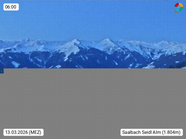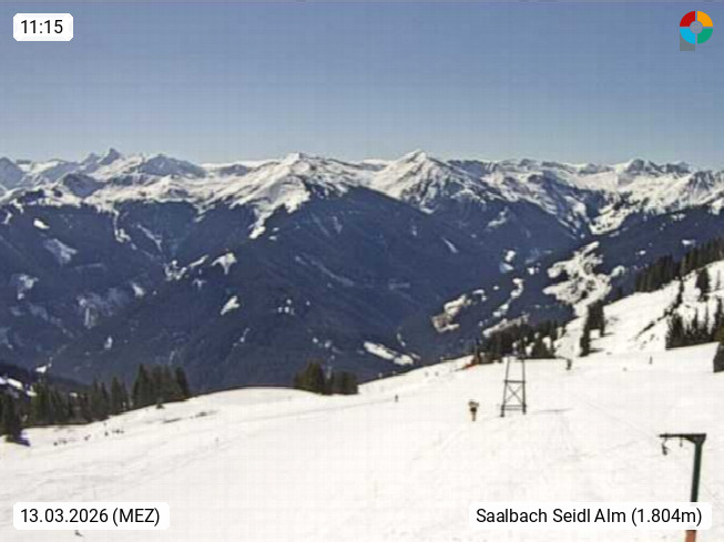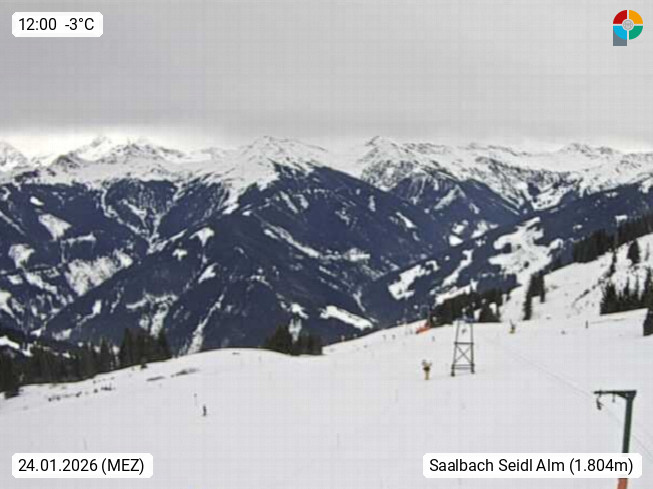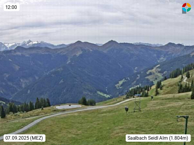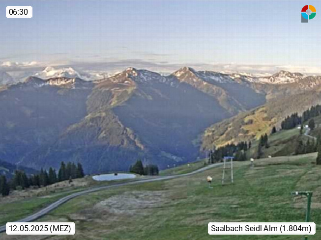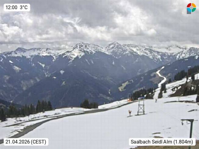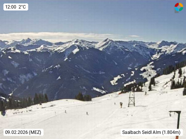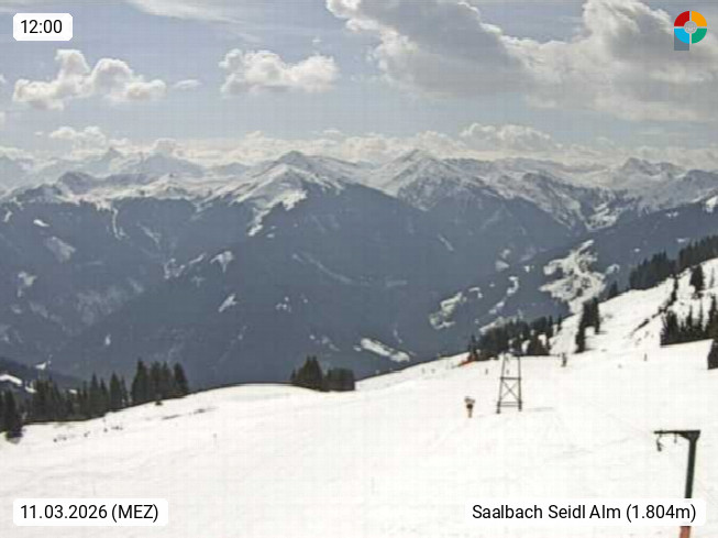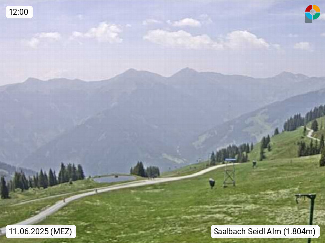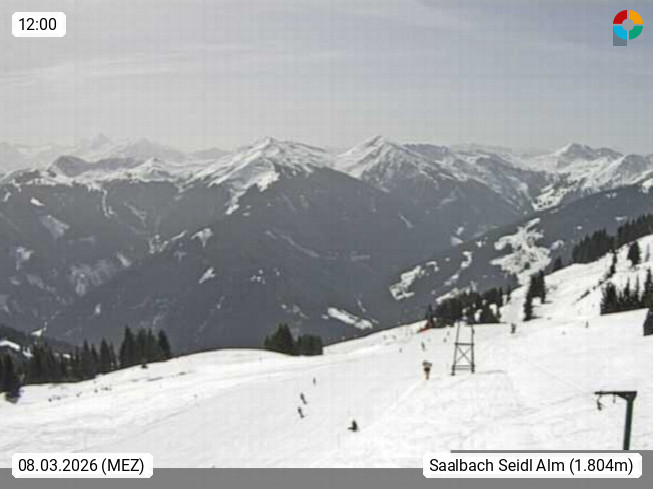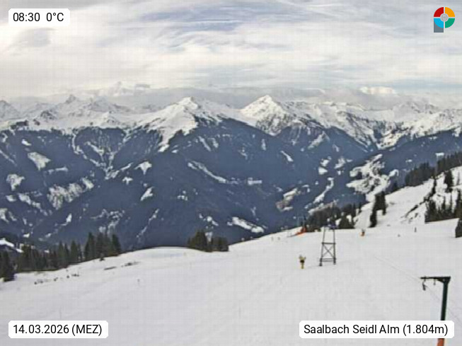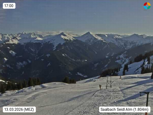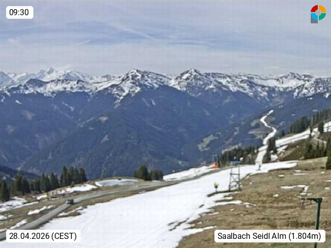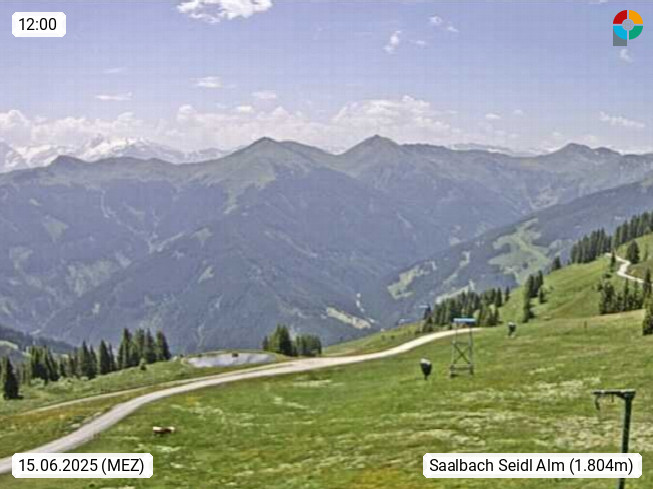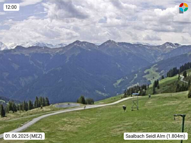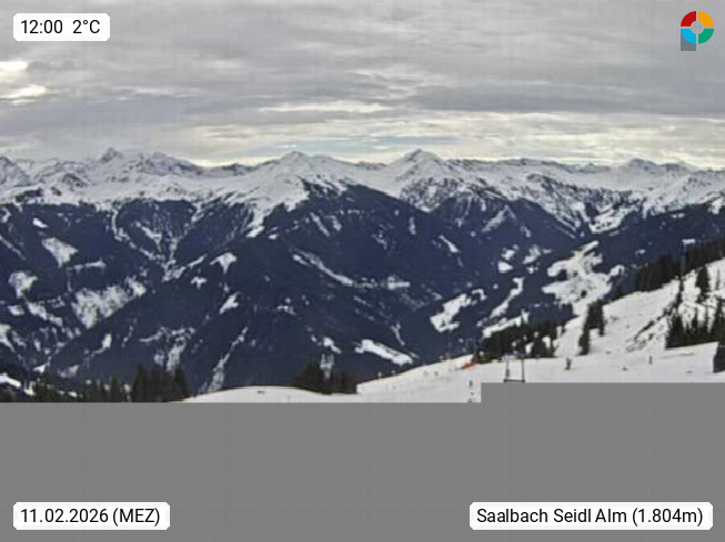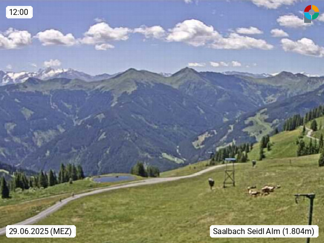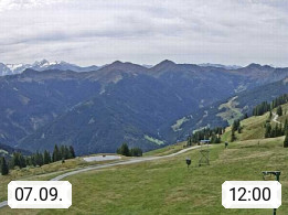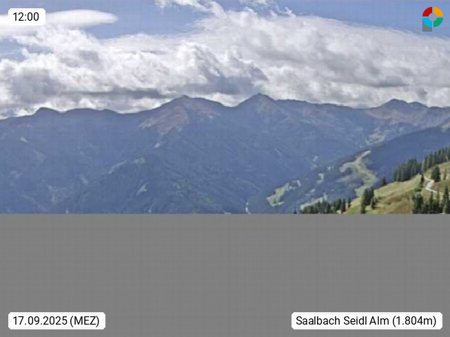A 5753 Saalbach Hinterglemm Seidl Alp 1.804m, Holidayresort in the region Pinzgau in the valley of the river Saalach, wich runs from west to east and belongs to the region of the Kitzbuehler Alps. Panoramic view from the mountain restaurant and Hotel Seidl Alp in 1.804m in south direction to Mount Schattberg 2.095m. Presented by https://seidl-alm.com.