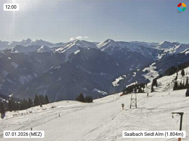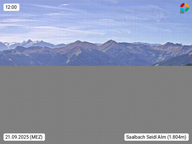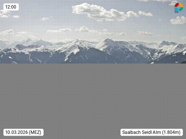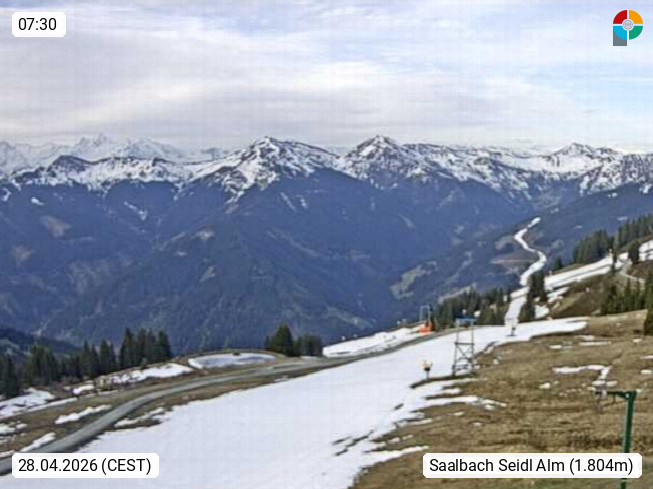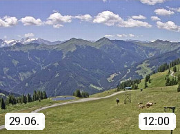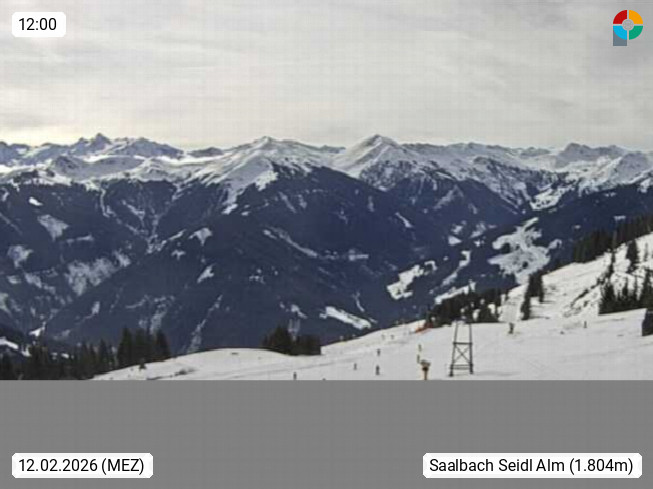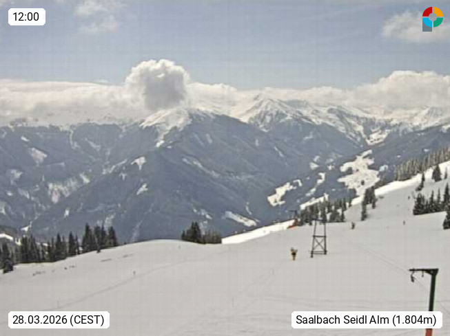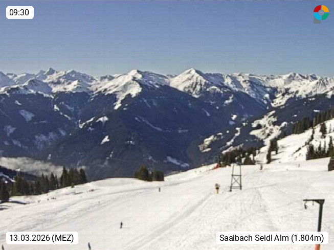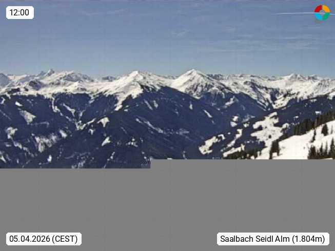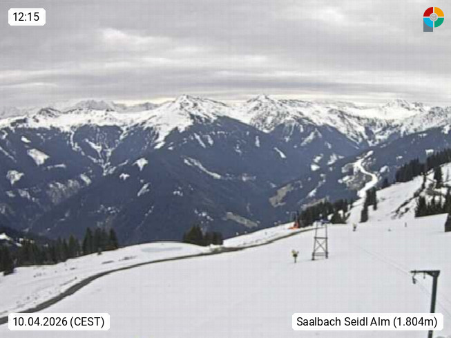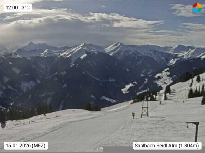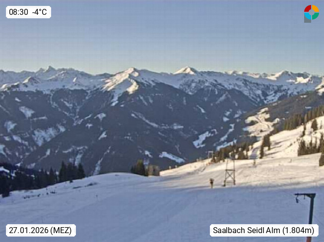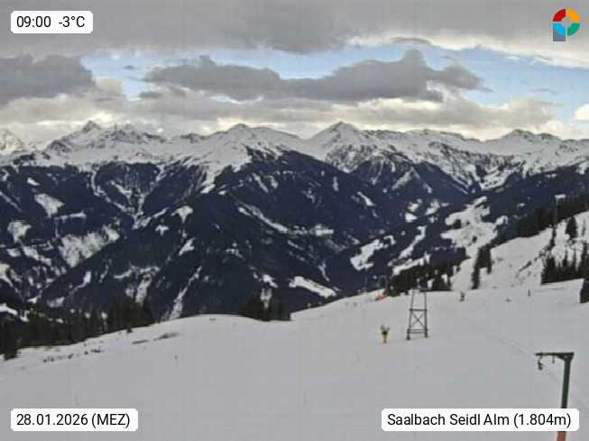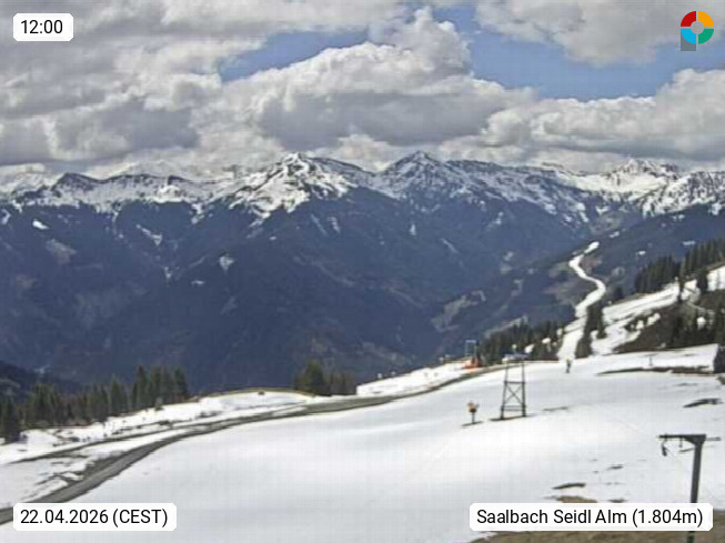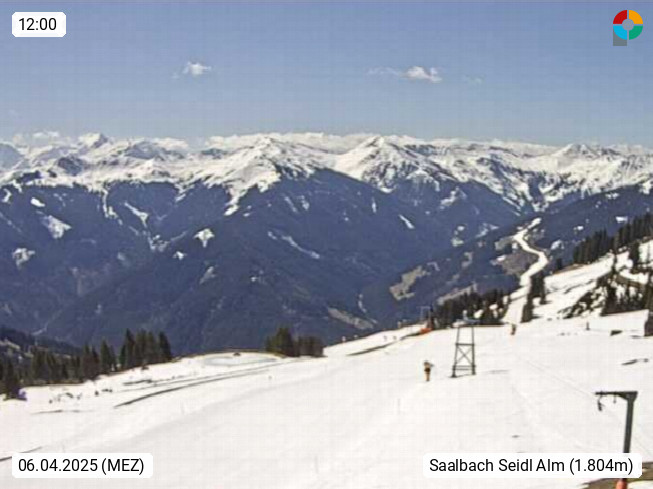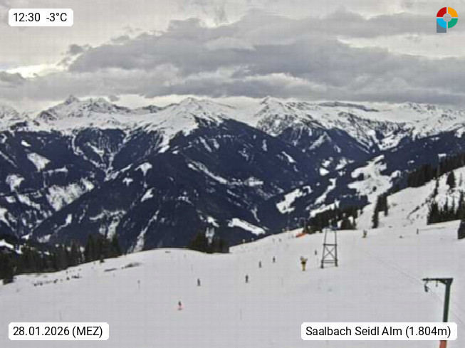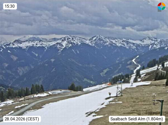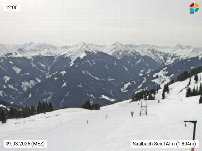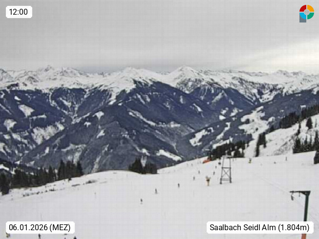 A 5753 Saalbach Hinterglemm Seidl Alp 1.804m, Holidayresort in the region Pinzgau in the valley of the river Saalach, wich runs from west to east and belongs to the region of the Kitzbuehler Alps. Panoramic view from the mountain restaurant and Hotel Seidl Alp in 1.804m in south direction to Mount Schattberg 2.095m. Presented by https://seidl-alm.com.