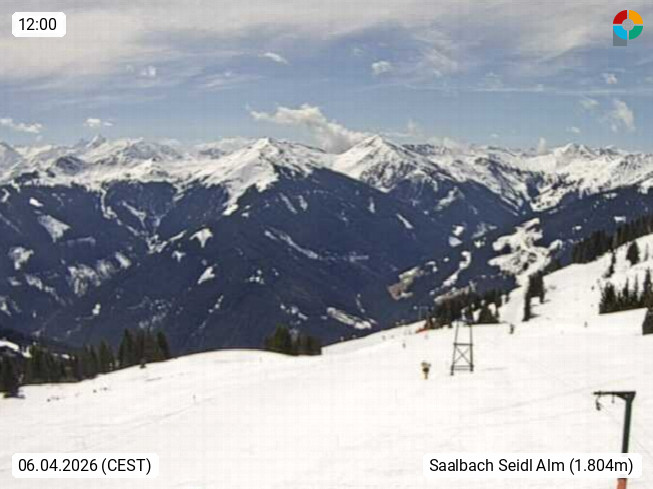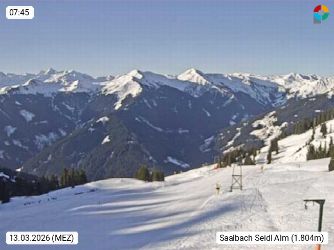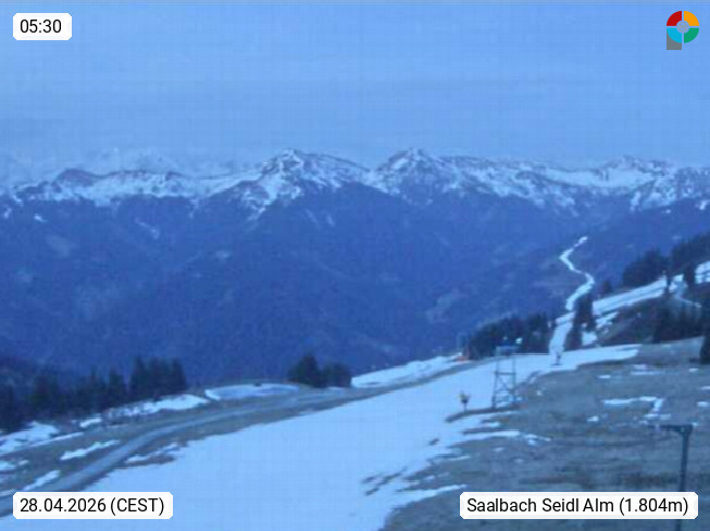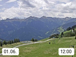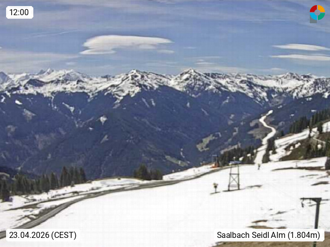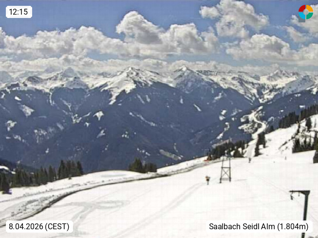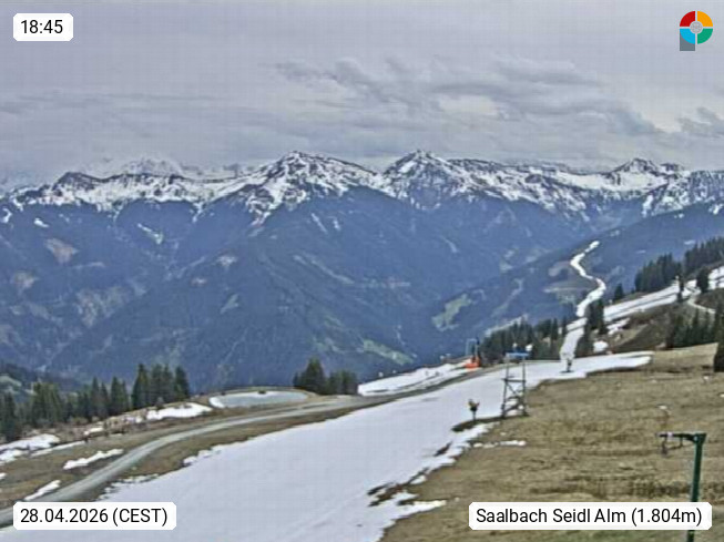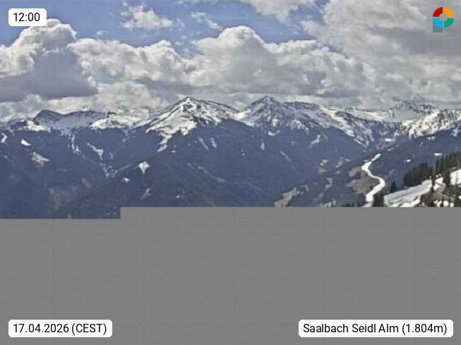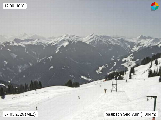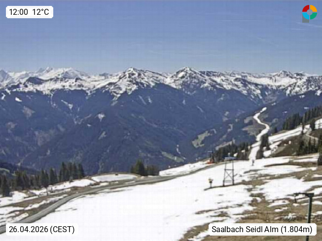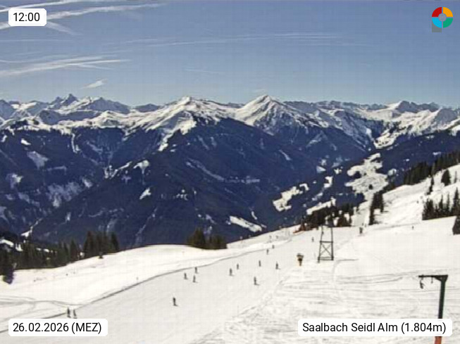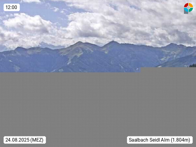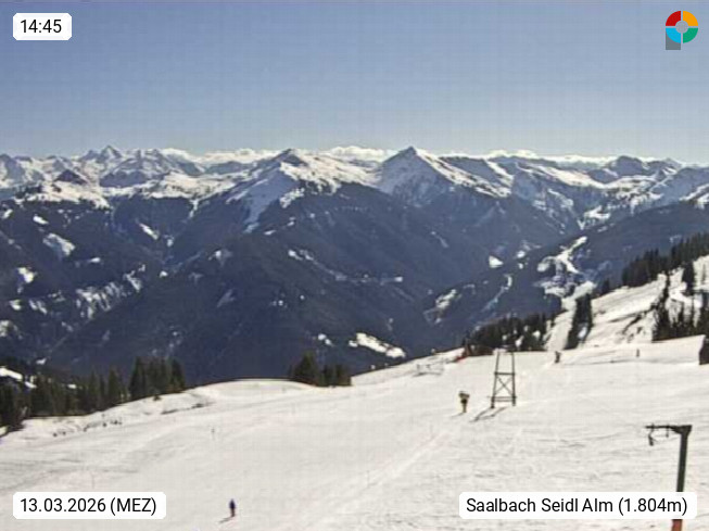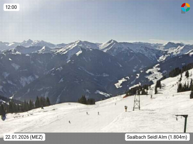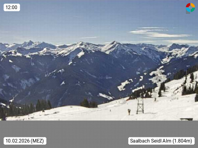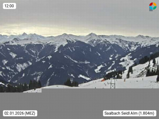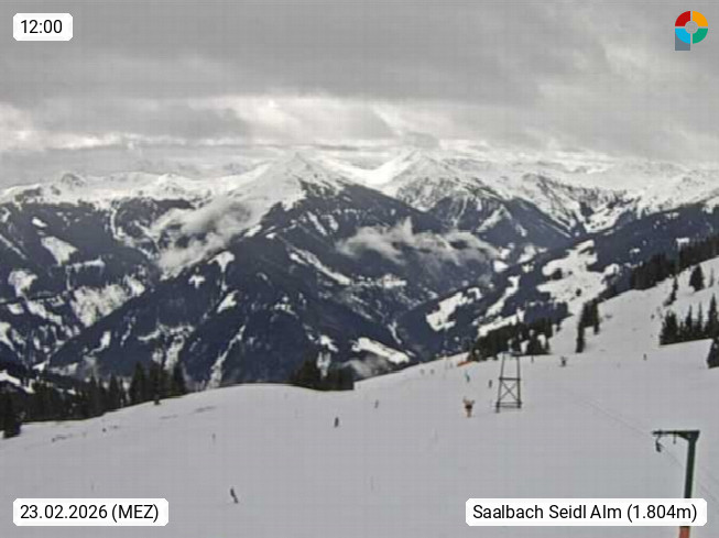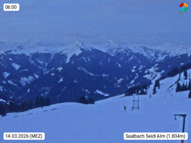 A 5753 Saalbach Hinterglemm Seidl Alp 1.804m, Holidayresort in the region Pinzgau in the valley of the river Saalach, wich runs from west to east and belongs to the region of the Kitzbuehler Alps. Panoramic view from the mountain restaurant and Hotel Seidl Alp in 1.804m in south direction to Mount Schattberg 2.095m. Presented by https://seidl-alm.com.
