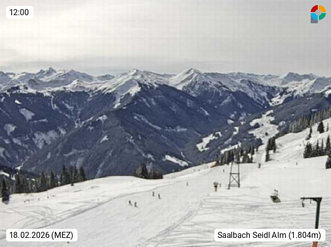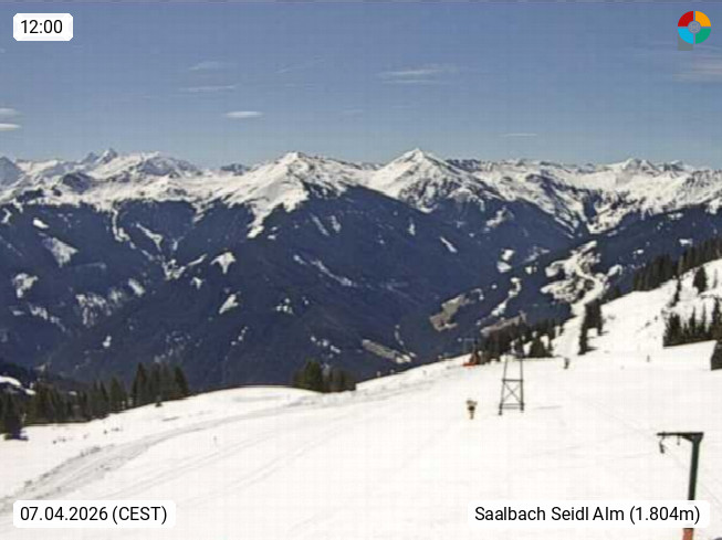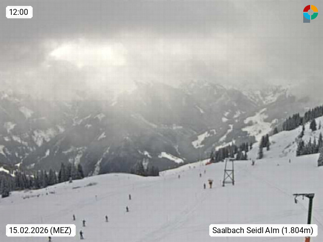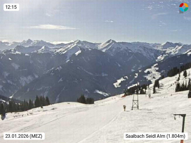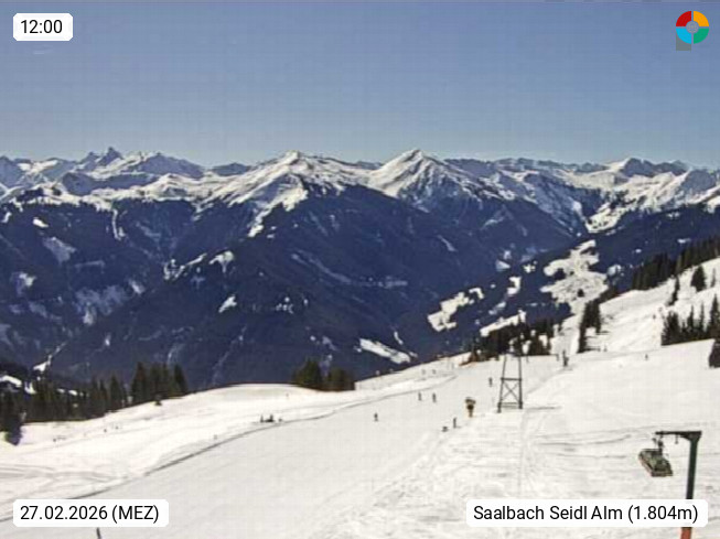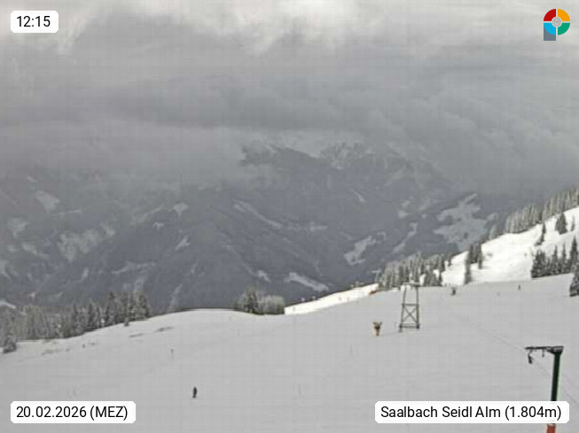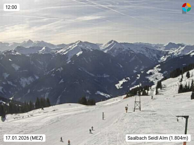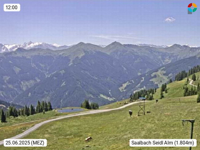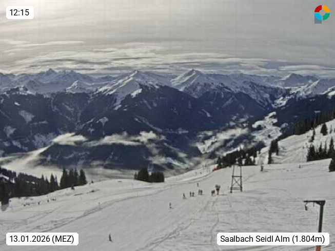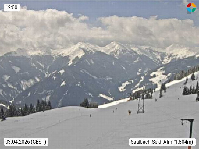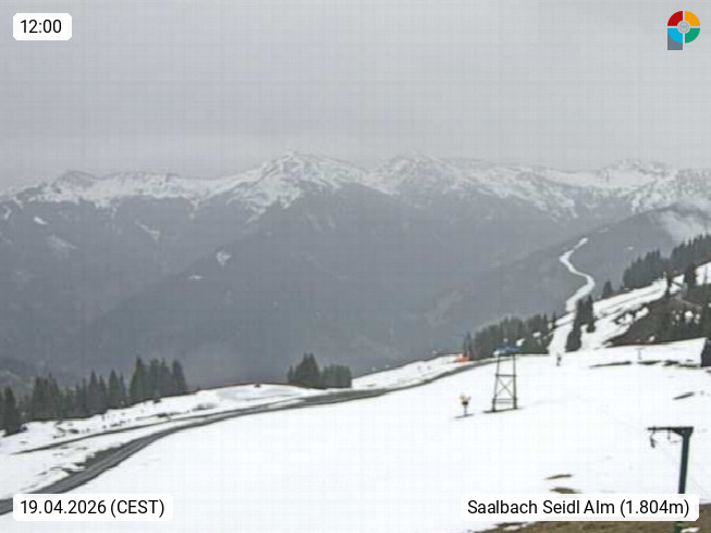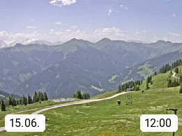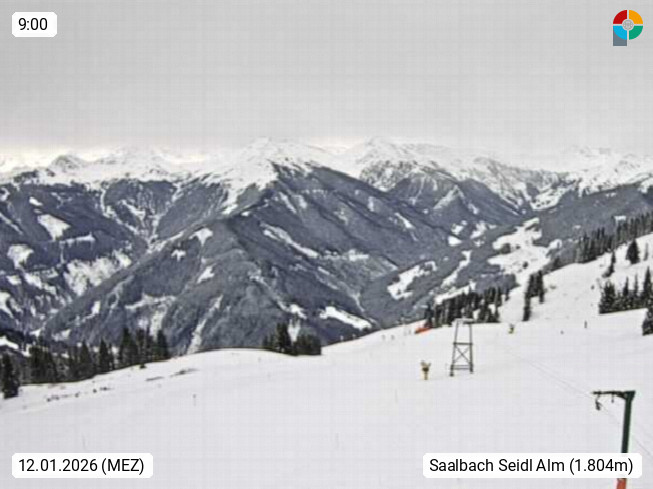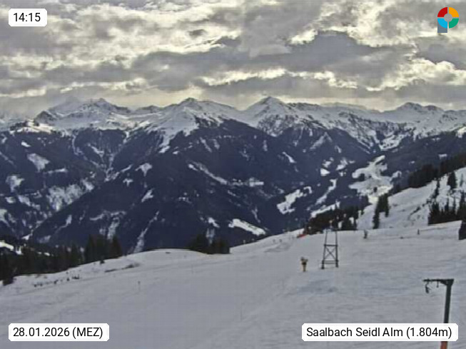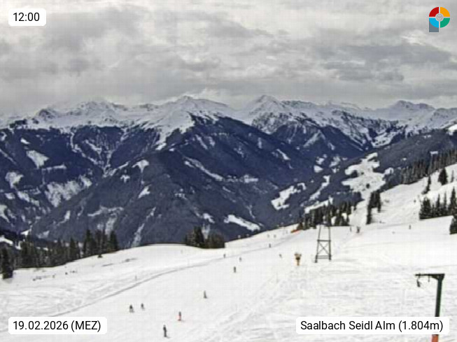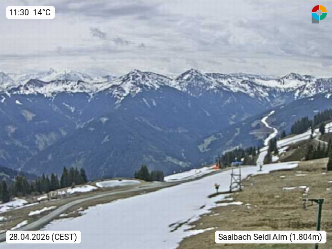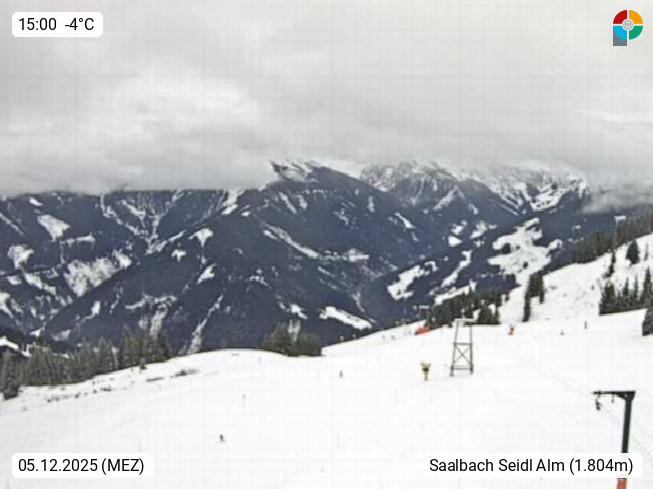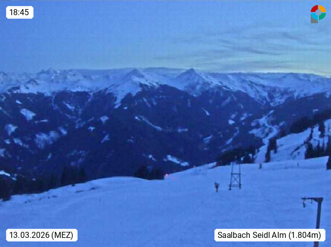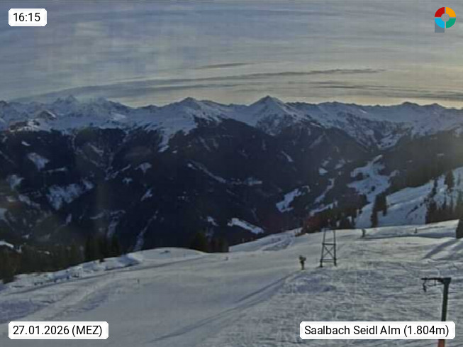 A 5753 Saalbach Hinterglemm Seidl Alp 1.804m, Holidayresort in the region Pinzgau in the valley of the river Saalach, wich runs from west to east and belongs to the region of the Kitzbuehler Alps. Panoramic view from the mountain restaurant and Hotel Seidl Alp in 1.804m in south direction to Mount Schattberg 2.095m. Presented by https://seidl-alm.com.