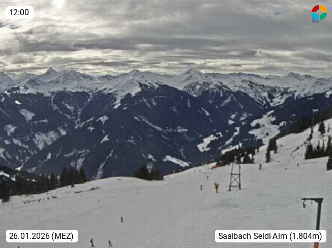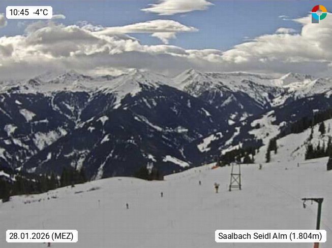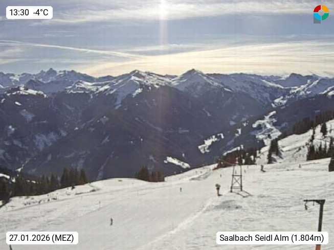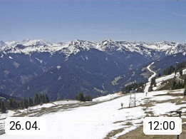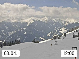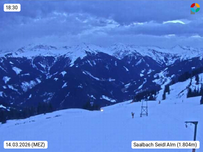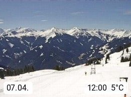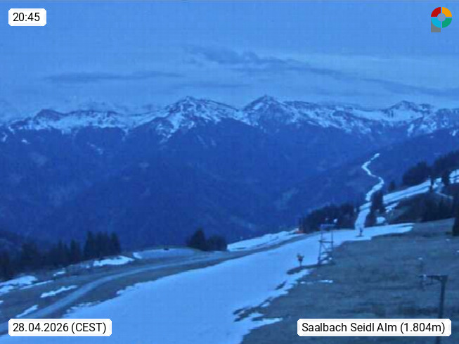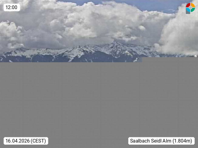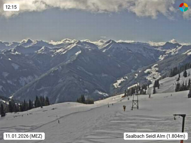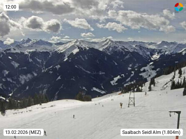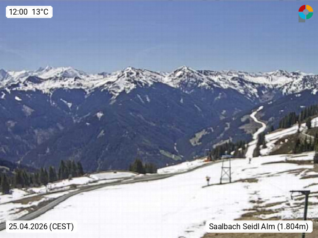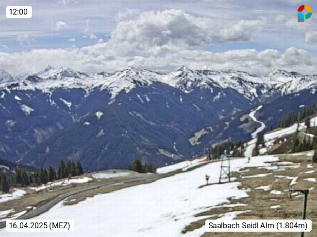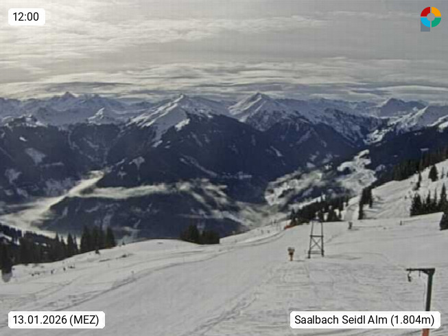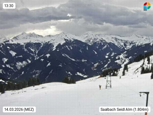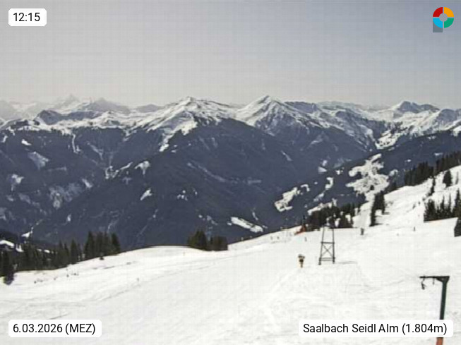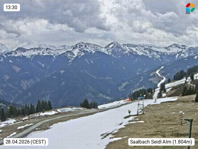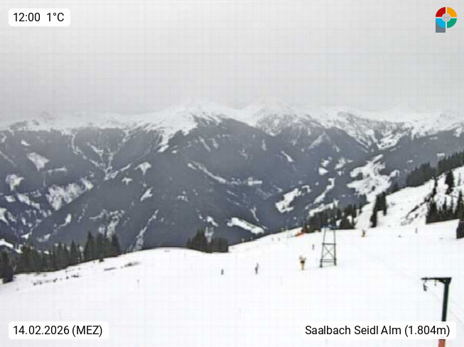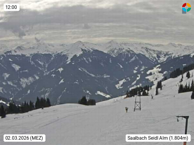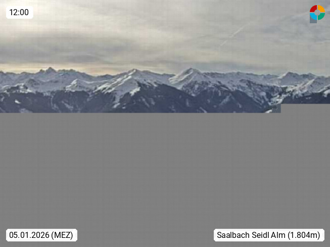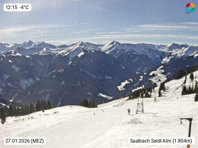 A 5753 Saalbach Hinterglemm Seidl Alp 1.804m, Holidayresort in the region Pinzgau in the valley of the river Saalach, wich runs from west to east and belongs to the region of the Kitzbuehler Alps. Panoramic view from the mountain restaurant and Hotel Seidl Alp in 1.804m in south direction to Mount Schattberg 2.095m. Presented by https://seidl-alm.com.