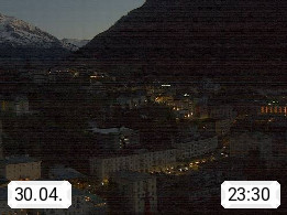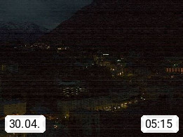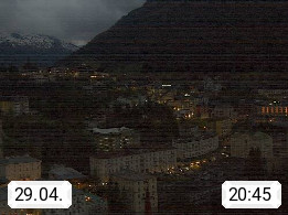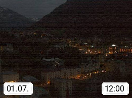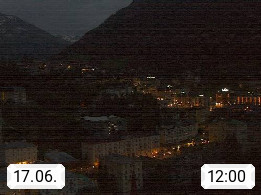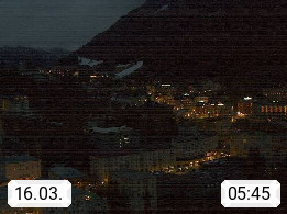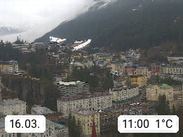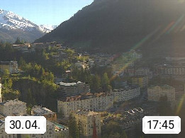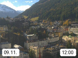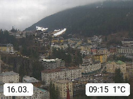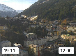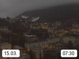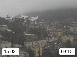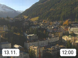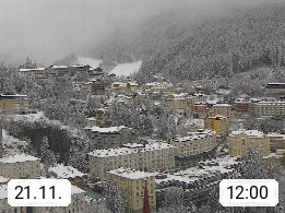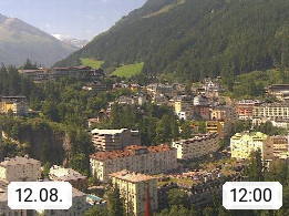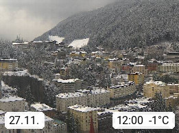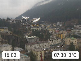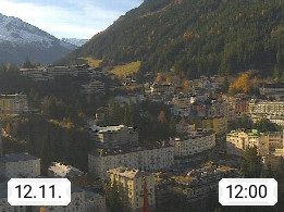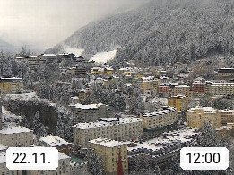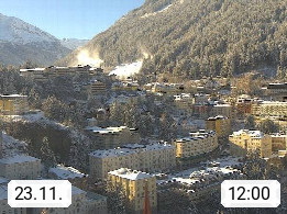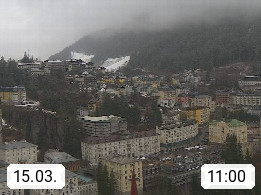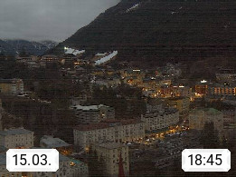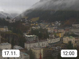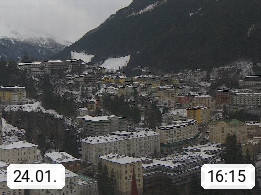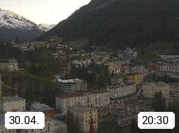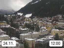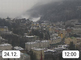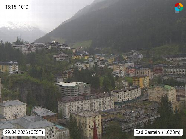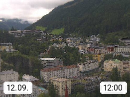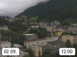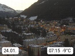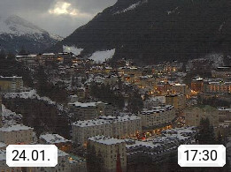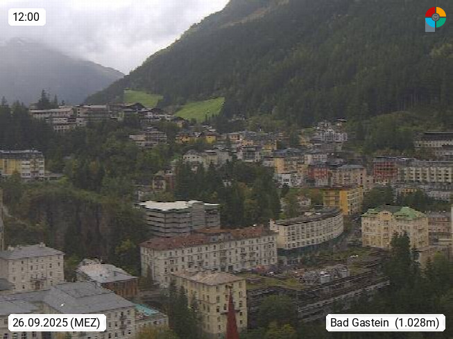 Bad Gastein 1.002m, Kurbad und Wintersportort im Gasteinertal am Fuß des Graukogels. Panoramablick zum Kur und Kongresszentrum mit dem Wahrzeichen, dem Gasteiner Wasserfall, im Ortszentrum. Die Fallhöhe der Gasteiner Ache beträgt in drei Stufen insgesamt 200 m und ist durch die Zerstäubung des Wassers ein wichtiges Kurmittel von Bad Gastein. Präsentiert von https://www.gastein.com/.
