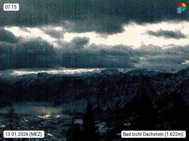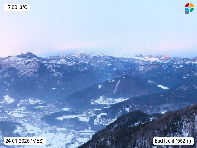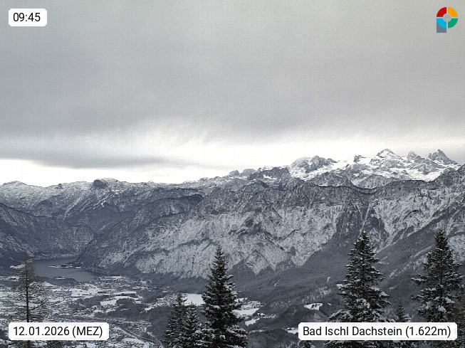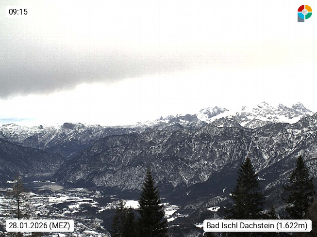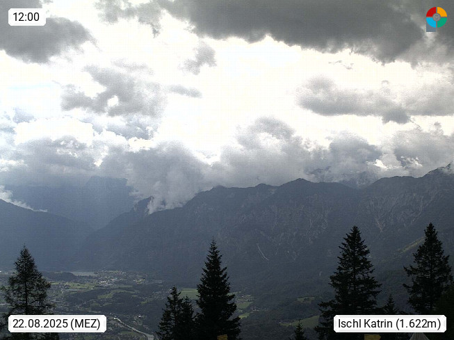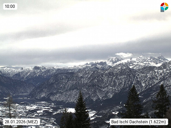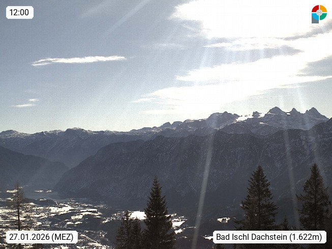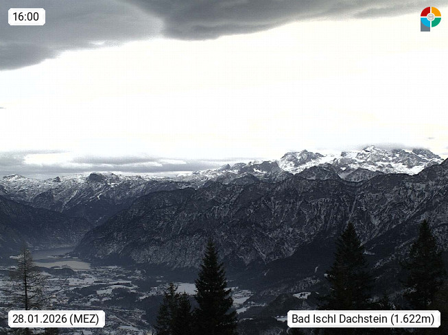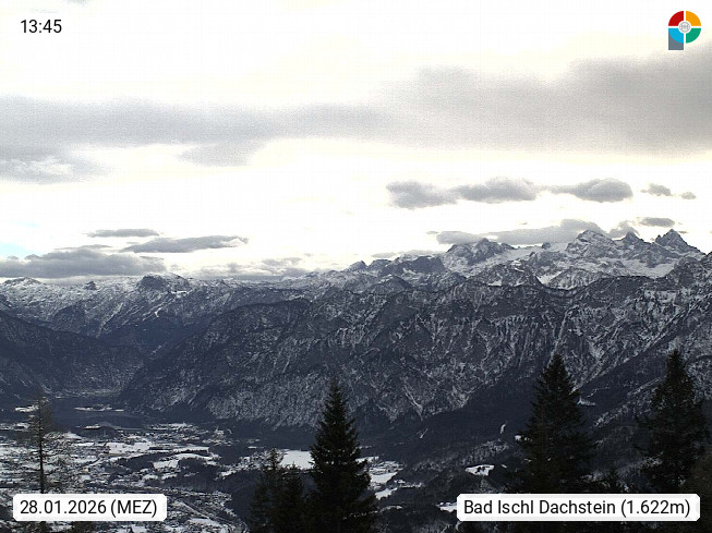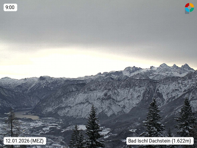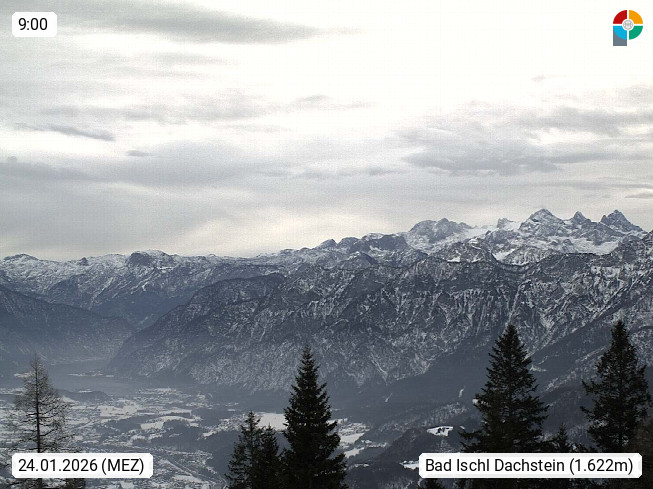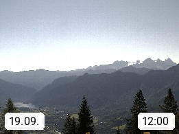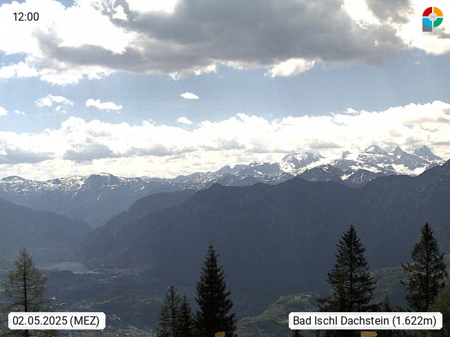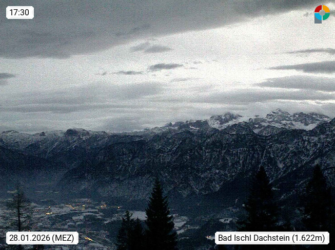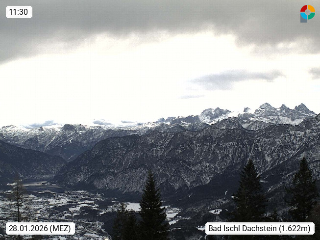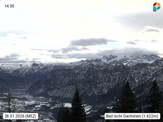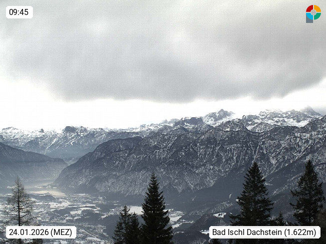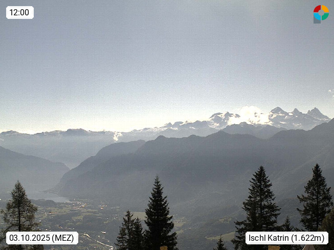 4820 Bad Ischl 468m, Kurort im Zentrum des Salzkammergutes an der Traun im Süden Oberösterreichs. Panoramablick von der Bergstation der Katrinseilbahn 1.418m Richtung Süden zum Dachstein 2.995m mit Dachsteingletscher, links der Hallstättersee, dahinter der Krippenstein 2.109m und rechts Hoher Kalmberg 1.833m. Präsentiert von https://badischl.salzkammergut.at.