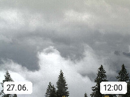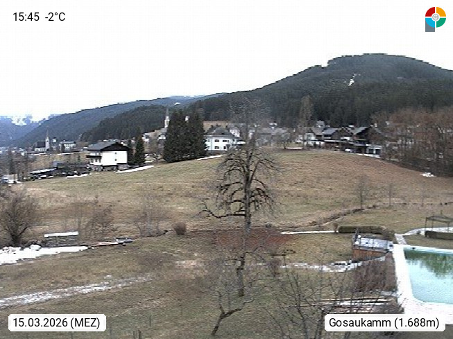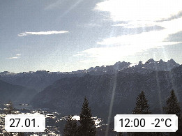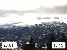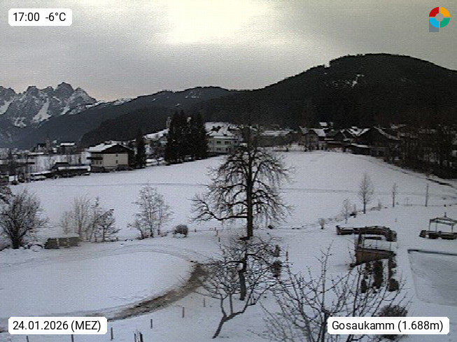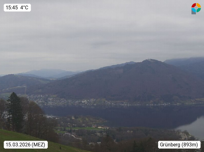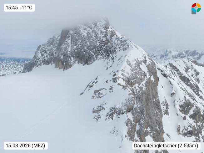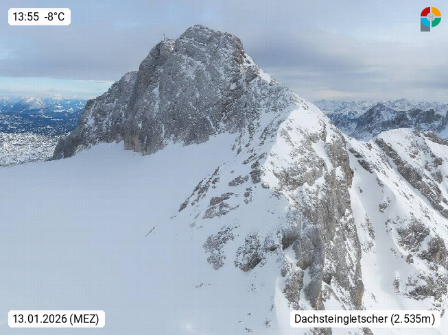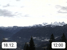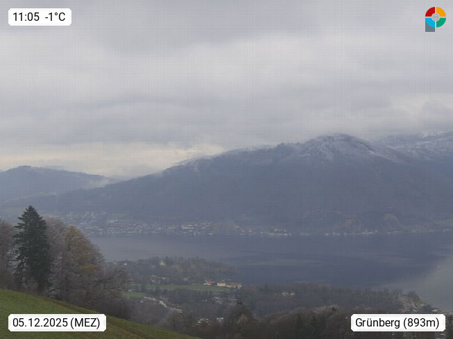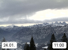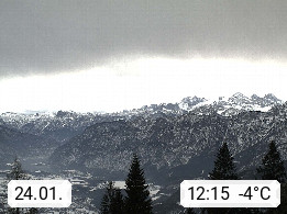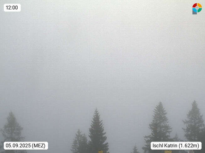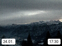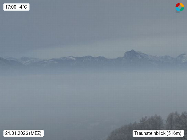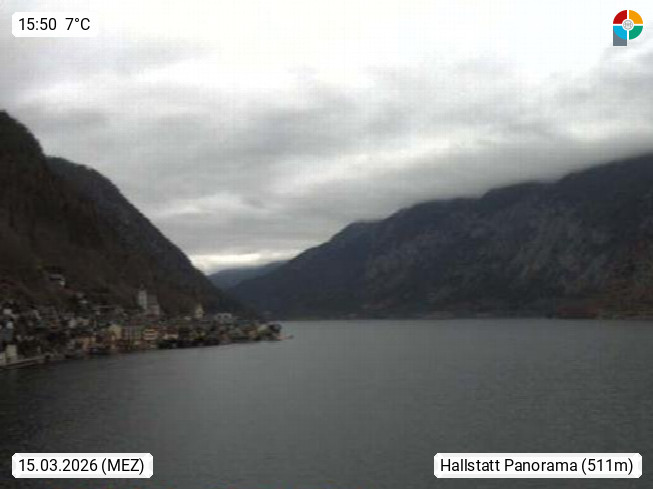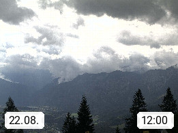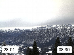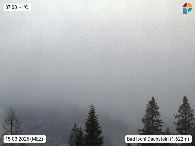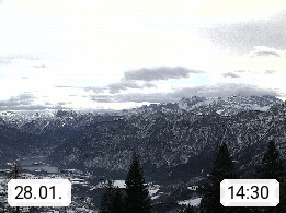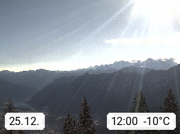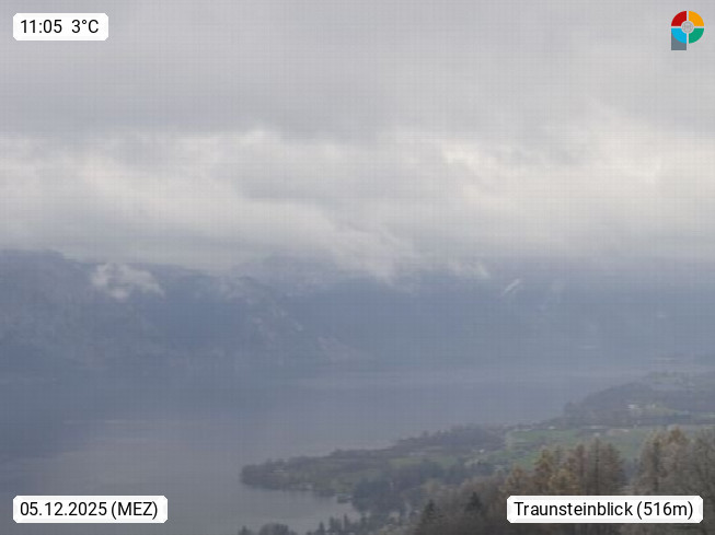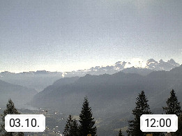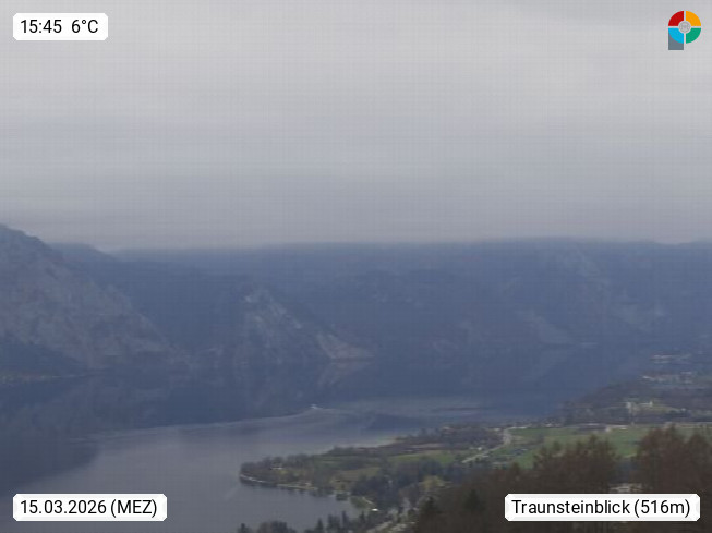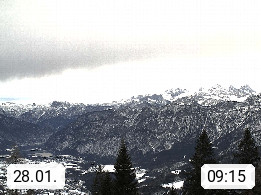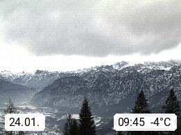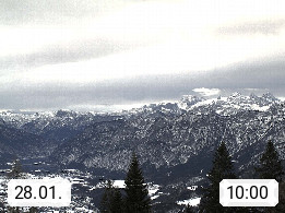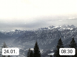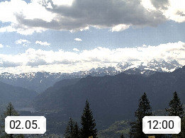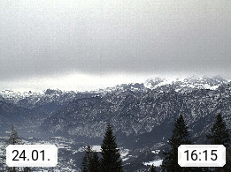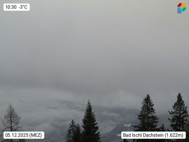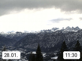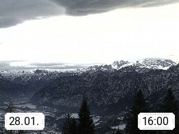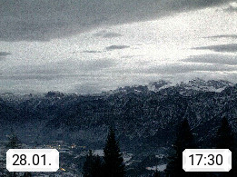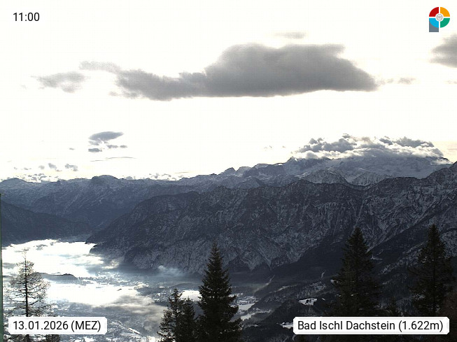 4820 Bad Ischl 468m, Kurort im Zentrum des Salzkammergutes an der Traun im Süden Oberösterreichs. Panoramablick von der Bergstation der Katrinseilbahn 1.418m Richtung Süden zum Dachstein 2.995m mit Dachsteingletscher, links der Hallstättersee, dahinter der Krippenstein 2.109m und rechts Hoher Kalmberg 1.833m. Präsentiert von https://badischl.salzkammergut.at.