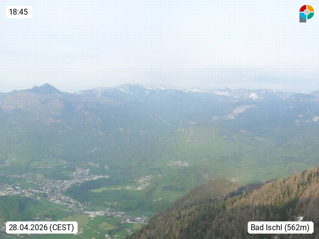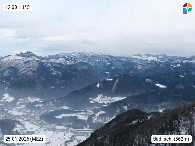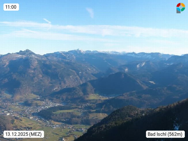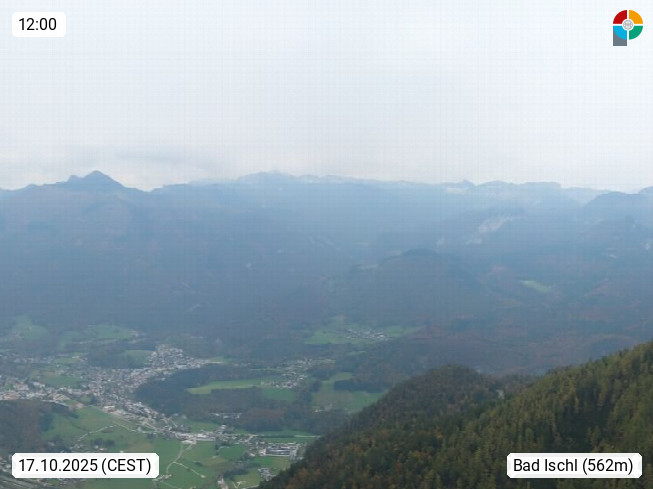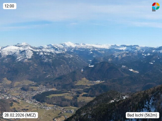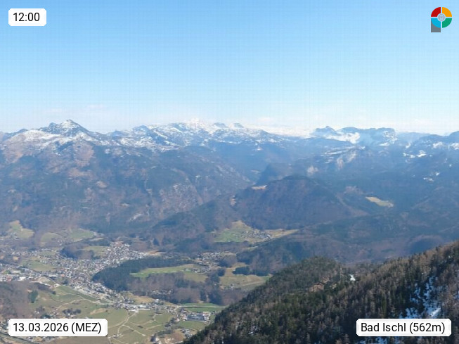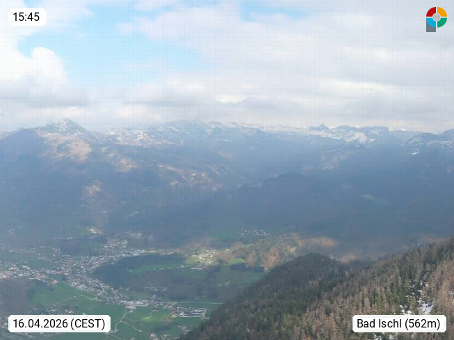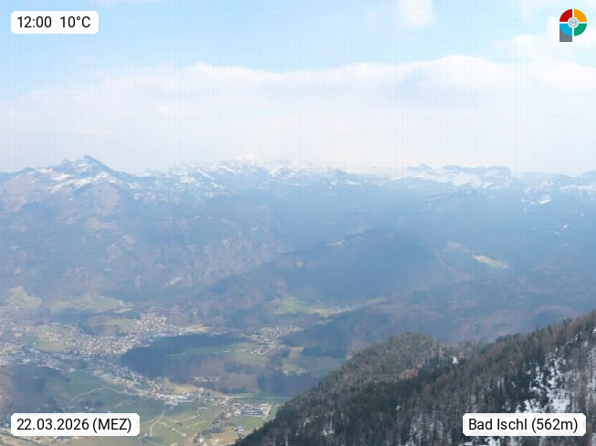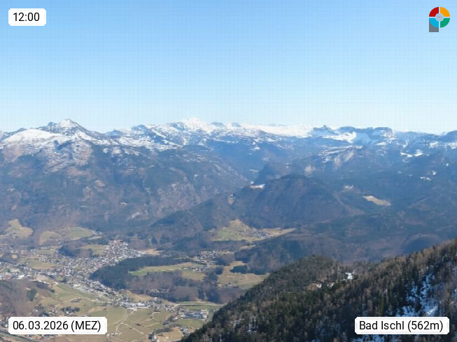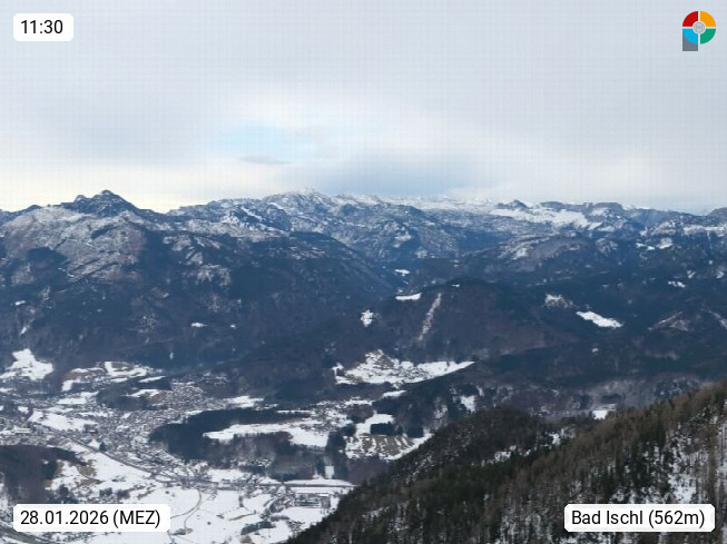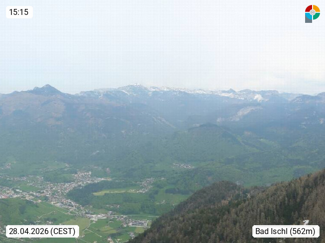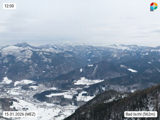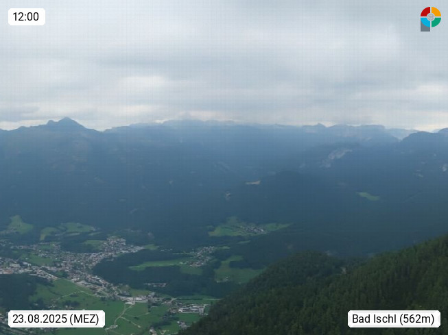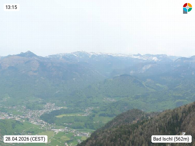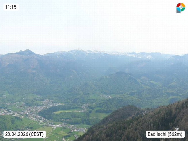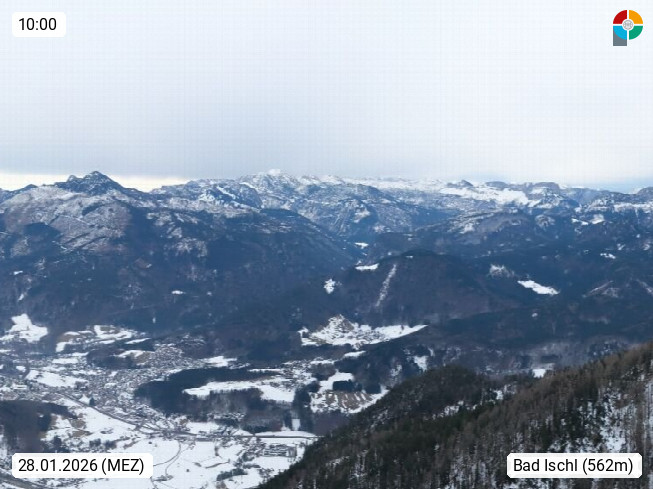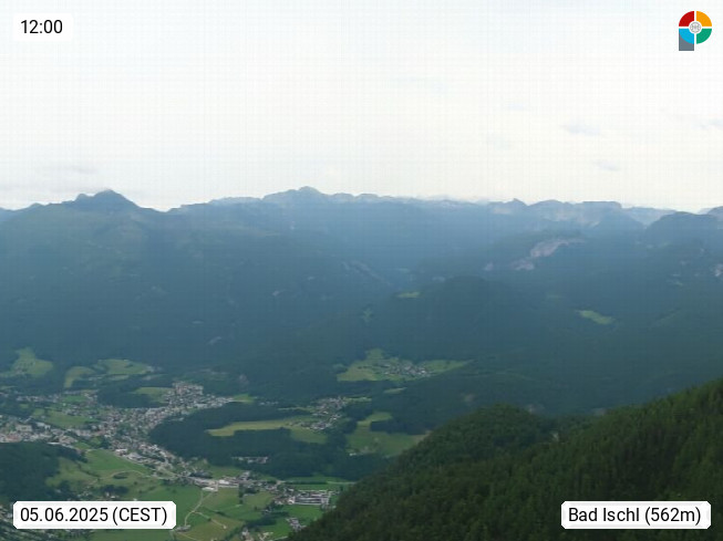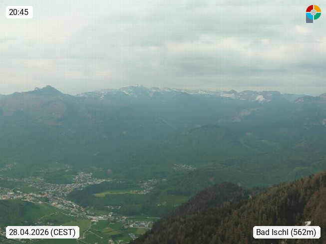 A 4820 Bad Ischl 468m, Kurort im Zentrum des Salzkammergutes an der Traun im Süden Oberösterreichs. Panoramablick von der Bergstation der Katrinseilbahn 1.418m über die Kaiserstadt Bad Ischl Richtung Norden. Links der Höllkogel 1.862m, Mitte der Traunstein 1.691m und Traunsee, rechts die Hohe Schrott 1.839m. Präsentiert von https://badischl.salzkammergut.at.