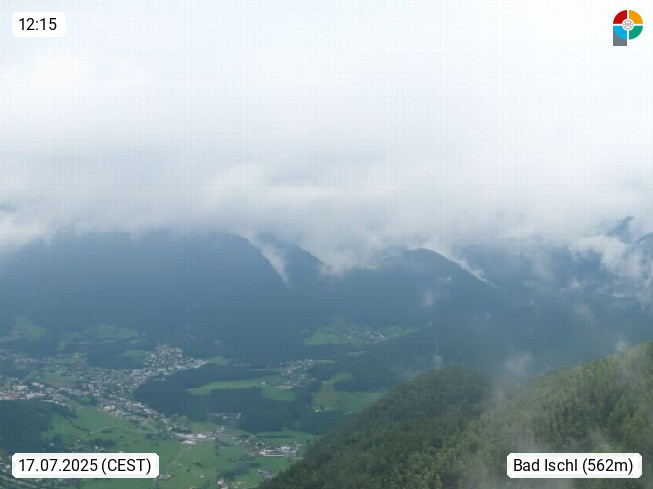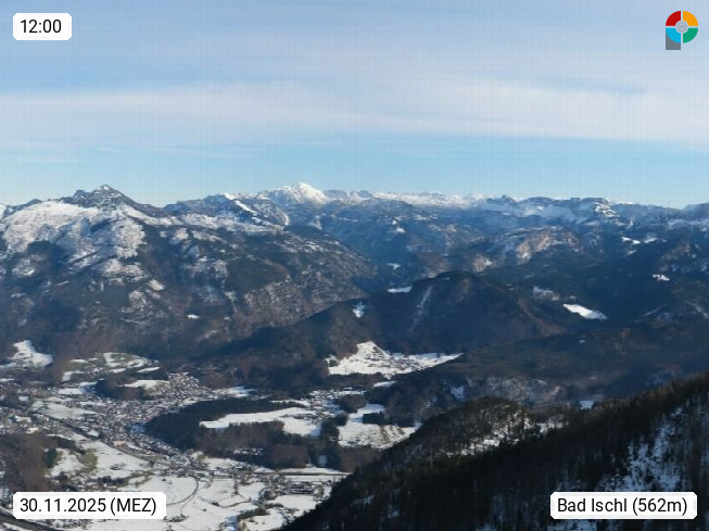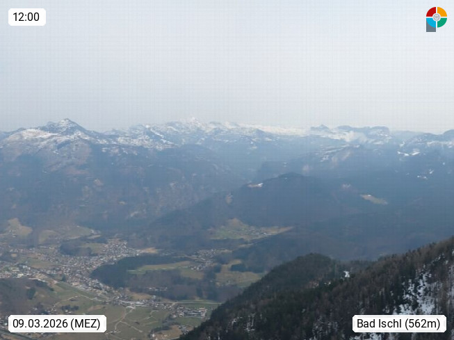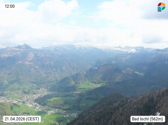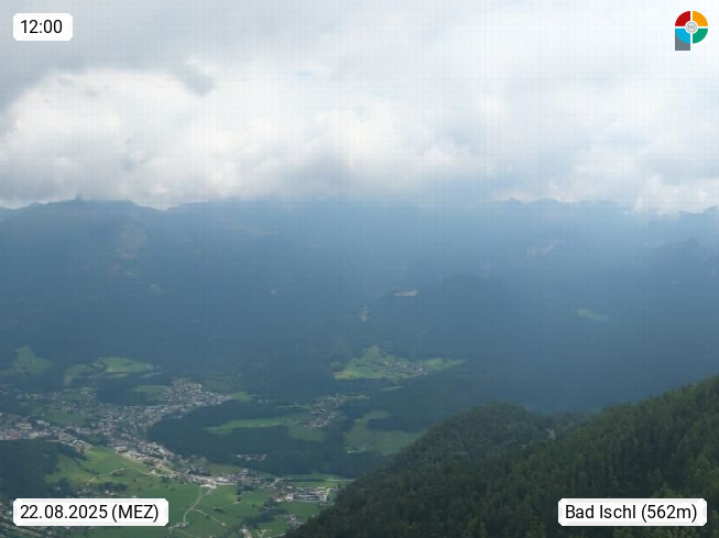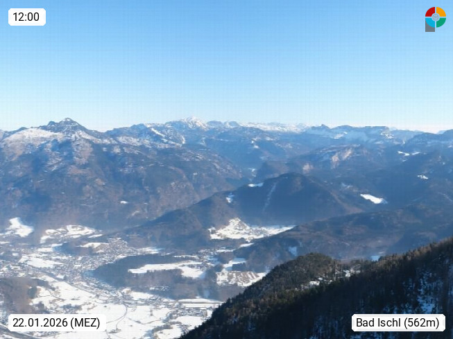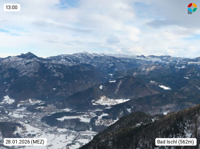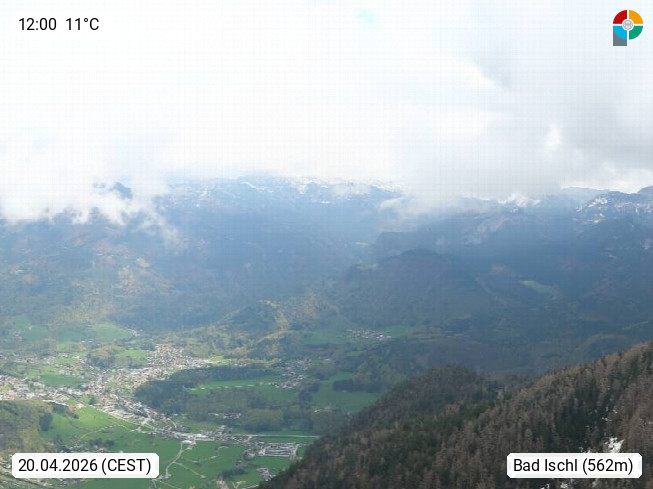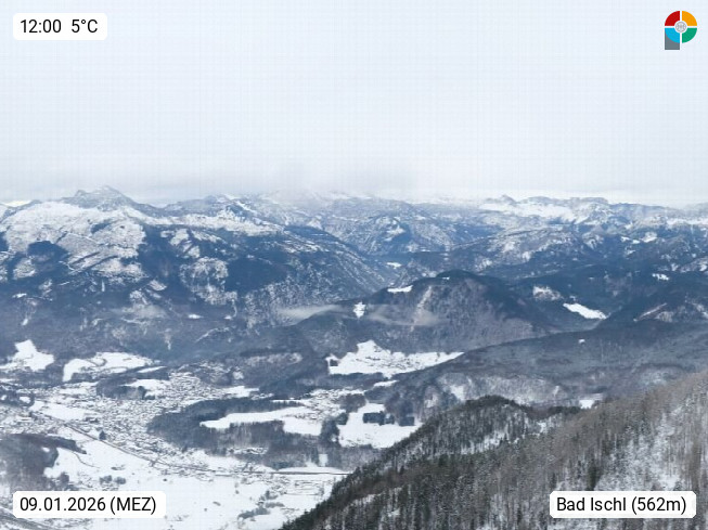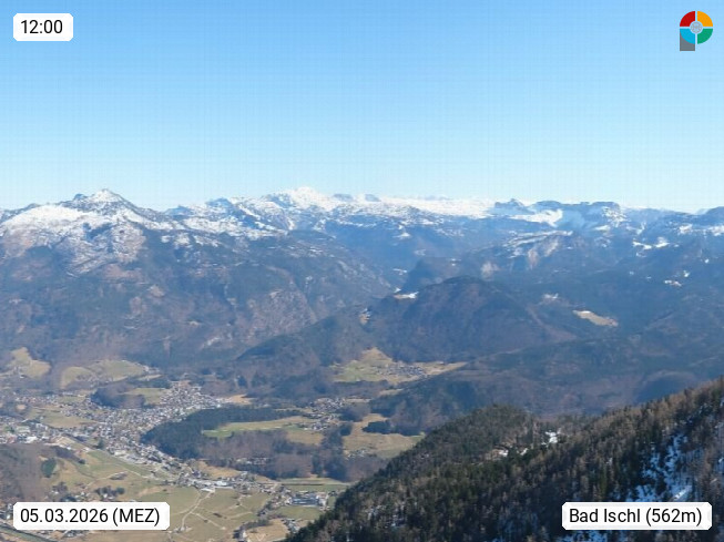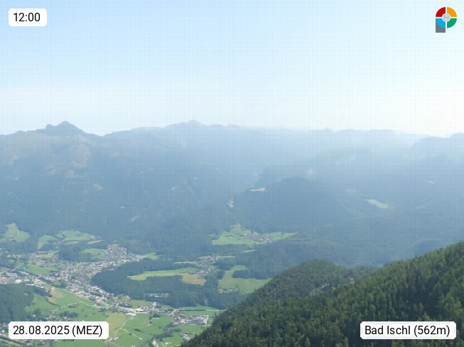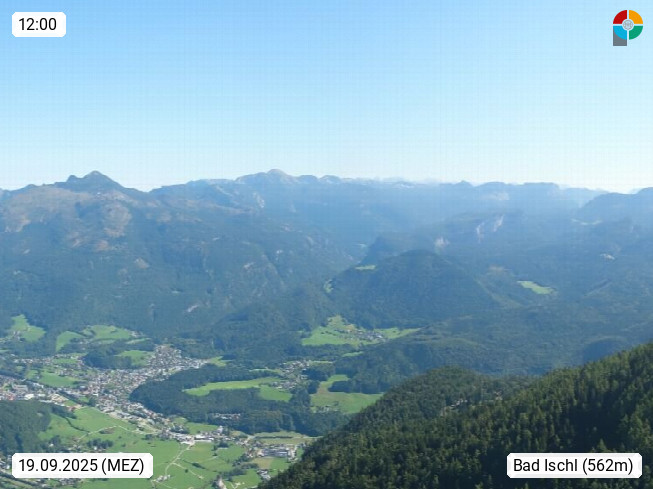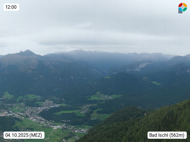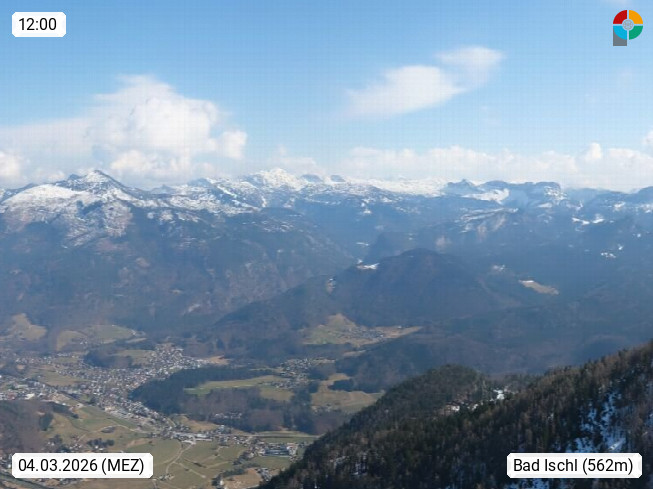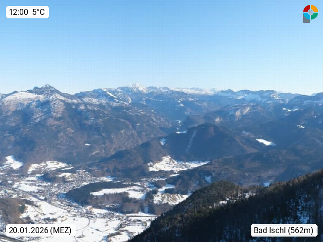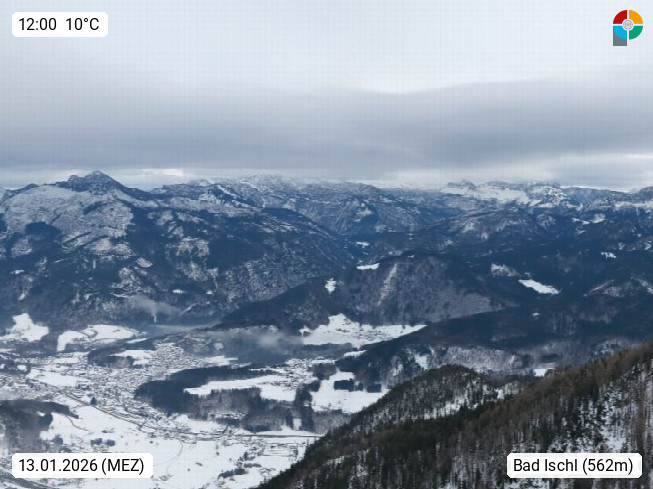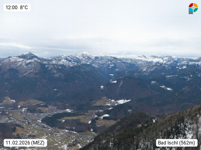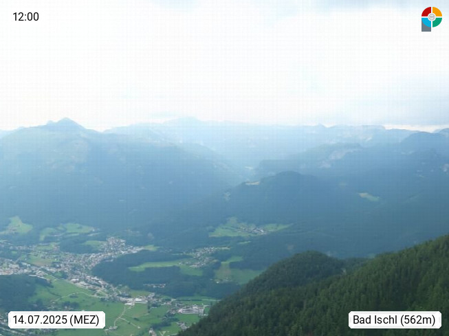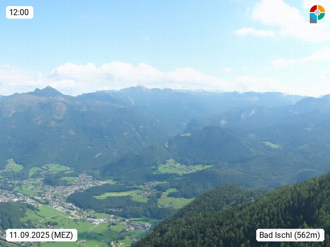 A 4820 Bad Ischl 468m, Kurort im Zentrum des Salzkammergutes an der Traun im Süden Oberösterreichs. Panoramablick von der Bergstation der Katrinseilbahn 1.418m über die Kaiserstadt Bad Ischl Richtung Norden. Links der Höllkogel 1.862m, Mitte der Traunstein 1.691m und Traunsee, rechts die Hohe Schrott 1.839m. Präsentiert von https://badischl.salzkammergut.at.