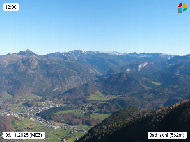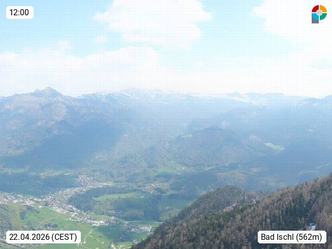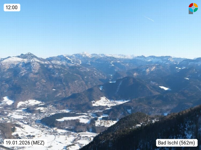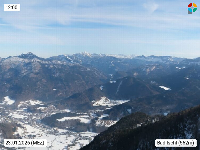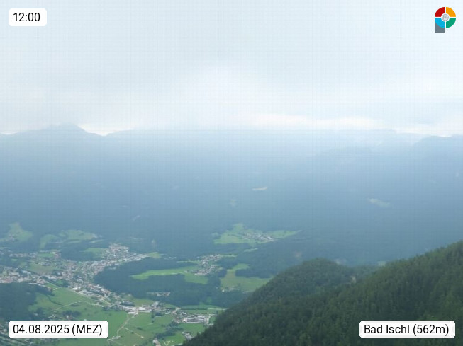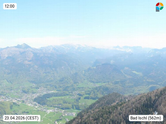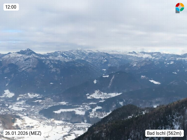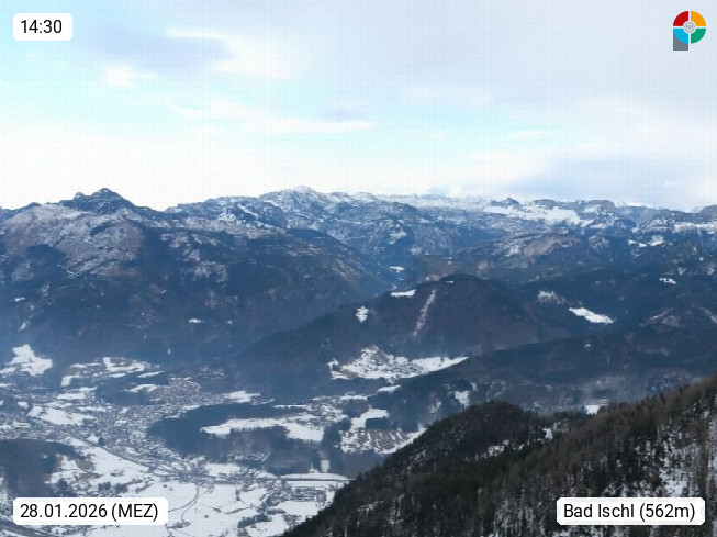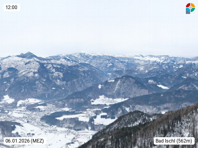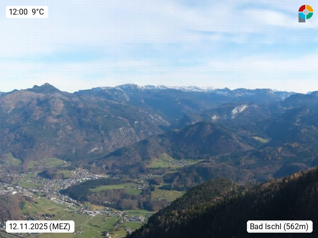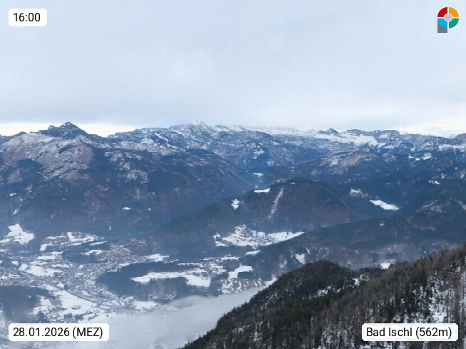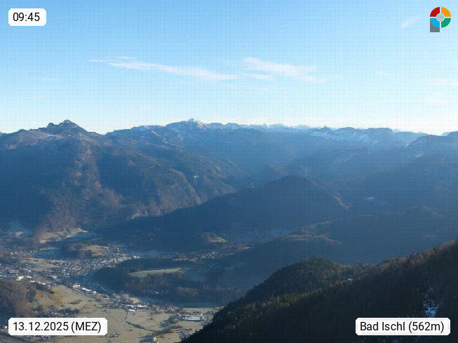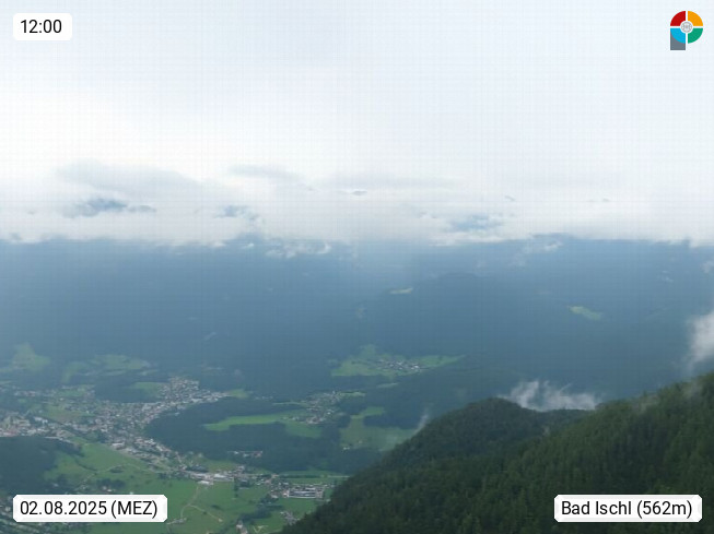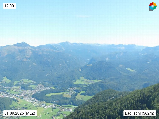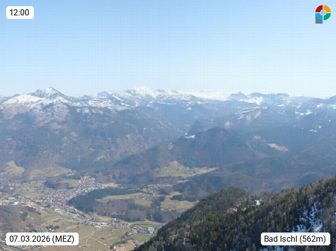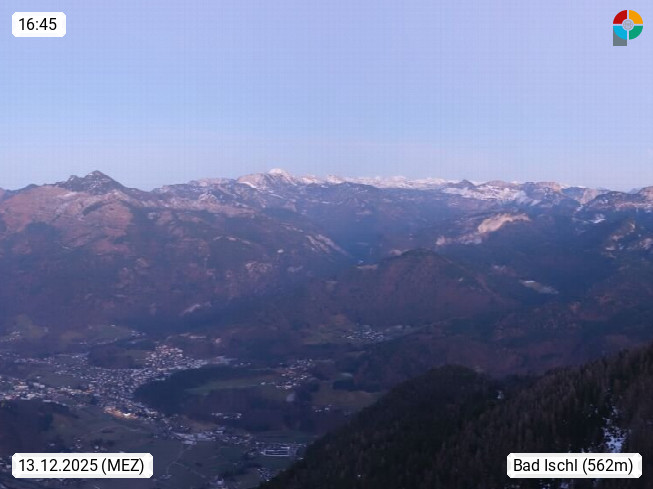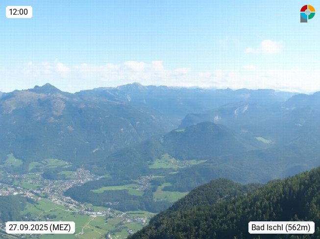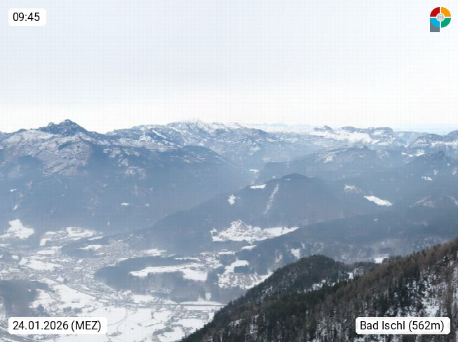 A 4820 Bad Ischl 468m, Kurort im Zentrum des Salzkammergutes an der Traun im Süden Oberösterreichs. Panoramablick von der Bergstation der Katrinseilbahn 1.418m über die Kaiserstadt Bad Ischl Richtung Norden. Links der Höllkogel 1.862m, Mitte der Traunstein 1.691m und Traunsee, rechts die Hohe Schrott 1.839m. Präsentiert von https://badischl.salzkammergut.at.
