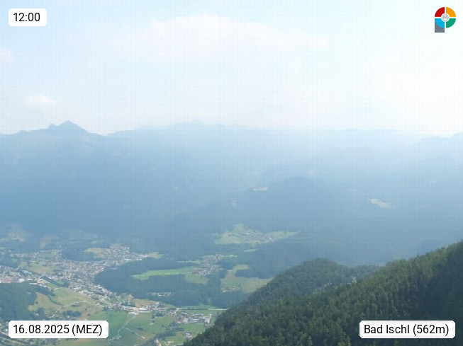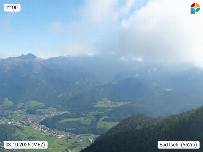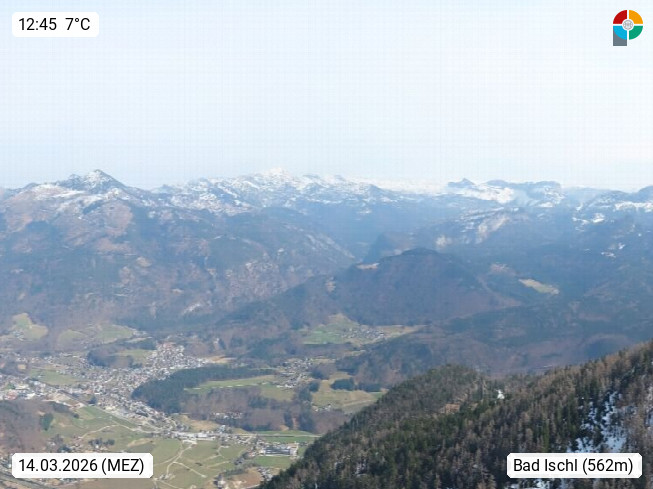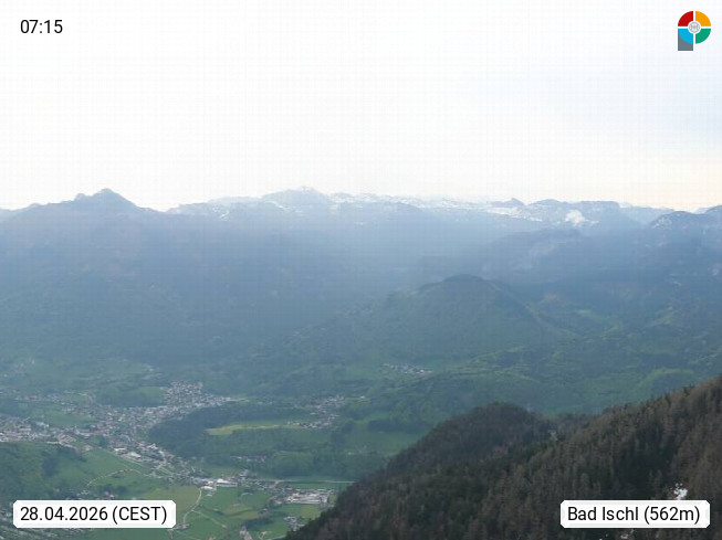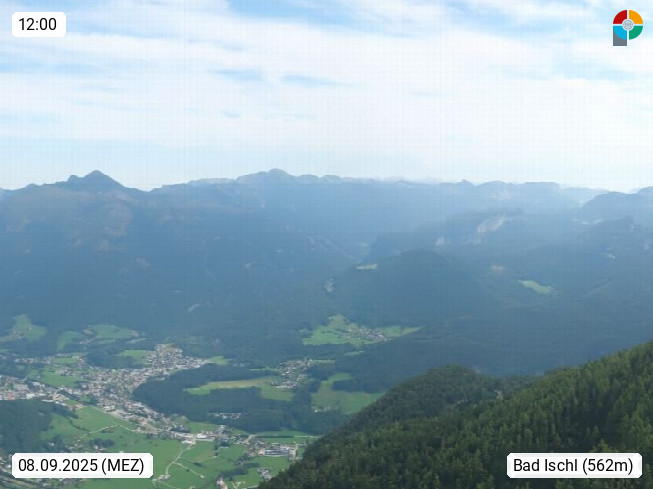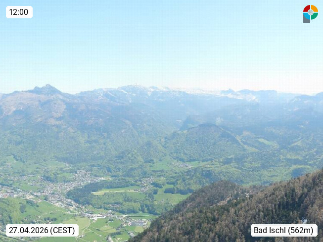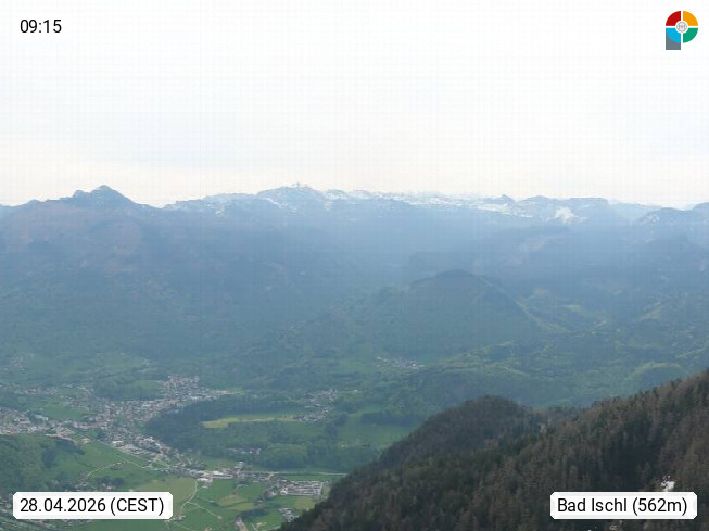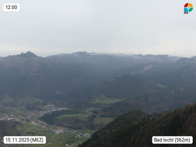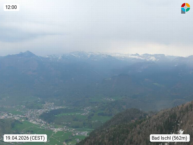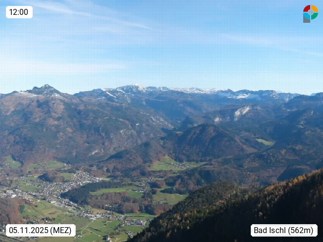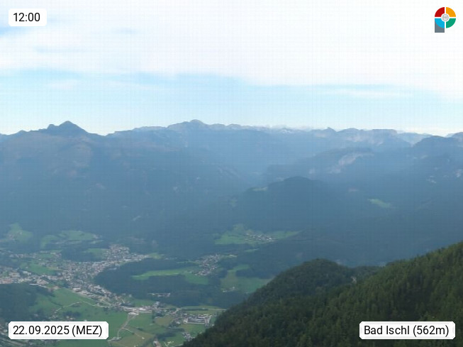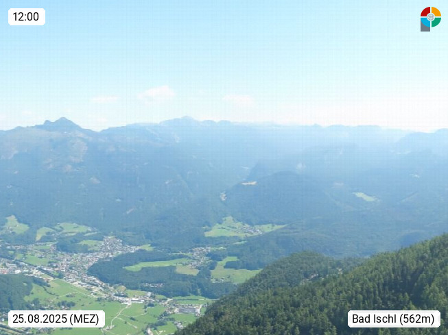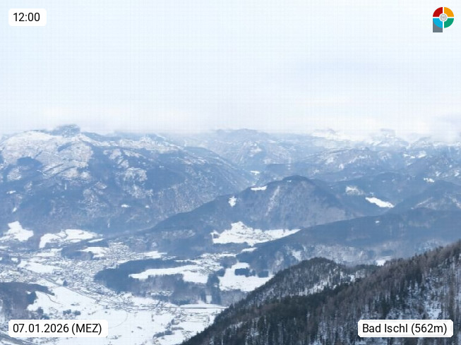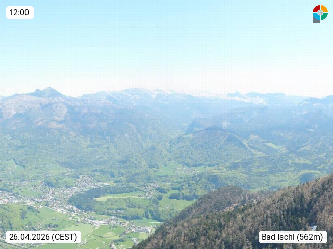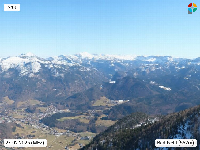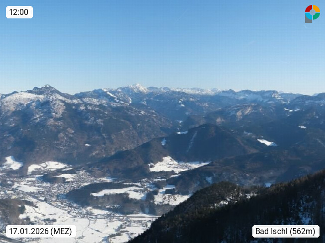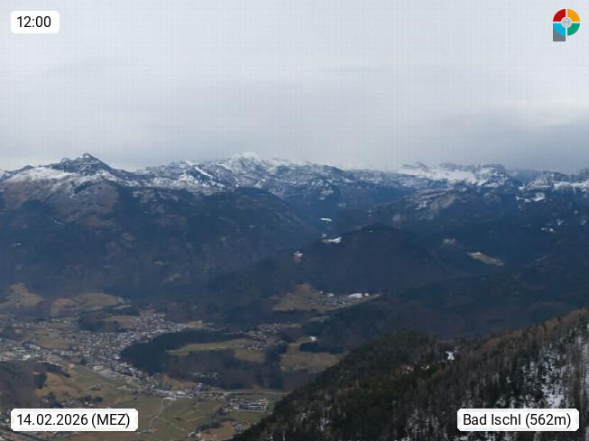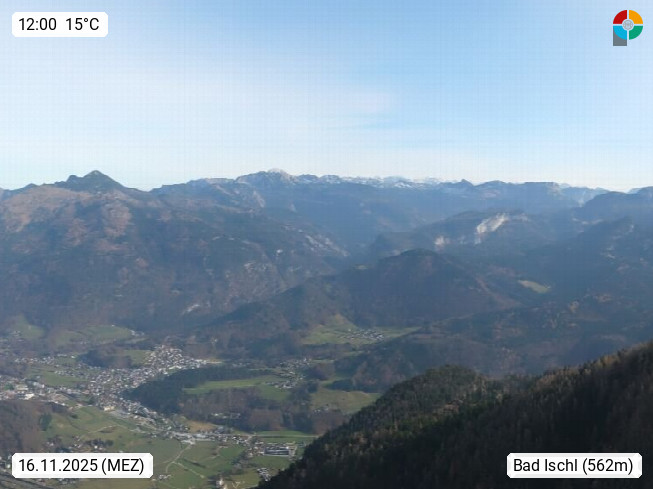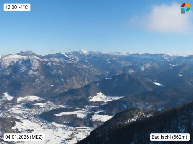 A 4820 Bad Ischl 468m, Kurort im Zentrum des Salzkammergutes an der Traun im Süden Oberösterreichs. Panoramablick von der Bergstation der Katrinseilbahn 1.418m über die Kaiserstadt Bad Ischl Richtung Norden. Links der Höllkogel 1.862m, Mitte der Traunstein 1.691m und Traunsee, rechts die Hohe Schrott 1.839m. Präsentiert von https://badischl.salzkammergut.at.