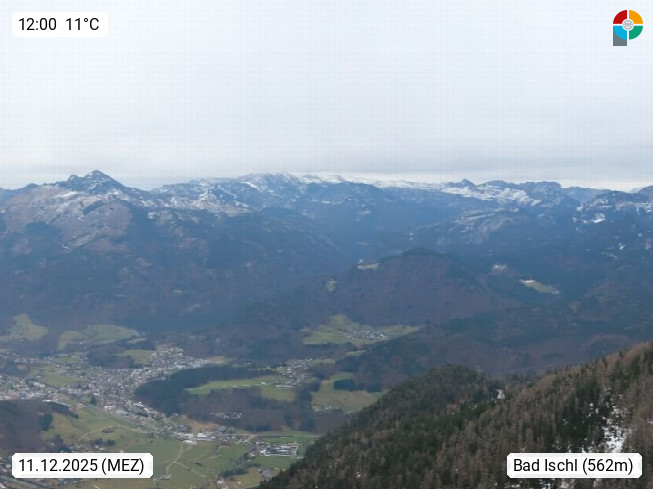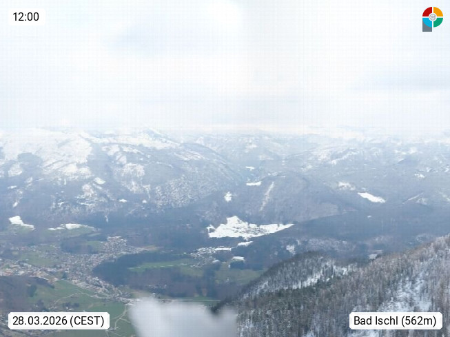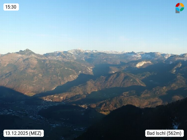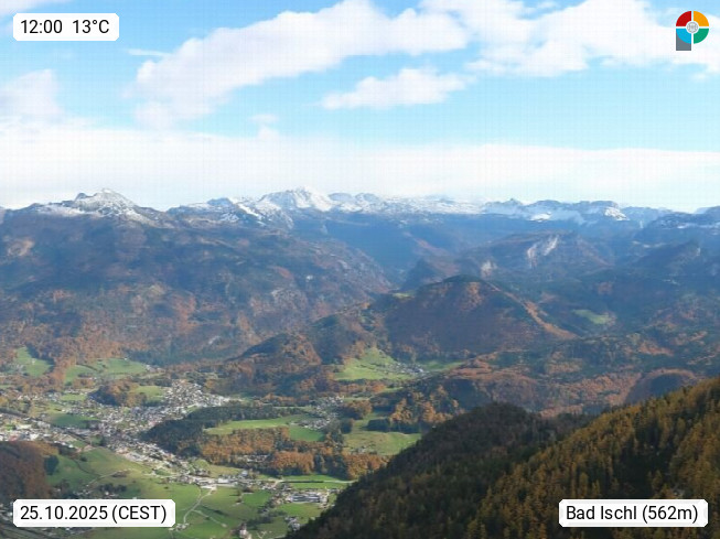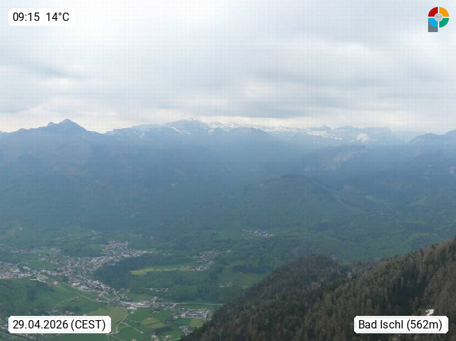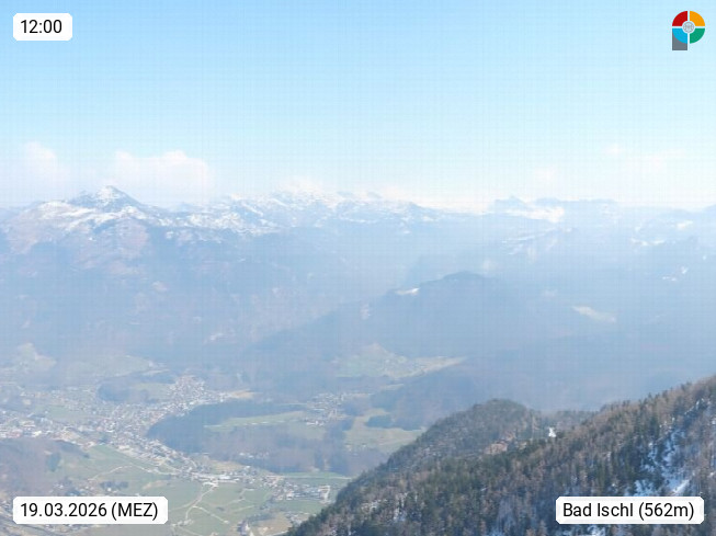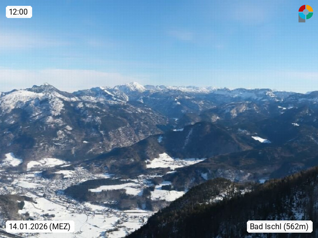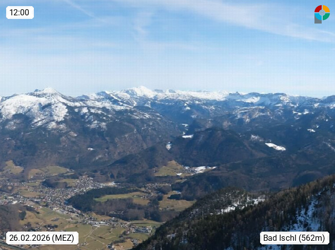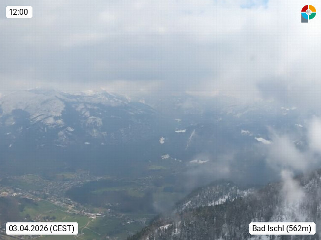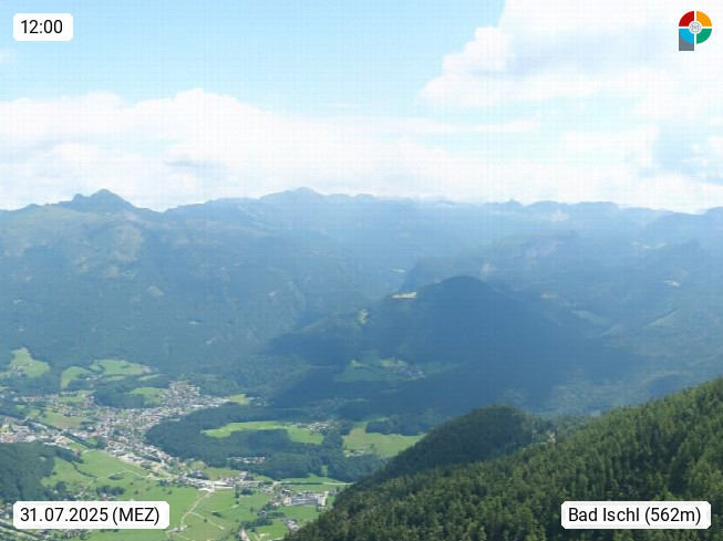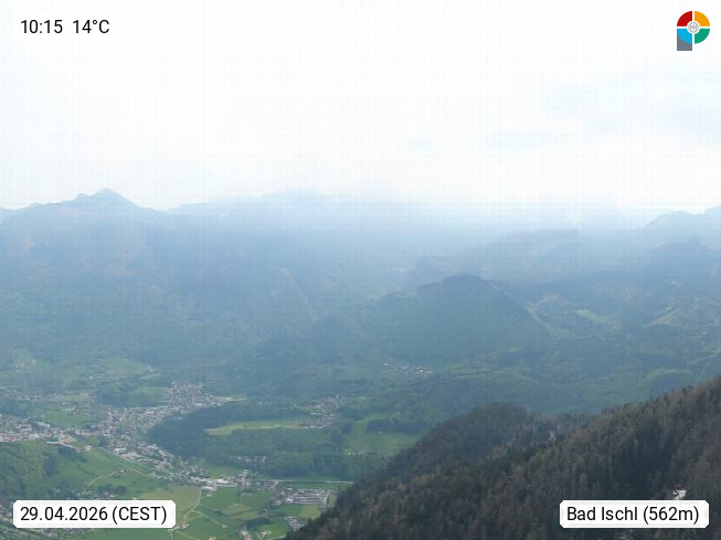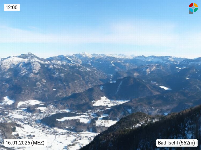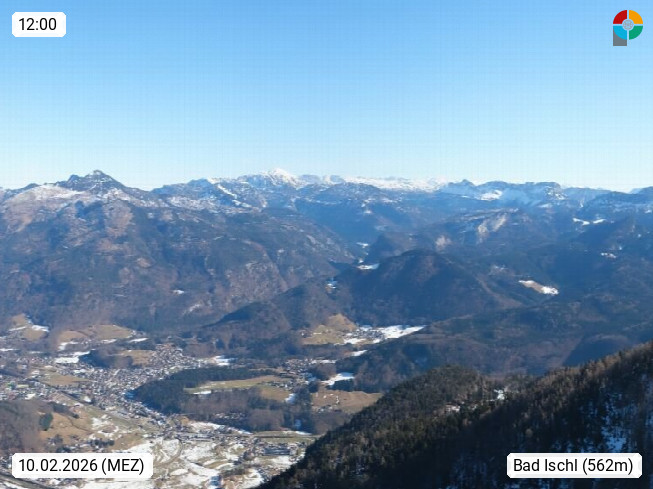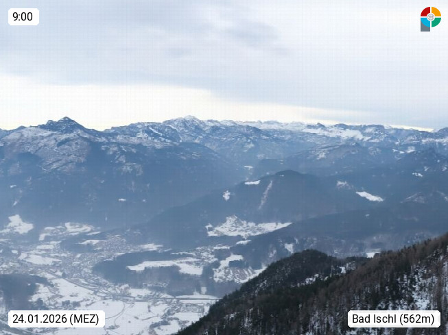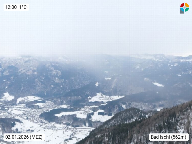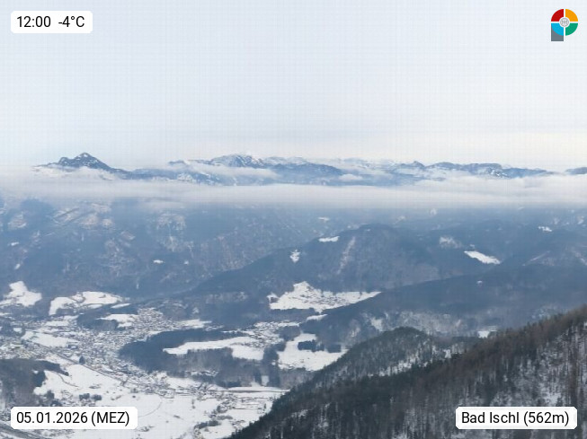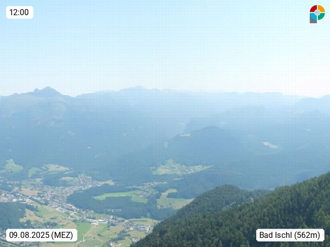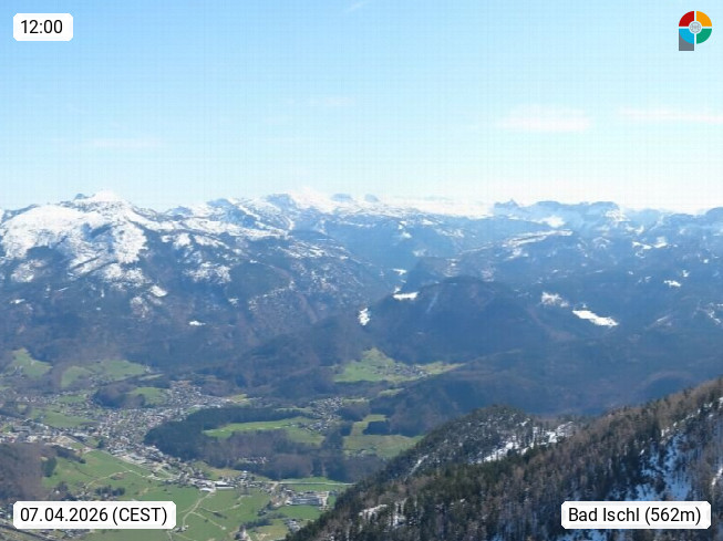A 4820 Bad Ischl 468m, Kurort im Zentrum des Salzkammergutes an der Traun im Süden Oberösterreichs. Panoramablick von der Bergstation der Katrinseilbahn 1.418m über die Kaiserstadt Bad Ischl Richtung Norden. Links der Höllkogel 1.862m, Mitte der Traunstein 1.691m und Traunsee, rechts die Hohe Schrott 1.839m. Präsentiert von https://badischl.salzkammergut.at.