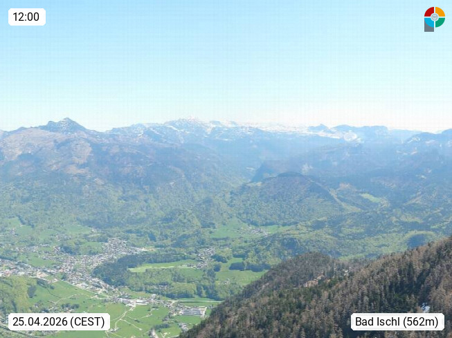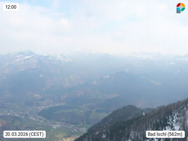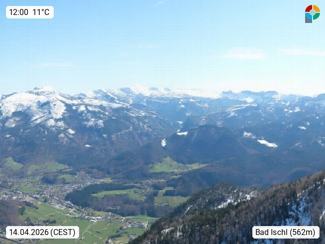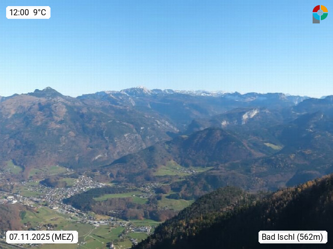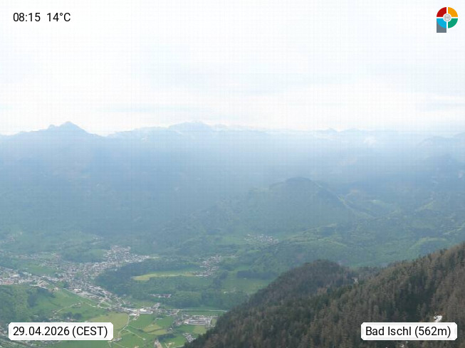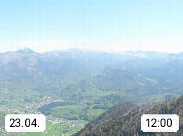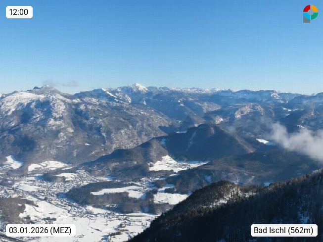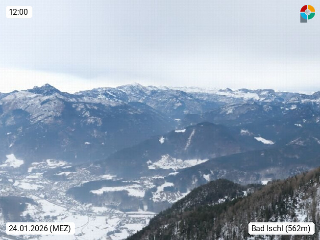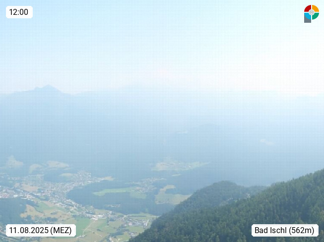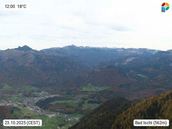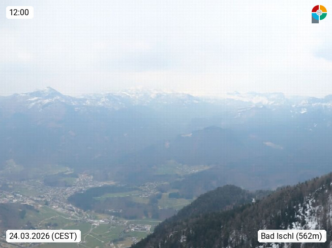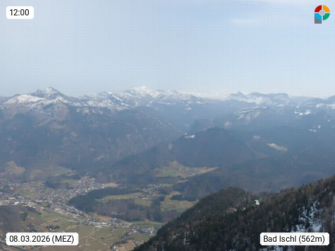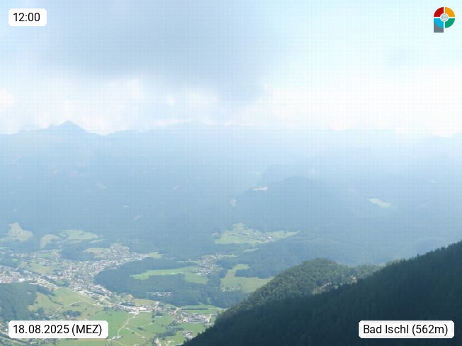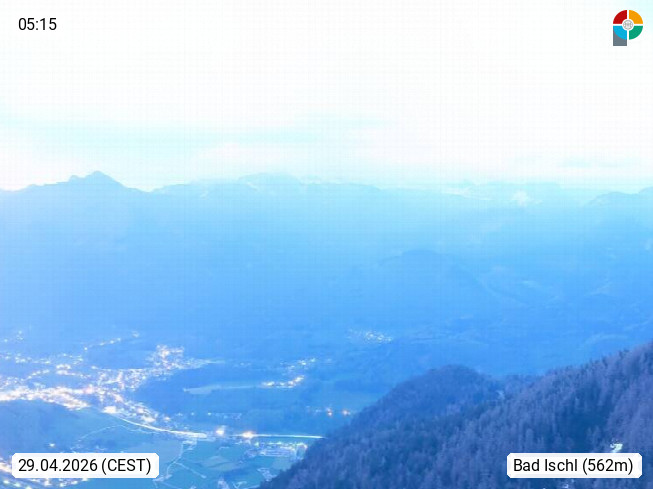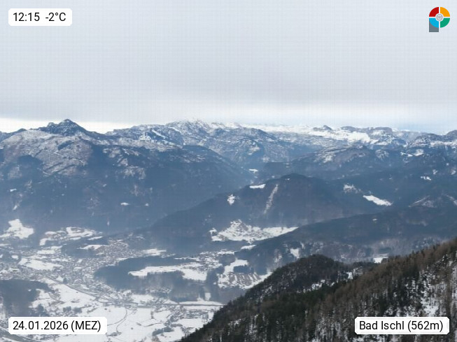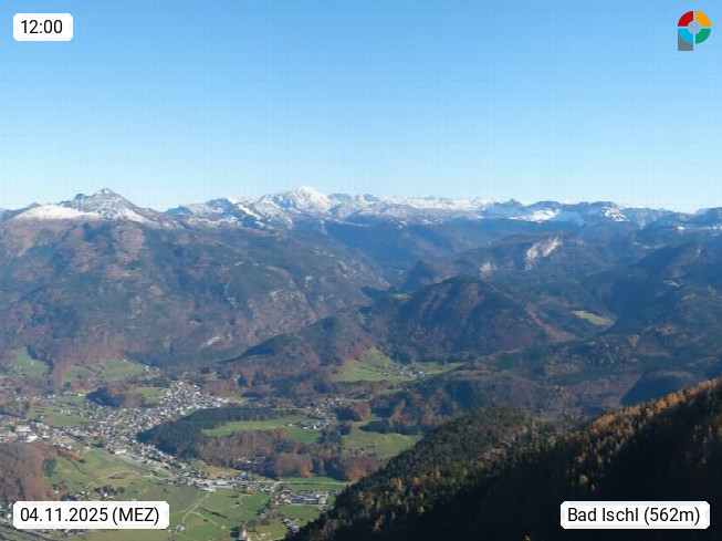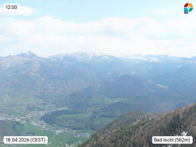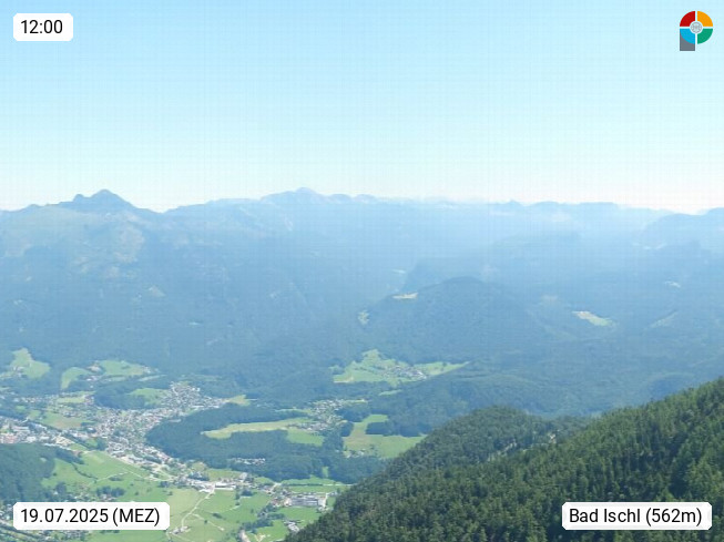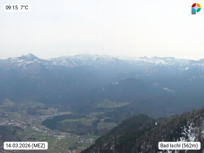 A 4820 Bad Ischl 468m, Kurort im Zentrum des Salzkammergutes an der Traun im Süden Oberösterreichs. Panoramablick von der Bergstation der Katrinseilbahn 1.418m über die Kaiserstadt Bad Ischl Richtung Norden. Links der Höllkogel 1.862m, Mitte der Traunstein 1.691m und Traunsee, rechts die Hohe Schrott 1.839m. Präsentiert von https://badischl.salzkammergut.at.