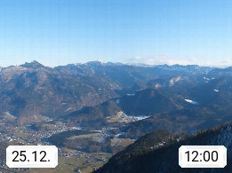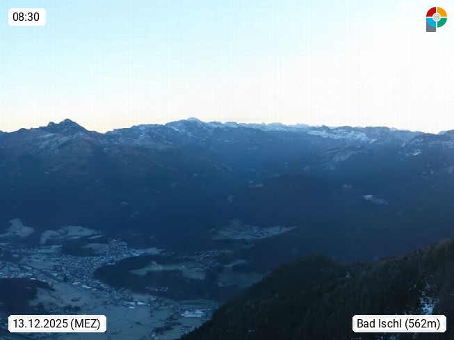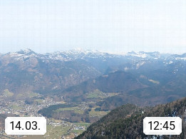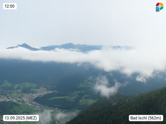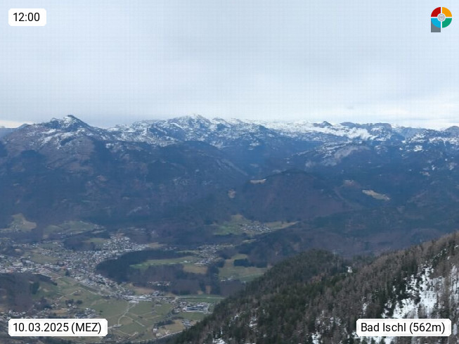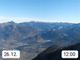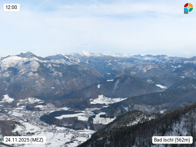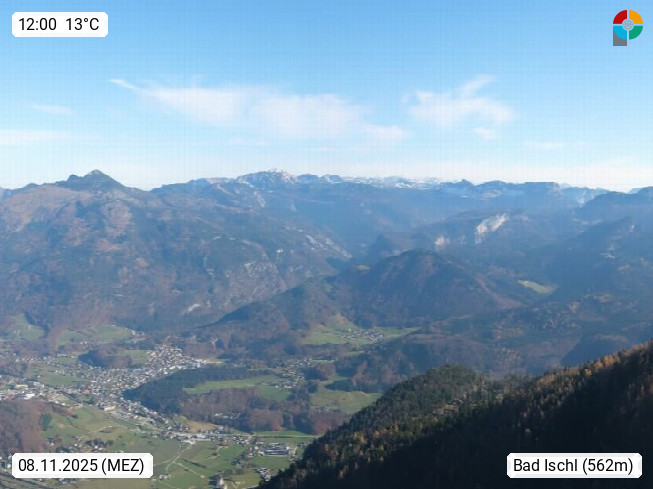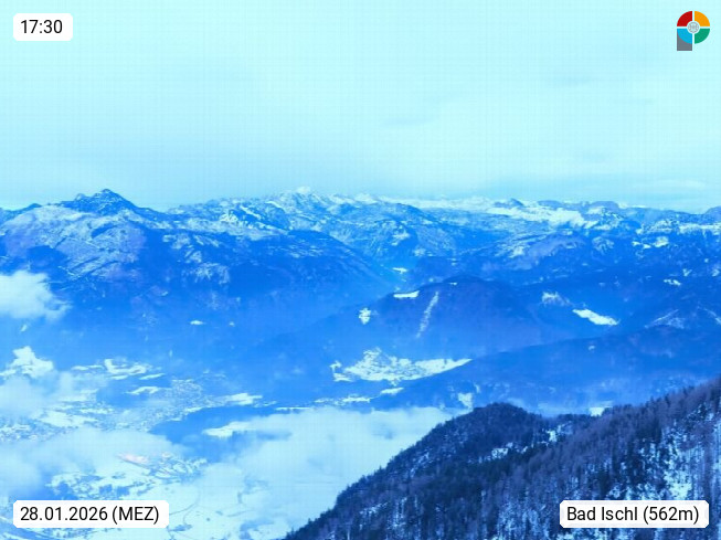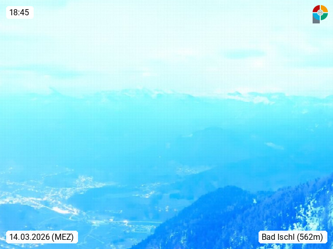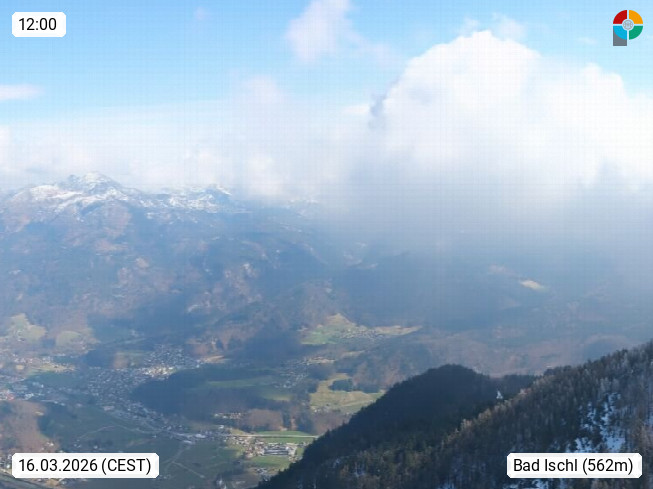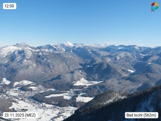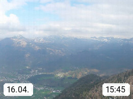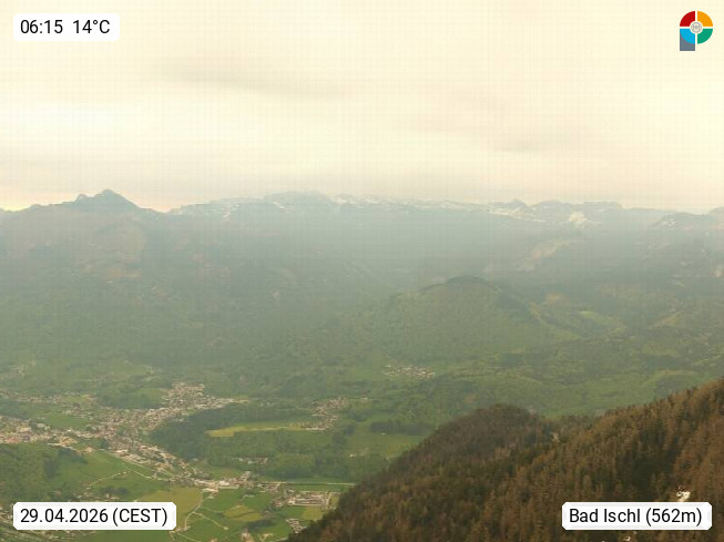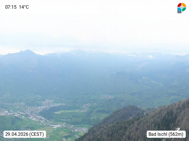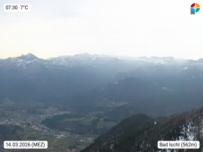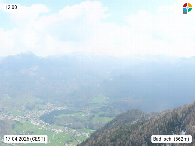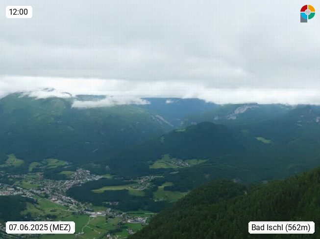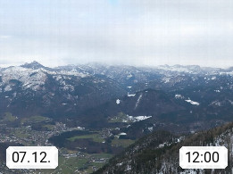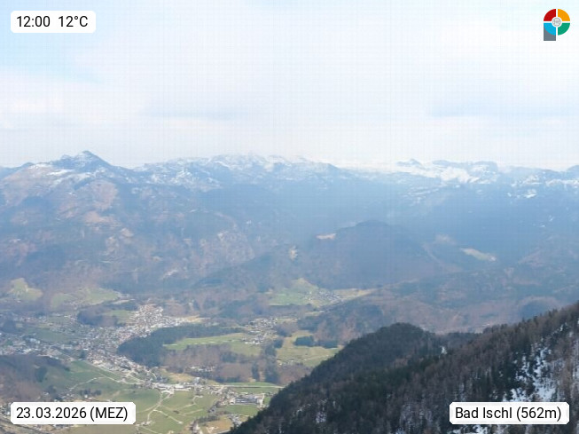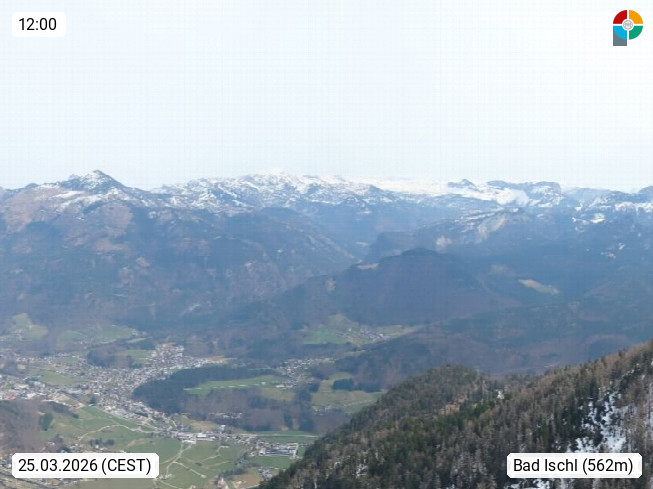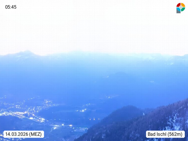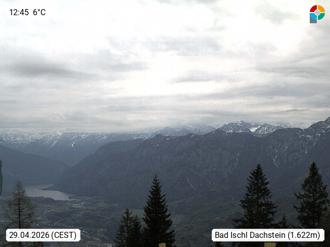 A 4820 Bad Ischl 468m, Kurort im Zentrum des Salzkammergutes an der Traun im Süden Oberösterreichs. Panoramablick von der Bergstation der Katrinseilbahn 1.418m über die Kaiserstadt Bad Ischl Richtung Norden. Links der Höllkogel 1.862m, Mitte der Traunstein 1.691m und Traunsee, rechts die Hohe Schrott 1.839m. Präsentiert von https://badischl.salzkammergut.at.