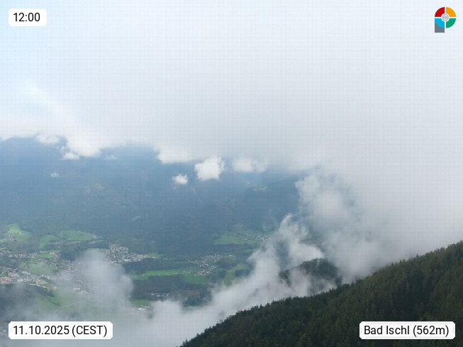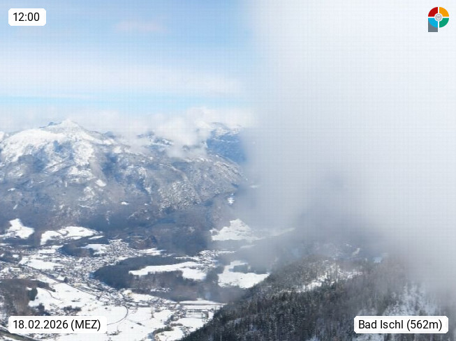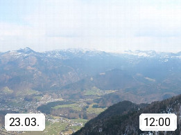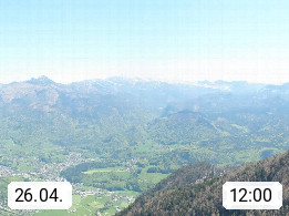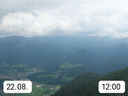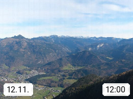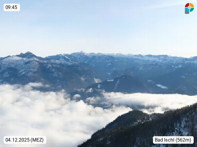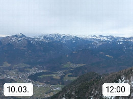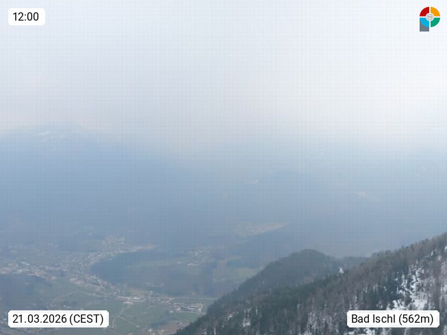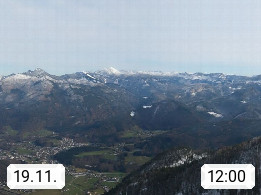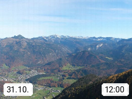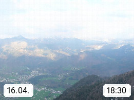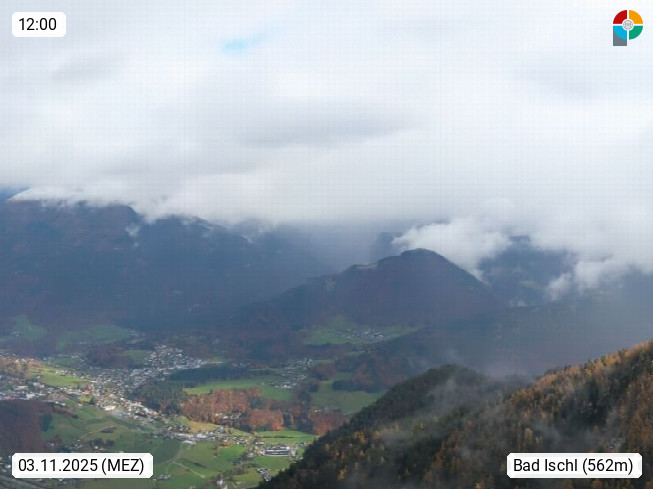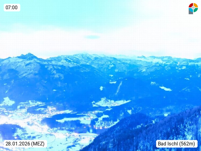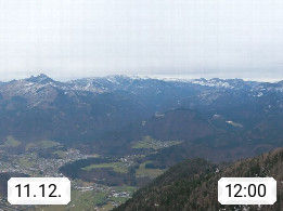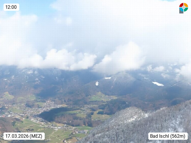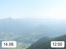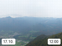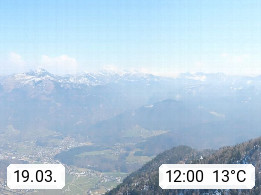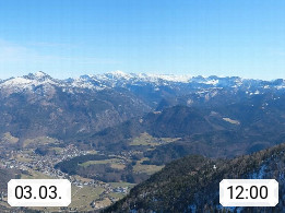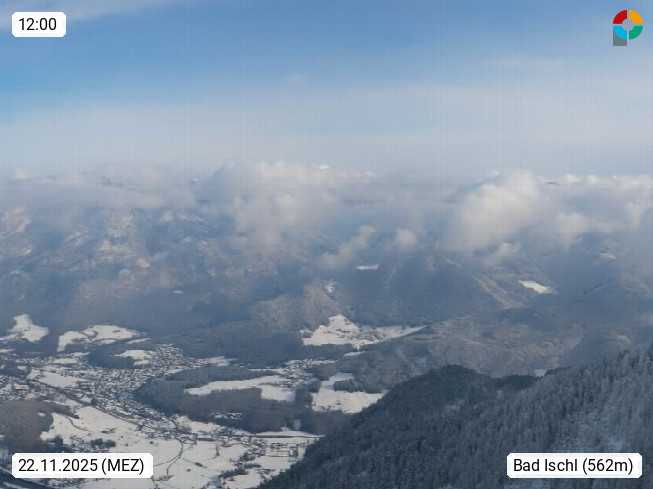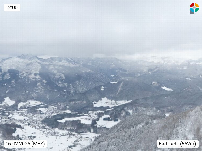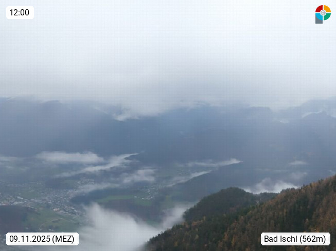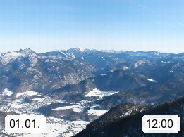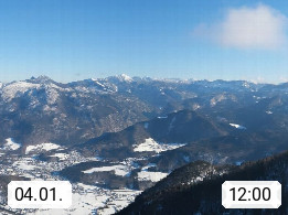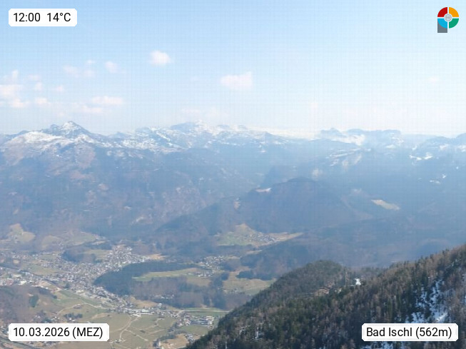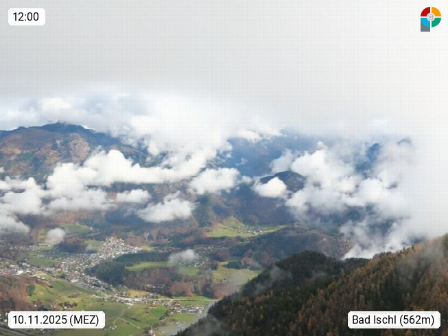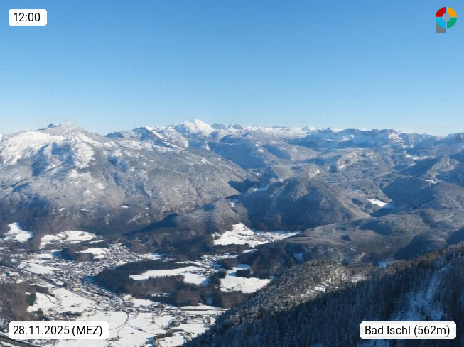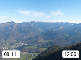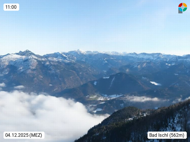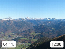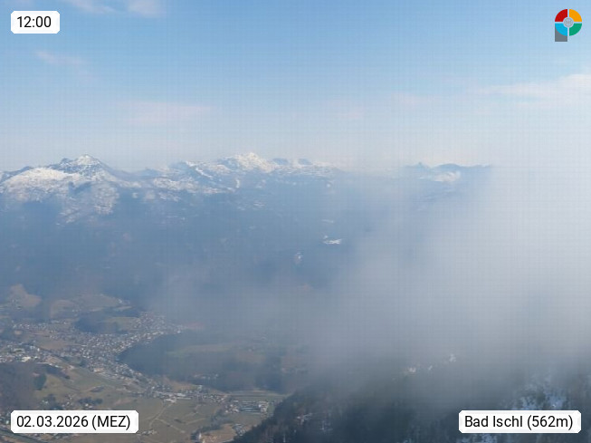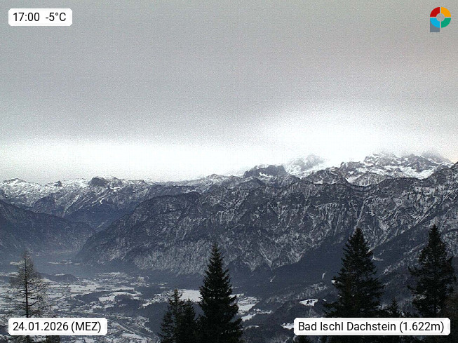 A 4820 Bad Ischl 468m, Kurort im Zentrum des Salzkammergutes an der Traun im Süden Oberösterreichs. Panoramablick von der Bergstation der Katrinseilbahn 1.418m über die Kaiserstadt Bad Ischl Richtung Norden. Links der Höllkogel 1.862m, Mitte der Traunstein 1.691m und Traunsee, rechts die Hohe Schrott 1.839m. Präsentiert von https://badischl.salzkammergut.at.
