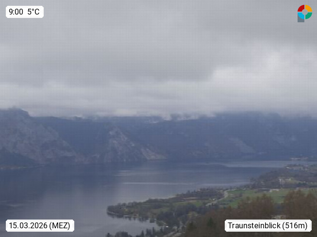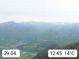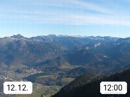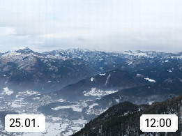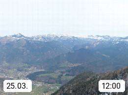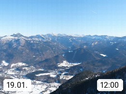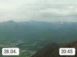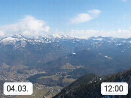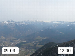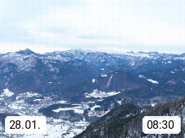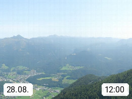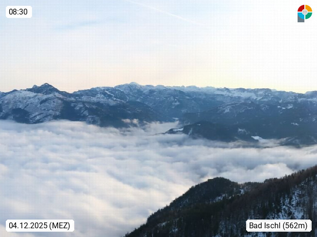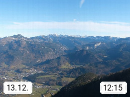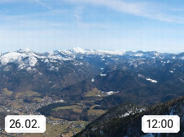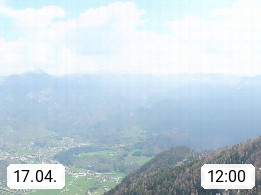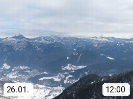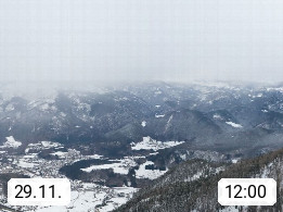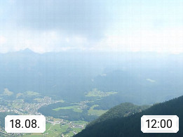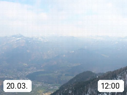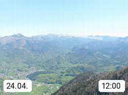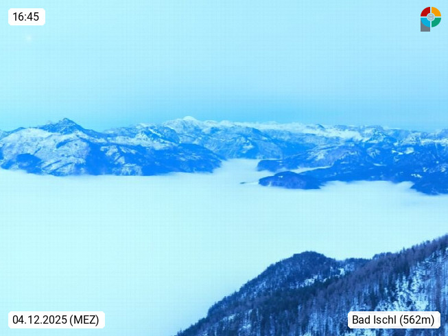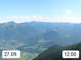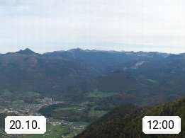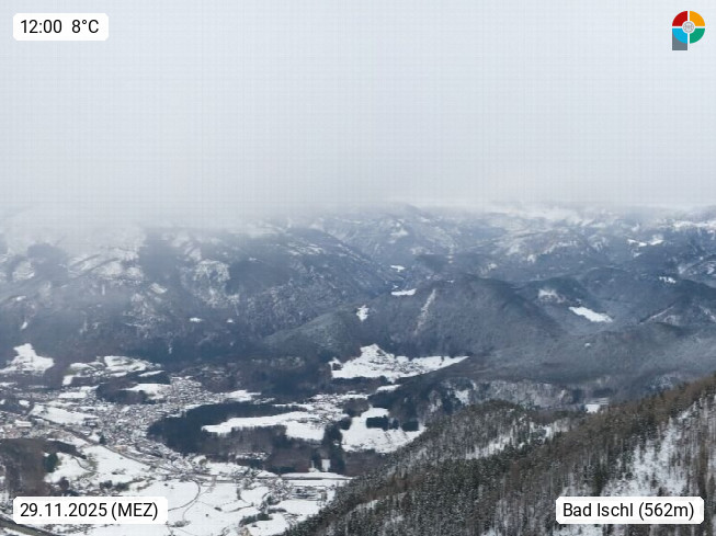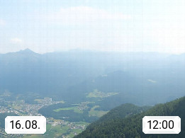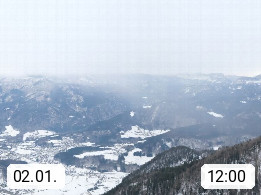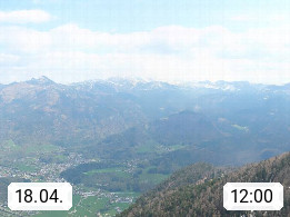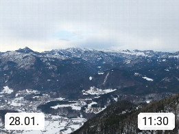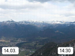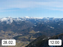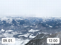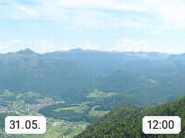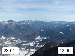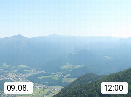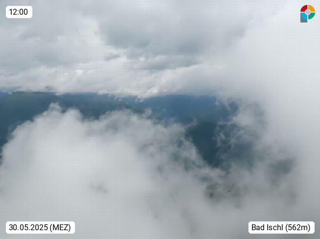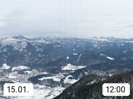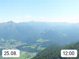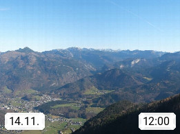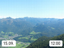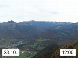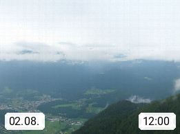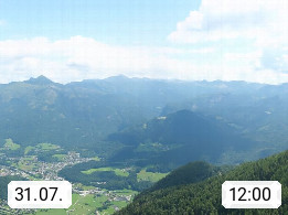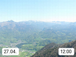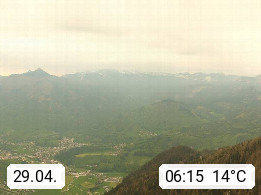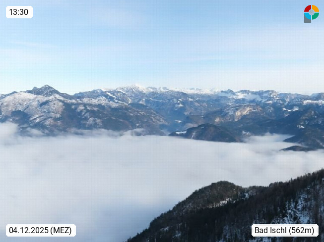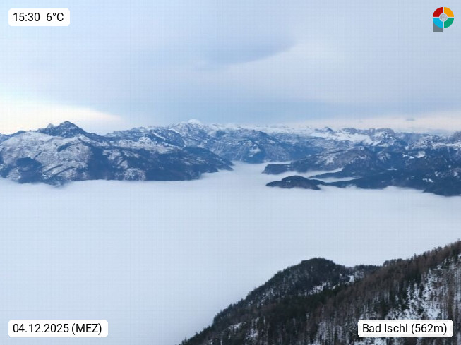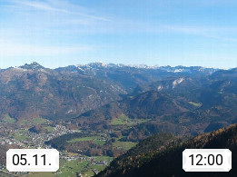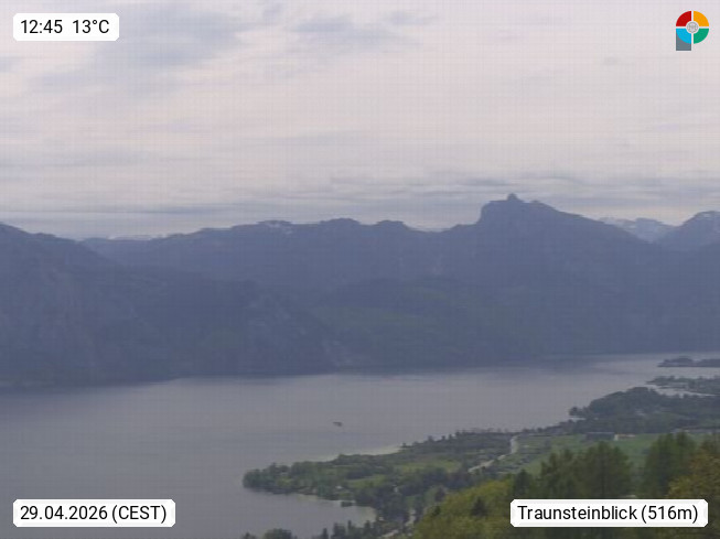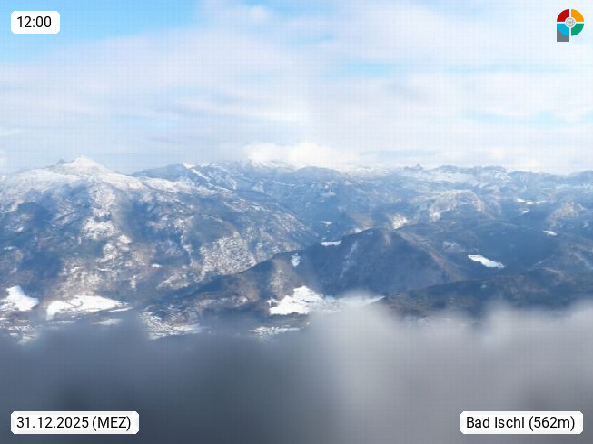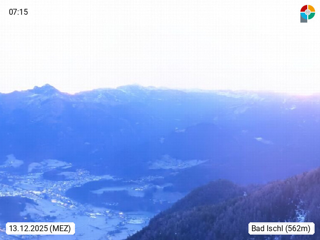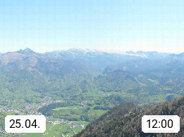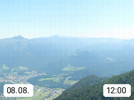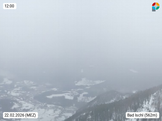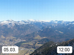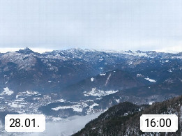 A 4820 Bad Ischl 468m, Kurort im Zentrum des Salzkammergutes an der Traun im Süden Oberösterreichs. Panoramablick von der Bergstation der Katrinseilbahn 1.418m über die Kaiserstadt Bad Ischl Richtung Norden. Links der Höllkogel 1.862m, Mitte der Traunstein 1.691m und Traunsee, rechts die Hohe Schrott 1.839m. Präsentiert von https://badischl.salzkammergut.at.