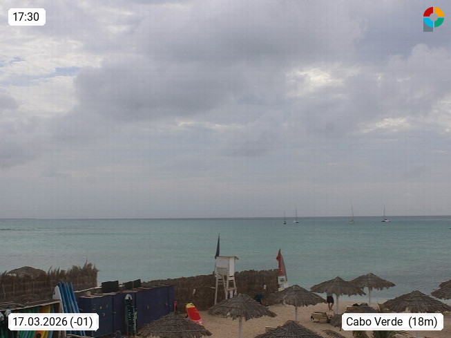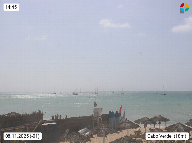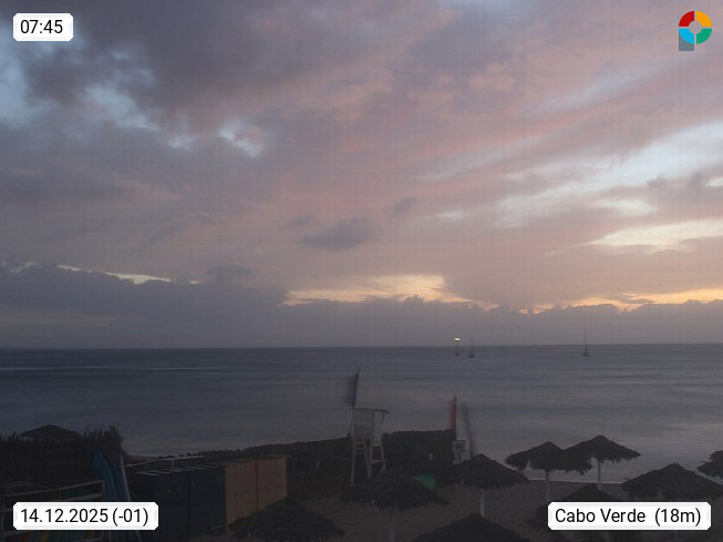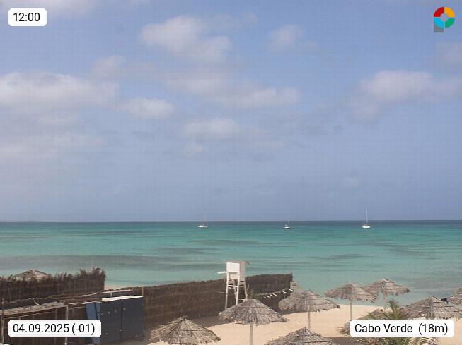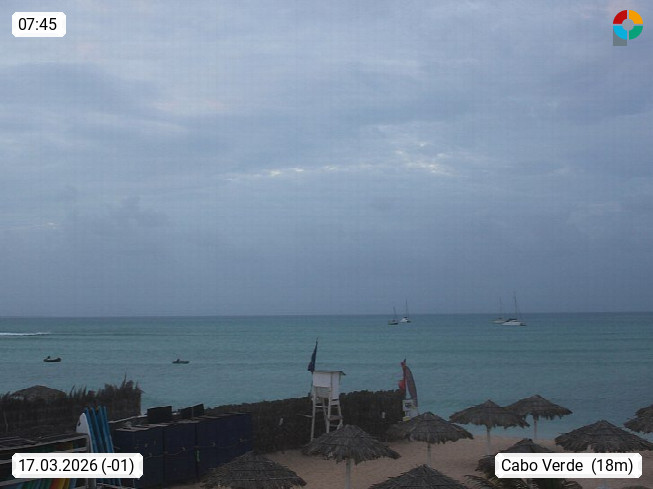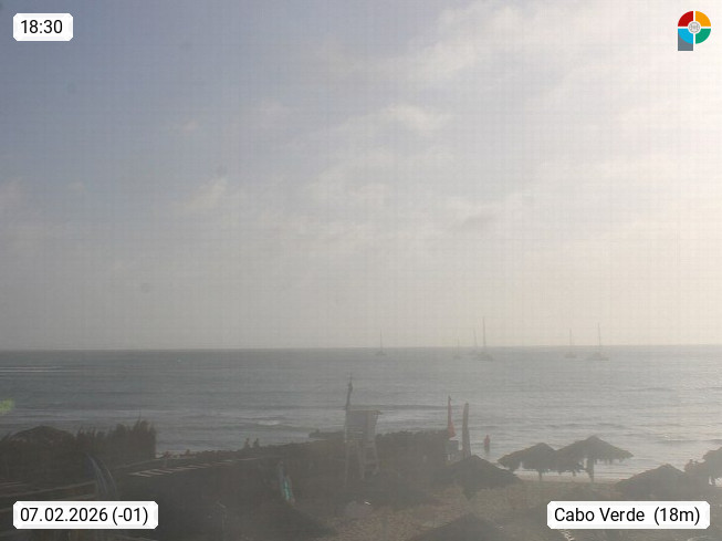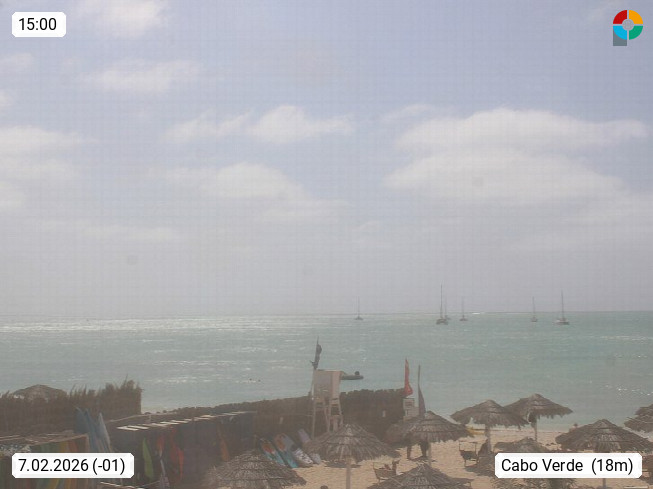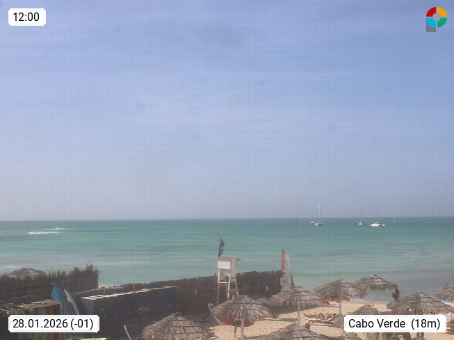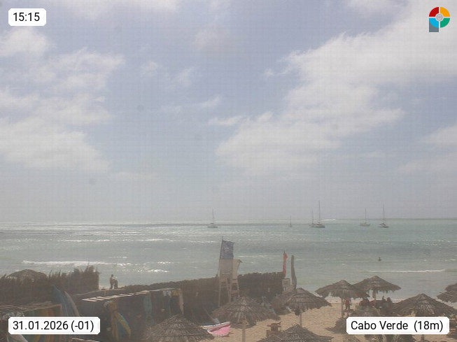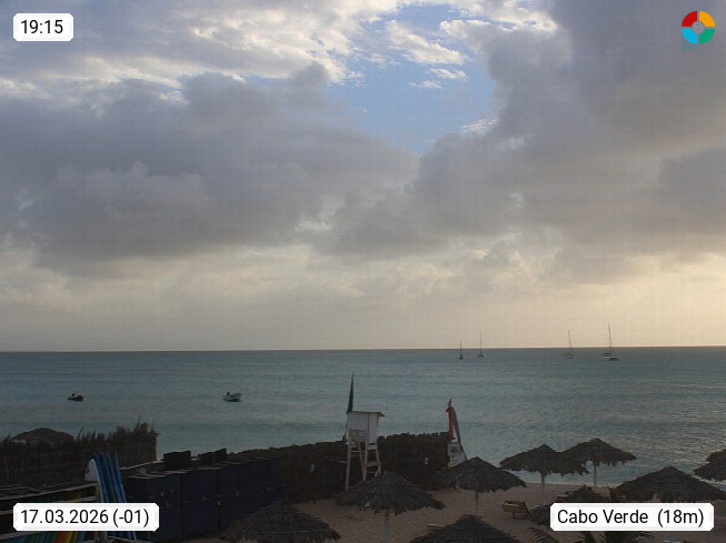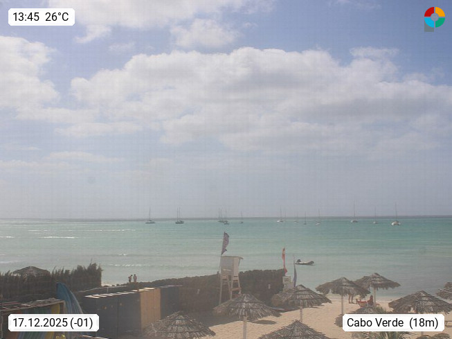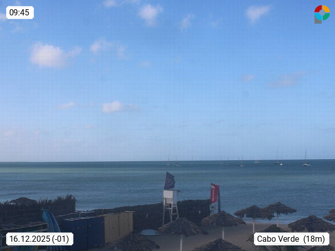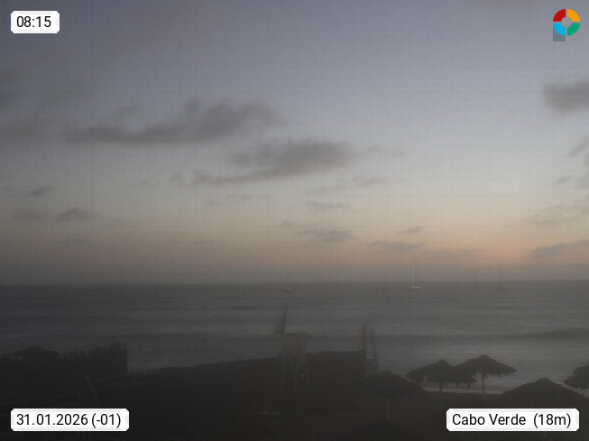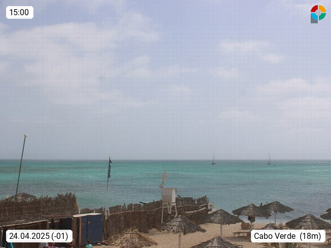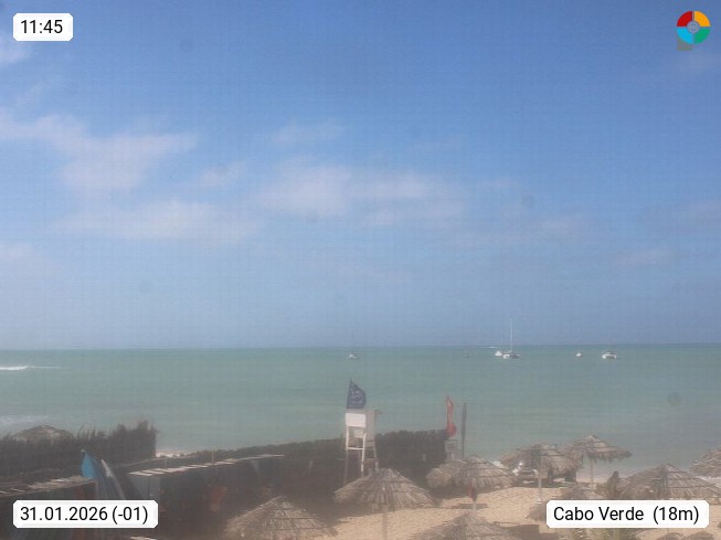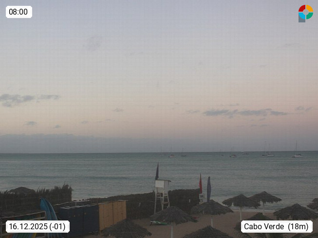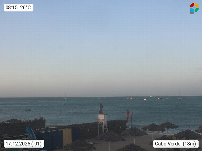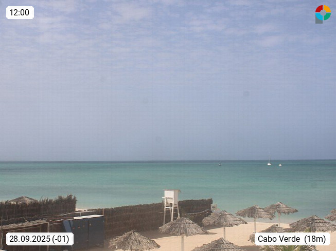 Kap Verde (Cabo Verde), Kapverden, Kapverdische Inseln, ist ein afrikanischer Inselstaat mit insgesamt 15 Inseln, 460 Kilometer vor der Westküste Afrikas. Die Inseln werden unterschieden zwischen den Inseln über dem Wind (Barlavento) und unter dem Wind (Sotavento). Blick über den Strand bei Boa Vista, auf der Insel Sal Richtung Westen. Präsentiert von https://www.addicted-sports.com.