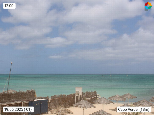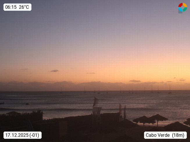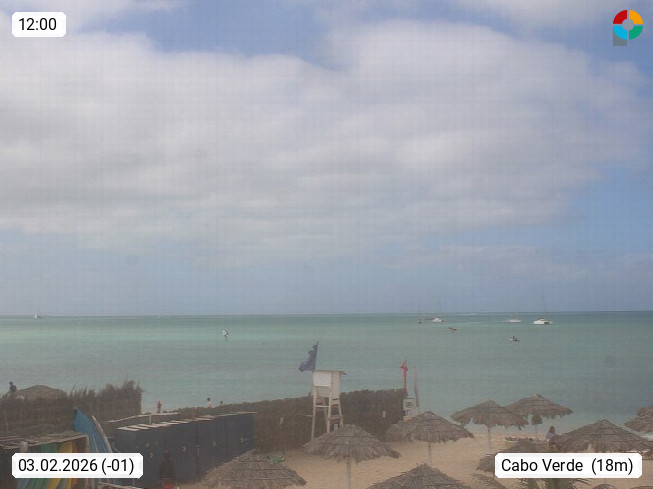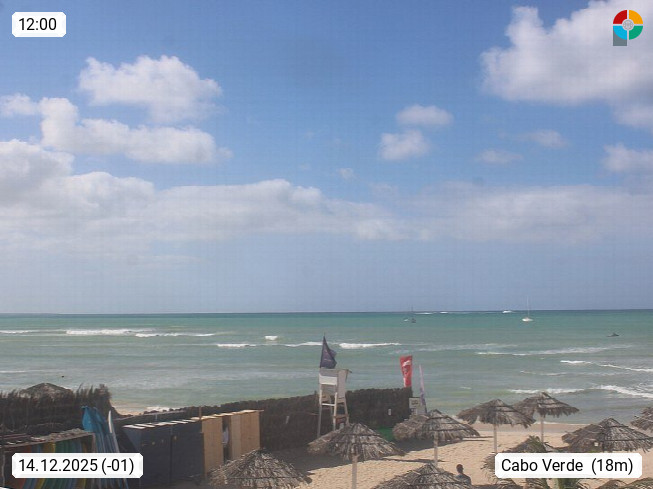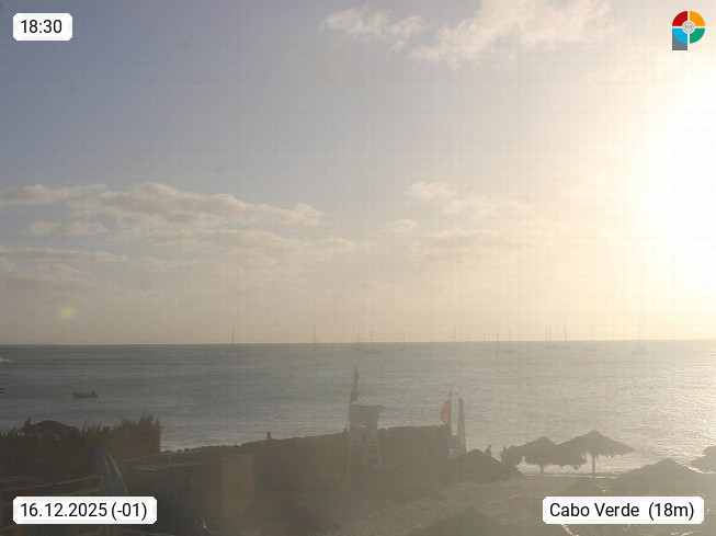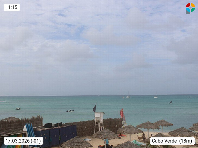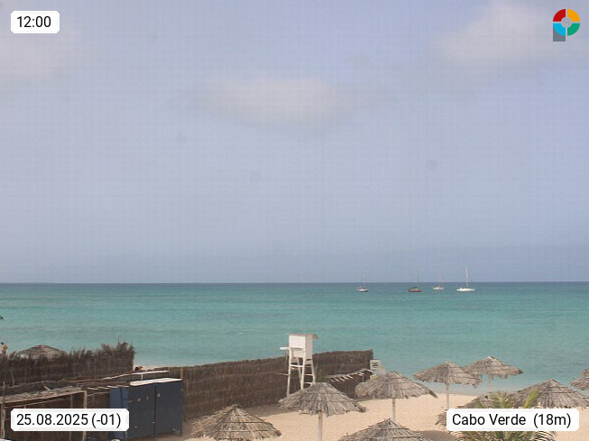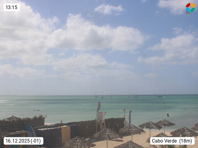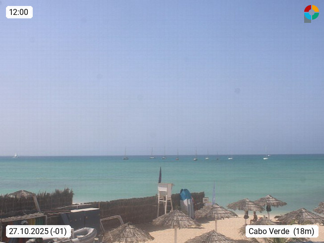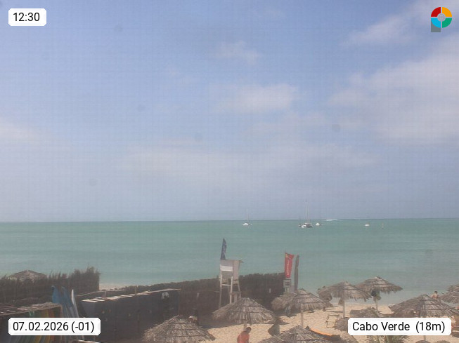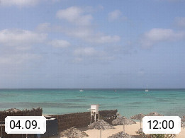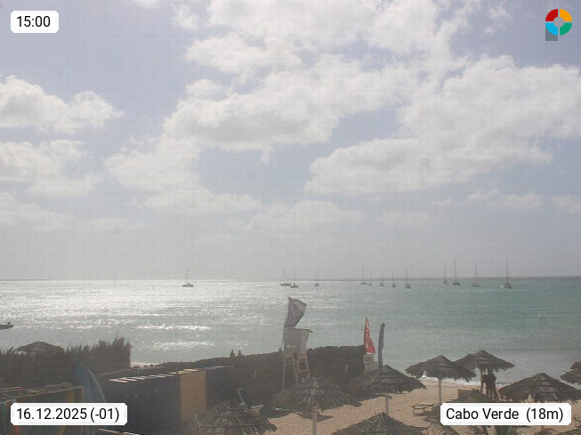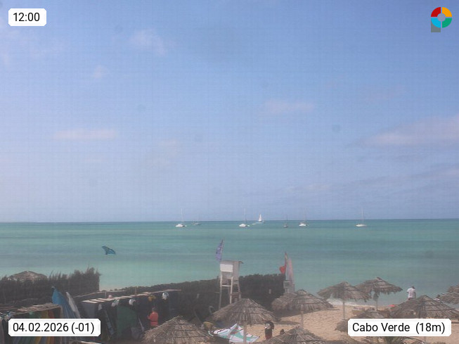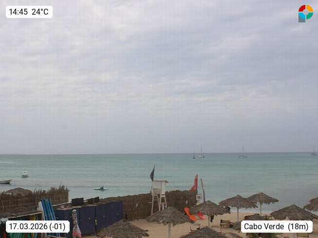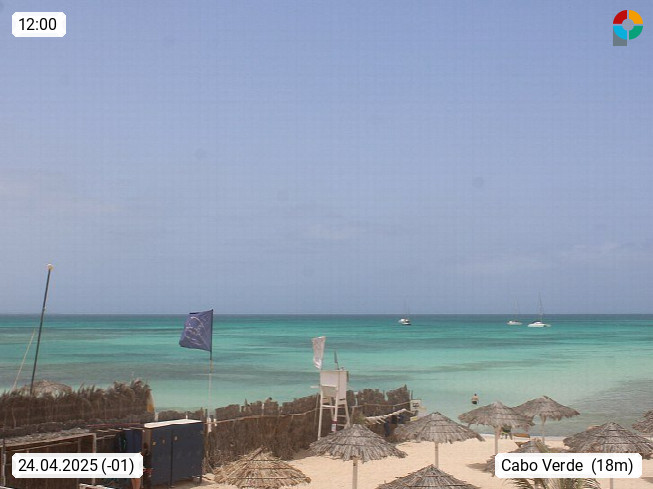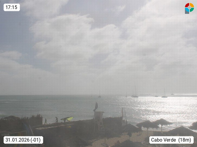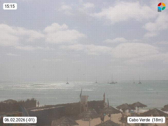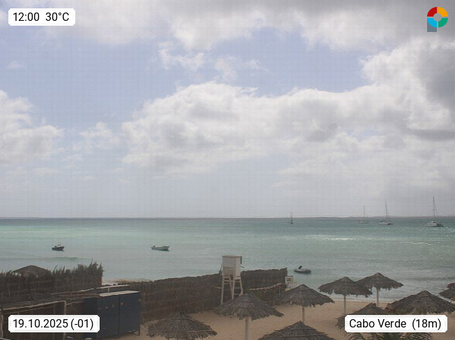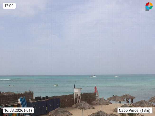 Kap Verde (Cabo Verde), Kapverden, Kapverdische Inseln, ist ein afrikanischer Inselstaat mit insgesamt 15 Inseln, 460 Kilometer vor der Westküste Afrikas. Die Inseln werden unterschieden zwischen den Inseln über dem Wind (Barlavento) und unter dem Wind (Sotavento). Blick über den Strand bei Boa Vista, auf der Insel Sal Richtung Westen. Präsentiert von https://www.addicted-sports.com.