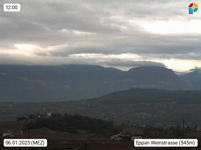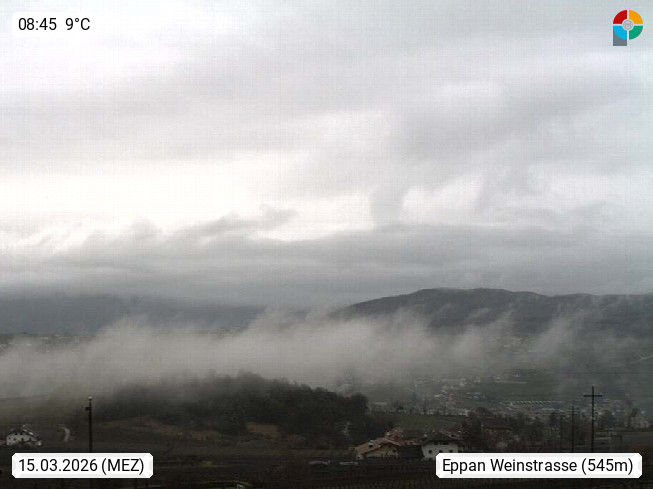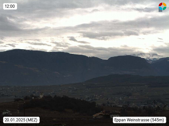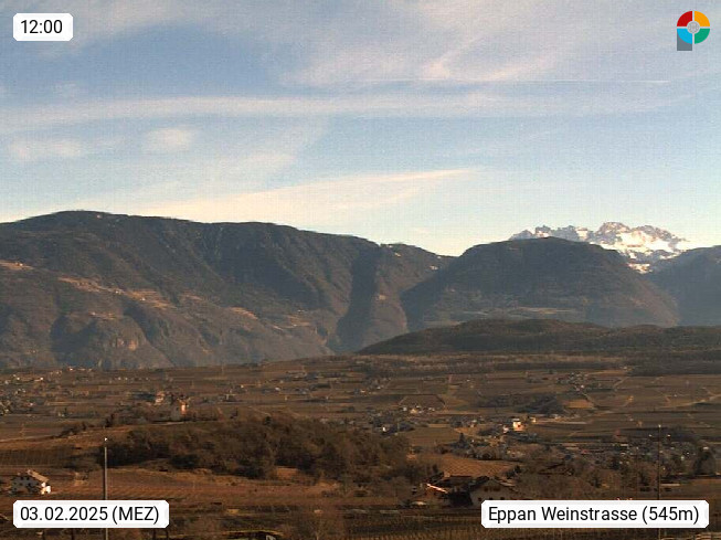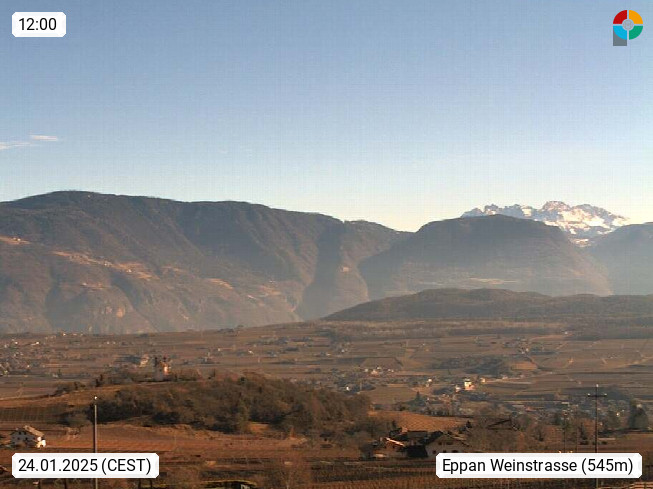 I 39057 Eppan an der Weinstraße (Appiano sulla Strada del Vino) 430m, im Überetsch zwischen Bozen (Bolzano) und Kaltern (Caldaro) an den Hängen des Mendelkamm (Costiera della Mendola). Panoramablick Richtung Nordosten zu den Sarntaler Alpen (Alpi Sarentine), Tschögglberg, Rittner Horn, Kohlerer Berg, Schlern, Latemar und Weißhorn. Präsentiert von https://www.steinegger.it/.