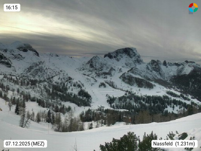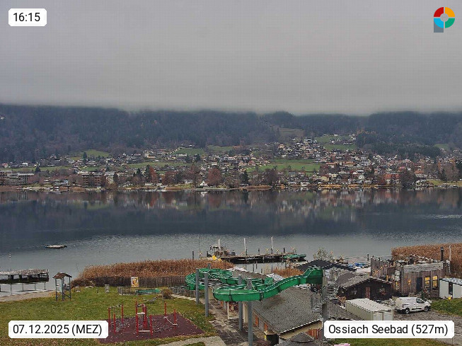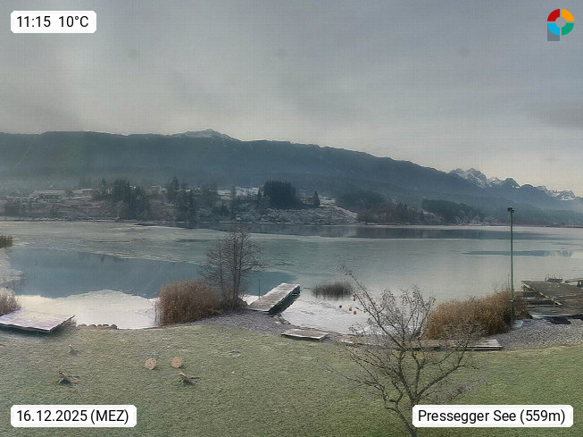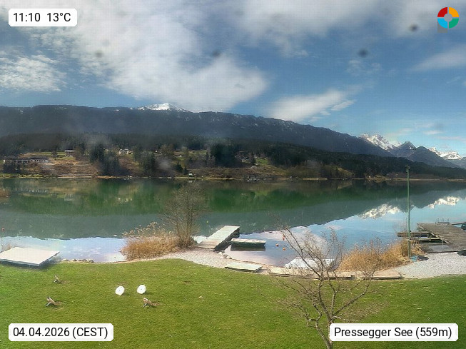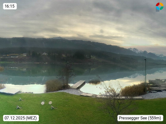 A 9620 Hermagor Presseggersee 620m, im Bezirk Hermagor in der Region Gailtal an der Einmündung des Gitschtals, nahe der Grenze zu Italien. Blick Richtung Süden über den Erlebnispark am Presseggersee, dahinter die Karnischen Alpen deren Bergrücken die Grenze zu Italien bildet. Präsentiert von https://erlebnispark.cc/.