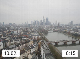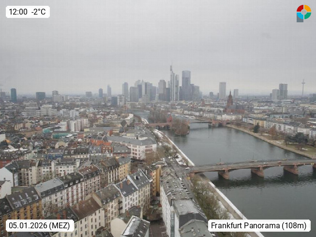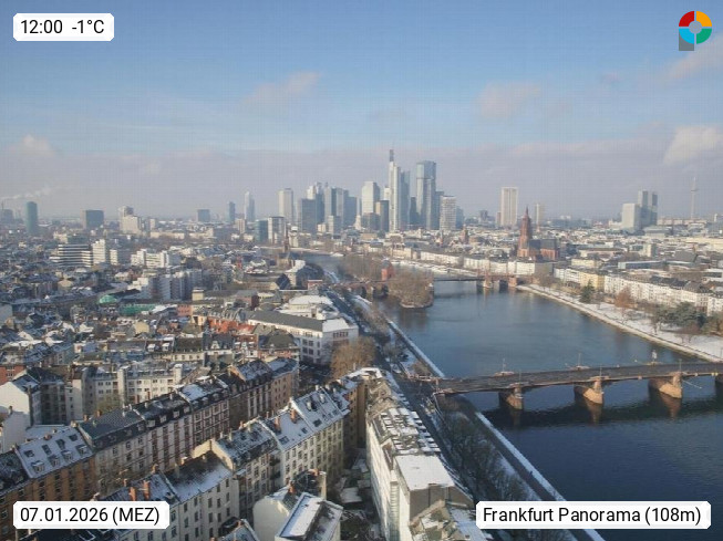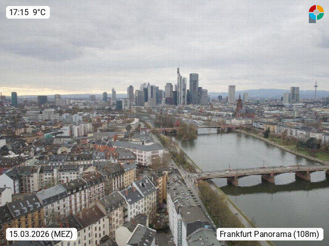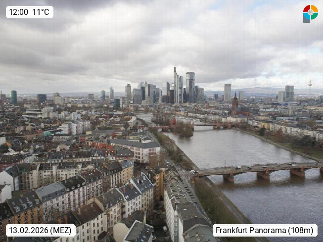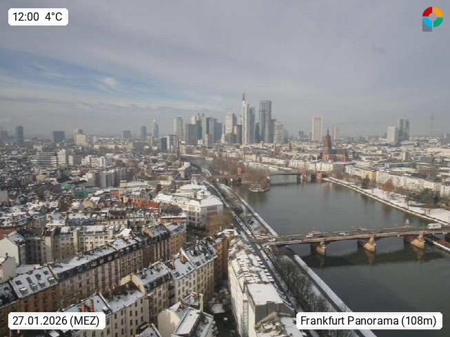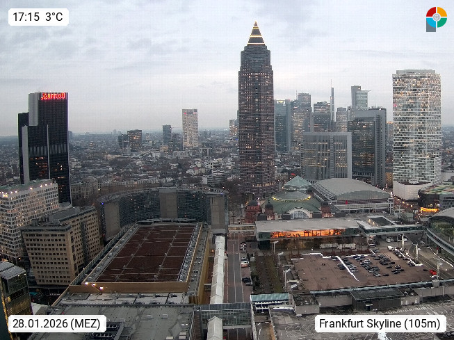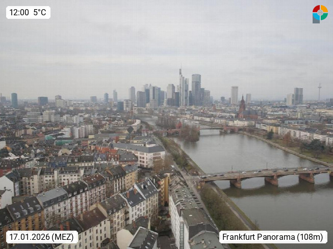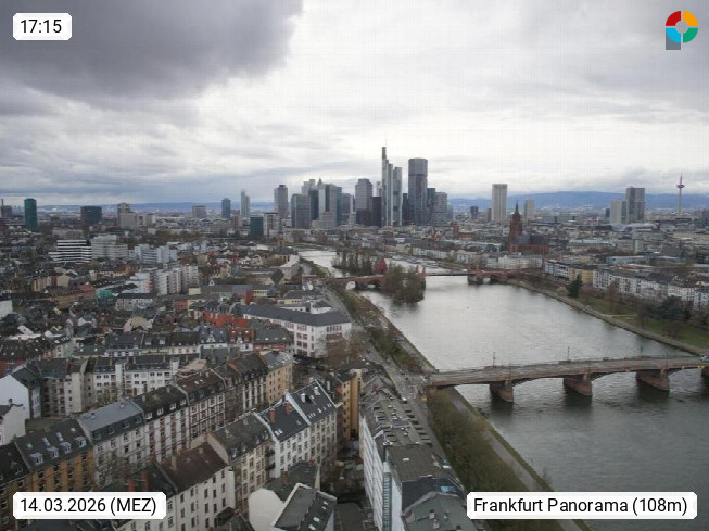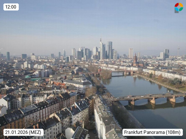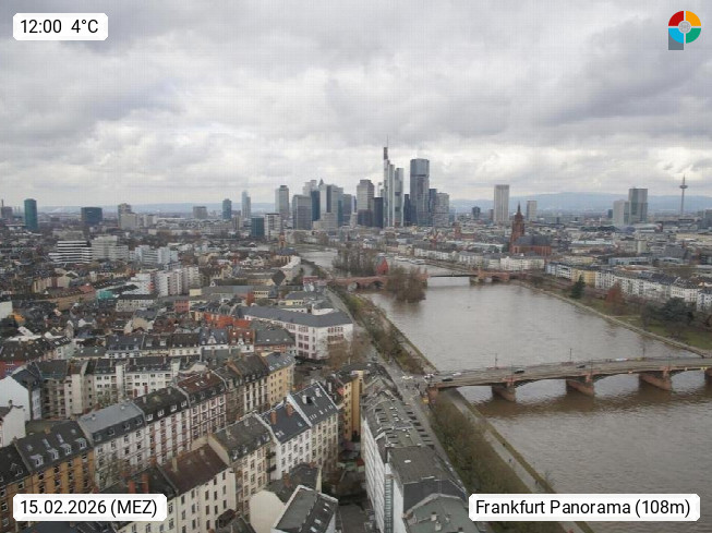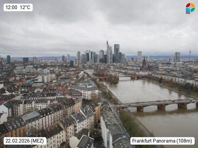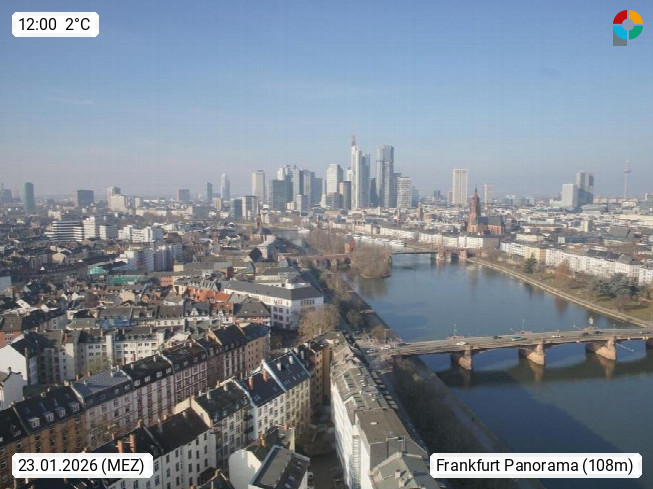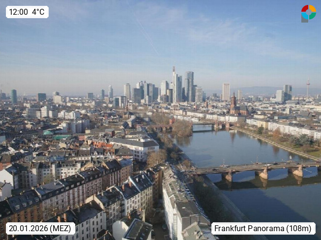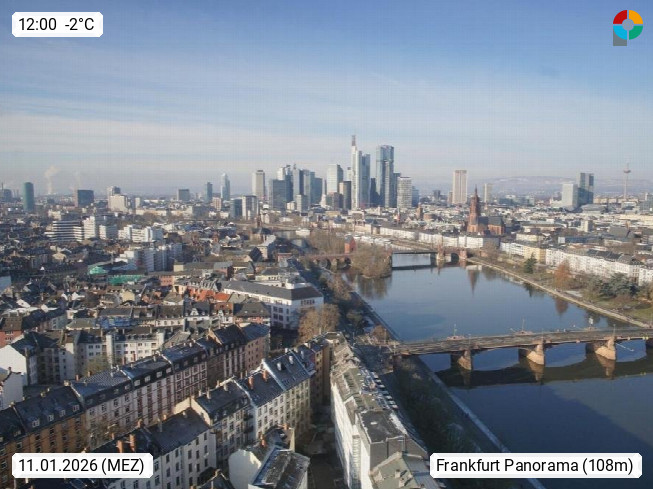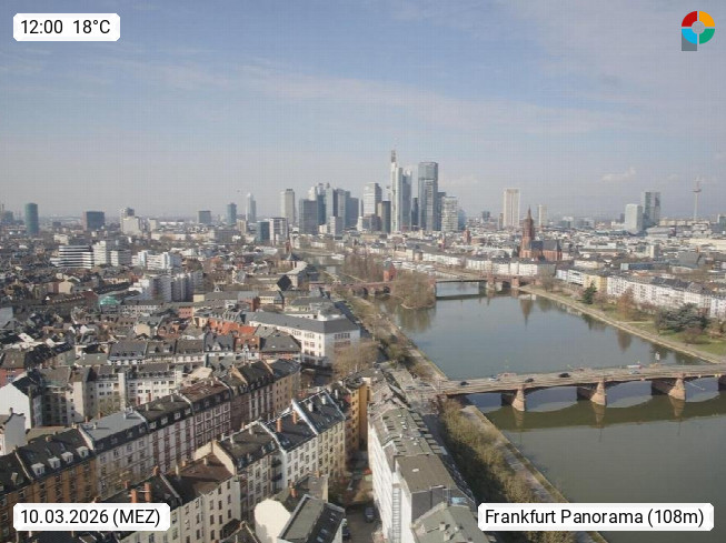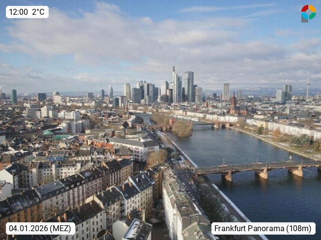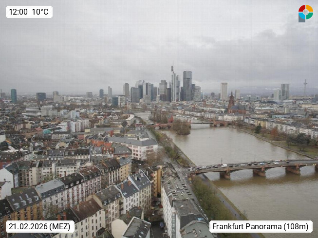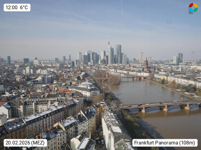 D 60327 Frankfurt am Main 112m, größte Stadt Hessens und eine der reichsten Großstädte Europas sowie Banken, Literatur und Kulturmetropole. Die Stadt liegt auf beiden Seiten des Untermains südöstlich des Taunus und ist Geburtsort von Johann Wolfgang von Goethe. Panoramablick vom Dach des Torhauses des Messezentrums Richtung Süden zu den Bürohäusern der Bankenmetropole Frankfurt am Main. Präsentiert von https://www.bergfex.de/.