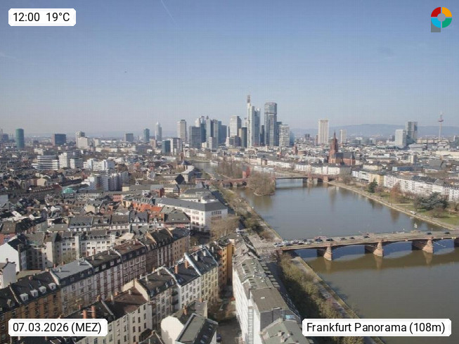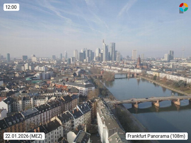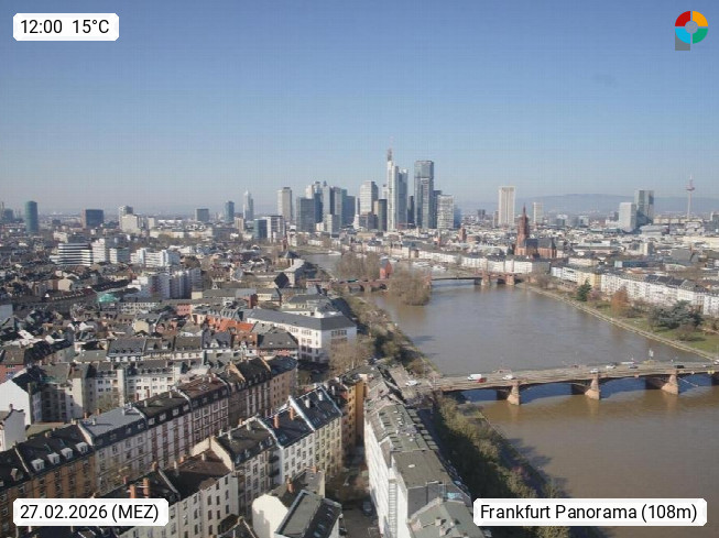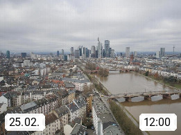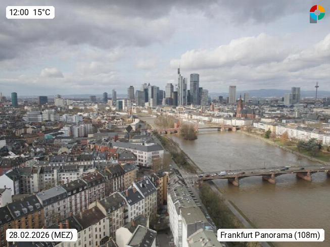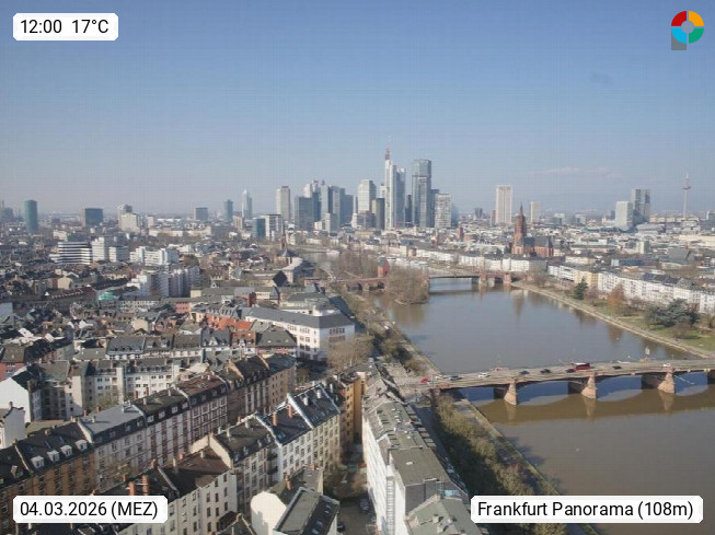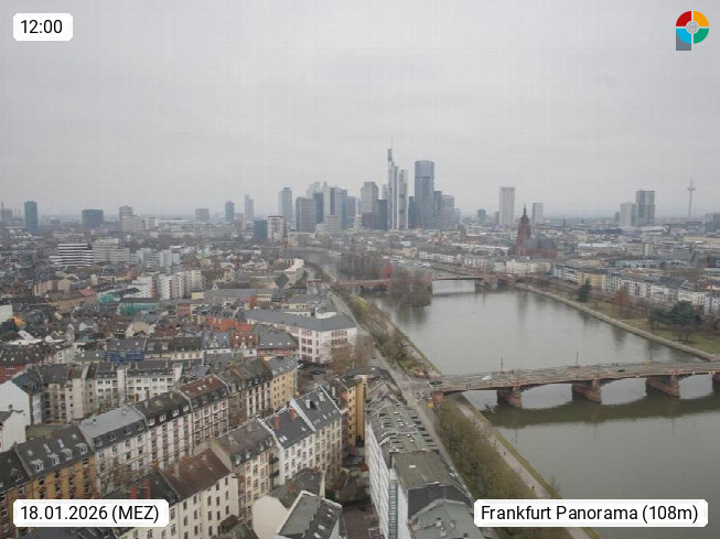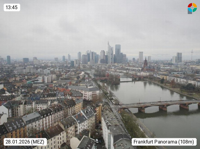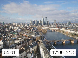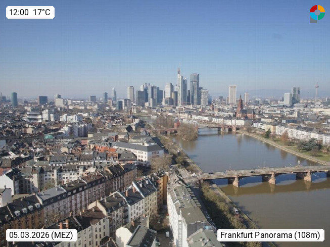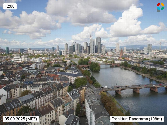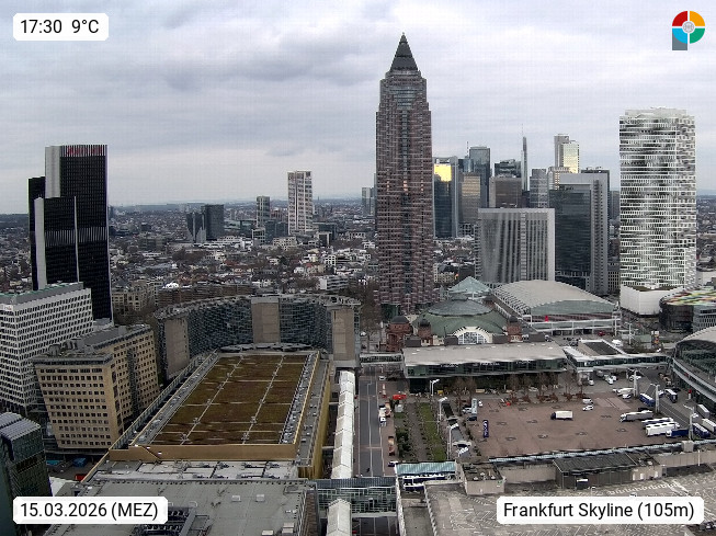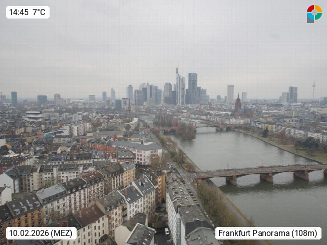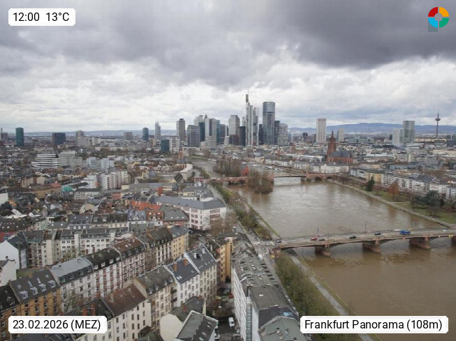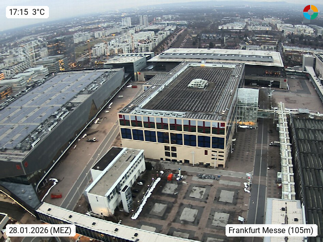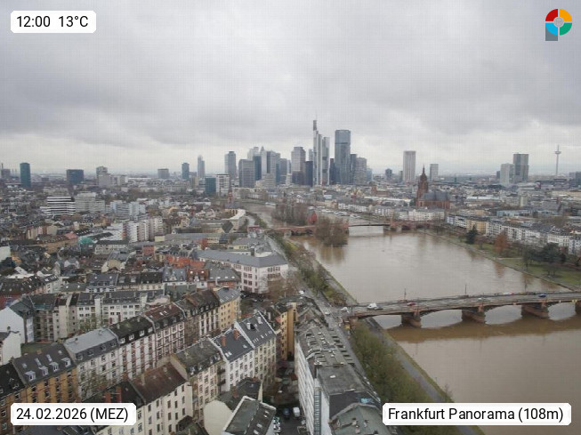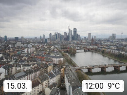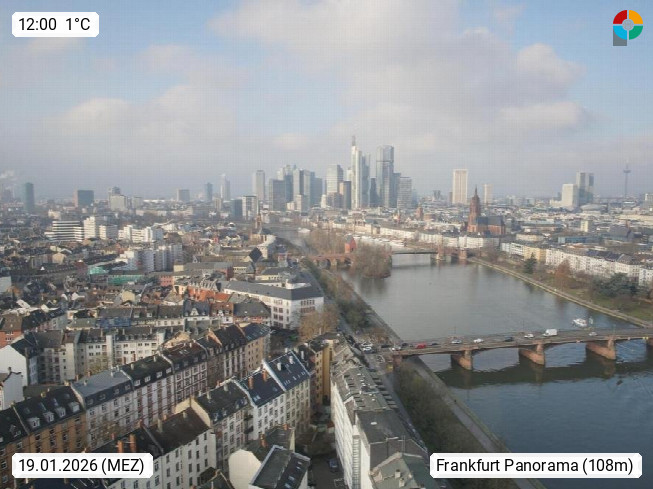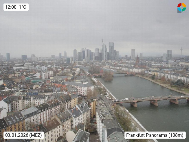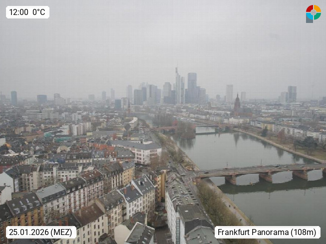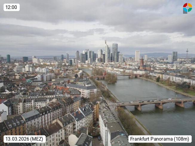 D 60327 Frankfurt am Main 112m, größte Stadt Hessens und eine der reichsten Großstädte Europas sowie Banken, Literatur und Kulturmetropole. Die Stadt liegt auf beiden Seiten des Untermains südöstlich des Taunus und ist Geburtsort von Johann Wolfgang von Goethe. Panoramablick vom Dach des Torhauses des Messezentrums Richtung Süden zu den Bürohäusern der Bankenmetropole Frankfurt am Main. Präsentiert von https://www.bergfex.de/.