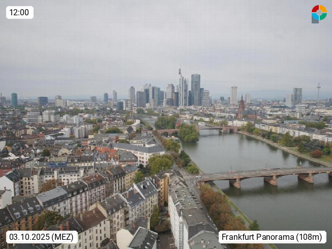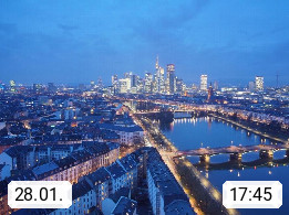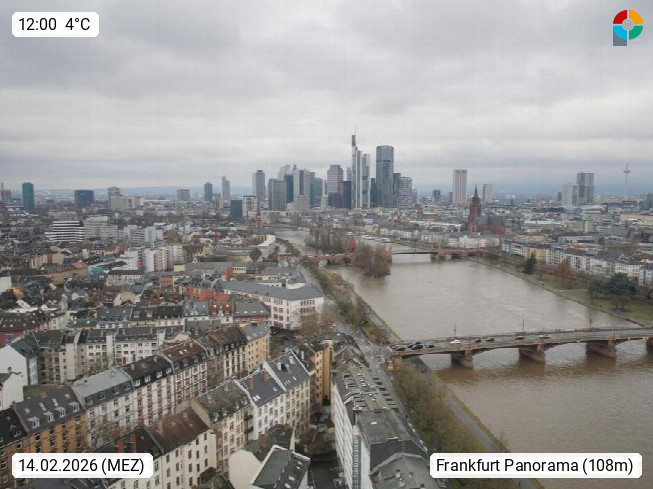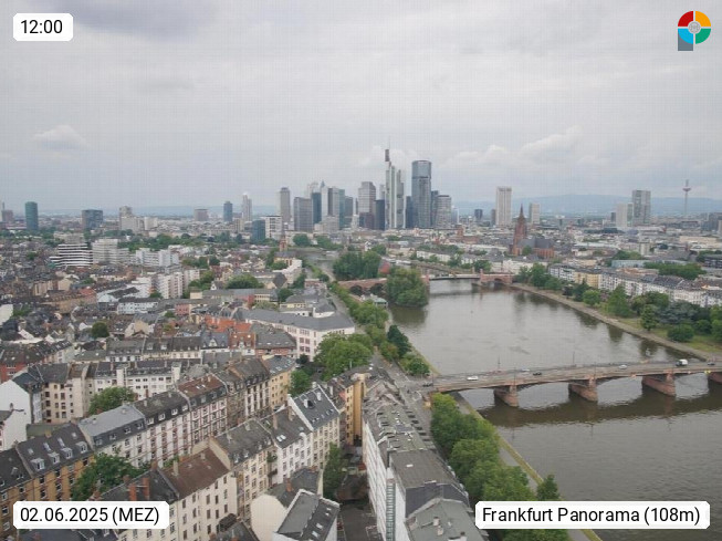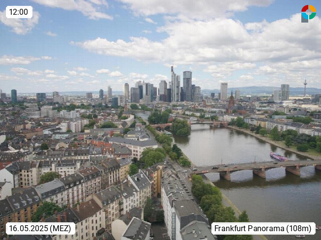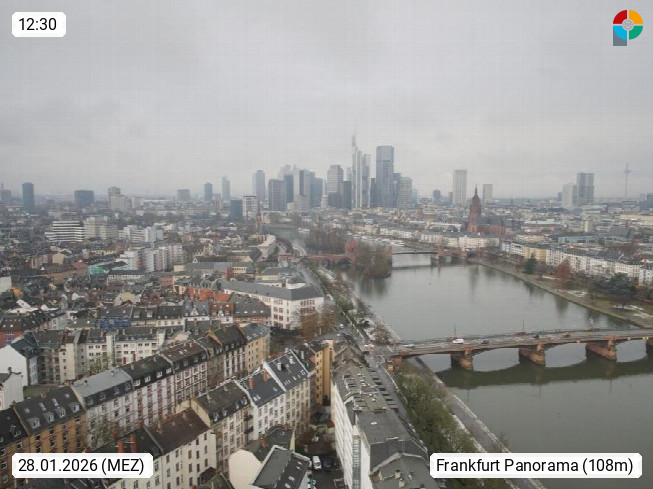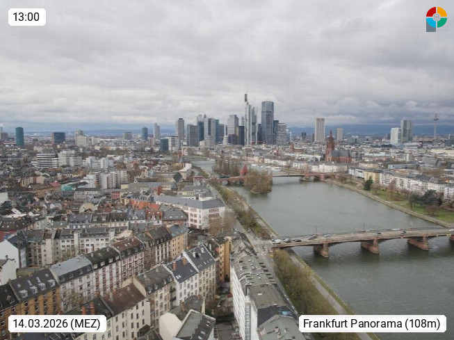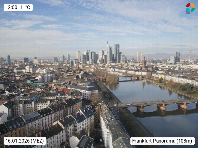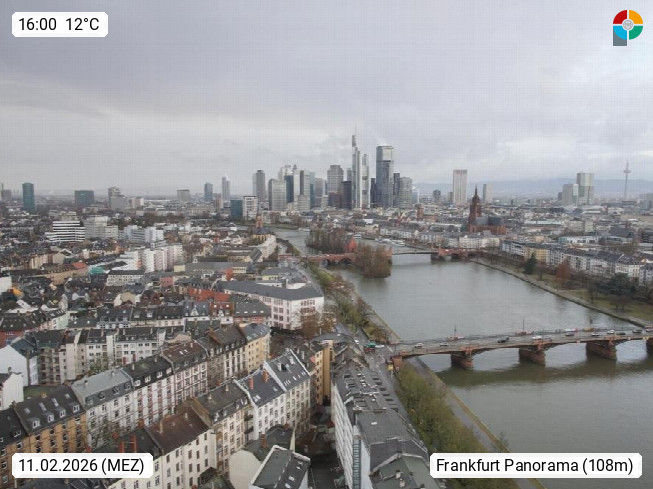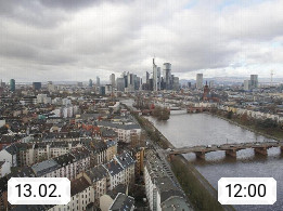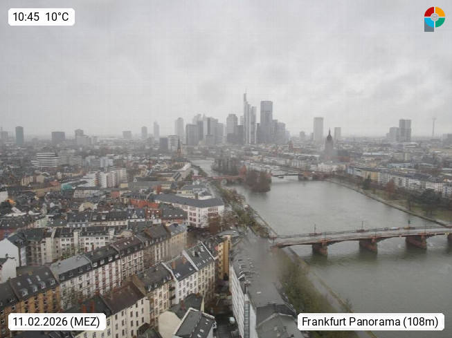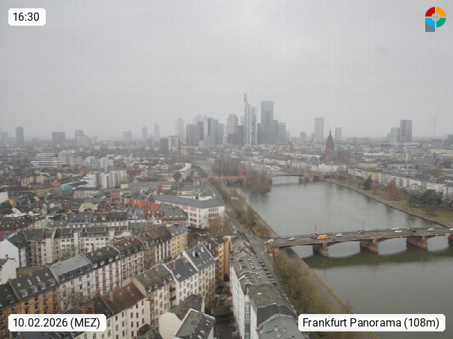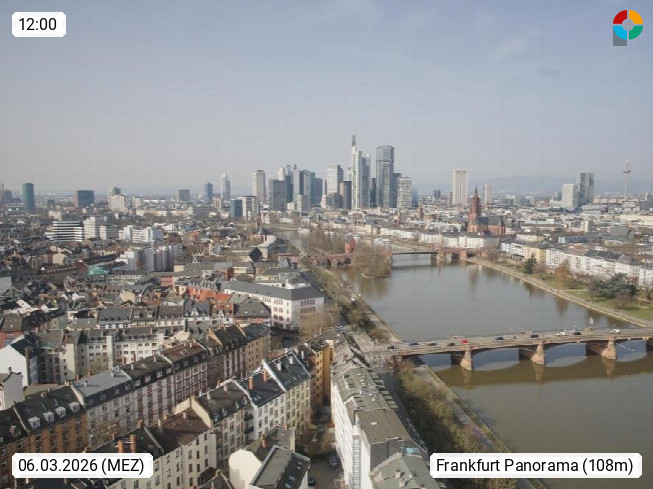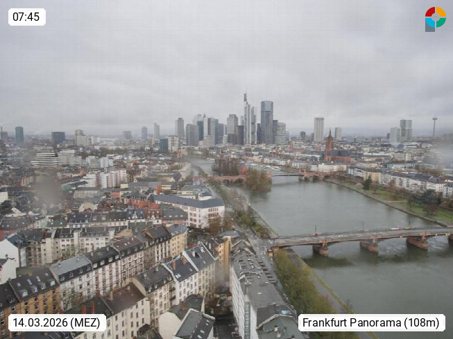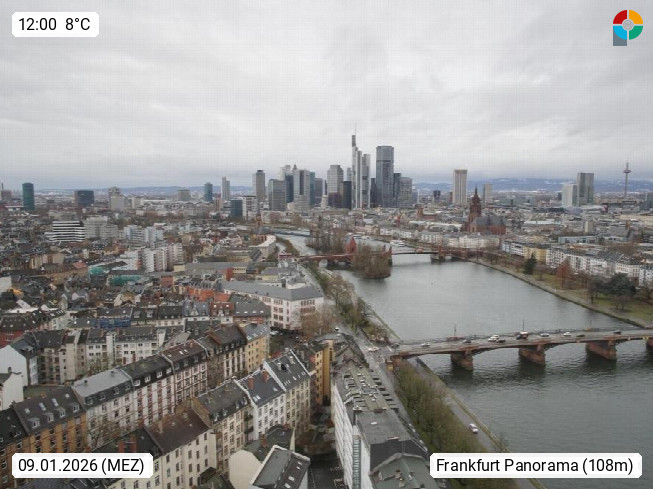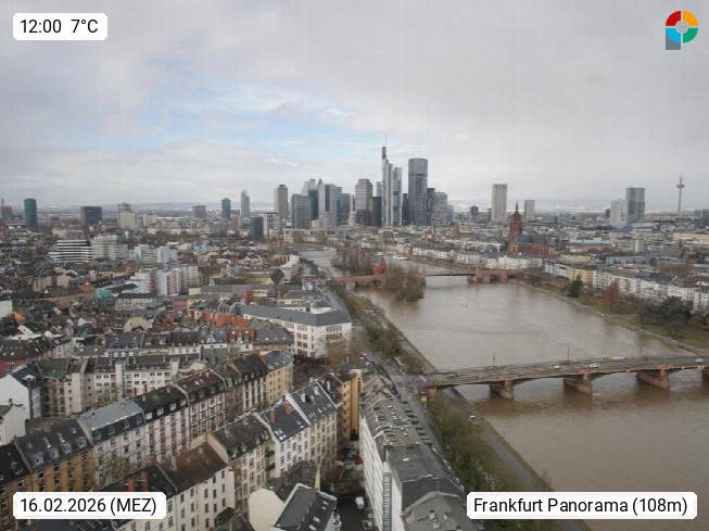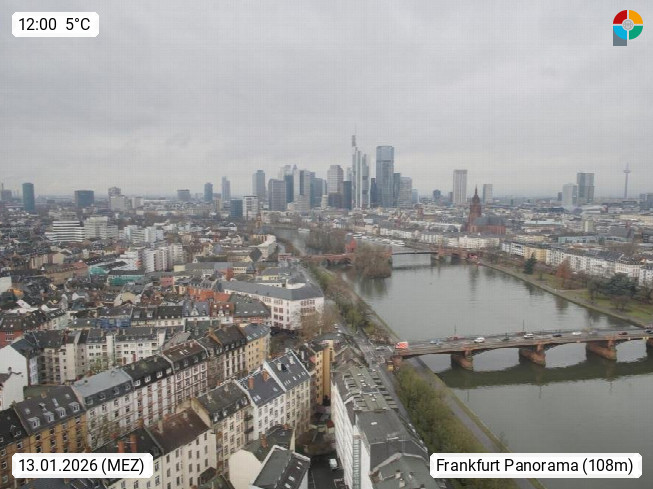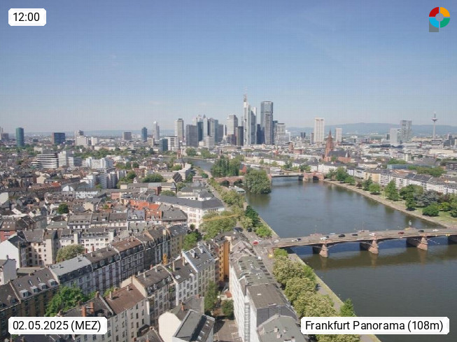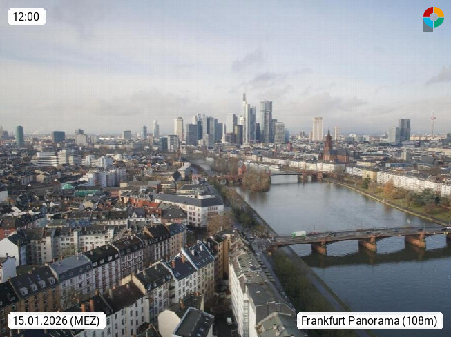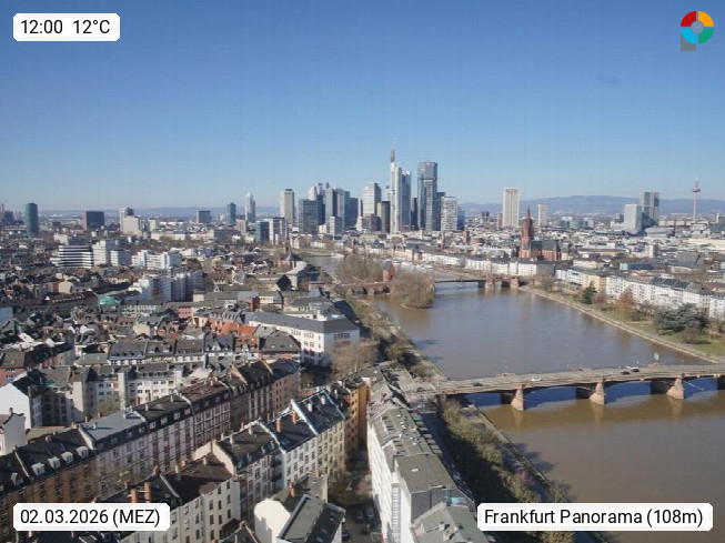 D 60327 Frankfurt am Main 112m, größte Stadt Hessens und eine der reichsten Großstädte Europas sowie Banken, Literatur und Kulturmetropole. Die Stadt liegt auf beiden Seiten des Untermains südöstlich des Taunus und ist Geburtsort von Johann Wolfgang von Goethe. Panoramablick vom Dach des Torhauses des Messezentrums Richtung Süden zu den Bürohäusern der Bankenmetropole Frankfurt am Main. Präsentiert von https://www.bergfex.de/.
