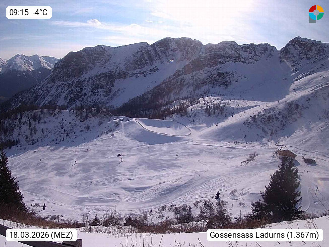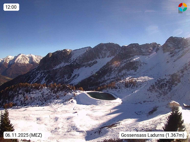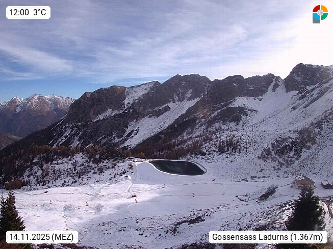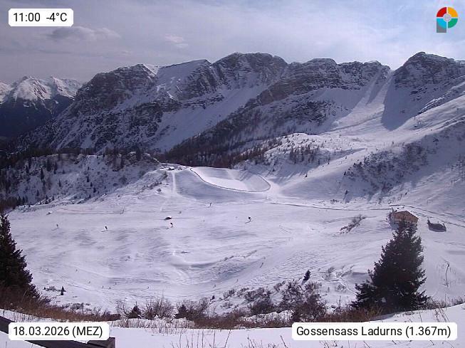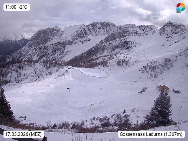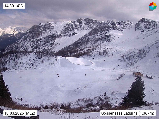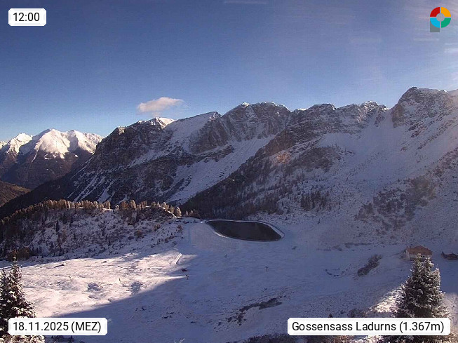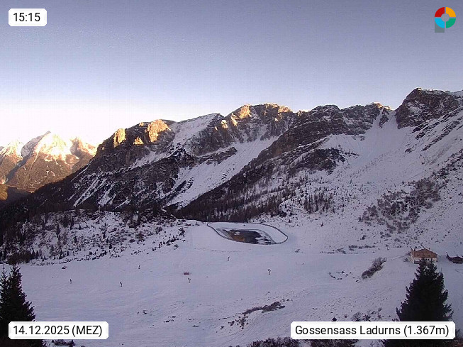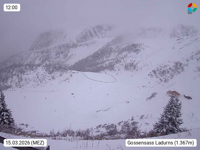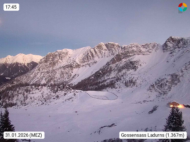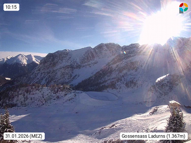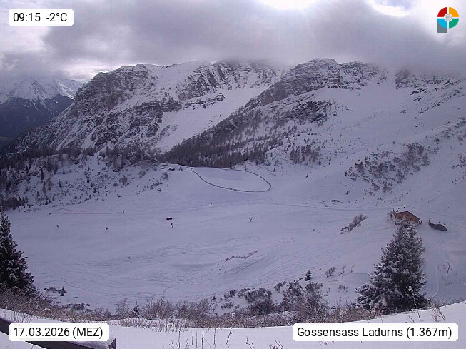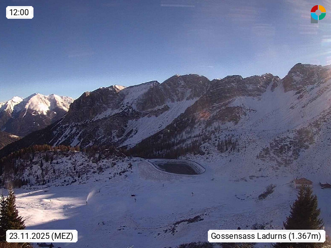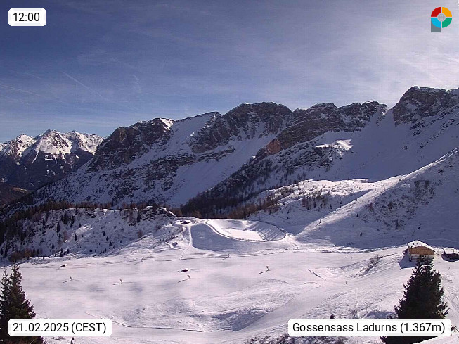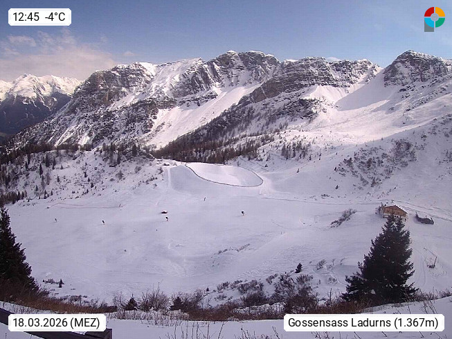 I 39040 Gossensass Ladurns (Colle Isarco) am Brenner (Brennero) 1.240m, Dorf in der Gemeinde Brenner (Brennero) in der Bezirksgemeinschaft Wipptal nördlich von Sterzing (Vipiteno). Blick von der Bergstation im Ski und Wandergebiet Ladurns 2.010m, Richtung Nordost auf das Felsmassiv des Pflerscher Tribulaun 3.097m in den Stubaier Alpen in Tirol, an der Grenze von Südtirol zu Österreich. Präsentiert von https://www.ladurns.it/de.