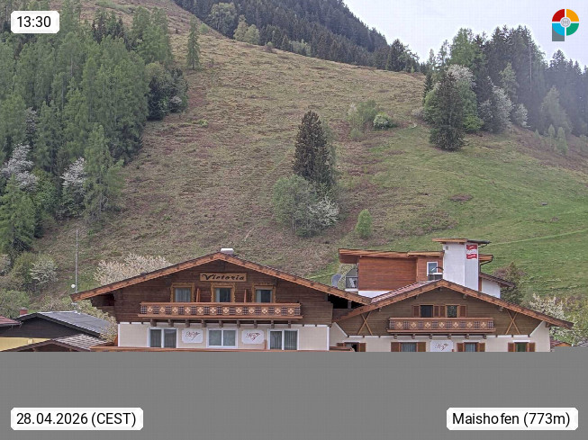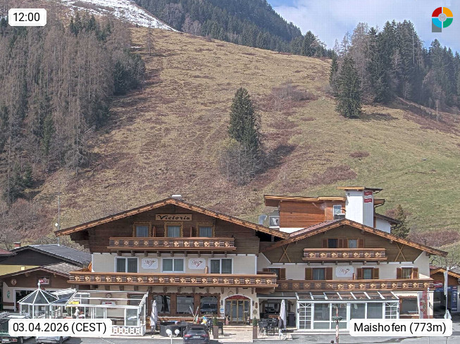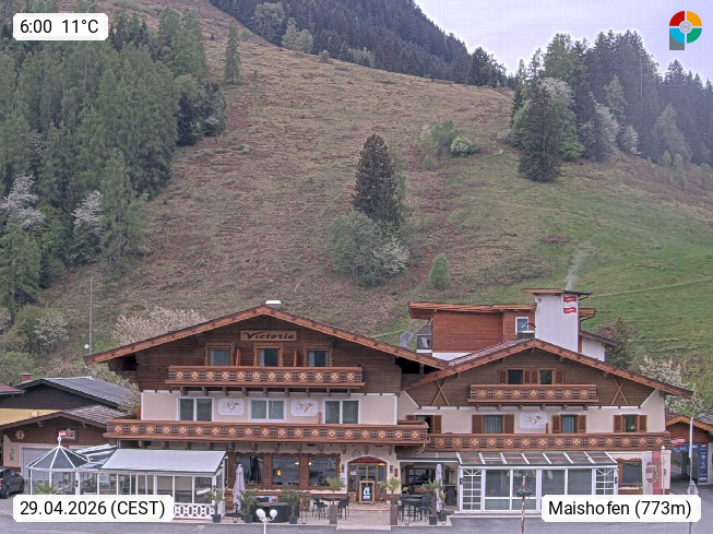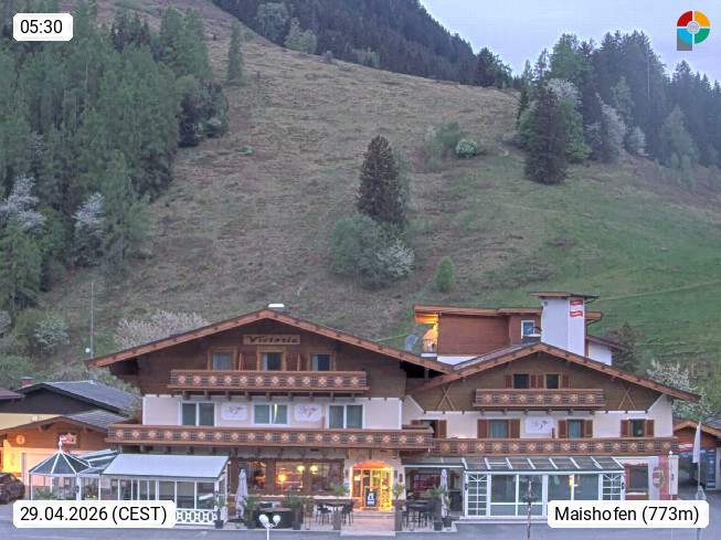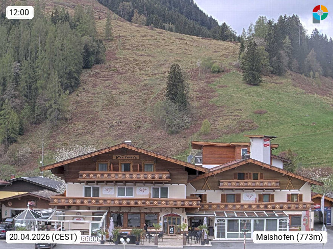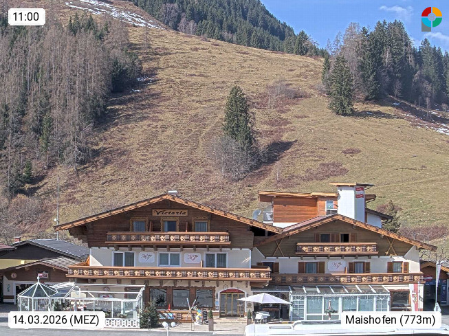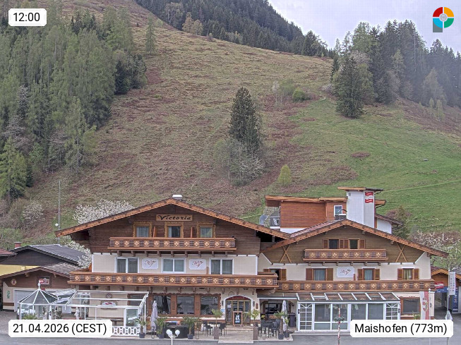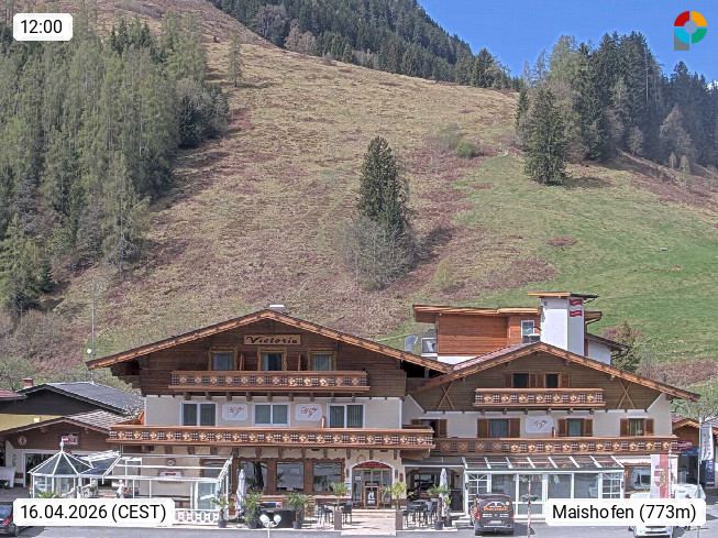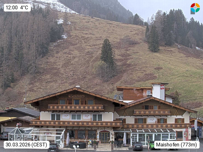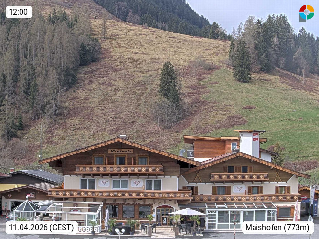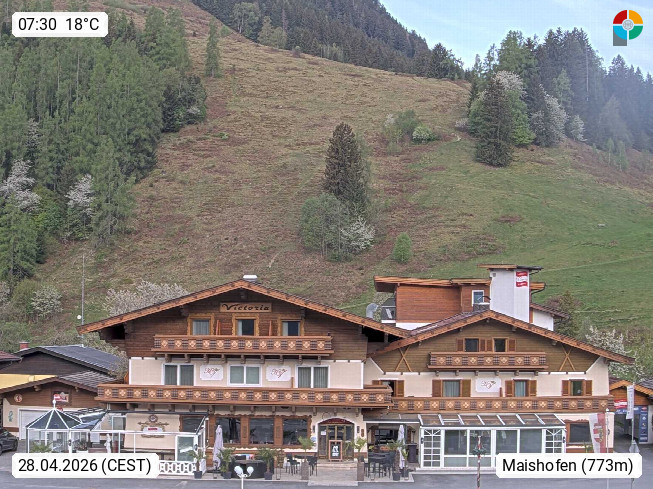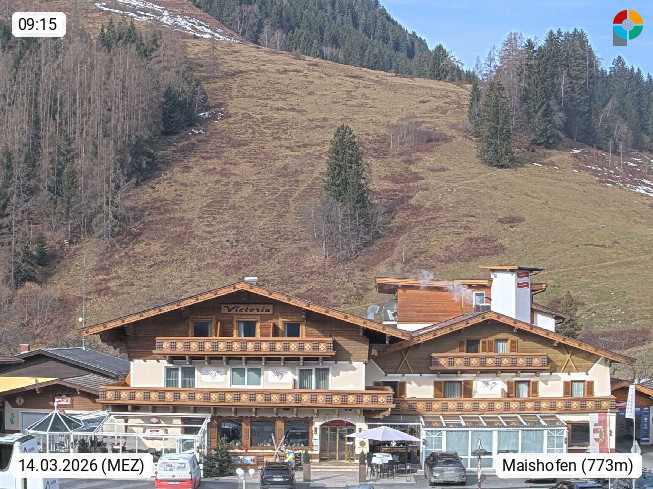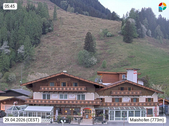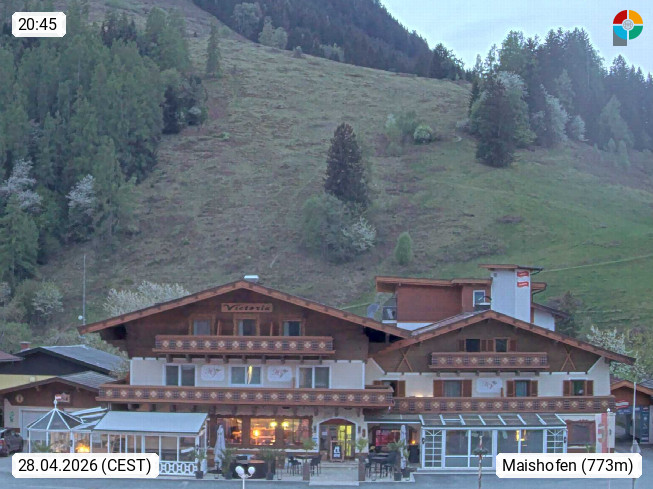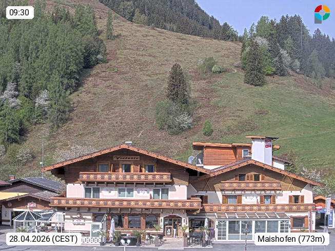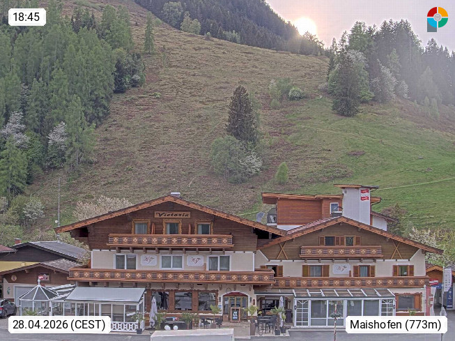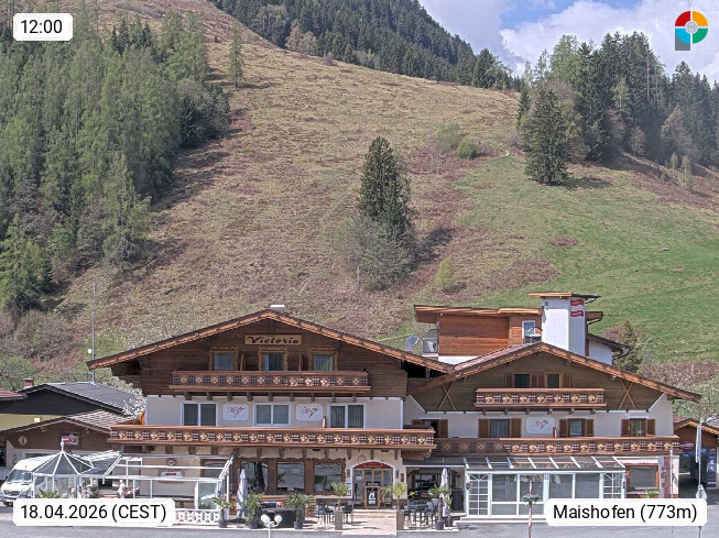 A 5751 Maishofen 768m, Gemeinde im Bezirk Pinzgau zwischen dem Zeller See und Beginn des Glemmtales Richtung Saalbach Hinterglemm, inmitten der Pinzgauer Grasberge. Blick zum Hotel Victoria am Fusse des Atzingerberg und Sausteign 1.800m, Richtung Westen in das Glemmtal. Präsentiert von https://www.hotelvictoria.at/.