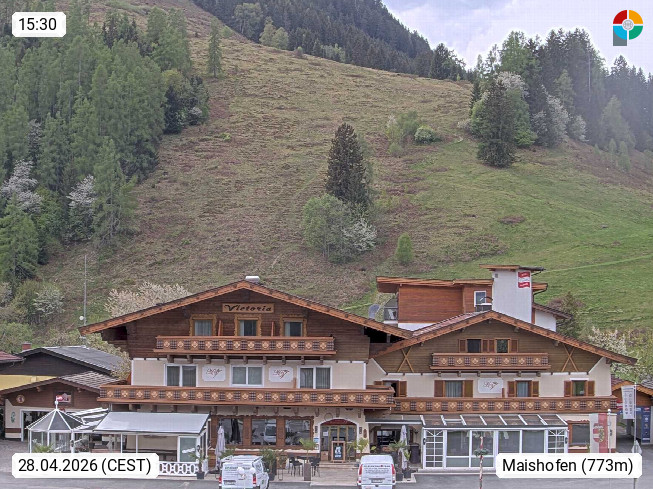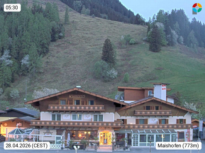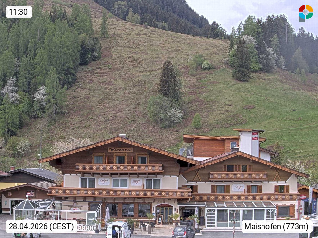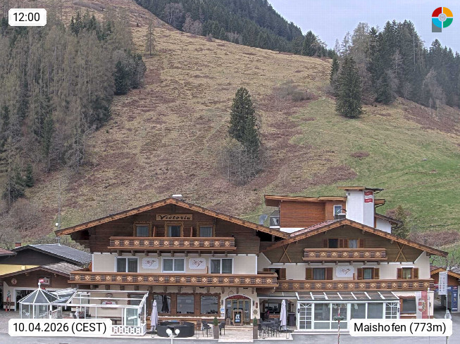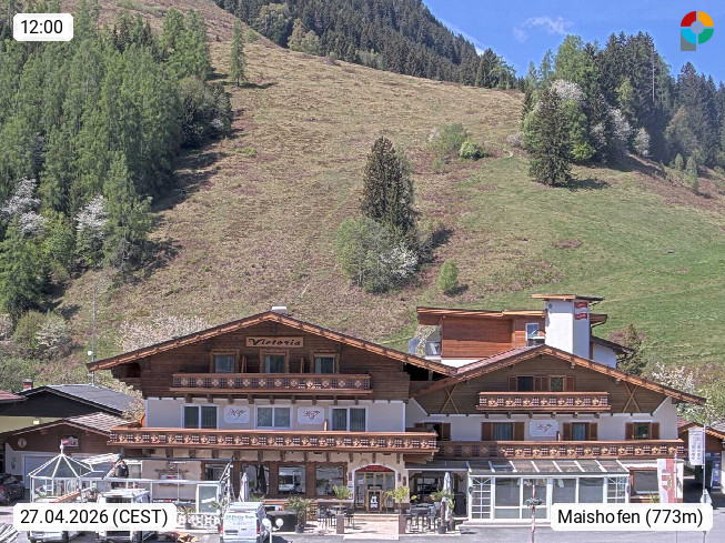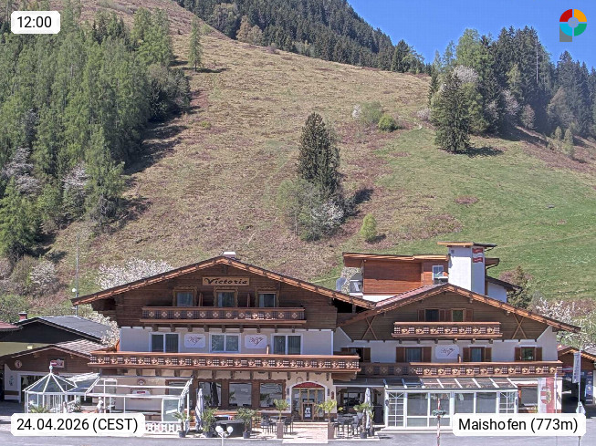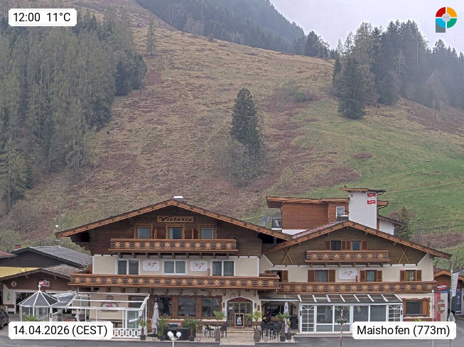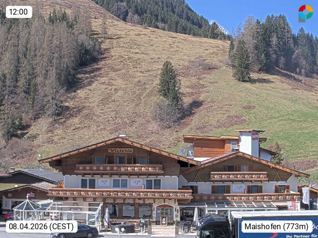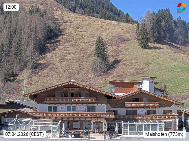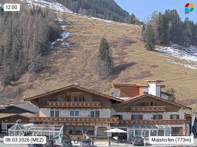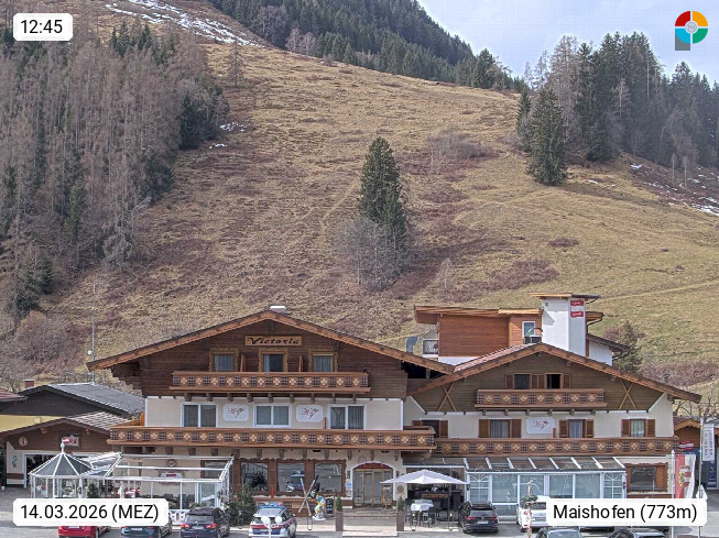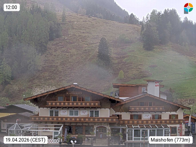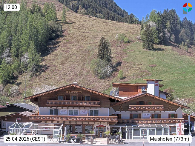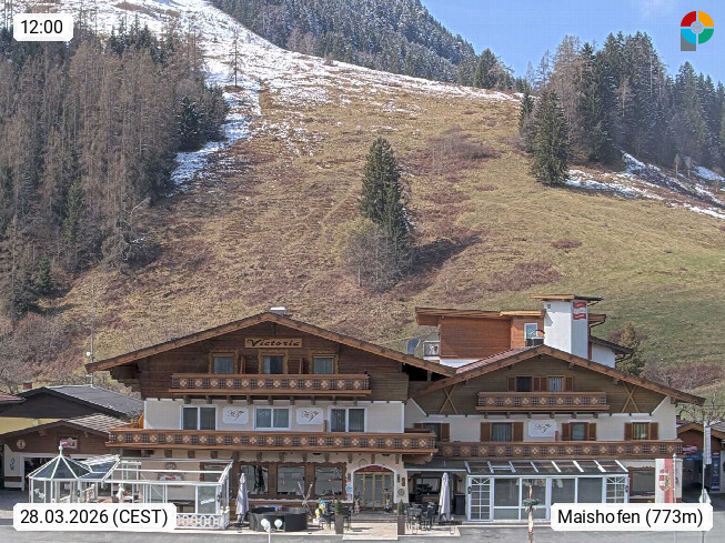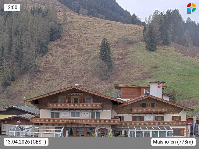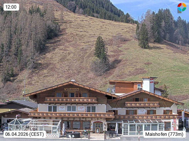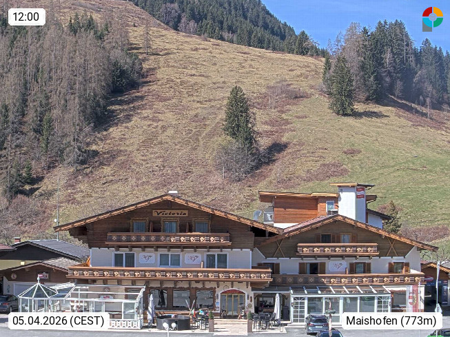 A 5751 Maishofen 768m, Gemeinde im Bezirk Pinzgau zwischen dem Zeller See und Beginn des Glemmtales Richtung Saalbach Hinterglemm, inmitten der Pinzgauer Grasberge. Blick zum Hotel Victoria am Fusse des Atzingerberg und Sausteign 1.800m, Richtung Westen in das Glemmtal. Präsentiert von https://www.hotelvictoria.at/.