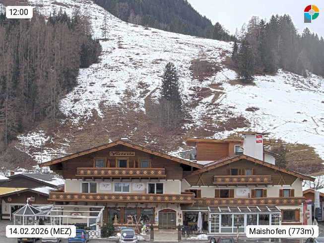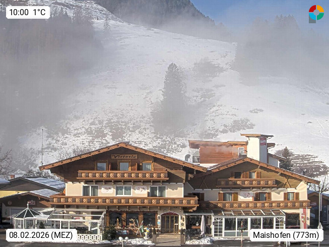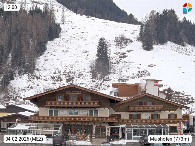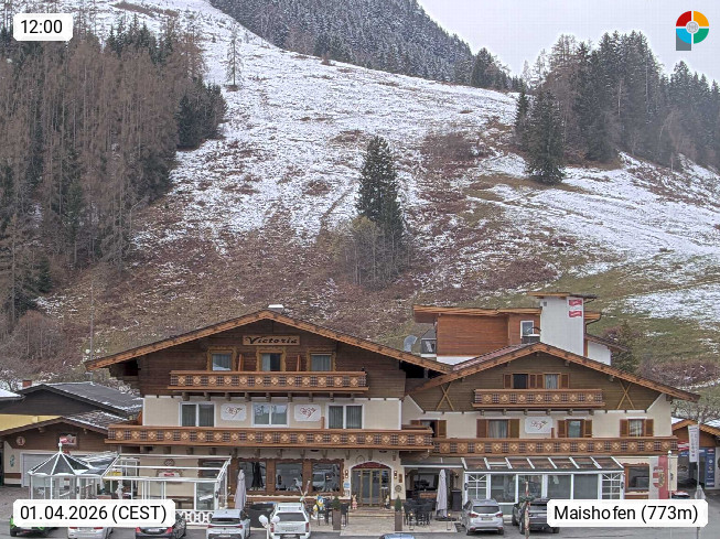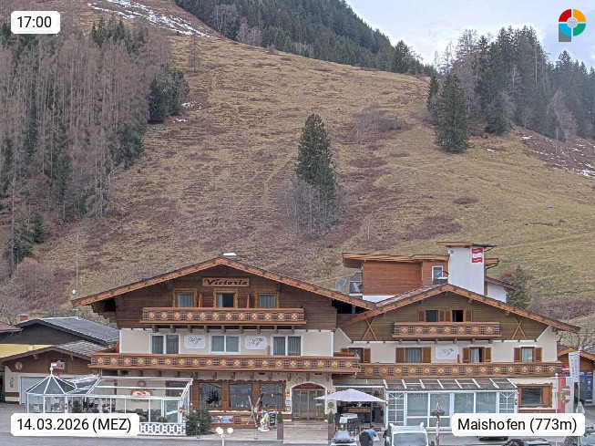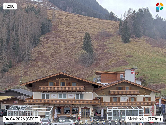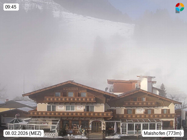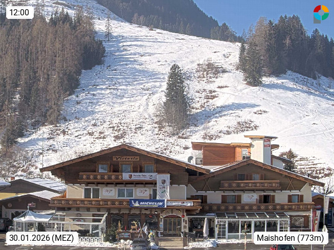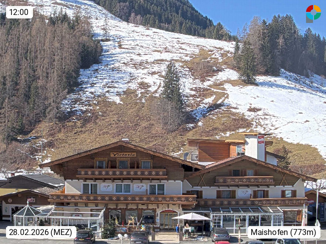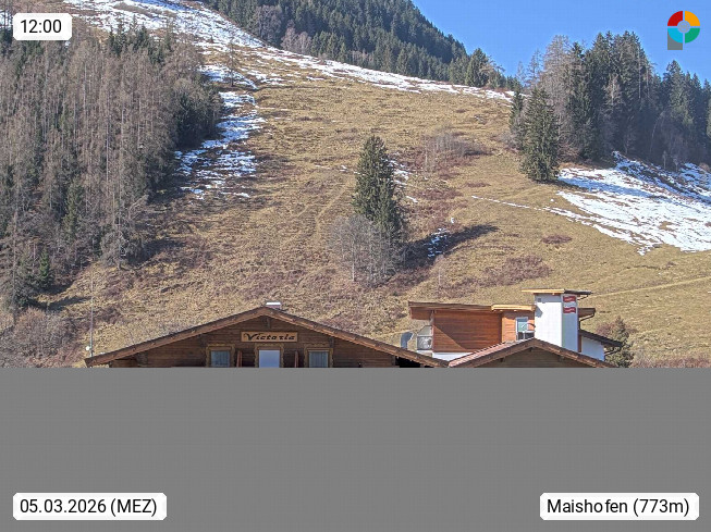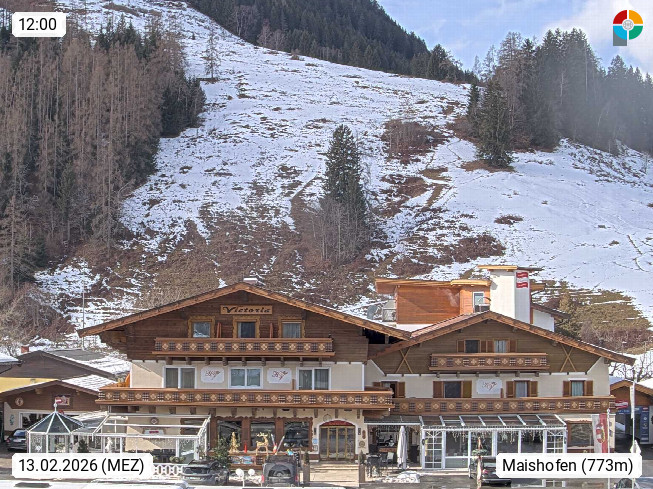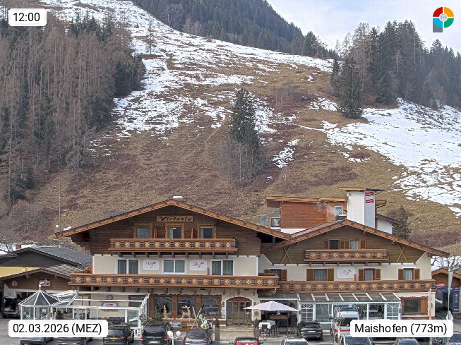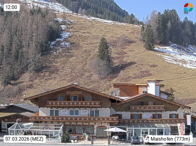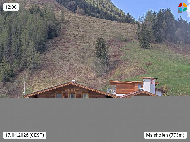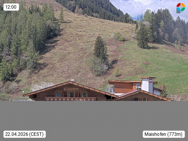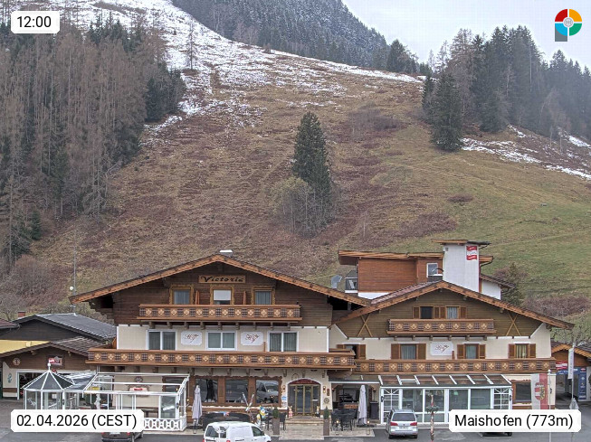 A 5751 Maishofen 768m, Gemeinde im Bezirk Pinzgau zwischen dem Zeller See und Beginn des Glemmtales Richtung Saalbach Hinterglemm, inmitten der Pinzgauer Grasberge. Blick zum Hotel Victoria am Fusse des Atzingerberg und Sausteign 1.800m, Richtung Westen in das Glemmtal. Präsentiert von https://www.hotelvictoria.at/.