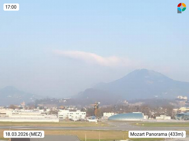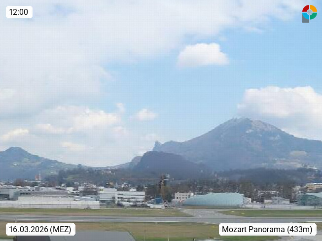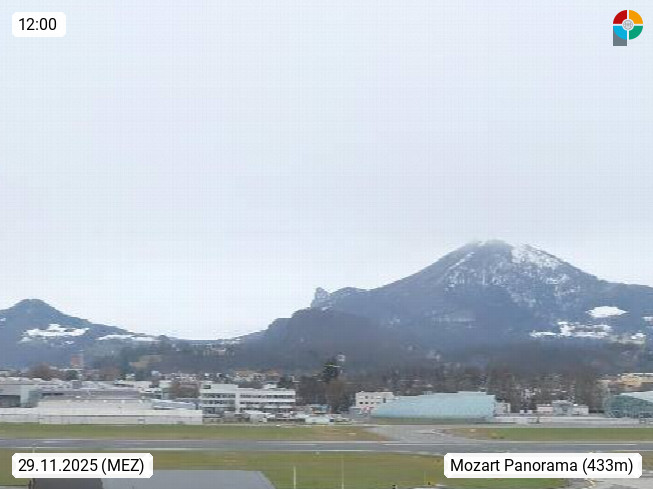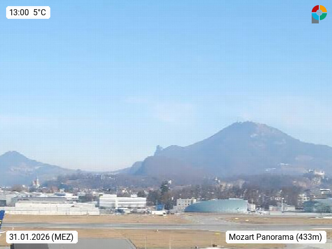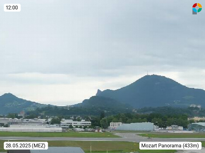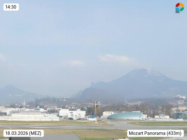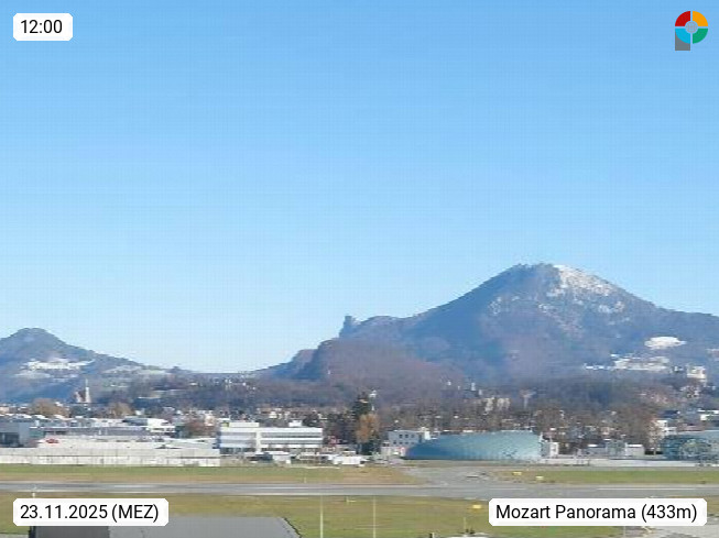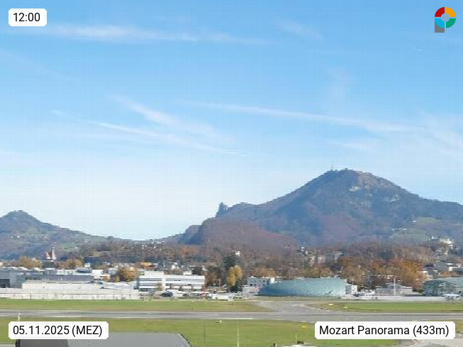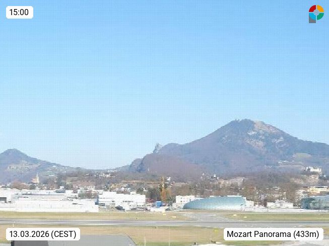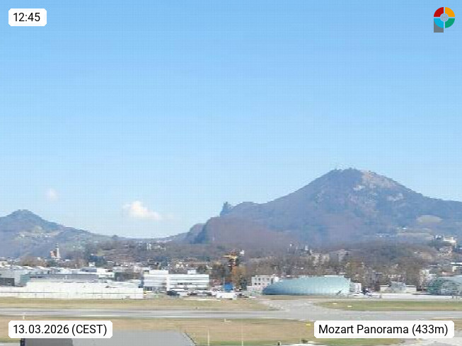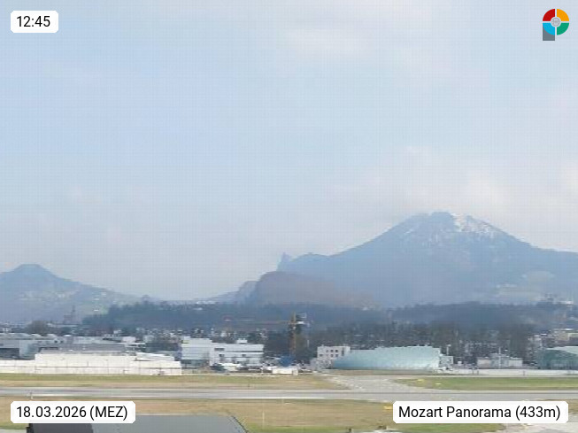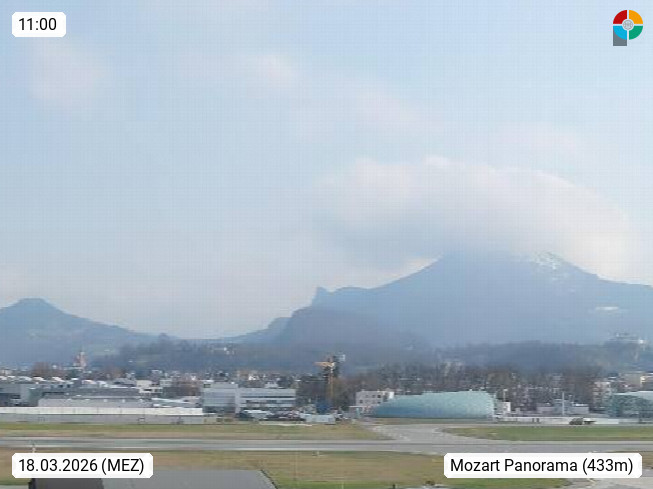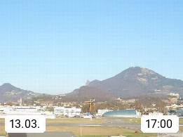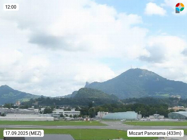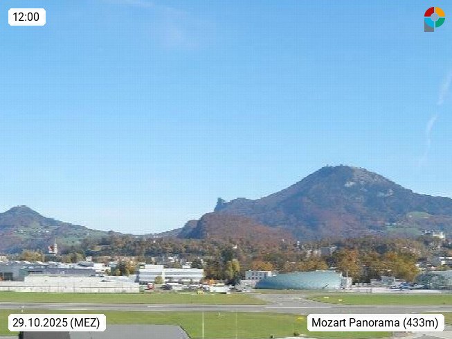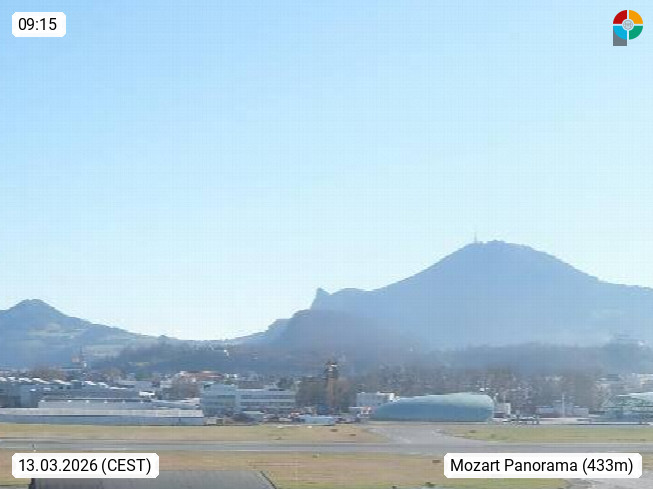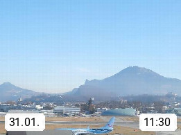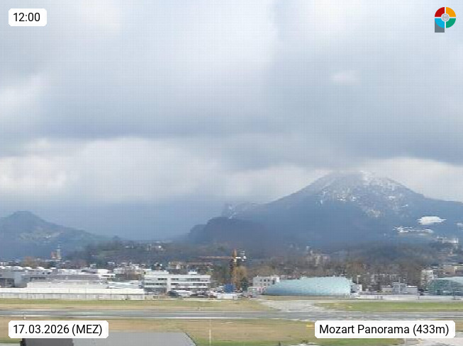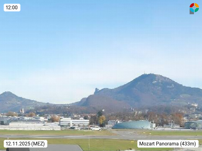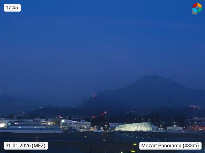 Salzburg 424m, Panoramablick Richtung Südost über die Geburtsstadt von Wolfgang Amadeus Mozart mit Grünmarkt, Kollegienkirche, Stift St. Peter, Hofstallgasse mit Festspielauffahrt, im Hintergrund der Gaisberg 1.287m und die Festung Hohensalzburg gegründet 1077. http://www.hohensalzburg.com Im Vordergrund rechts das Festspielhaus. Präsentiert von https://www.salzburg-airport.com.