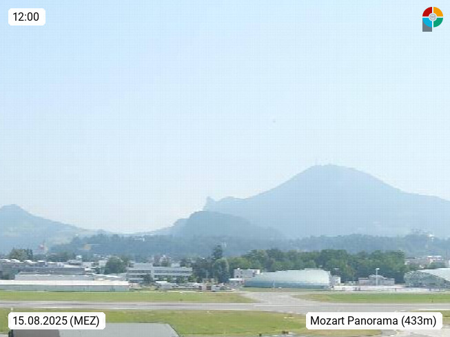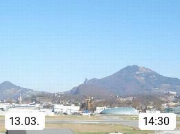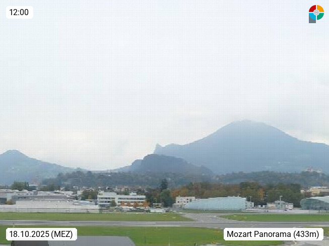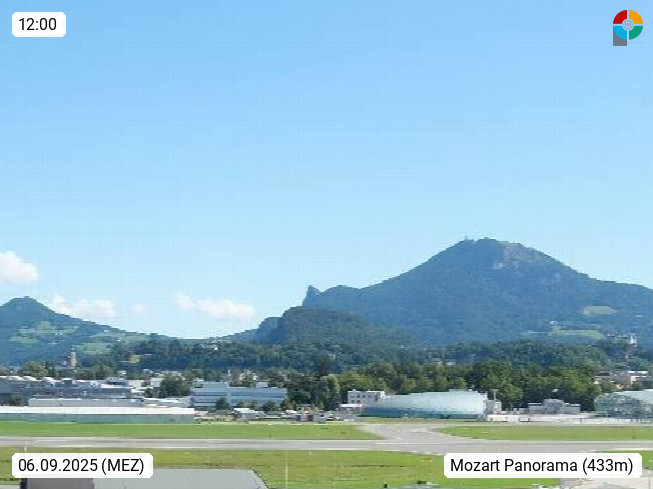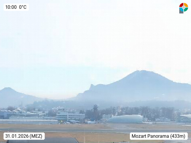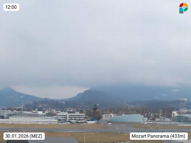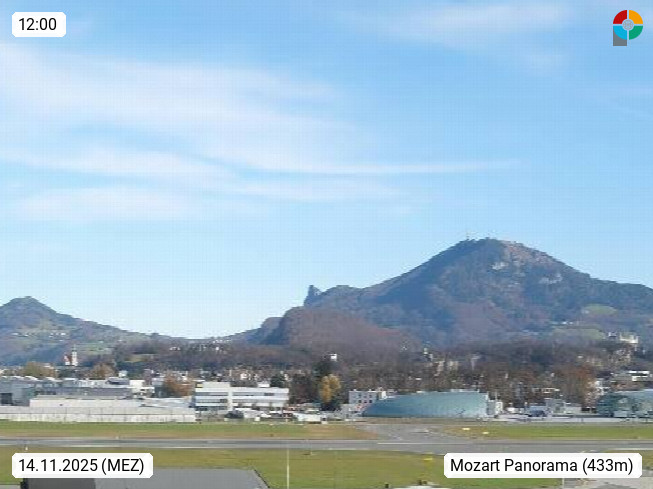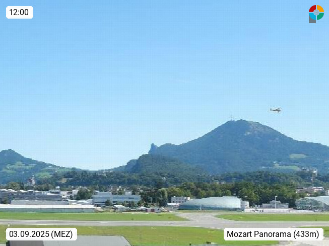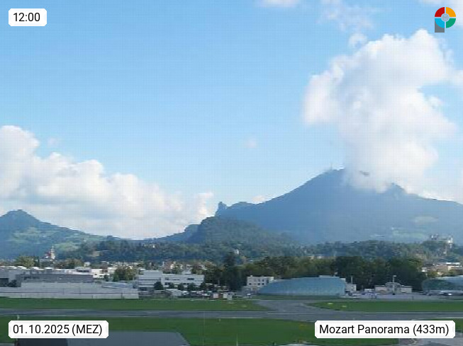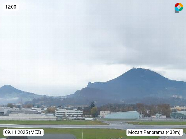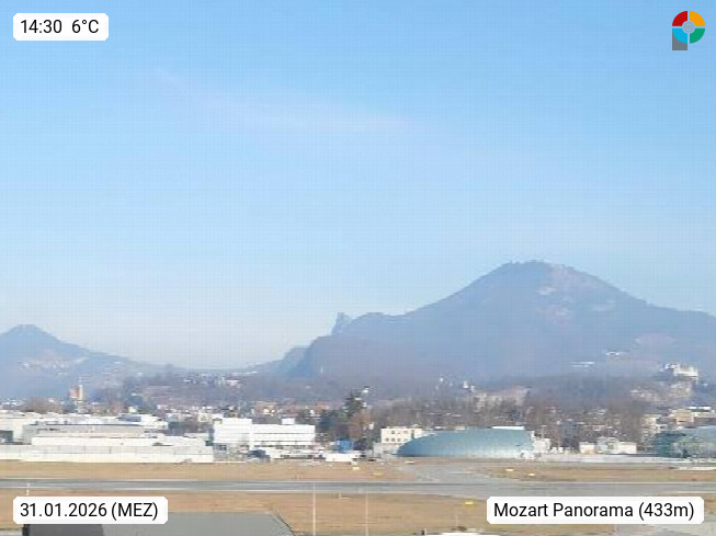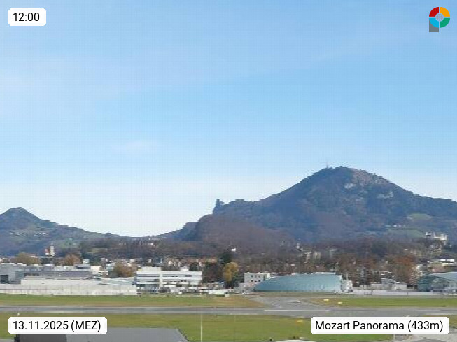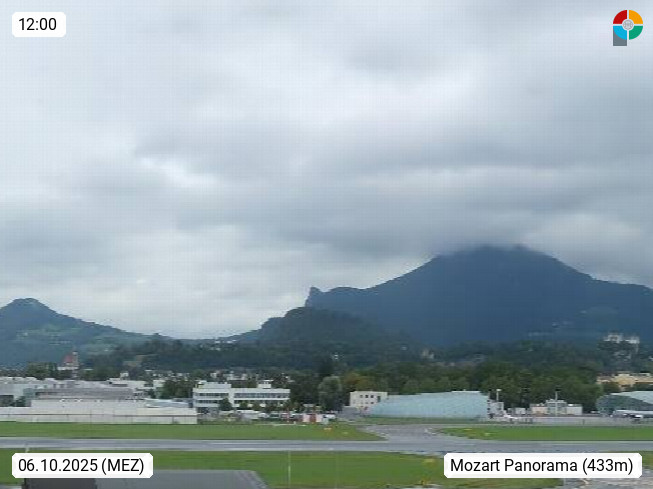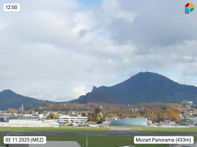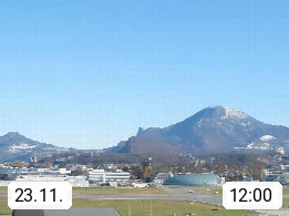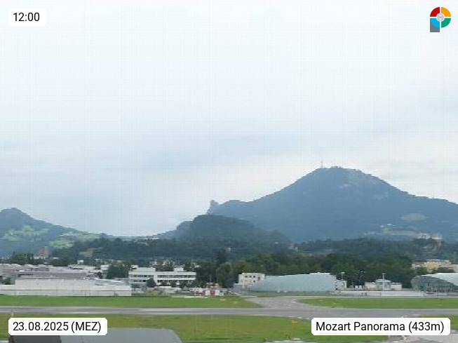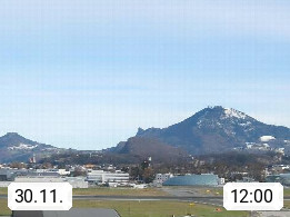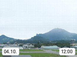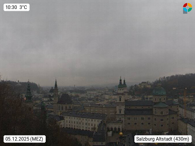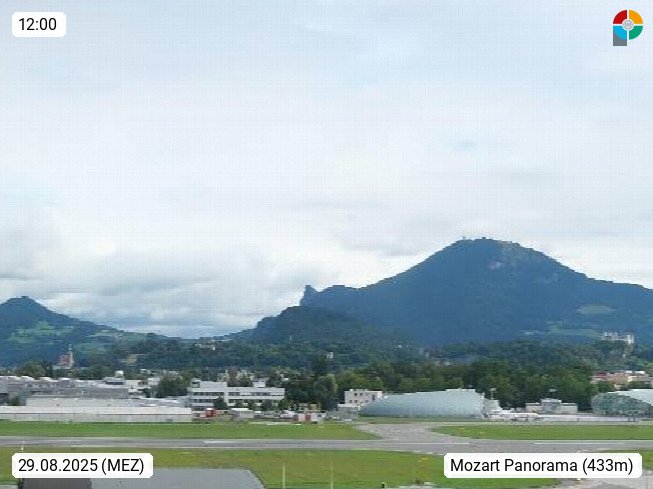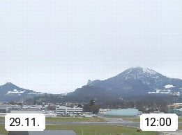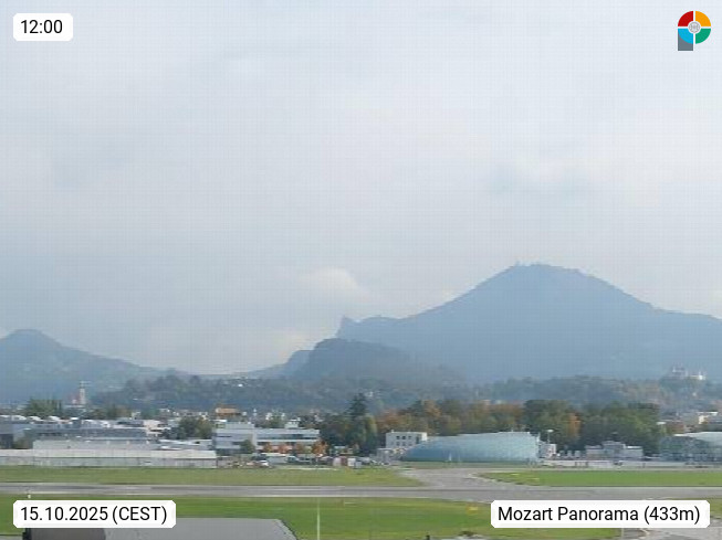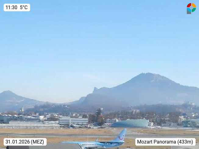 Salzburg 424m, Panoramablick Richtung Südost über die Geburtsstadt von Wolfgang Amadeus Mozart mit Grünmarkt, Kollegienkirche, Stift St. Peter, Hofstallgasse mit Festspielauffahrt, im Hintergrund der Gaisberg 1.287m und die Festung Hohensalzburg gegründet 1077. http://www.hohensalzburg.com Im Vordergrund rechts das Festspielhaus. Präsentiert von https://www.salzburg-airport.com.