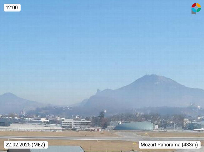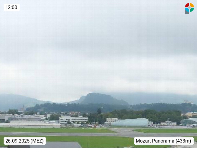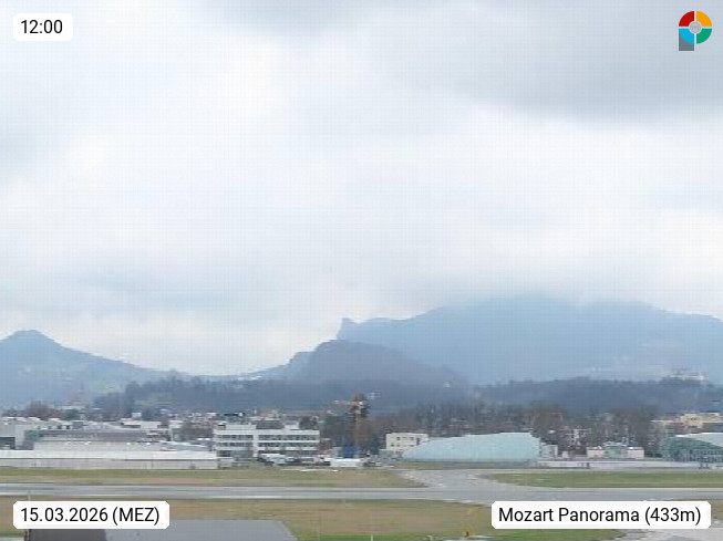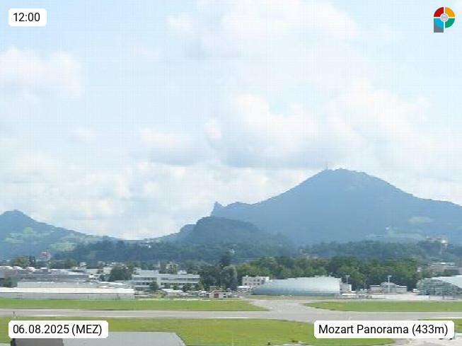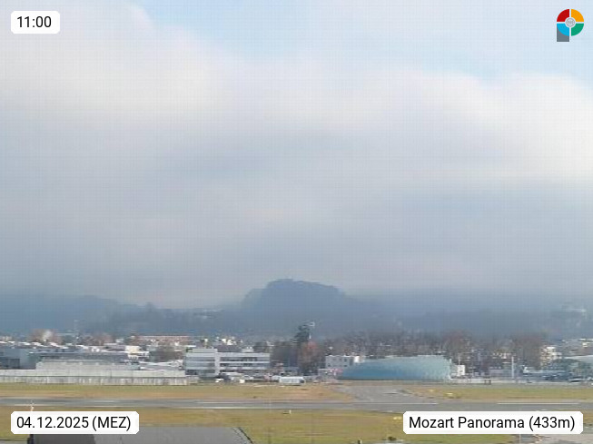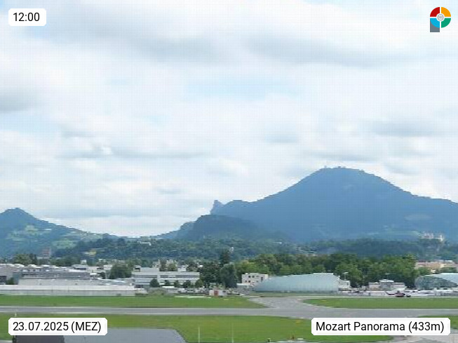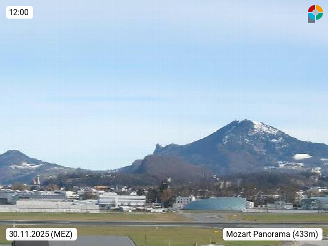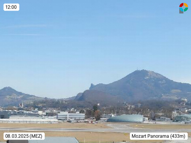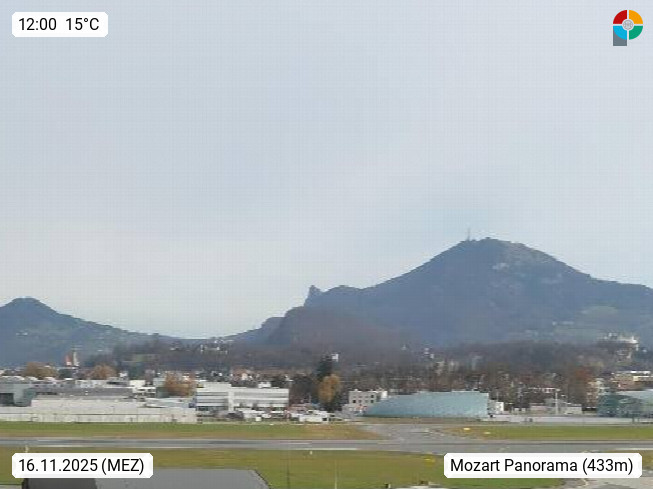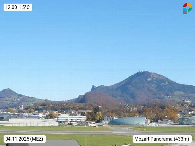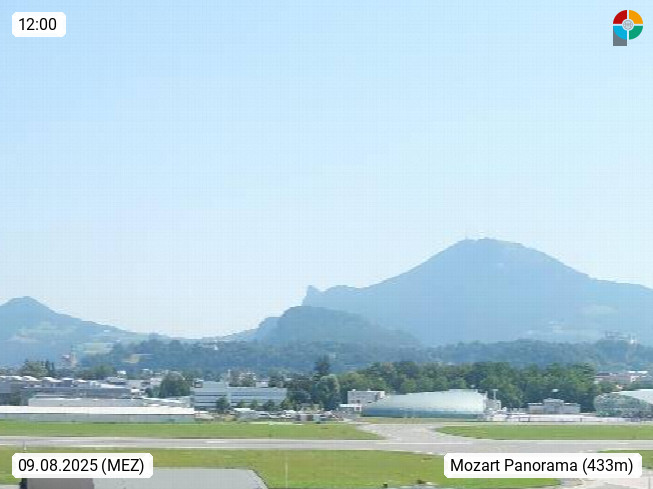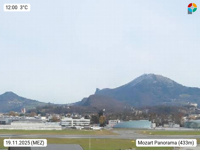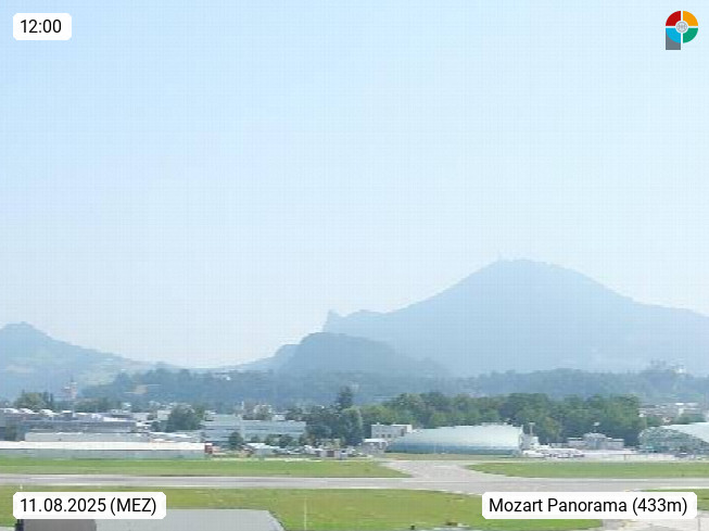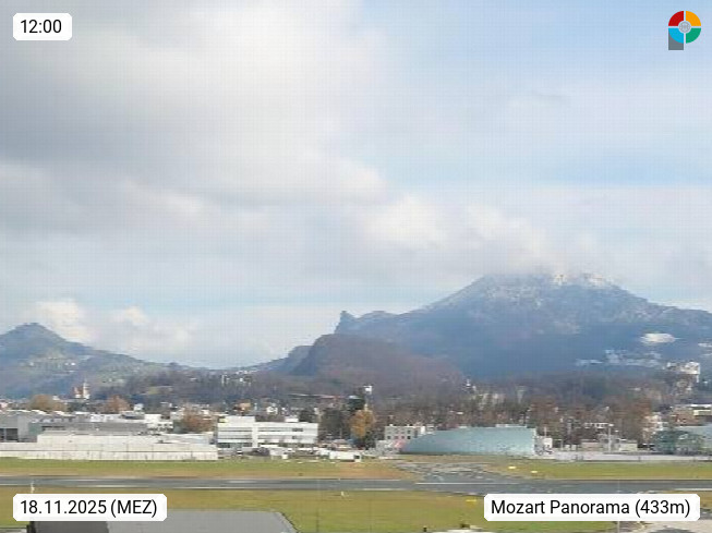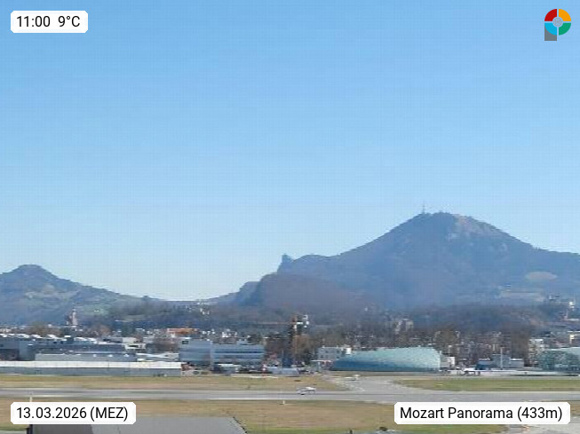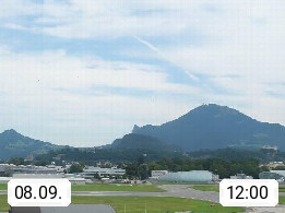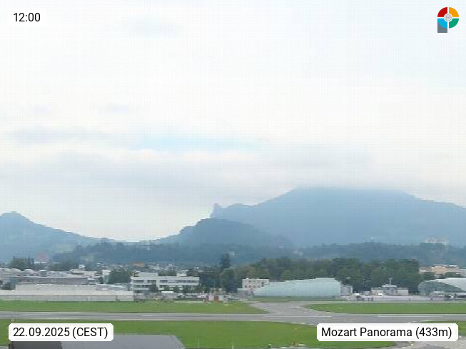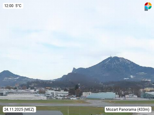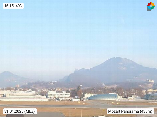 Salzburg 424m, Panoramablick Richtung Südost über die Geburtsstadt von Wolfgang Amadeus Mozart mit Grünmarkt, Kollegienkirche, Stift St. Peter, Hofstallgasse mit Festspielauffahrt, im Hintergrund der Gaisberg 1.287m und die Festung Hohensalzburg gegründet 1077. http://www.hohensalzburg.com Im Vordergrund rechts das Festspielhaus. Präsentiert von https://www.salzburg-airport.com.