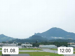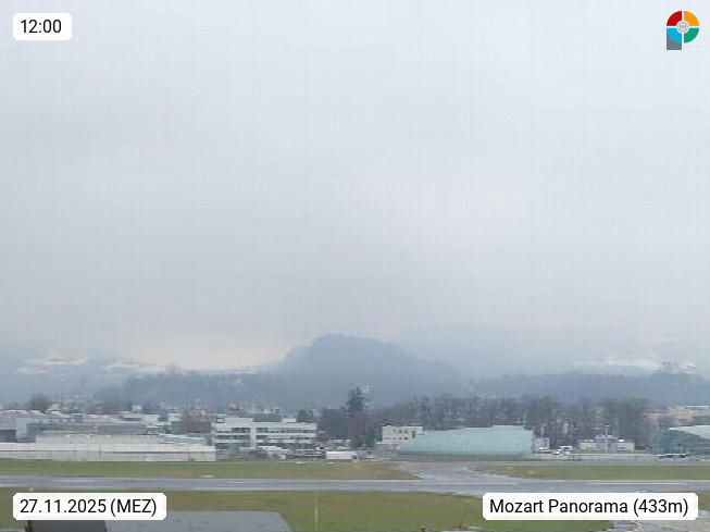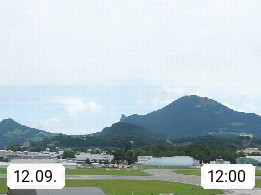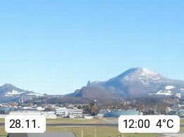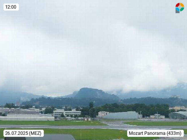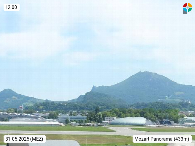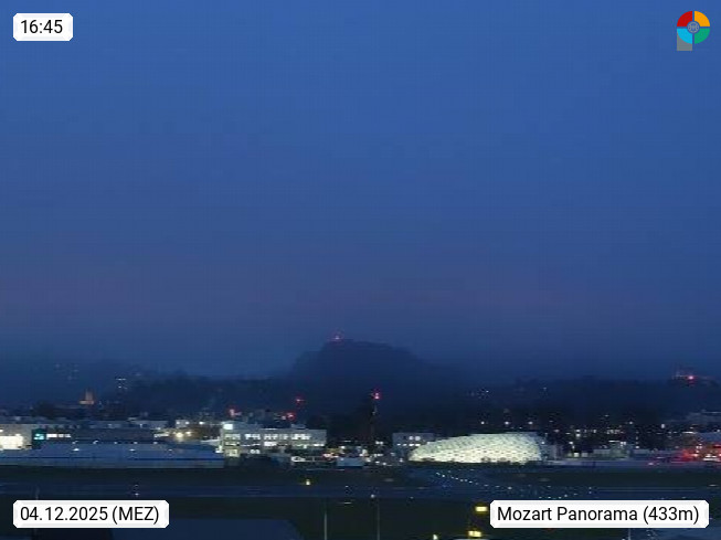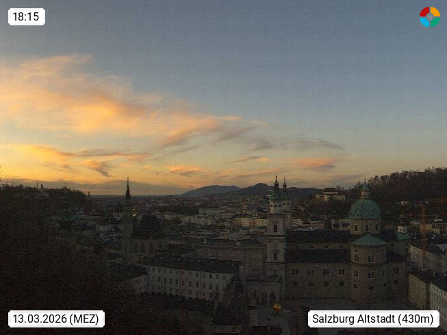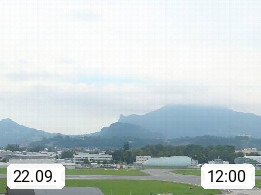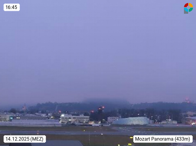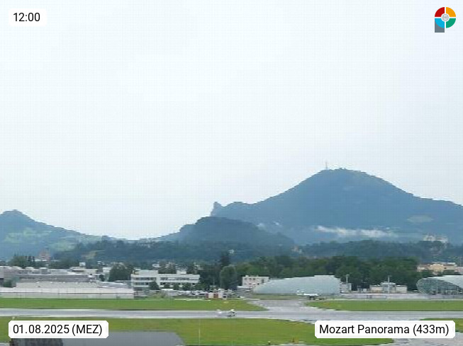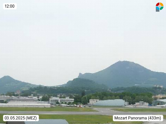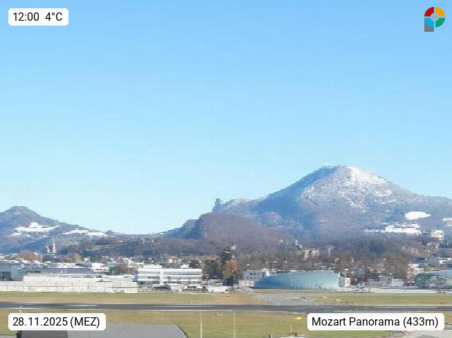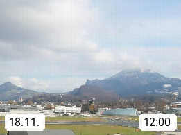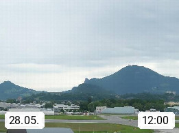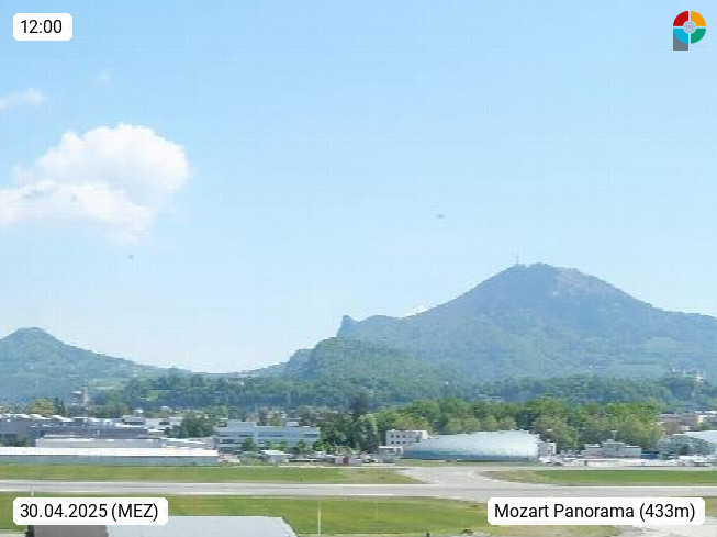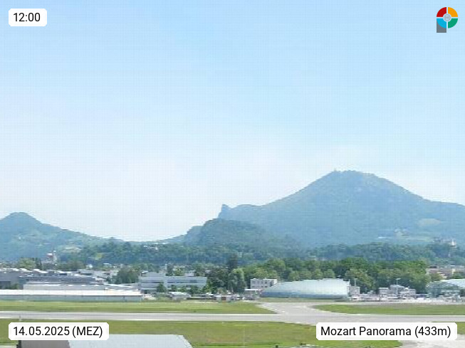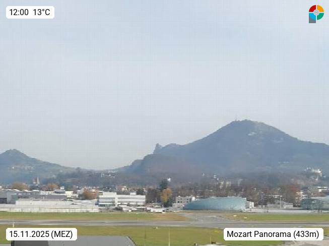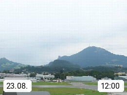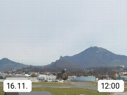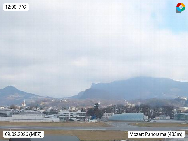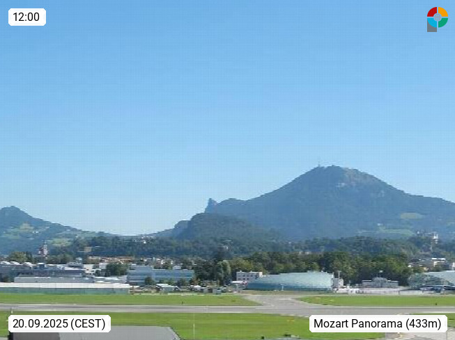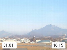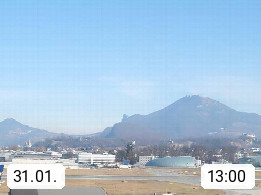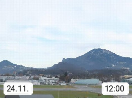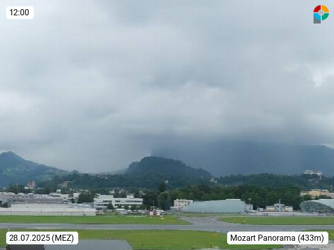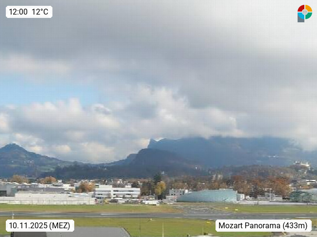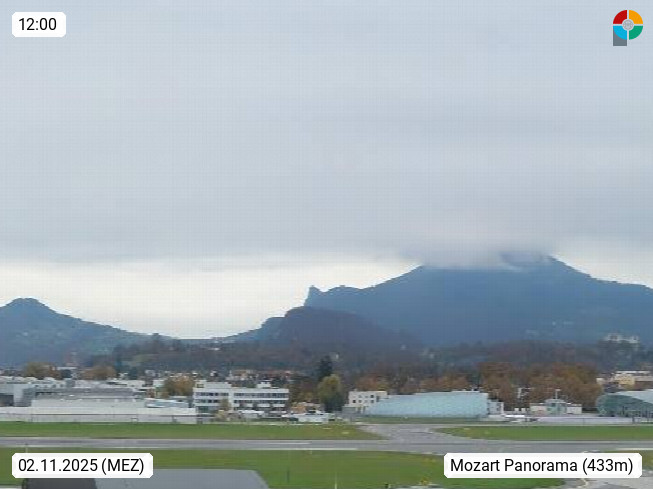 Salzburg 424m, Panoramablick Richtung Südost über die Geburtsstadt von Wolfgang Amadeus Mozart mit Grünmarkt, Kollegienkirche, Stift St. Peter, Hofstallgasse mit Festspielauffahrt, im Hintergrund der Gaisberg 1.287m und die Festung Hohensalzburg gegründet 1077. http://www.hohensalzburg.com Im Vordergrund rechts das Festspielhaus. Präsentiert von https://www.salzburg-airport.com.