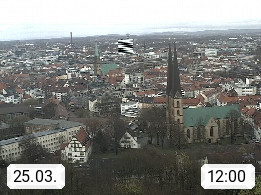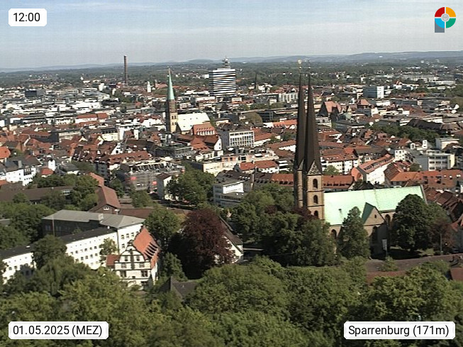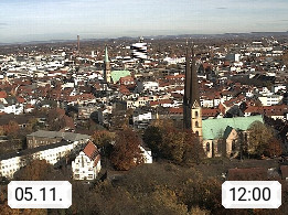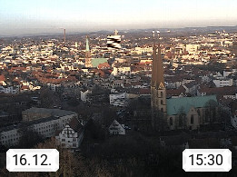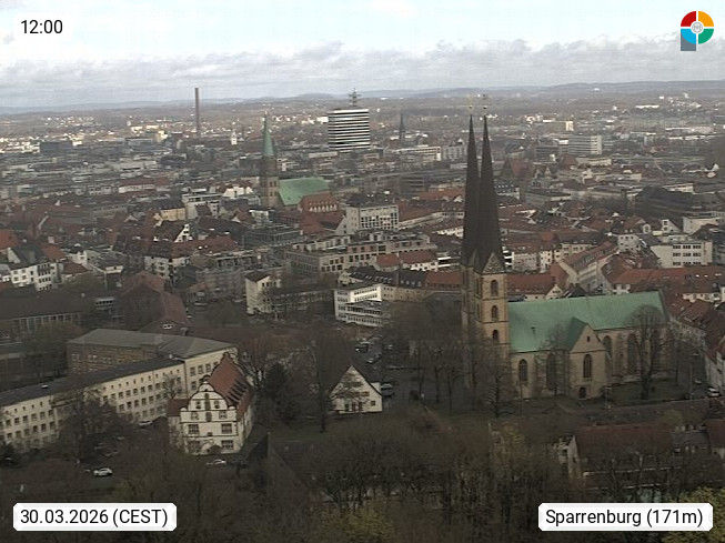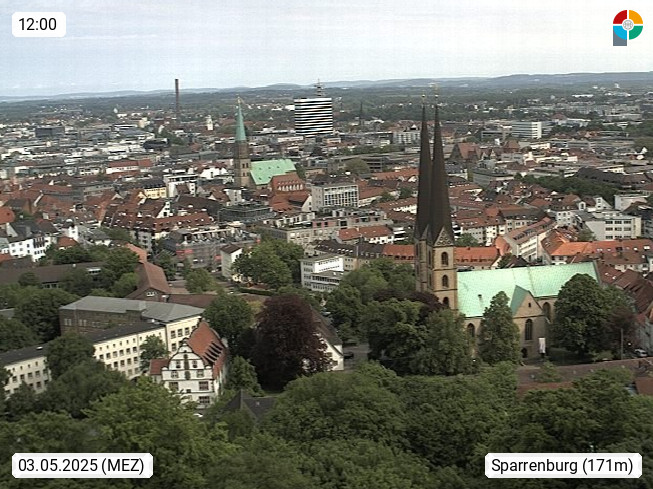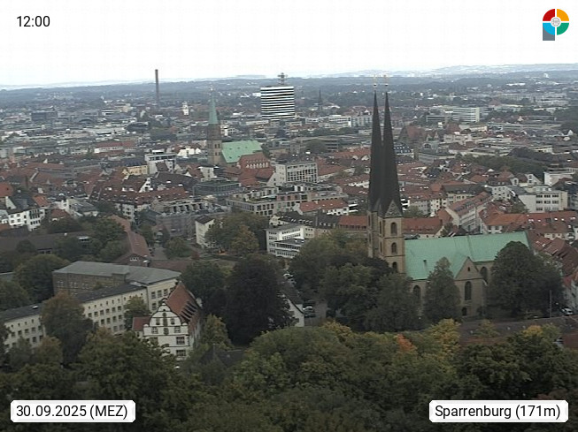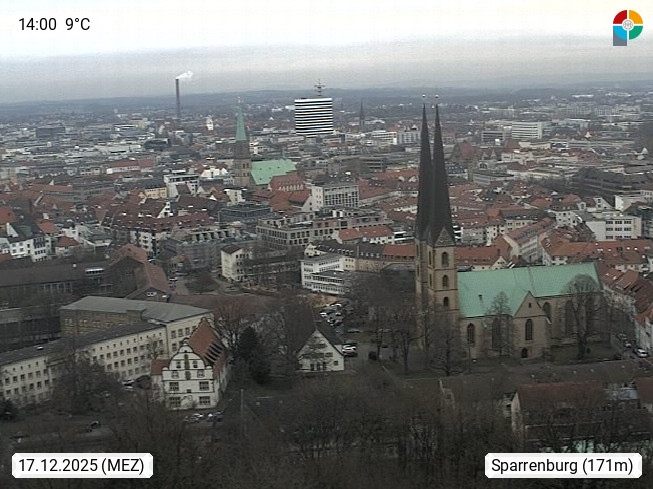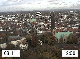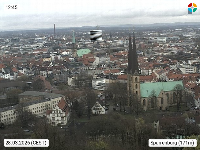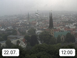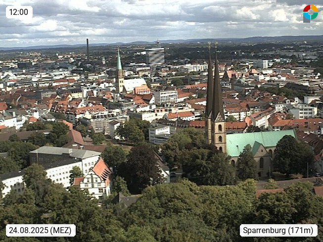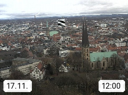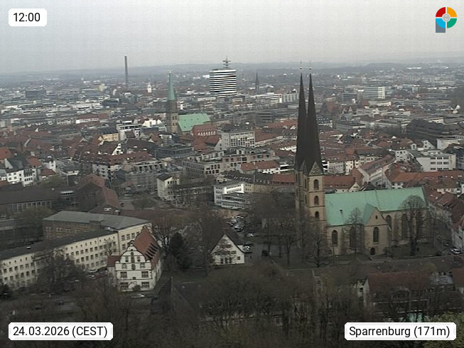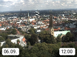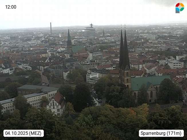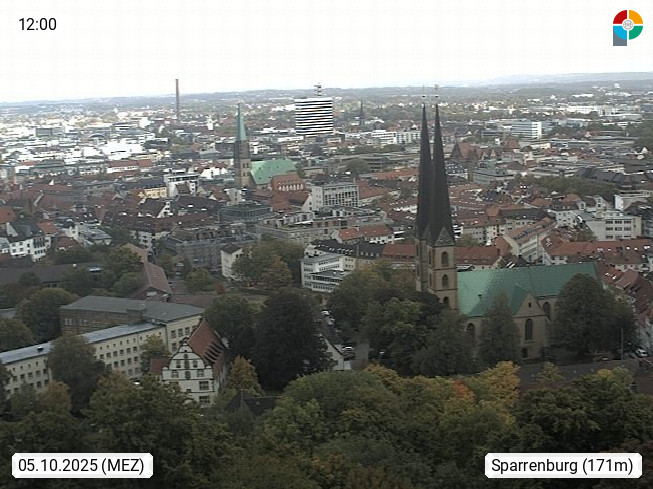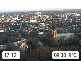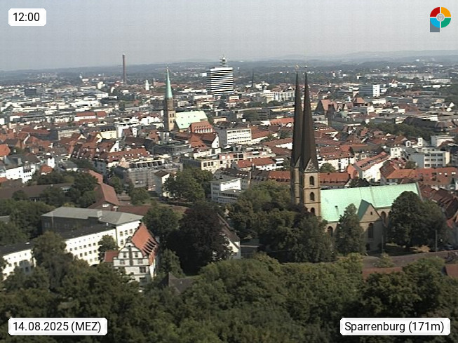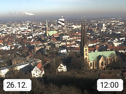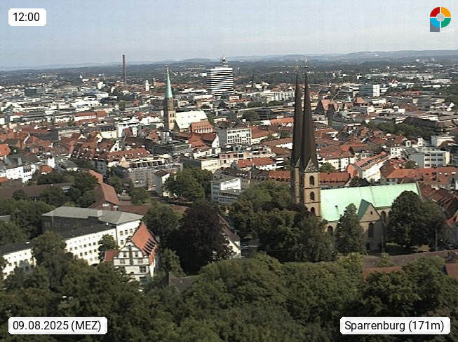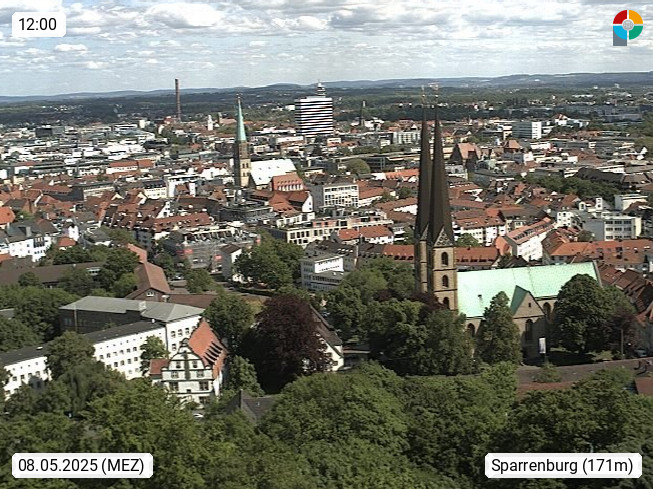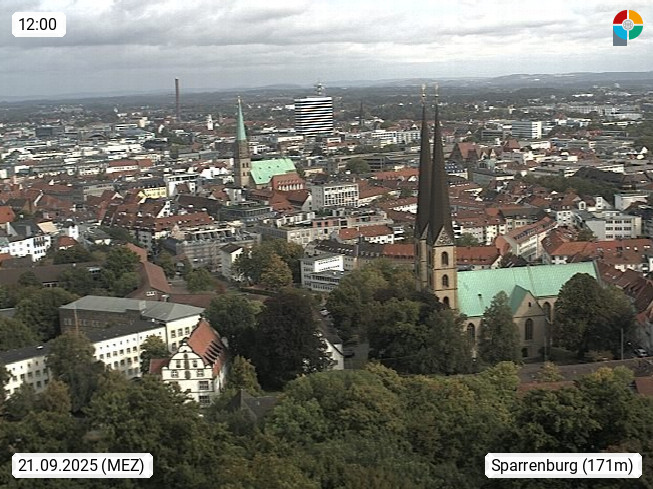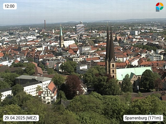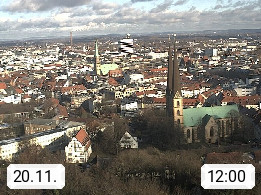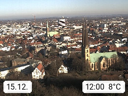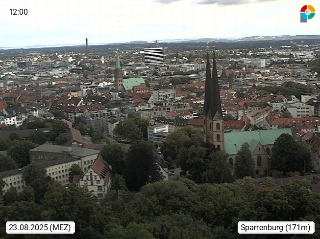 D 33609 Bielfeld Sparrenburg 182m, kreisfreie Stadt im Regierungsbezirk Detmold im Nordosten Nordrhein Westfalens in der Hügellandschaft der Ravensberger Mulde. Panoramablick von der Sparrenburg einer restaurierten Festungsanlage und Wahrzeichen von Bielefeld, Richtung Norden. Präsentiert von https://bicos.de/.